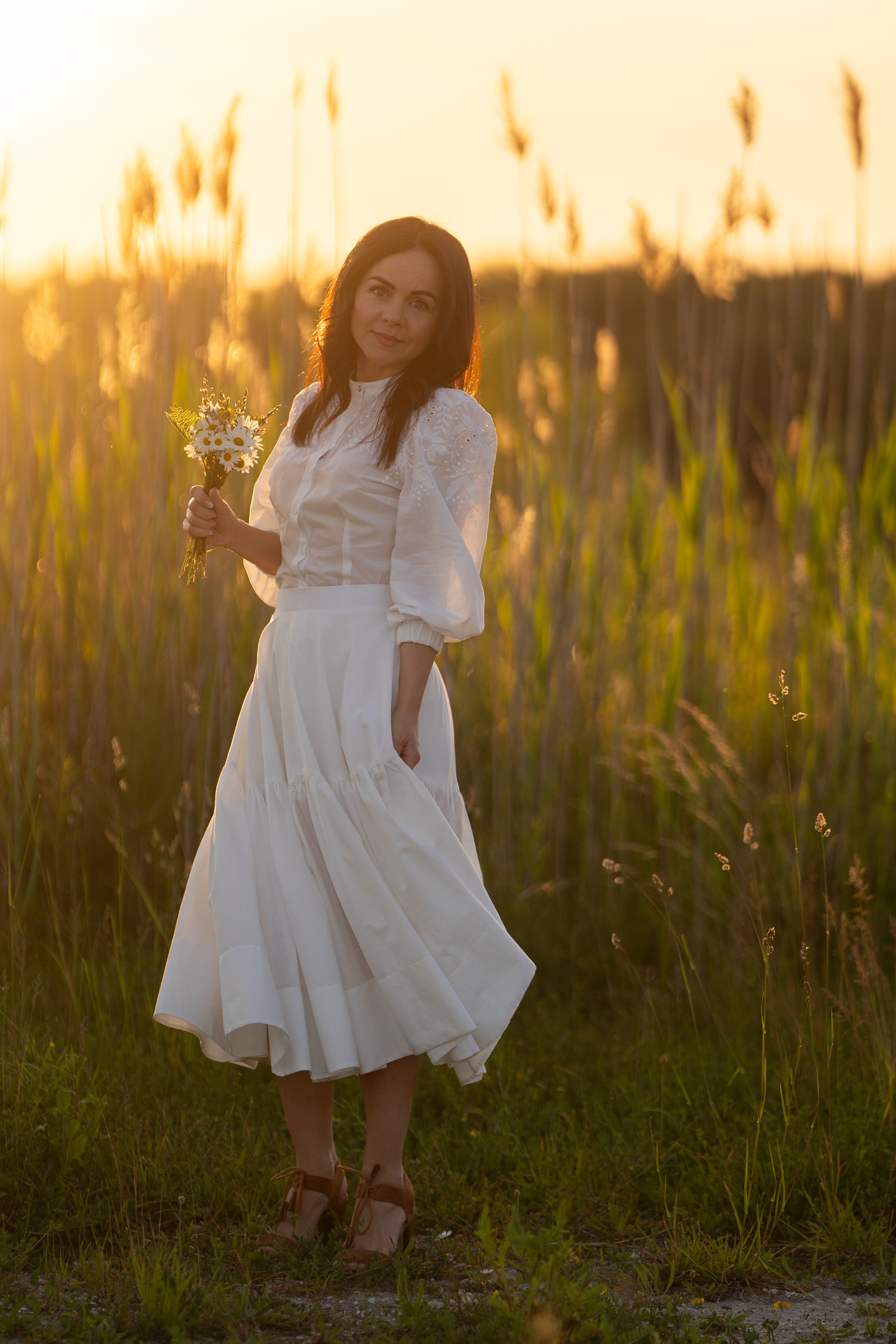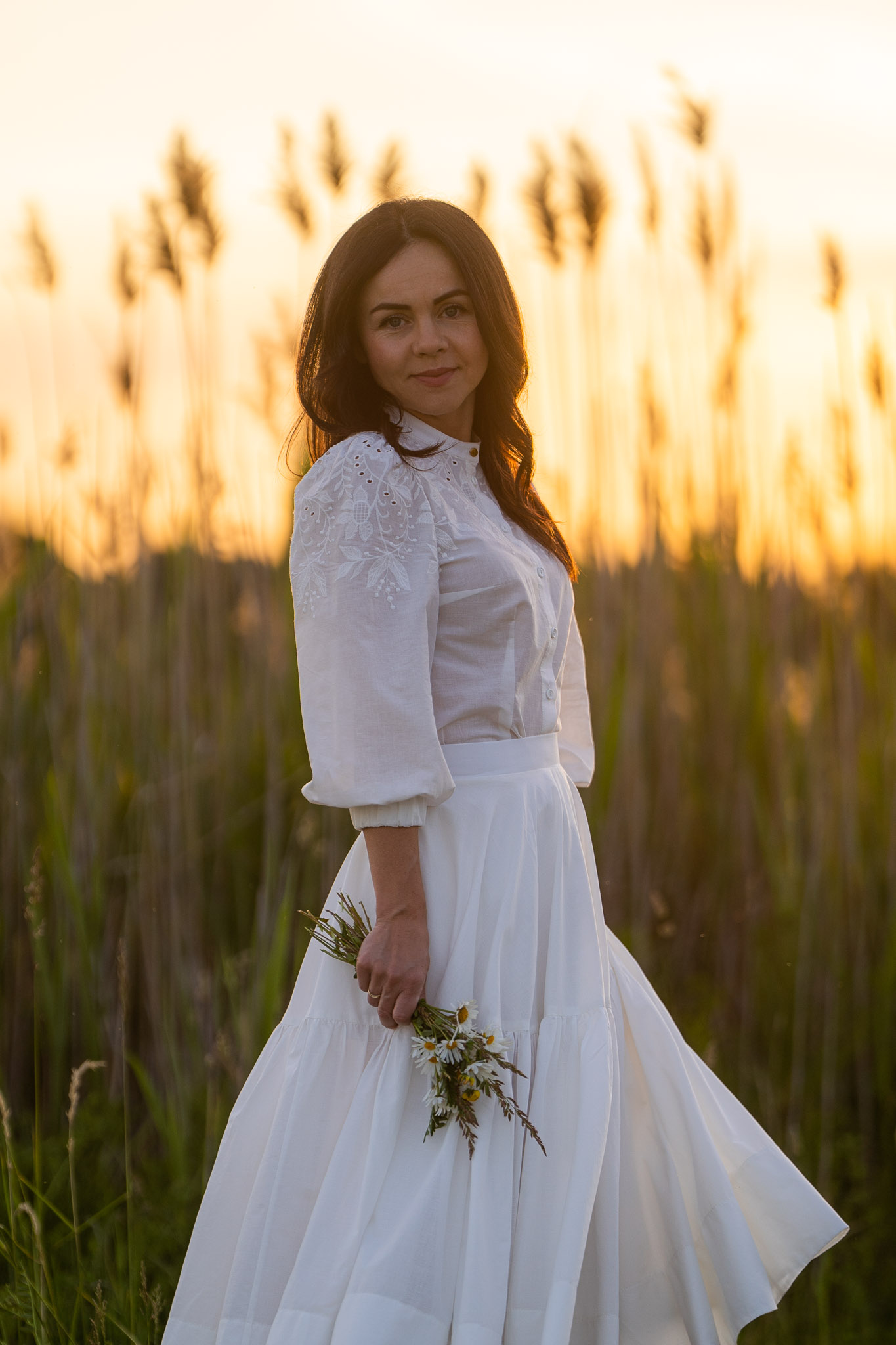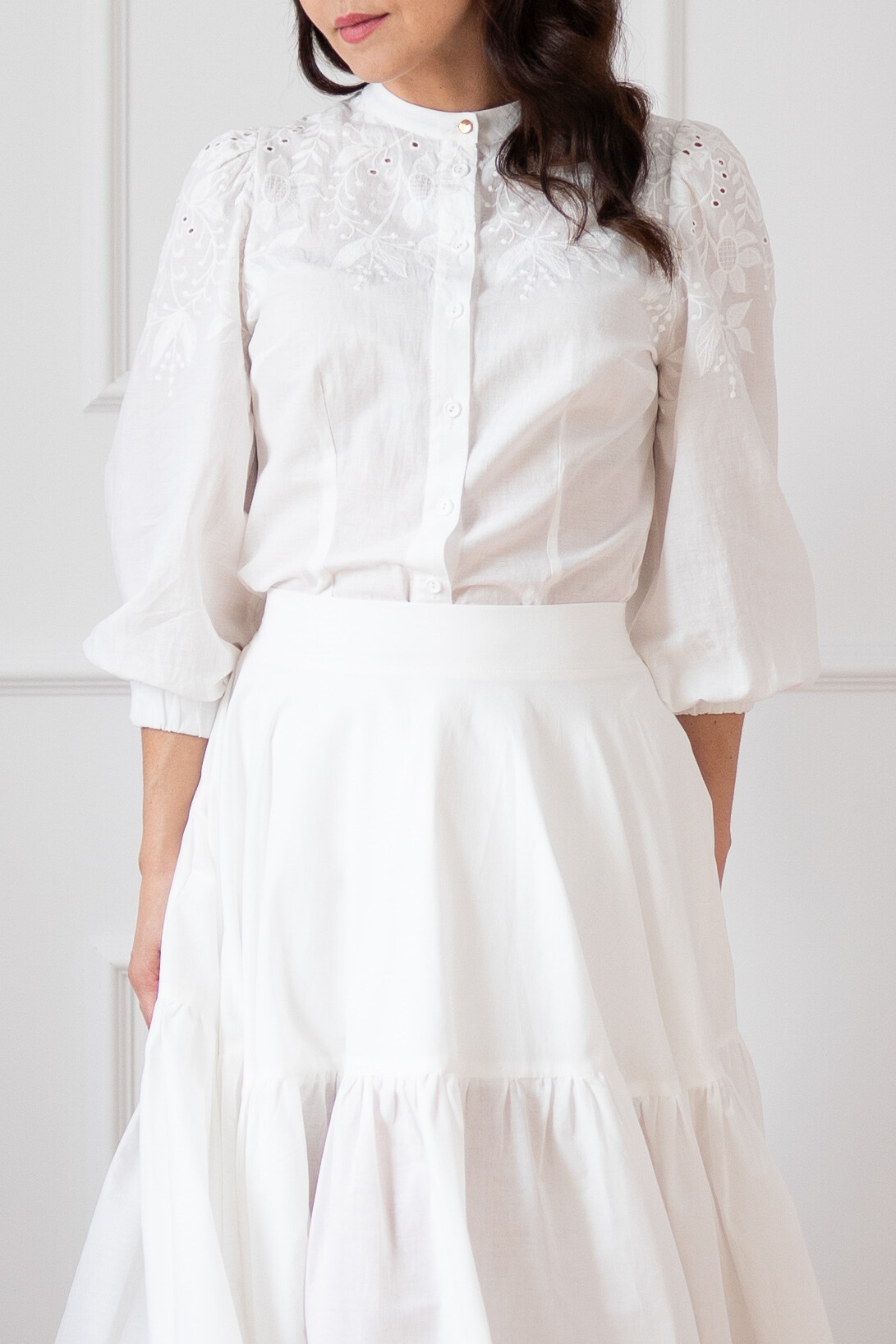 Jest to hiszpańska tkanina bawełniana, która idealnie sprawdzi się w upalne dni. Posiada szerokie rękawy zakończone mankietem z gumą w środku. Górę bluzki zdobi subtelny haft rozciągający się na ramionach. Dekolt odszyty został stójką zapinaną na delikatny złoty guzik, który sprawia, że całość wygląda bardziej oryginalnie i elegancko.