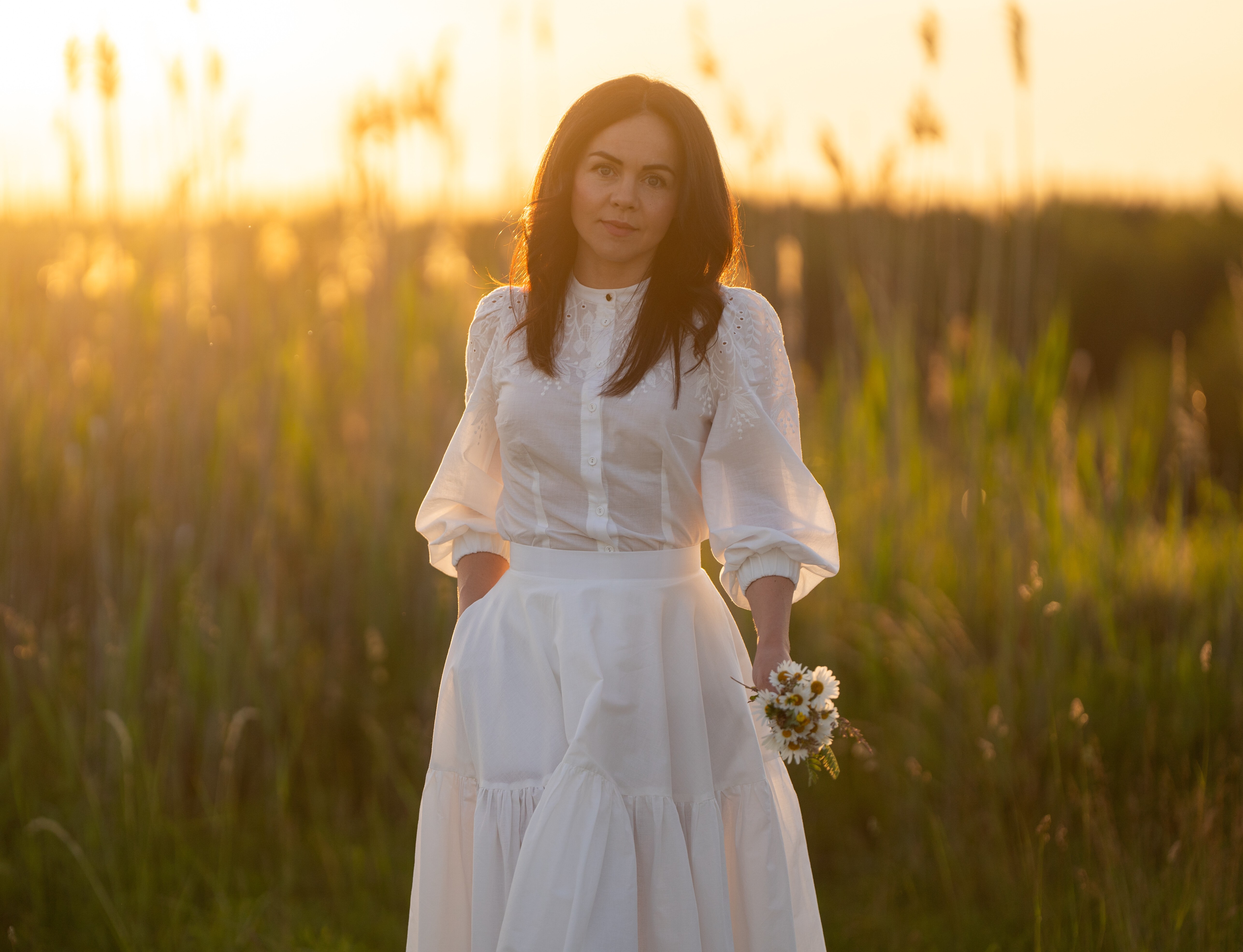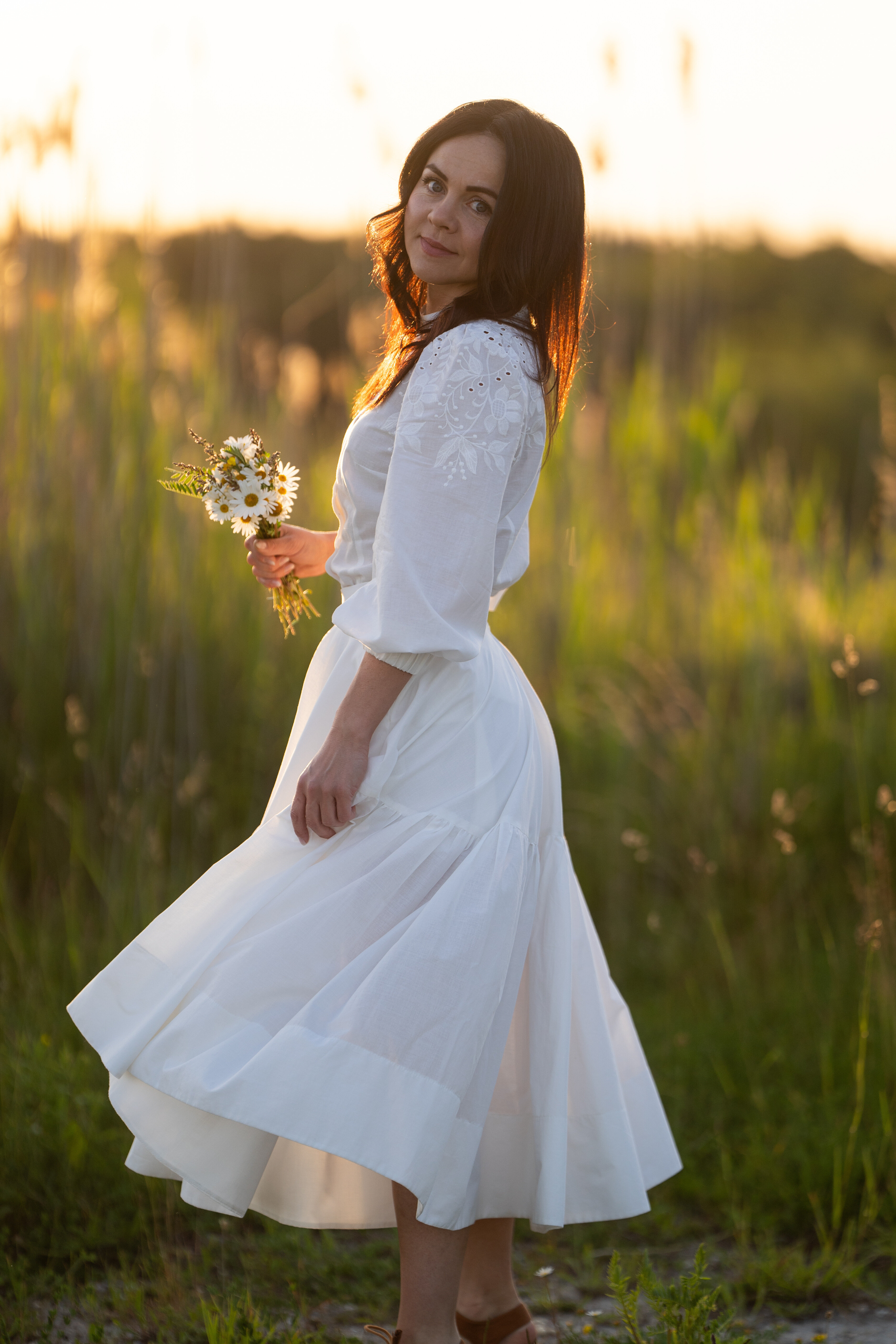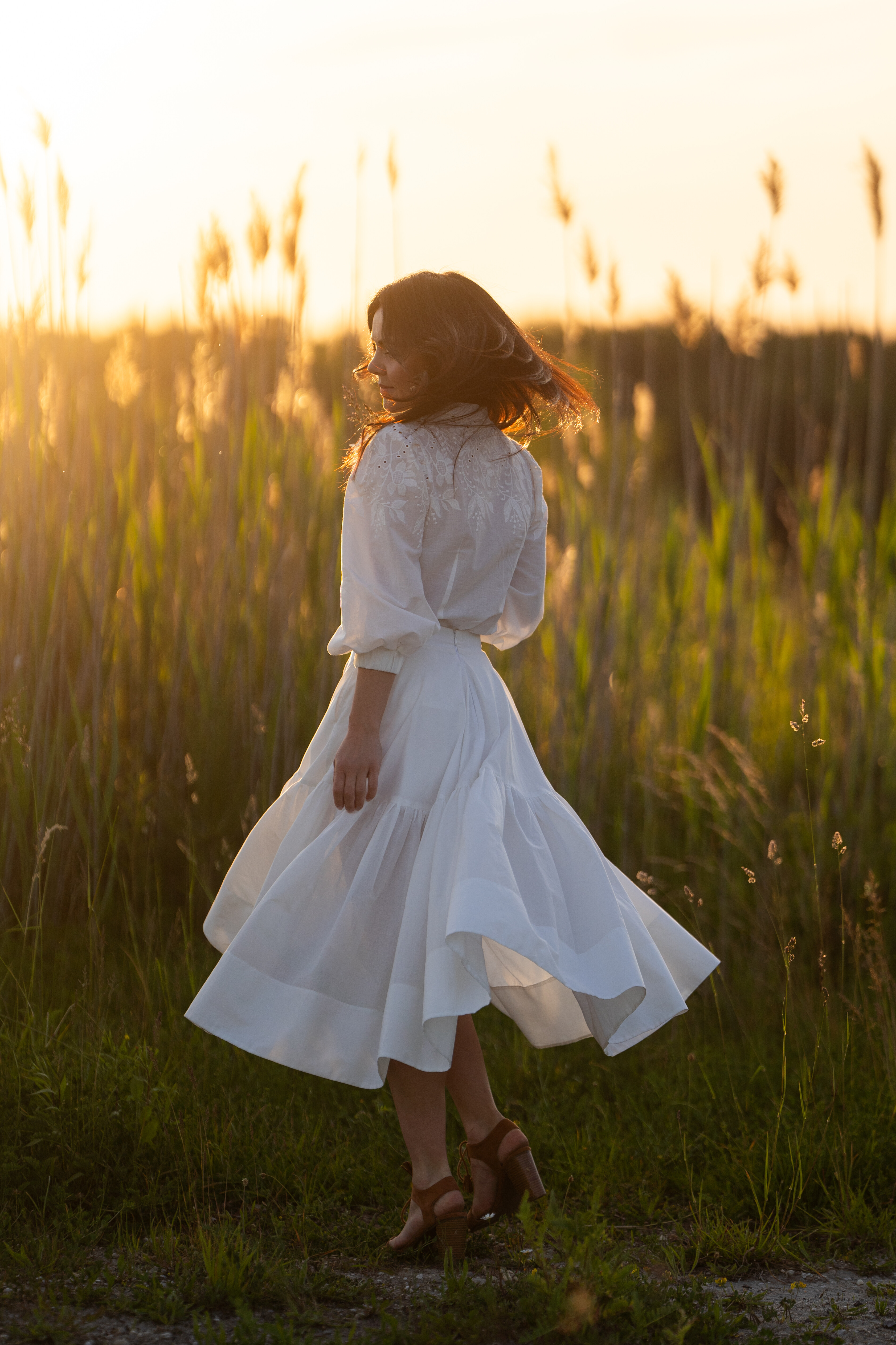 Jest to hiszpańska tkanina bawełniana, która idealnie sprawdzi się w upalne dni. Posiada szerokie rękawy zakończone mankietem z gumą w środku. Górę bluzki zdobi subtelny haft rozciągający się na ramionach. Dekolt odszyty został stójką zapinaną na delikatny złoty guzik, który sprawia, że całość wygląda bardziej oryginalnie i elegancko.