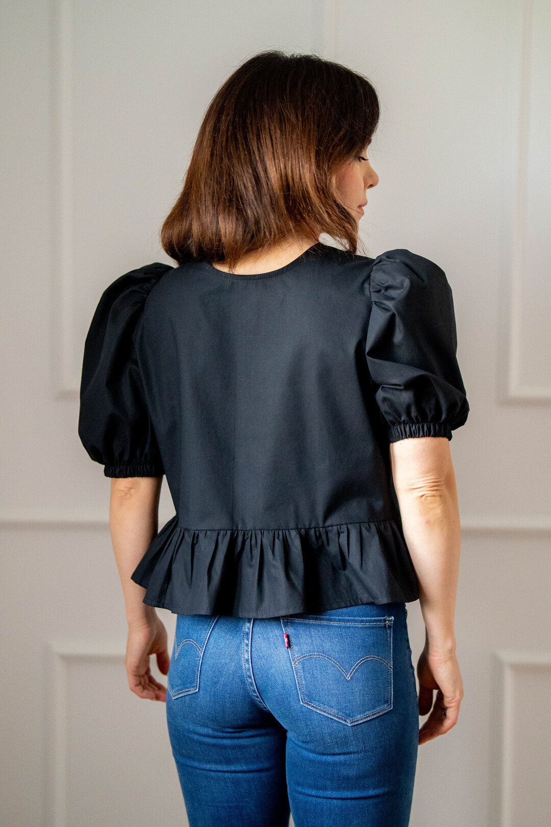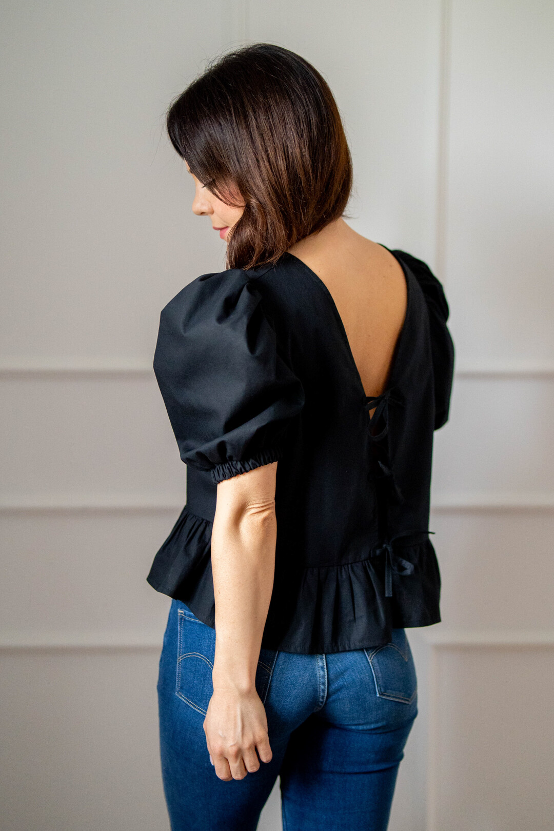 Oryginalna, romantyczna bluzeczka wiązana z przodu na sznureczki dzięki, którym można regulować jej obwód. Bluzka została uszyta w taki sposób, aby można ją było zakładać również tyłem na przód, co pozwala pięknie podkreślić plecy.