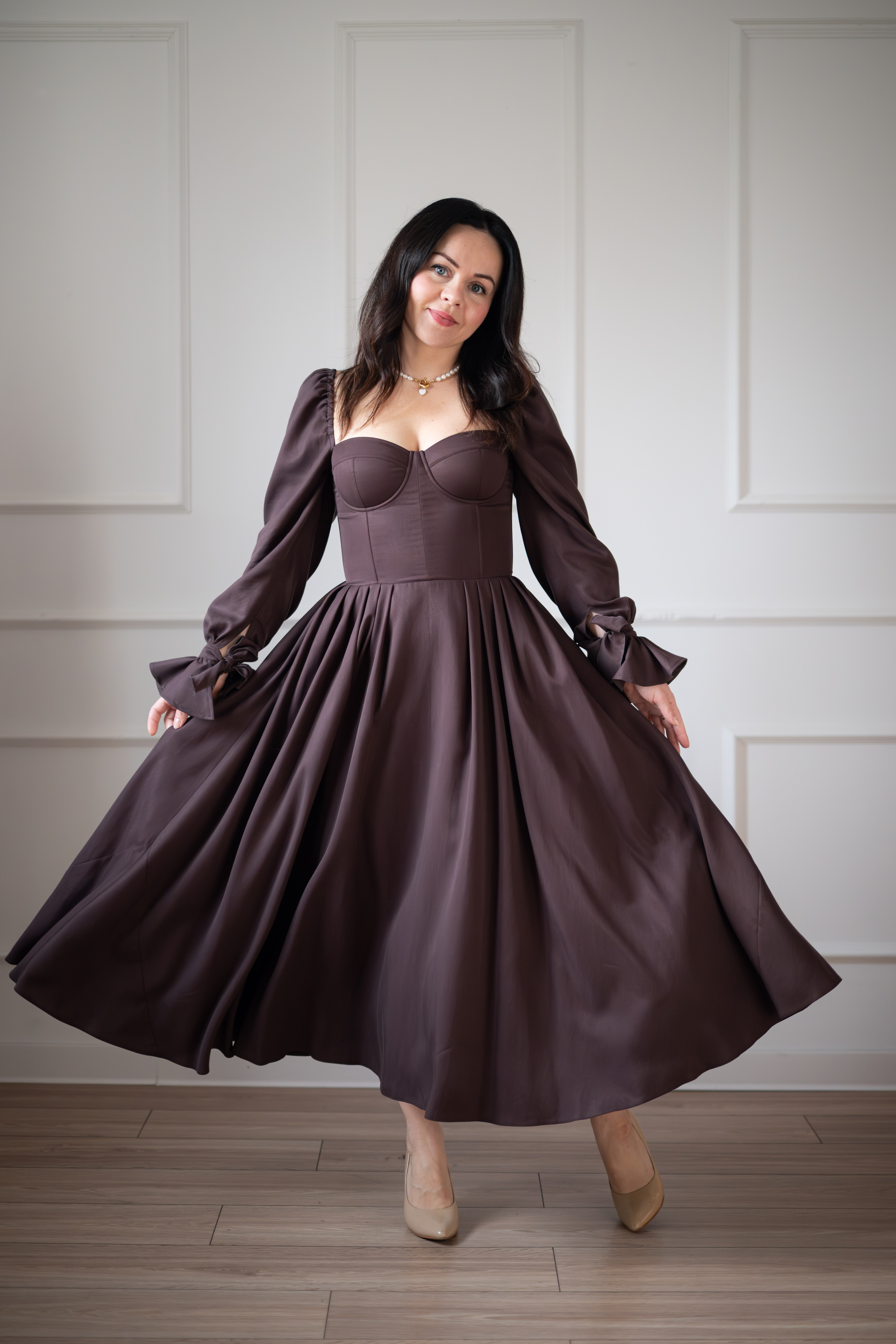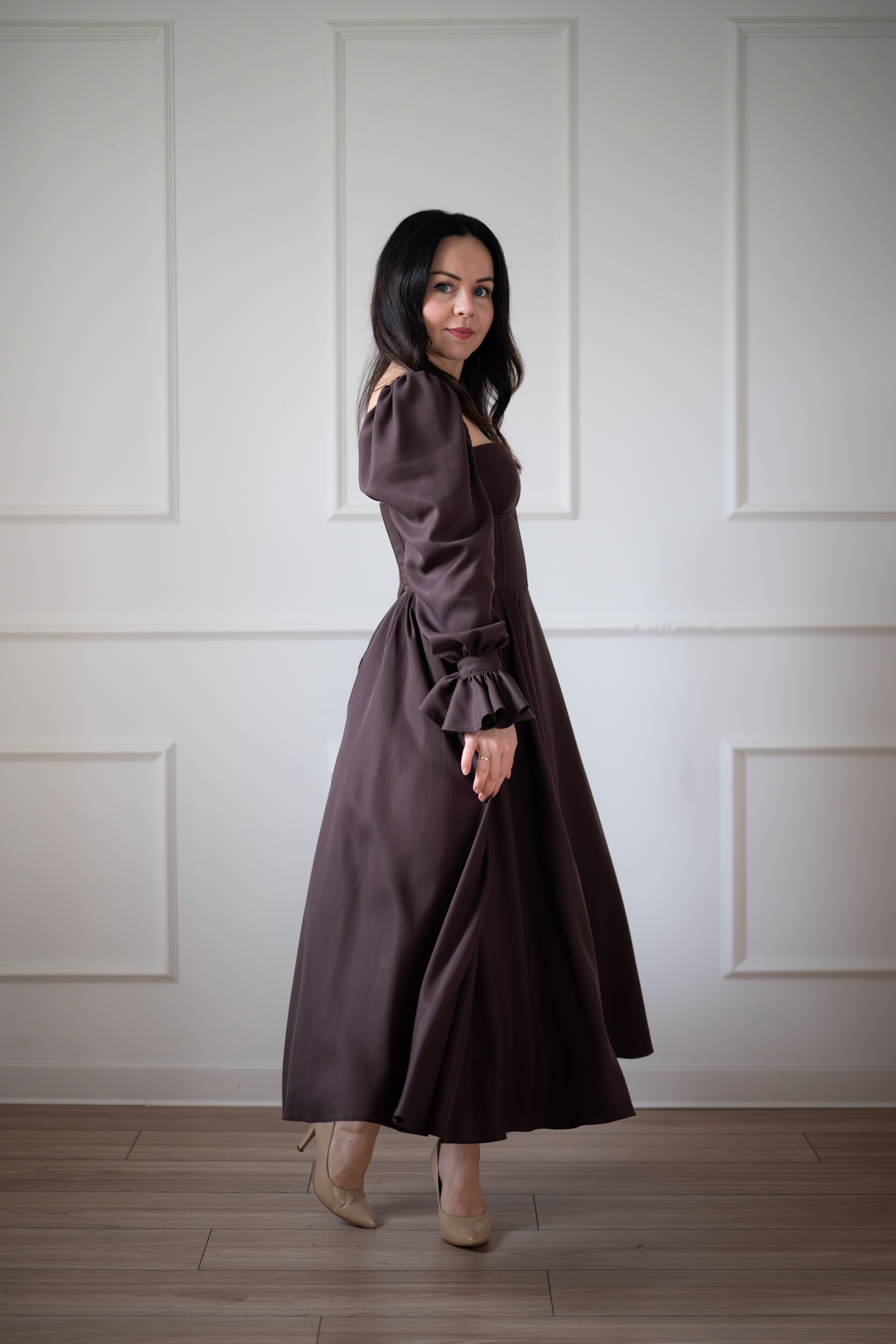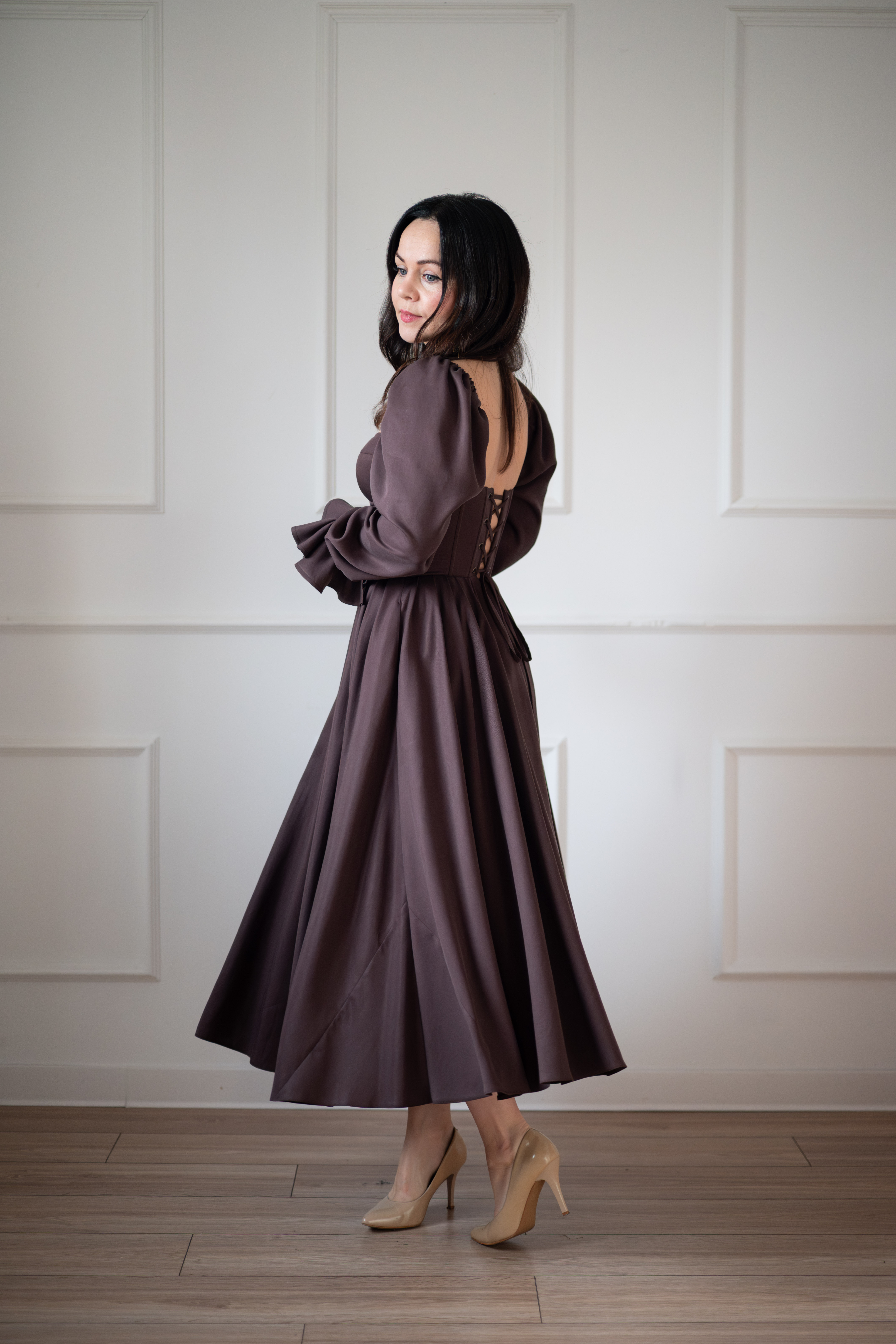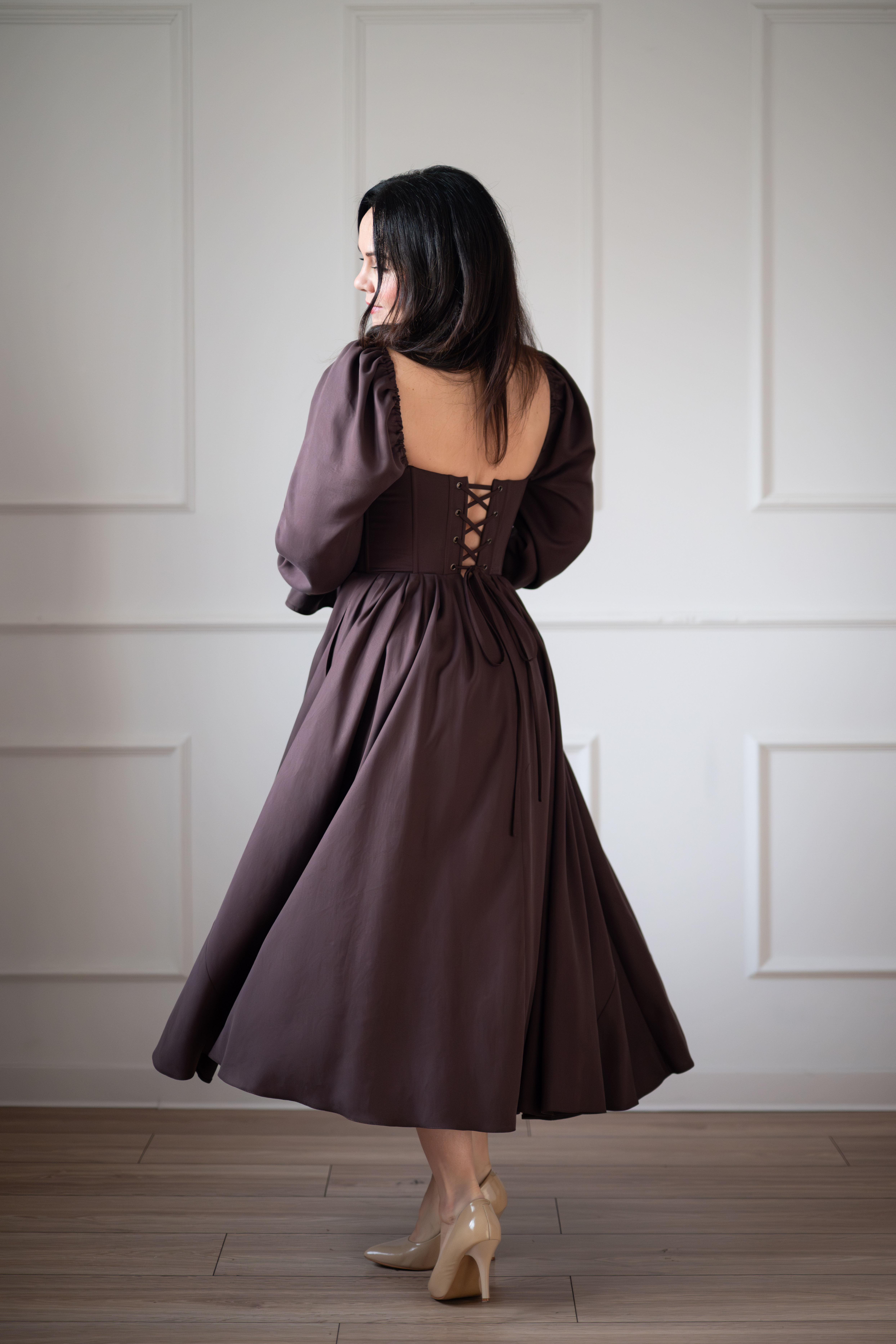 Sukienka gorsetowa z usztywnianymi miseczkami, dzięki którym nie ma potrzeby zakładania stanika. Góra została usztywniona fiszbinami, które pięknie modelują talię. Tył sukienki posiada wiązanie pozwalające na regulację oraz indywidualne dopasowanie, natomiast spódnica zapinana jest na zamek kryty. Sukienka Eliza posiada rękawy wykończone u góry gumką dzięki, której nie spadają z ramion oraz kieszenie w szwach bocznych. Dodatkowo w zestawie dołączona jest wkładka pod wiązanie z tyłu aby zamaskować plecy.