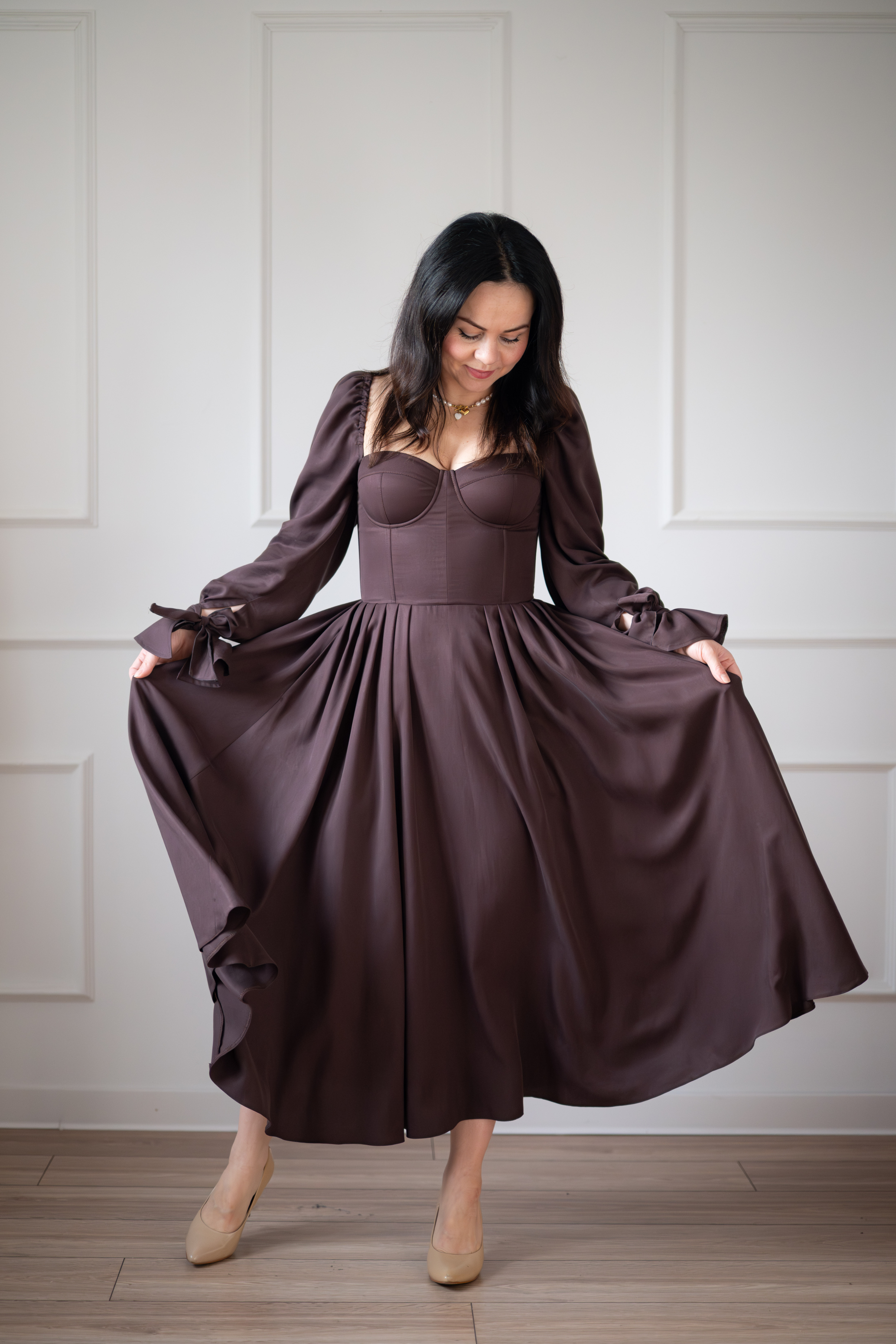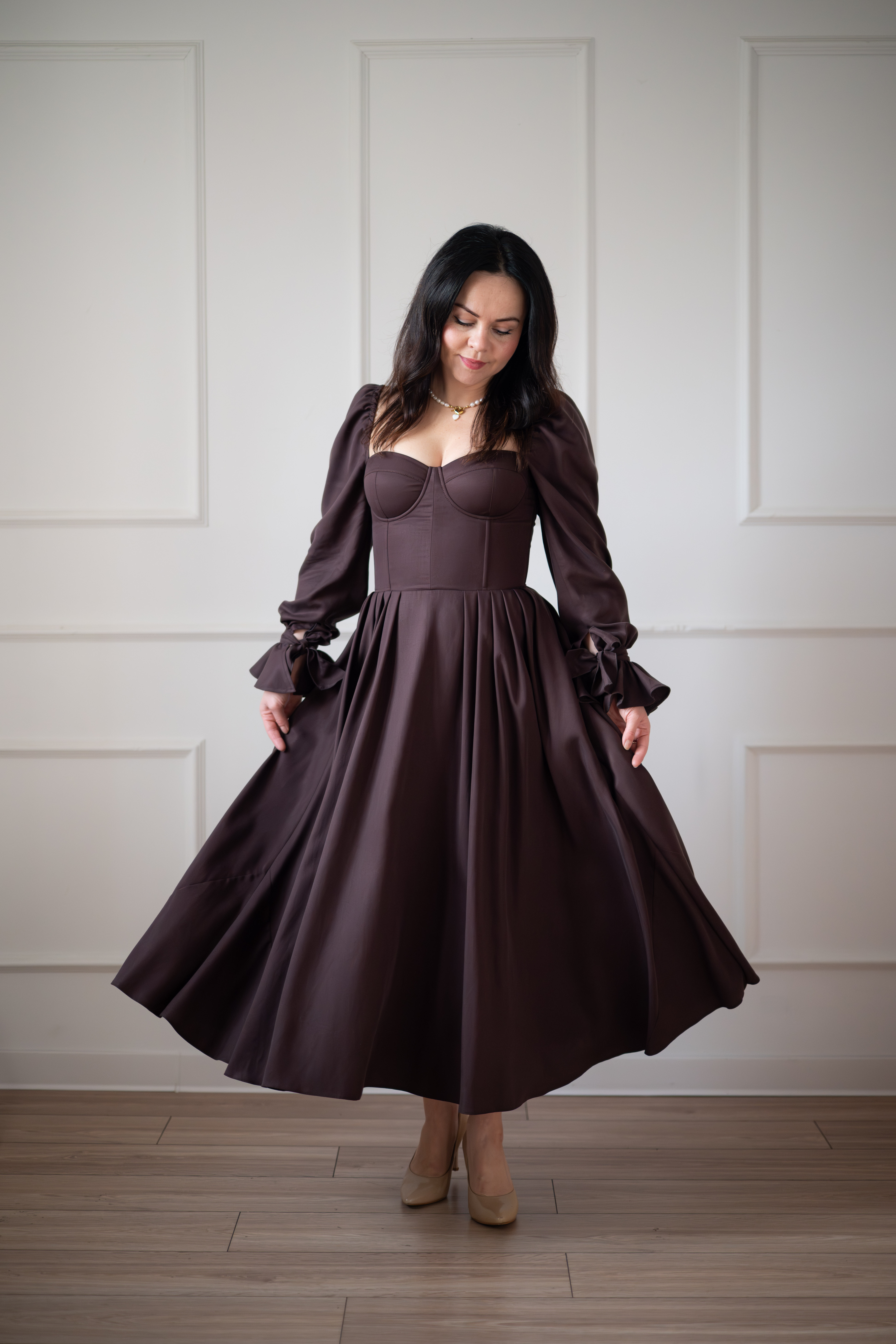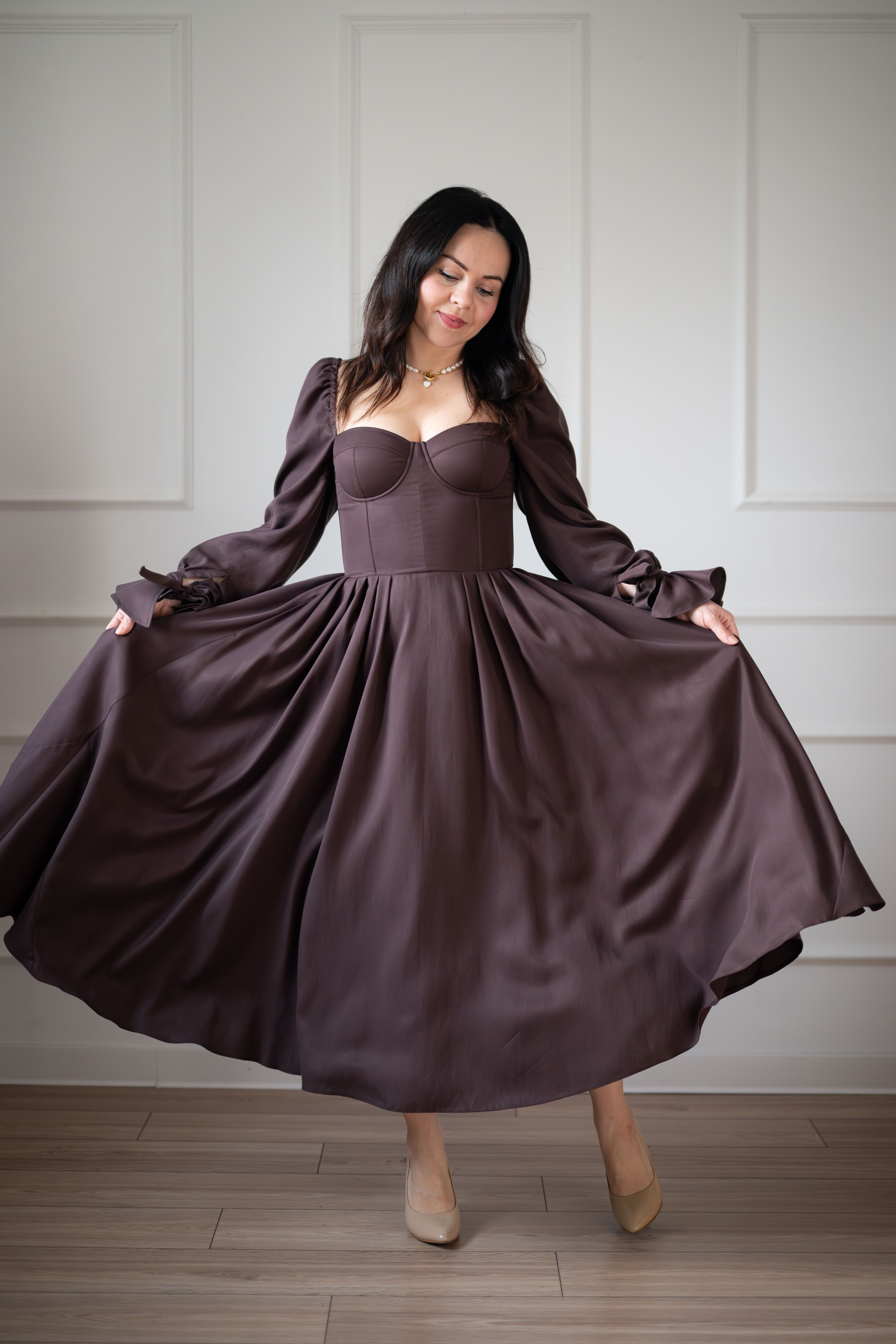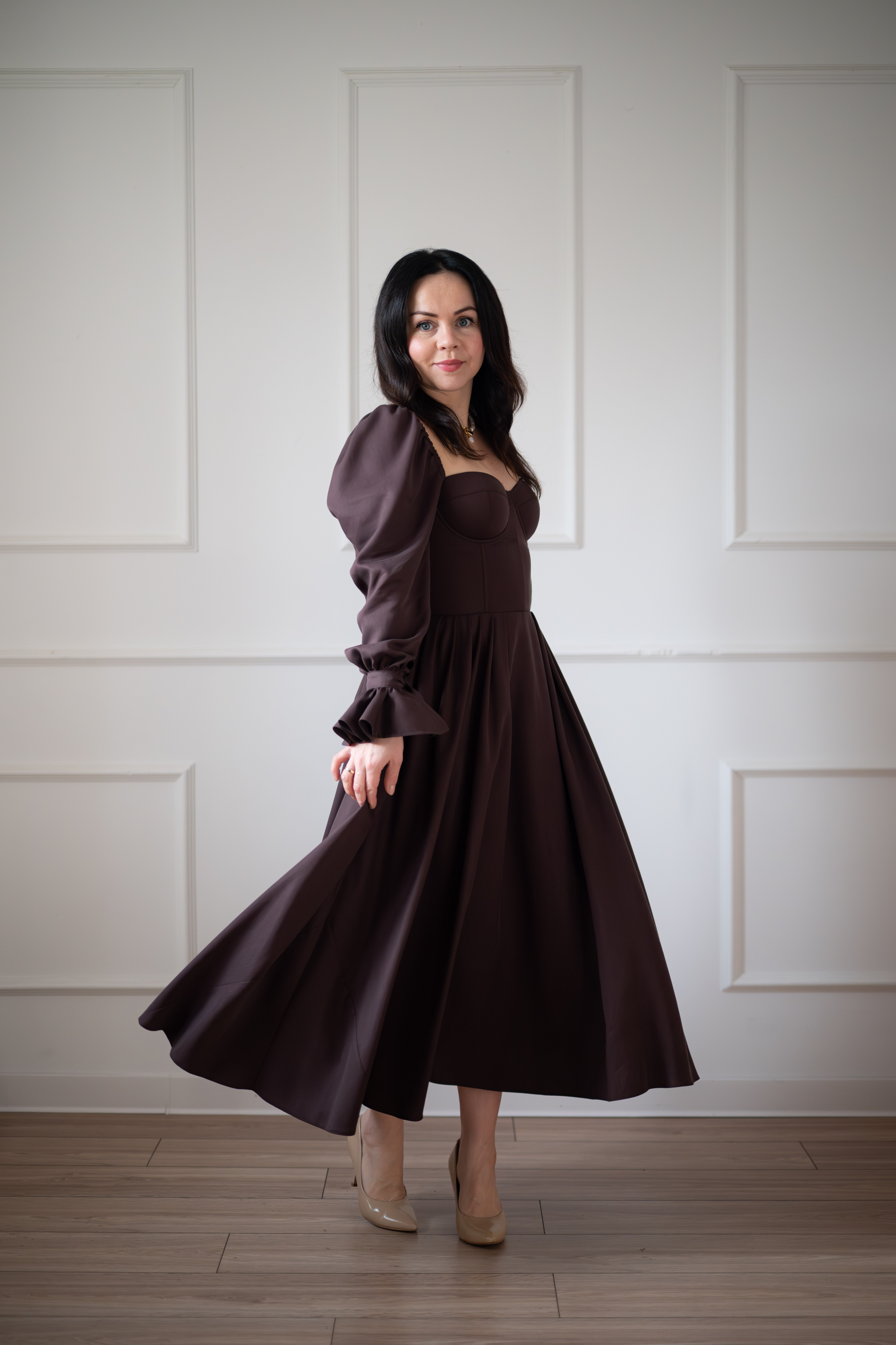 Sukienka gorsetowa z usztywnianymi miseczkami, dzięki którym nie ma potrzeby zakładania stanika. Góra została usztywniona fiszbinami, które pięknie modelują talię. Tył sukienki posiada wiązanie pozwalające na regulację oraz indywidualne dopasowanie, natomiast spódnica zapinana jest na zamek kryty. Sukienka Eliza posiada rękawy wykończone u góry gumką dzięki, której nie spadają z ramion oraz kieszenie w szwach bocznych. Dodatkowo w zestawie dołączona jest wkładka pod wiązanie z tyłu aby zamaskować plecy.