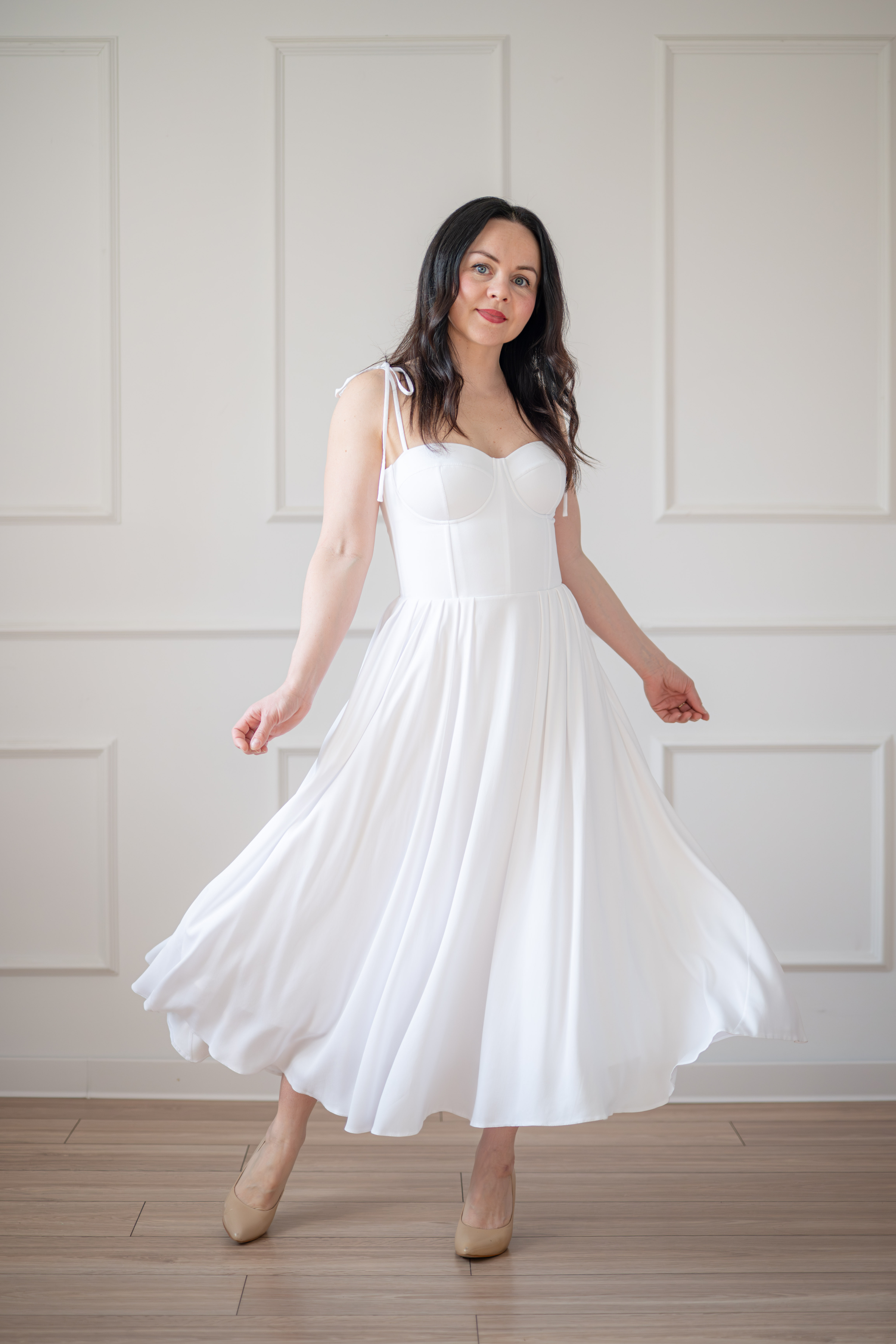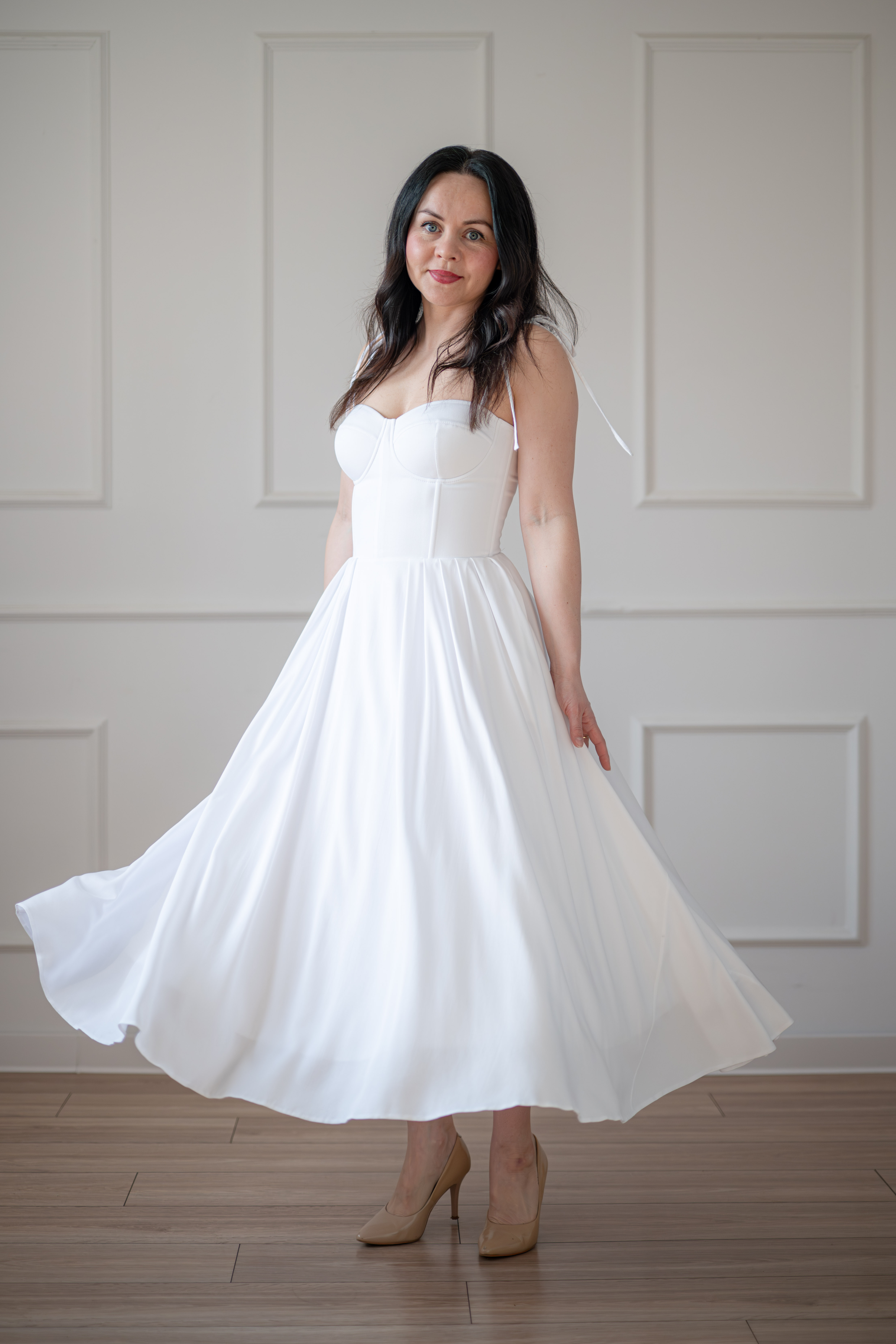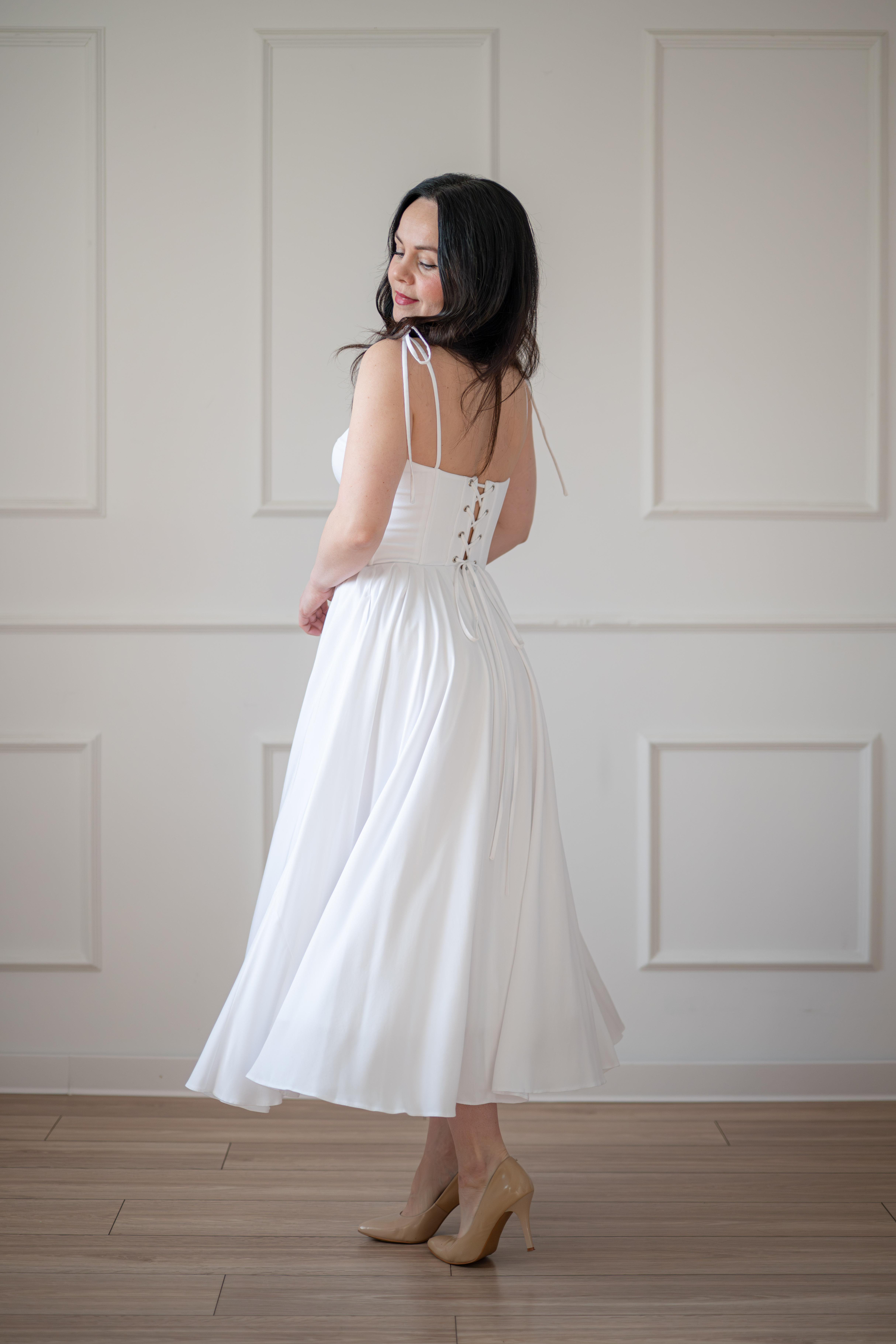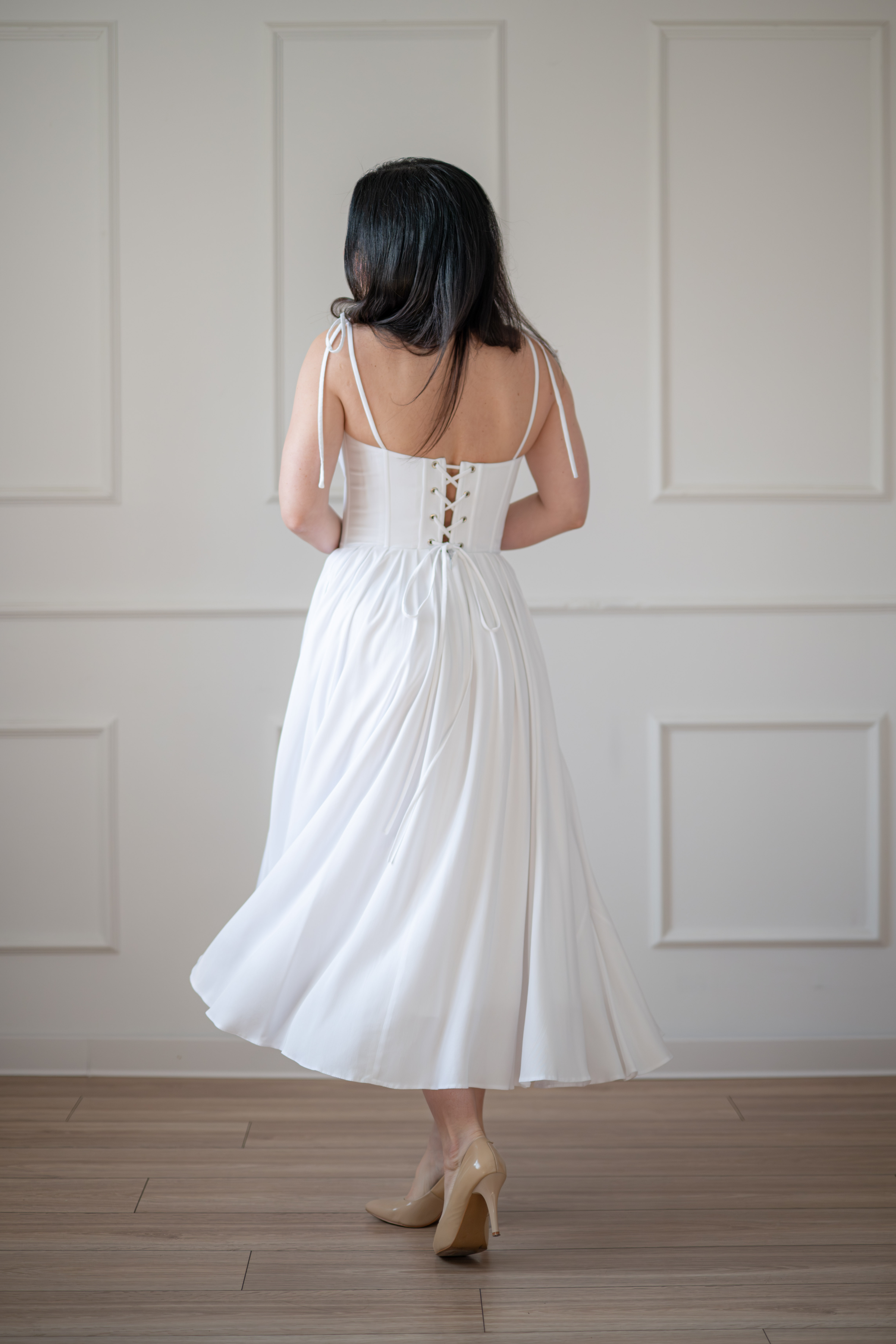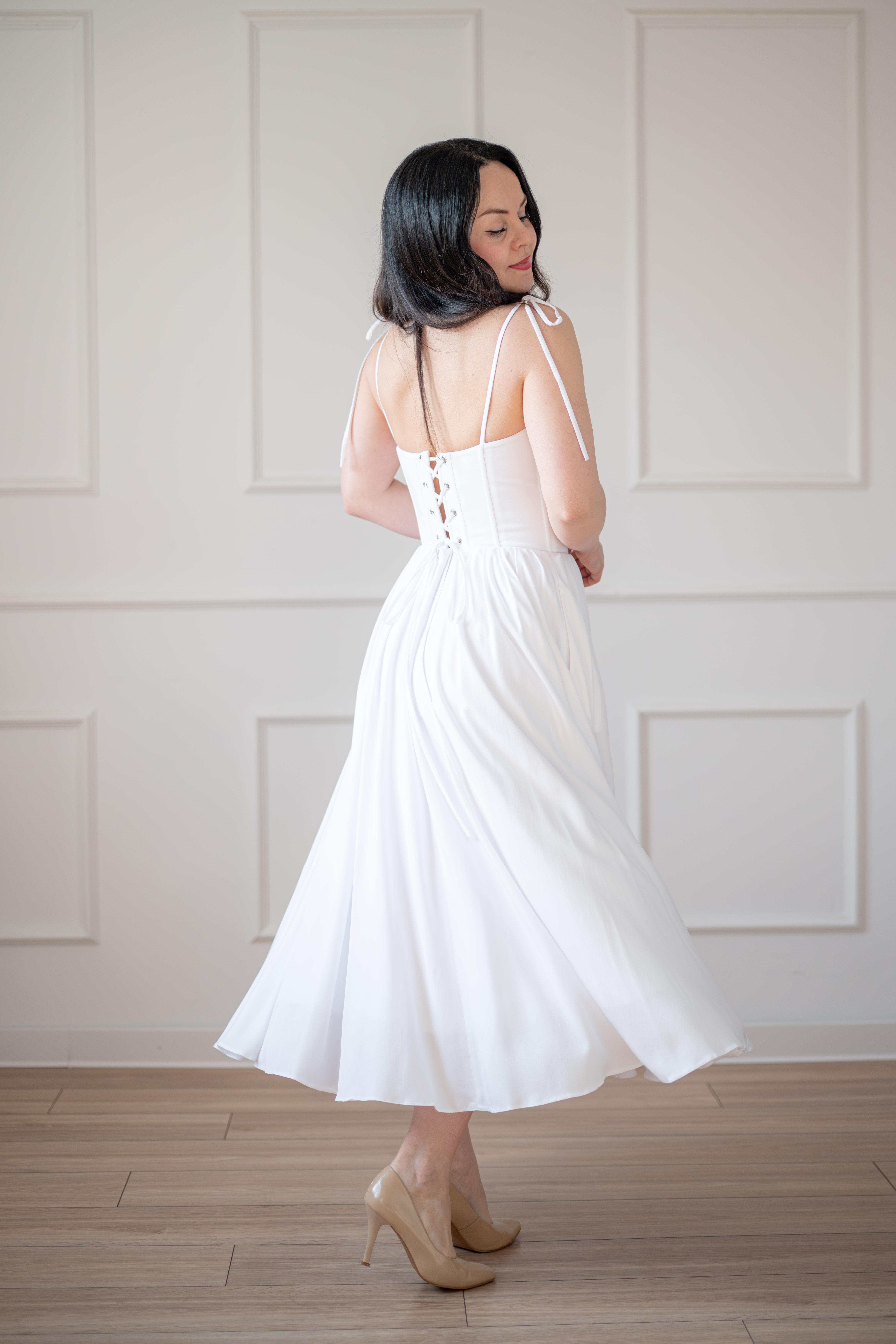 Sukienka gorsetowa z usztywnianymi miseczkami, dzięki którym nie ma potrzeby zakładania stanika. Góra została usztywniona fiszbinami, które pięknie modelują talię. Tył sukienki posiada wiązanie pozwalające na regulację oraz indywidualne dopasowanie, natomiast spódnica zapinana jest na zamek kryty. Sukienka Madlen posiada wiązane ramiączka oraz kieszenie w szwach bocznych. Dodatkowo w zestawie dołączona jest wkładka pod wiązanie z tyłu aby zamaskować plecy.