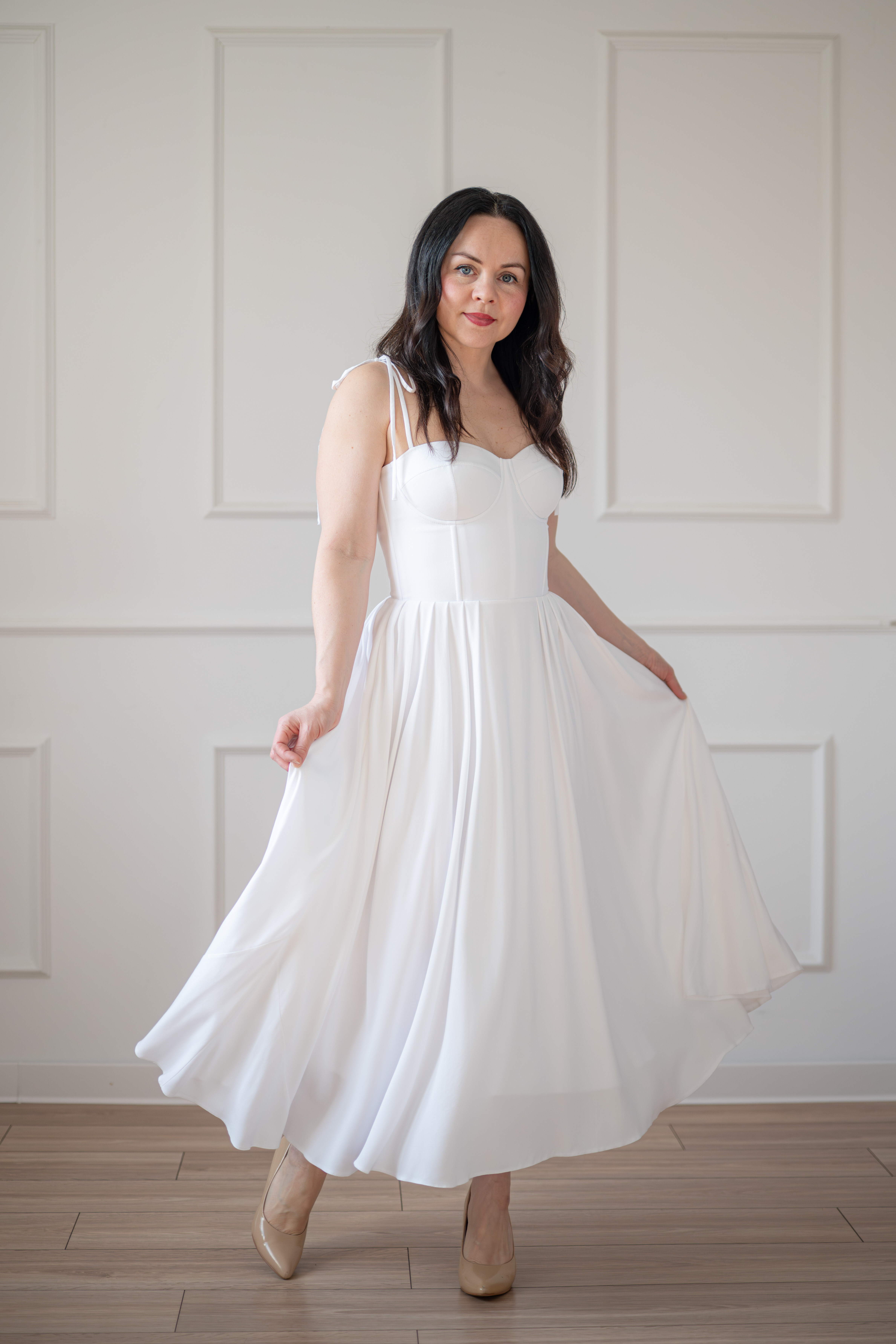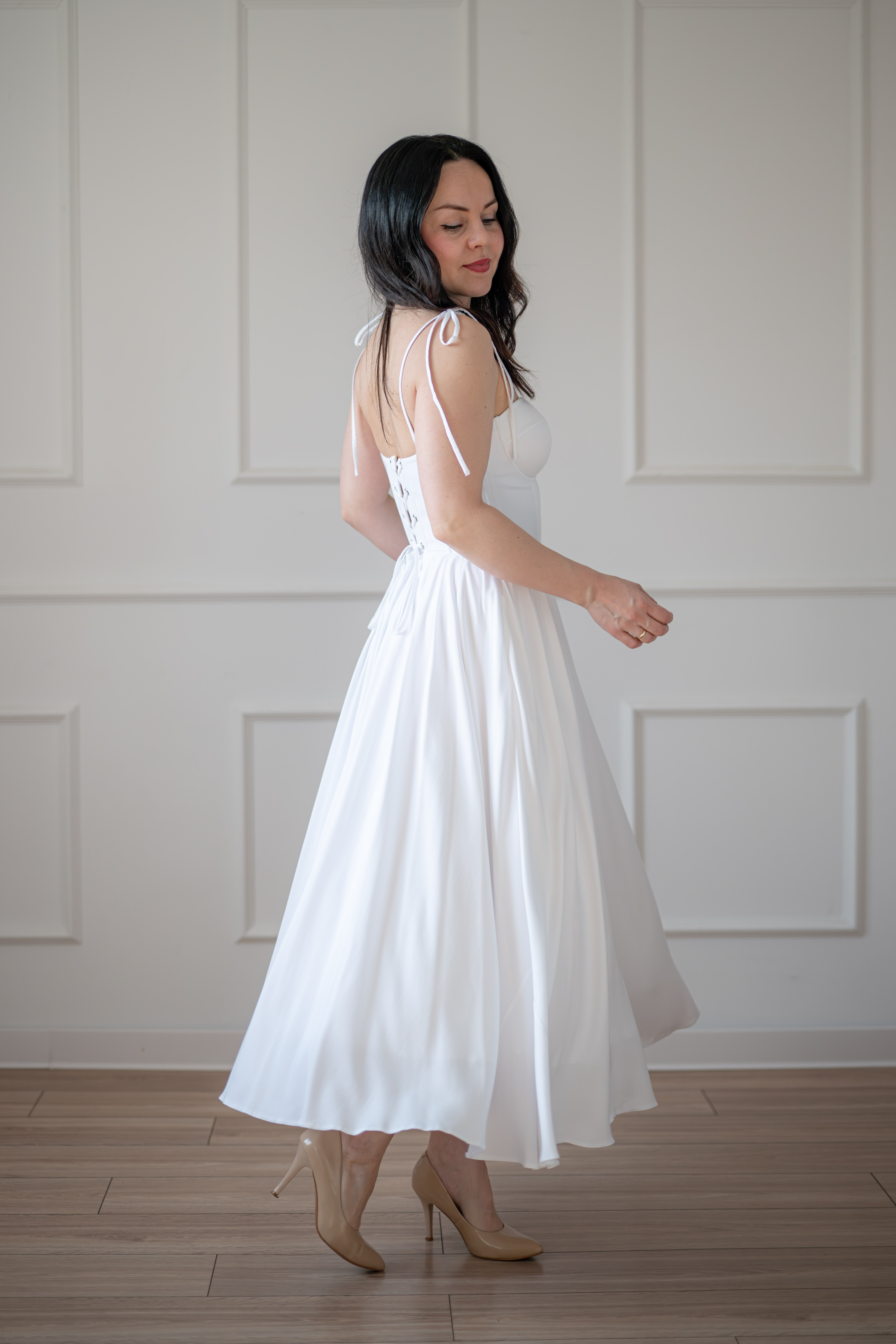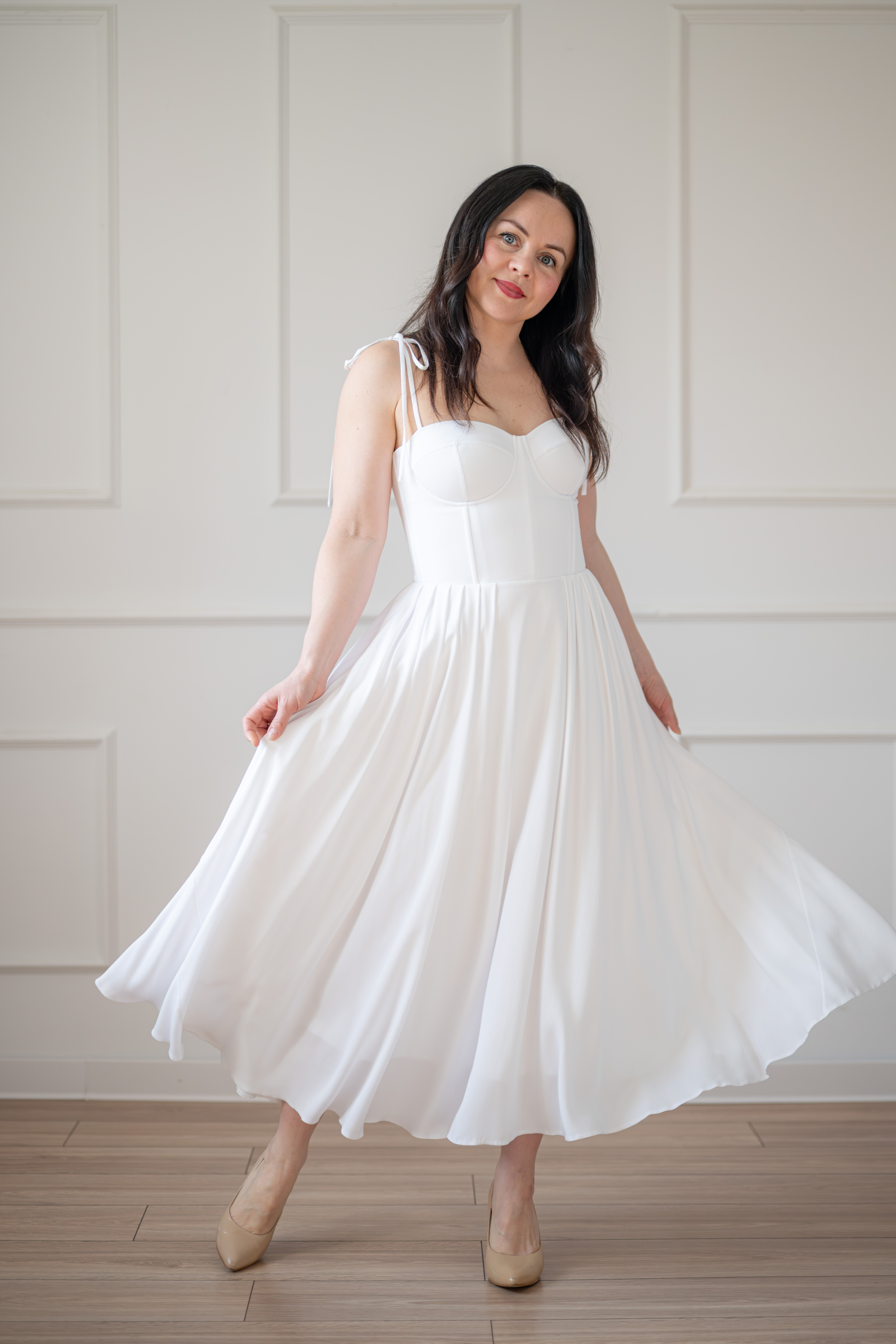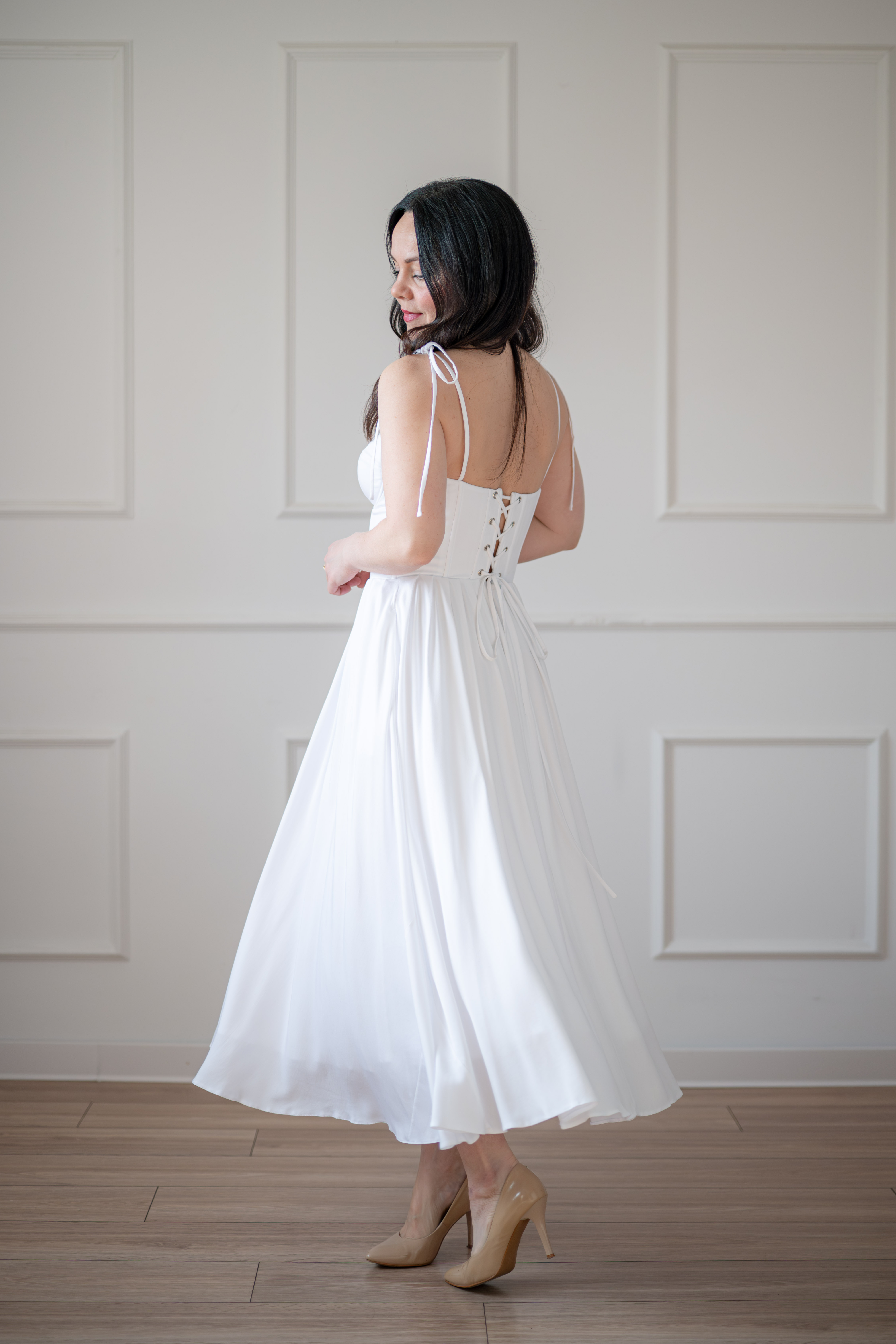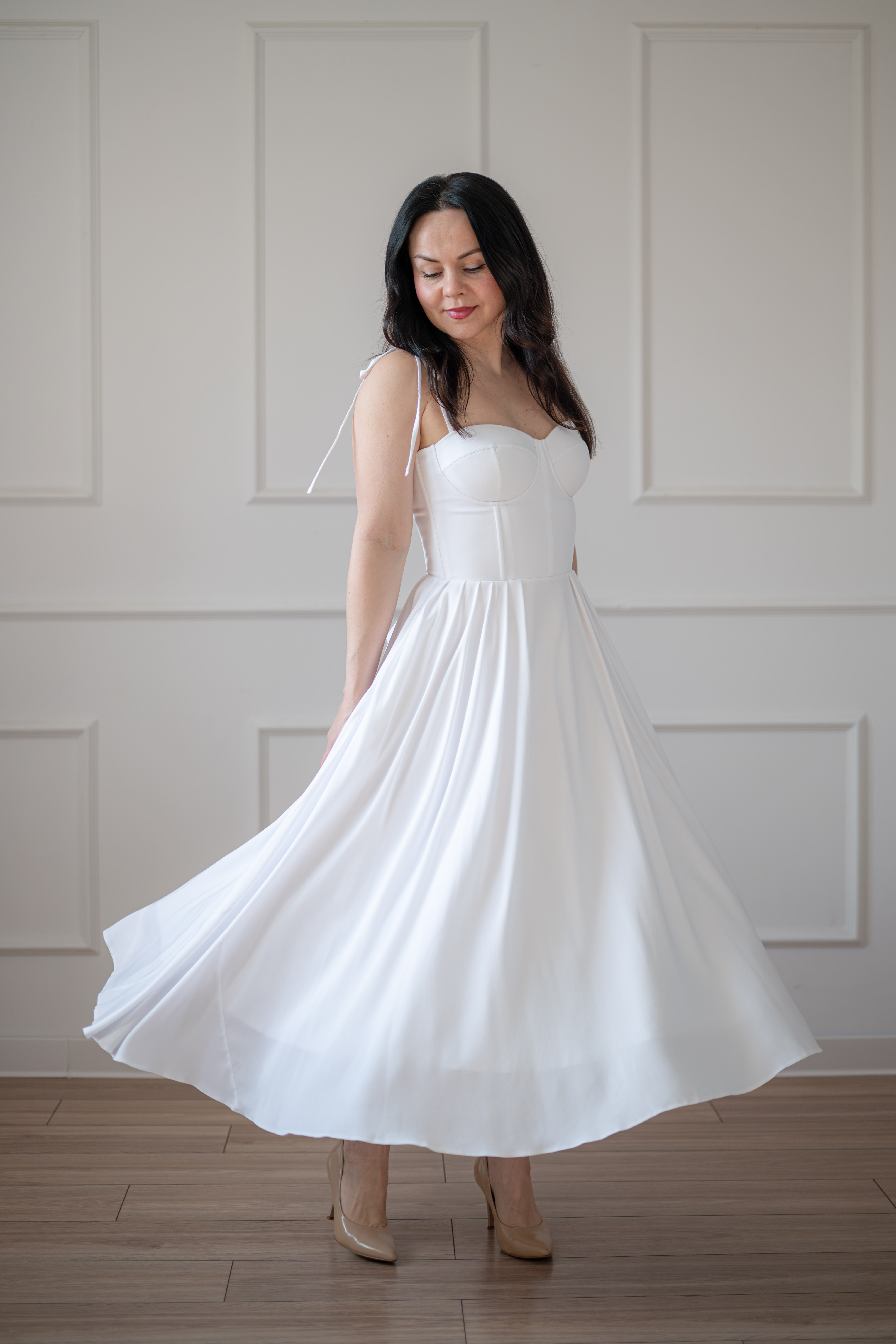 Sukienka gorsetowa z usztywnianymi miseczkami, dzięki którym nie ma potrzeby zakładania stanika. Góra została usztywniona fiszbinami, które pięknie modelują talię. Tył sukienki posiada wiązanie pozwalające na regulację oraz indywidualne dopasowanie, natomiast spódnica zapinana jest na zamek kryty. Sukienka Madlen posiada wiązane ramiączka oraz kieszenie w szwach bocznych. Dodatkowo w zestawie dołączona jest wkładka pod wiązanie z tyłu aby zamaskować plecy.