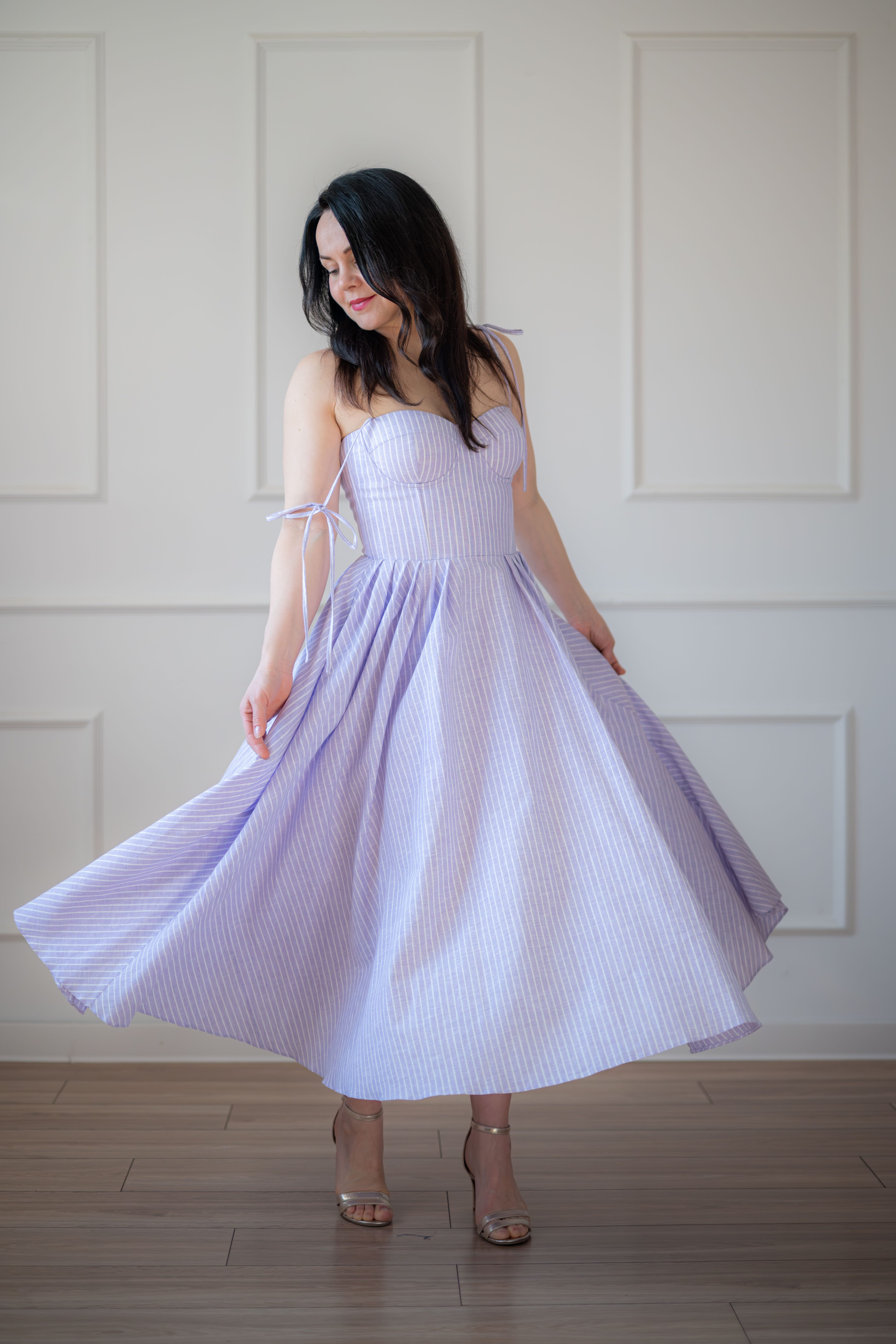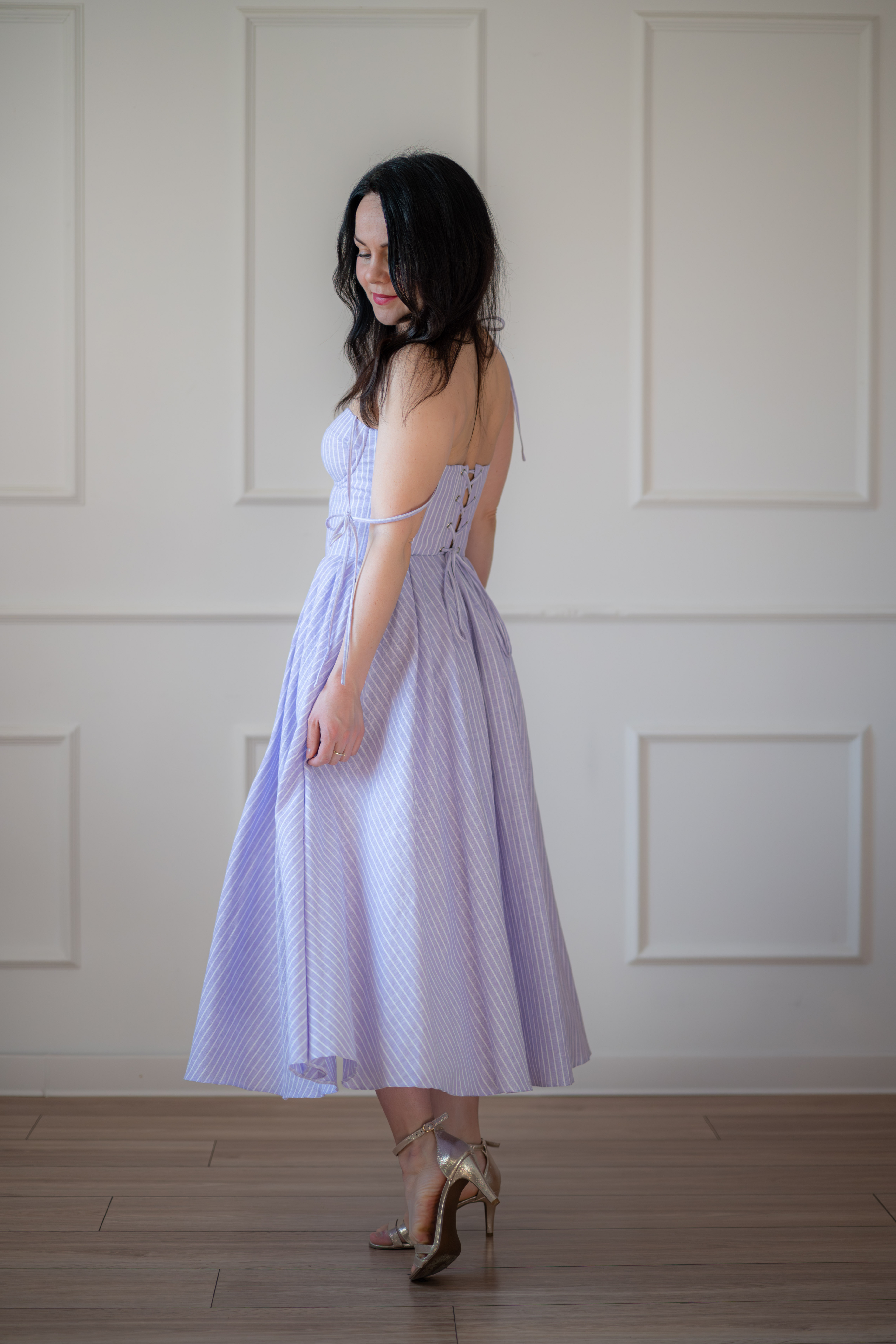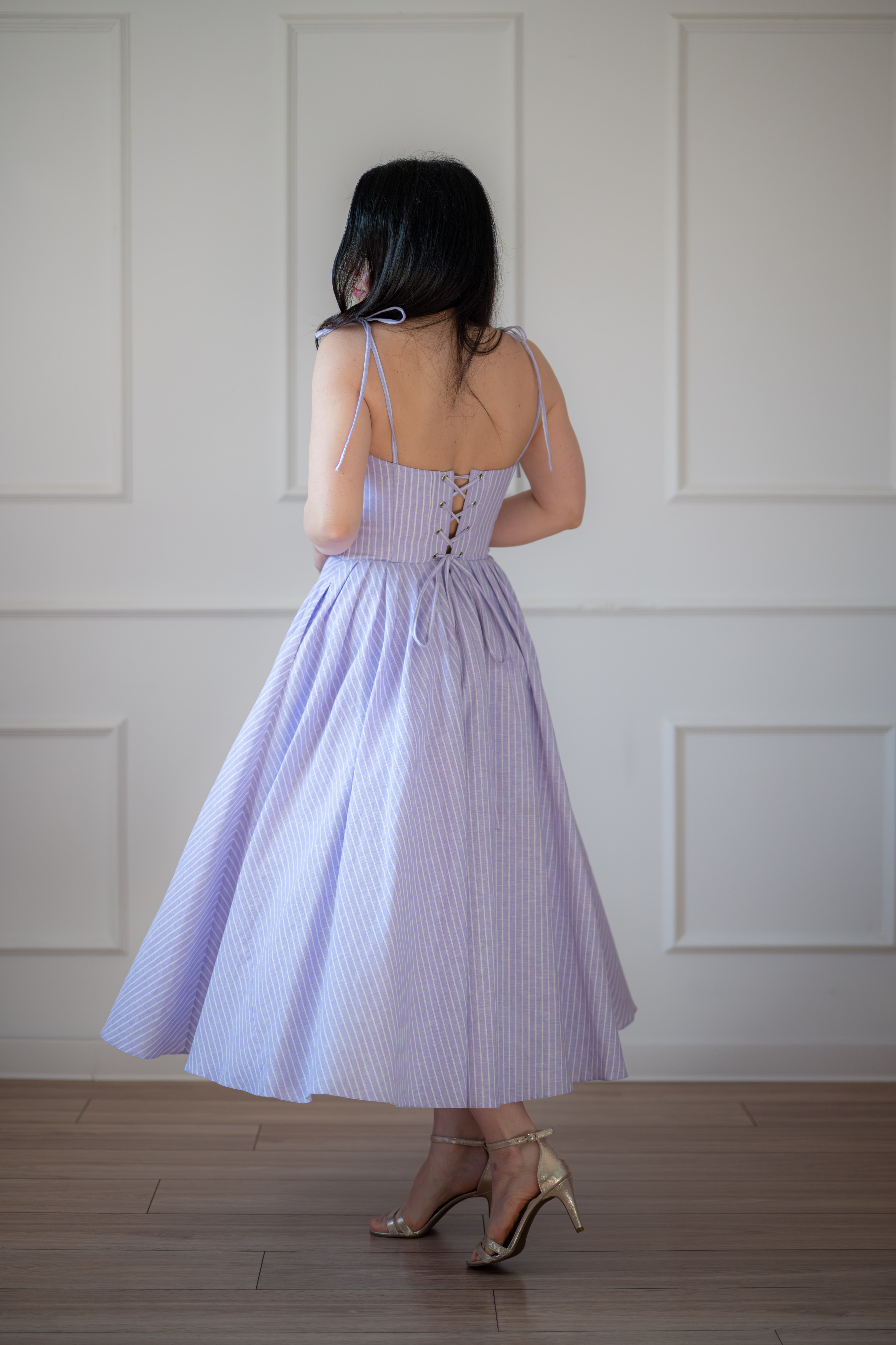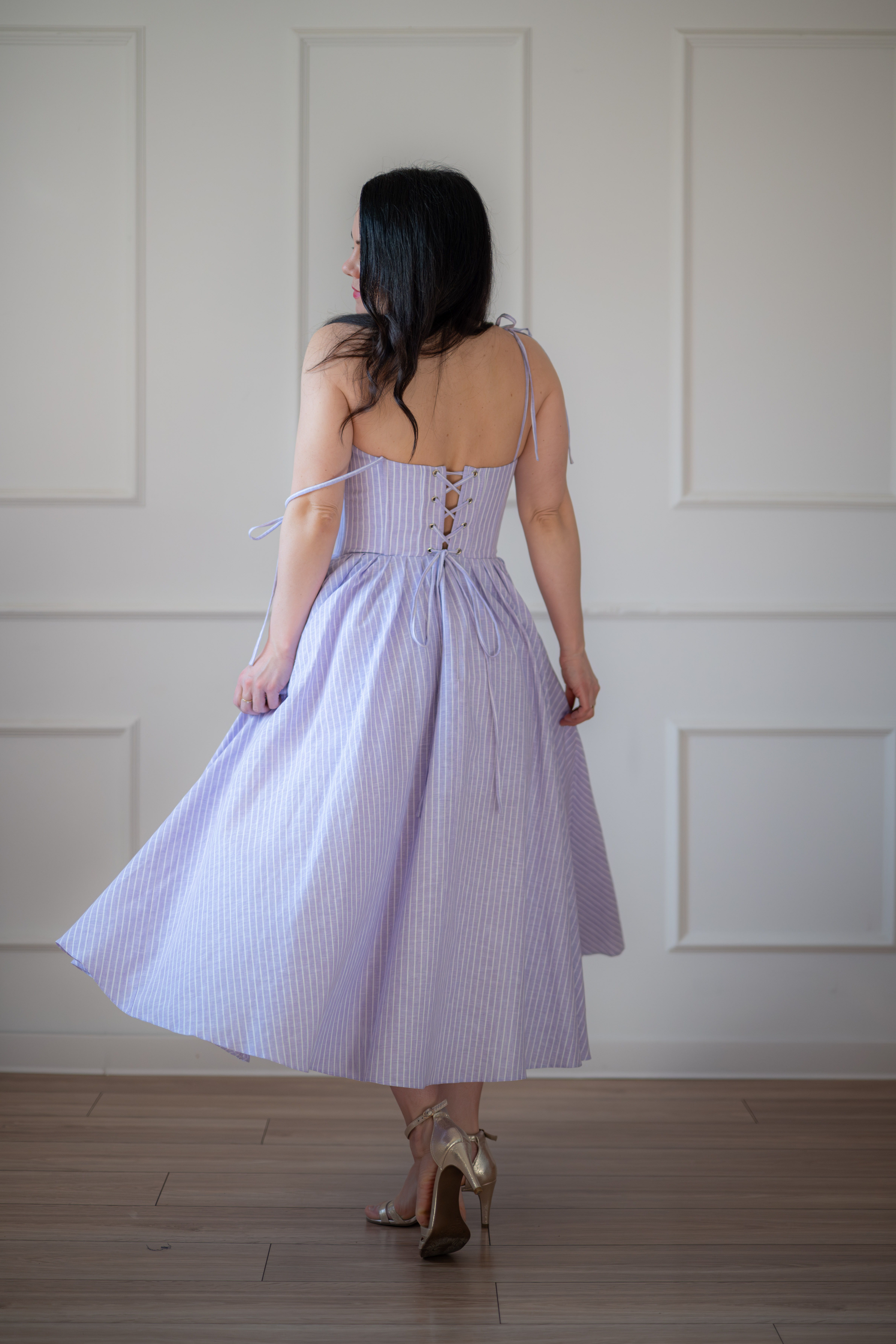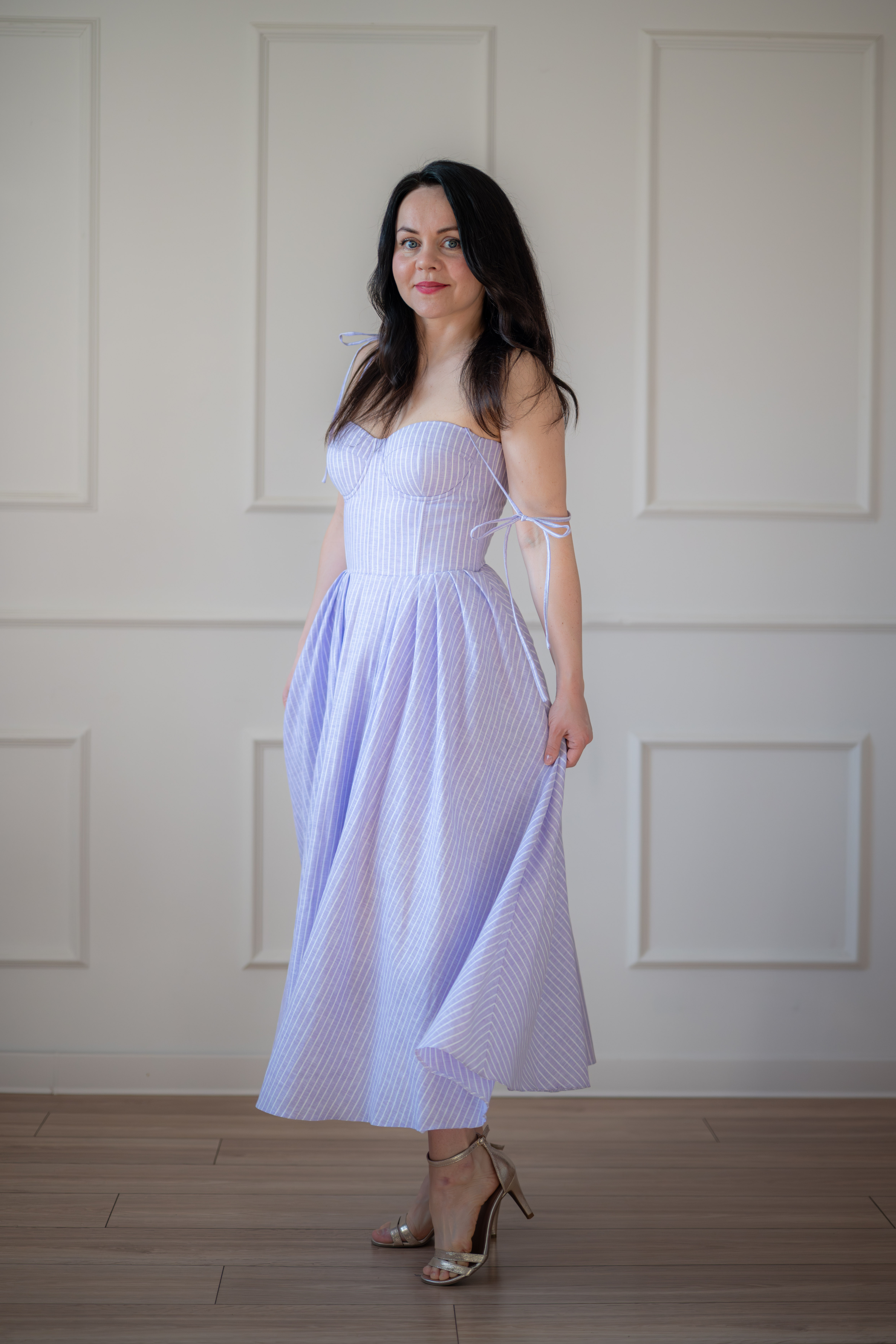 Sukienka gorsetowa z usztywnianymi miseczkami, dzięki którym nie ma potrzeby zakładania stanika. Góra została usztywniona fiszbinami, które pięknie modelują talię. Tył sukienki posiada wiązanie pozwalające na regulację oraz indywidualne dopasowanie, natomiast spódnica zapinana jest na zamek kryty. Sukienka Madlen posiada wiązane ramiączka oraz kieszenie w szwach bocznych. Dodatkowo w zestawie dołączona jest wkładka pod wiązanie z tyłu aby zamaskować plecy.