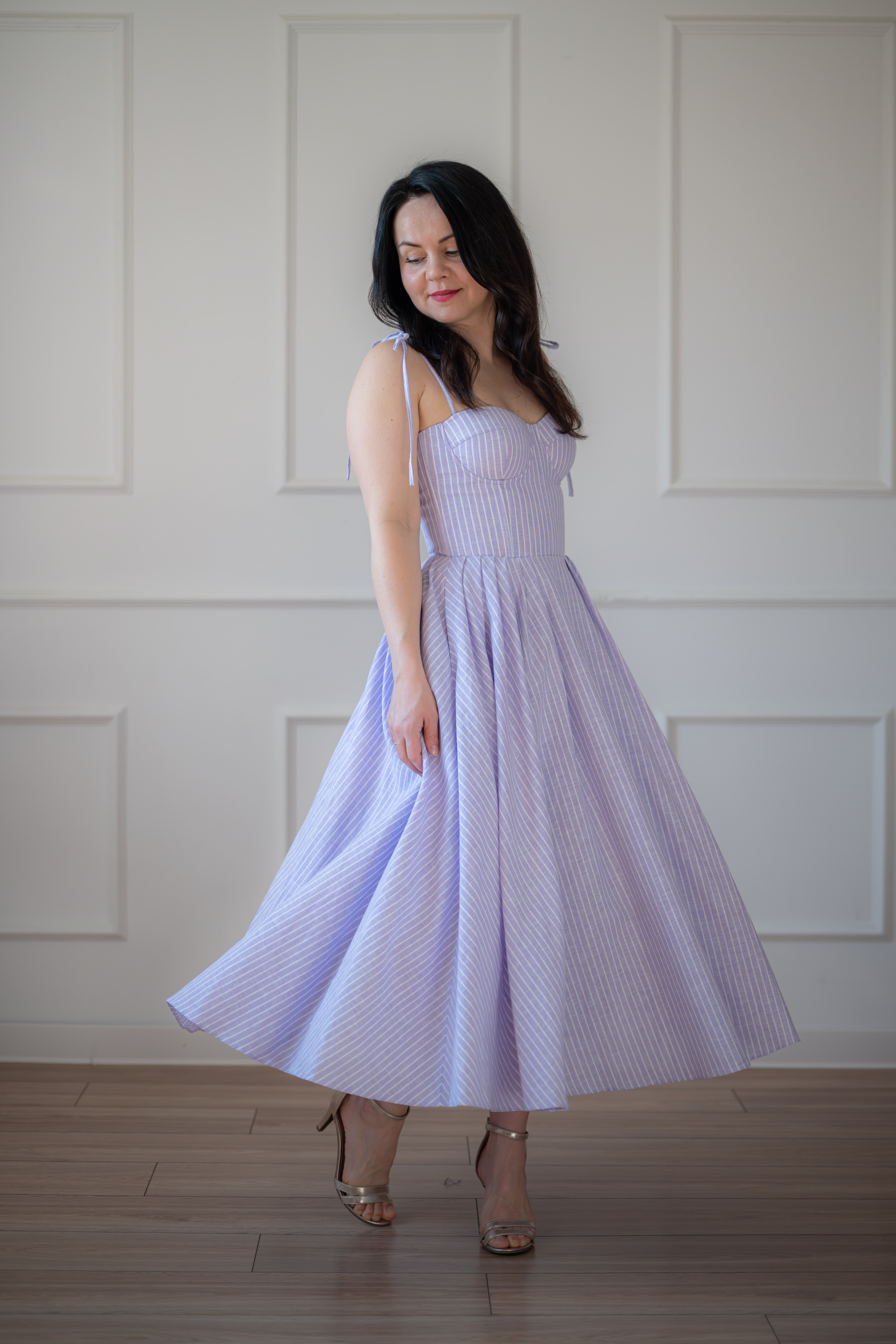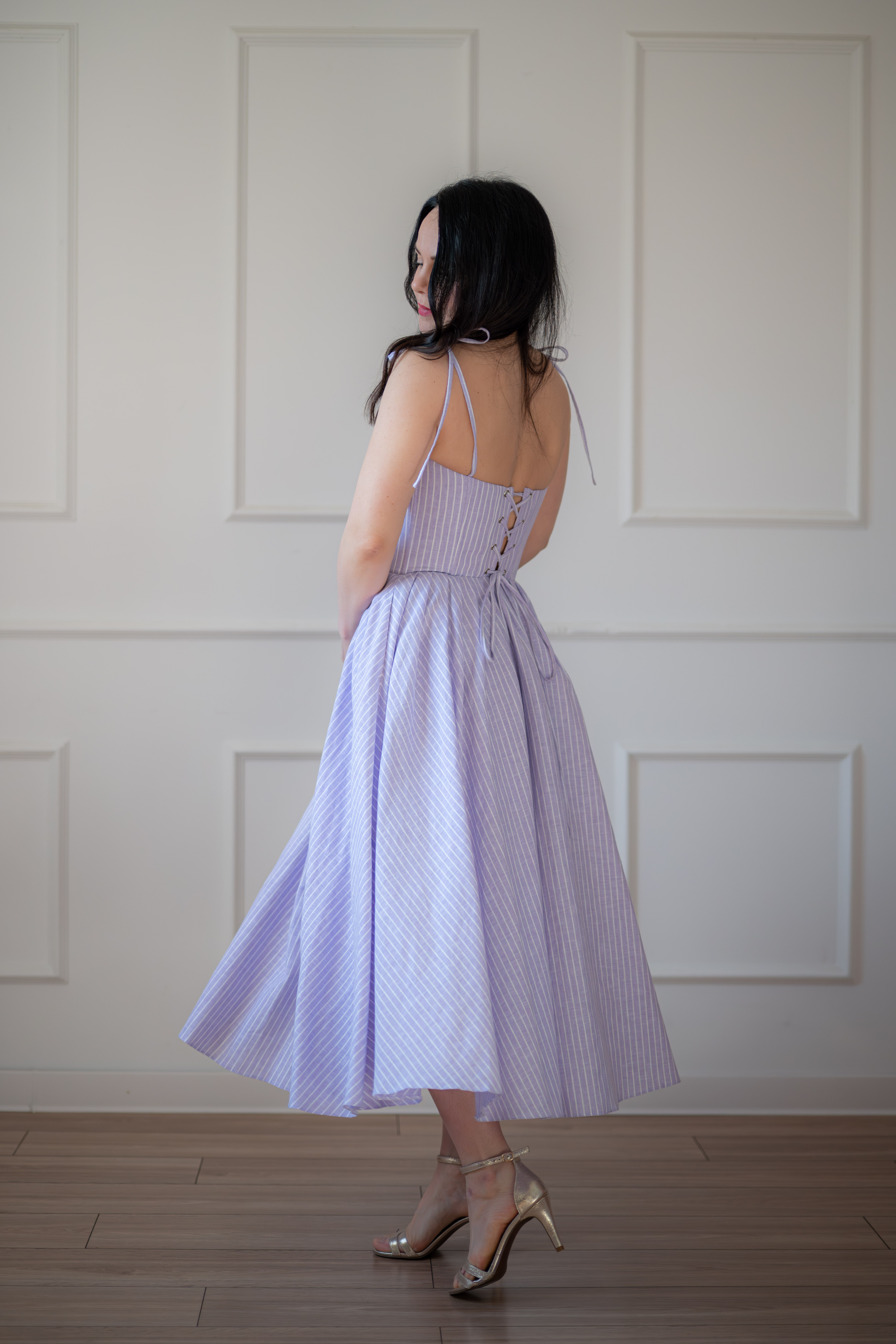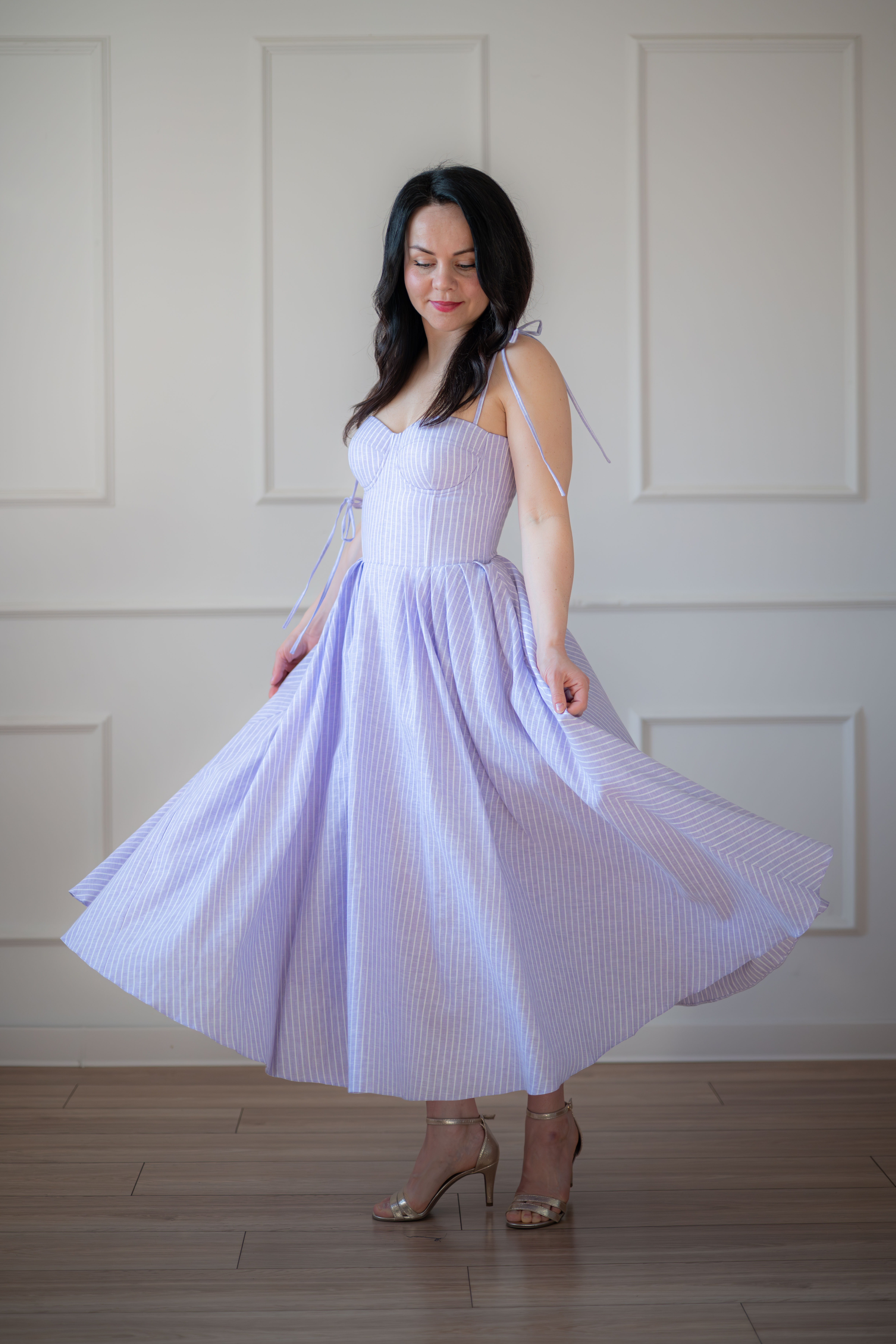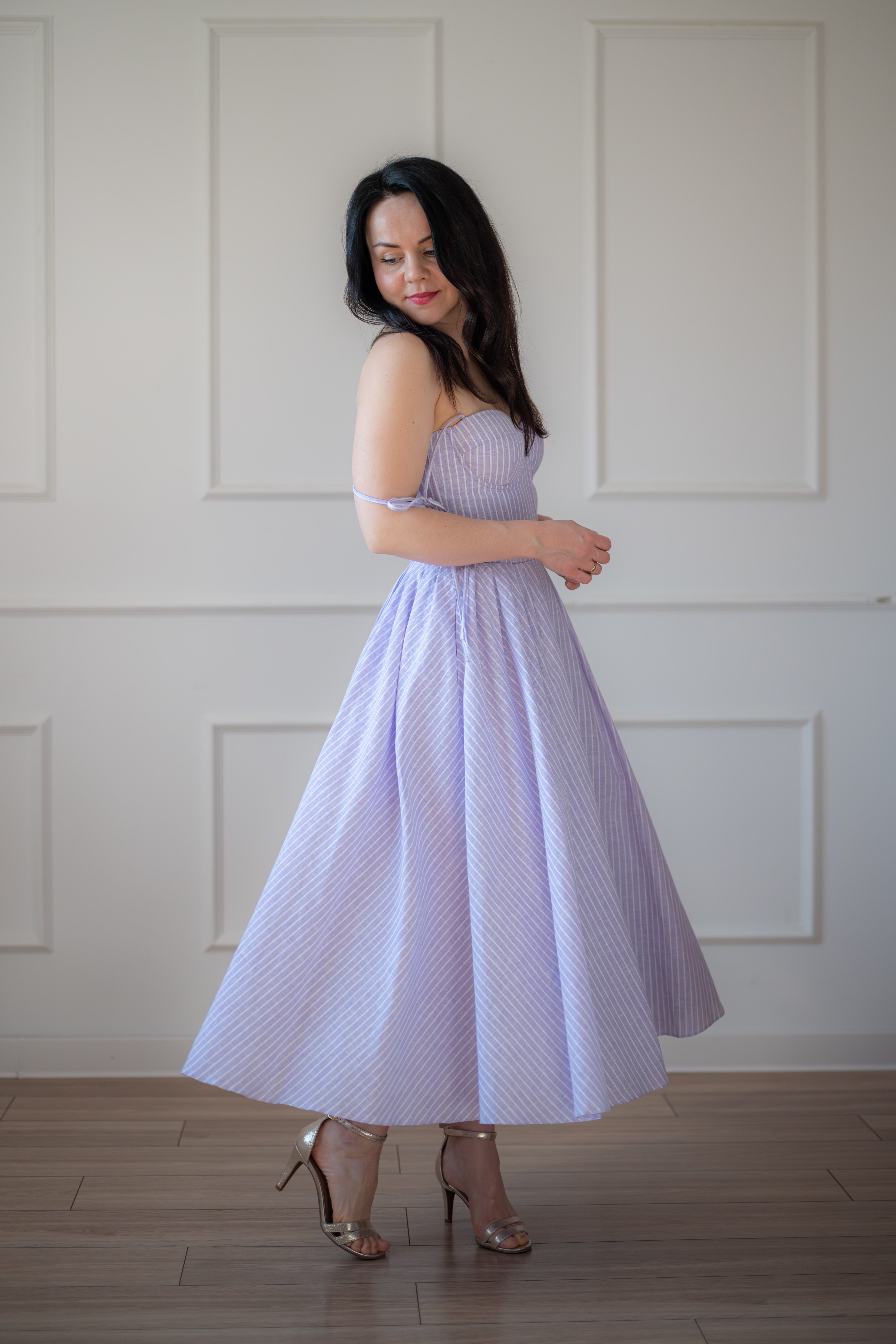Sukienka gorsetowa z usztywnianymi miseczkami, dzięki którym nie ma potrzeby zakładania stanika. Góra została usztywniona fiszbinami, które pięknie modelują talię. Tył sukienki posiada wiązanie pozwalające na regulację oraz indywidualne dopasowanie, natomiast spódnica zapinana jest na zamek kryty. Sukienka Madlen posiada wiązane ramiączka oraz kieszenie w szwach bocznych. Dodatkowo w zestawie dołączona jest wkładka pod wiązanie z tyłu aby zamaskować plecy.