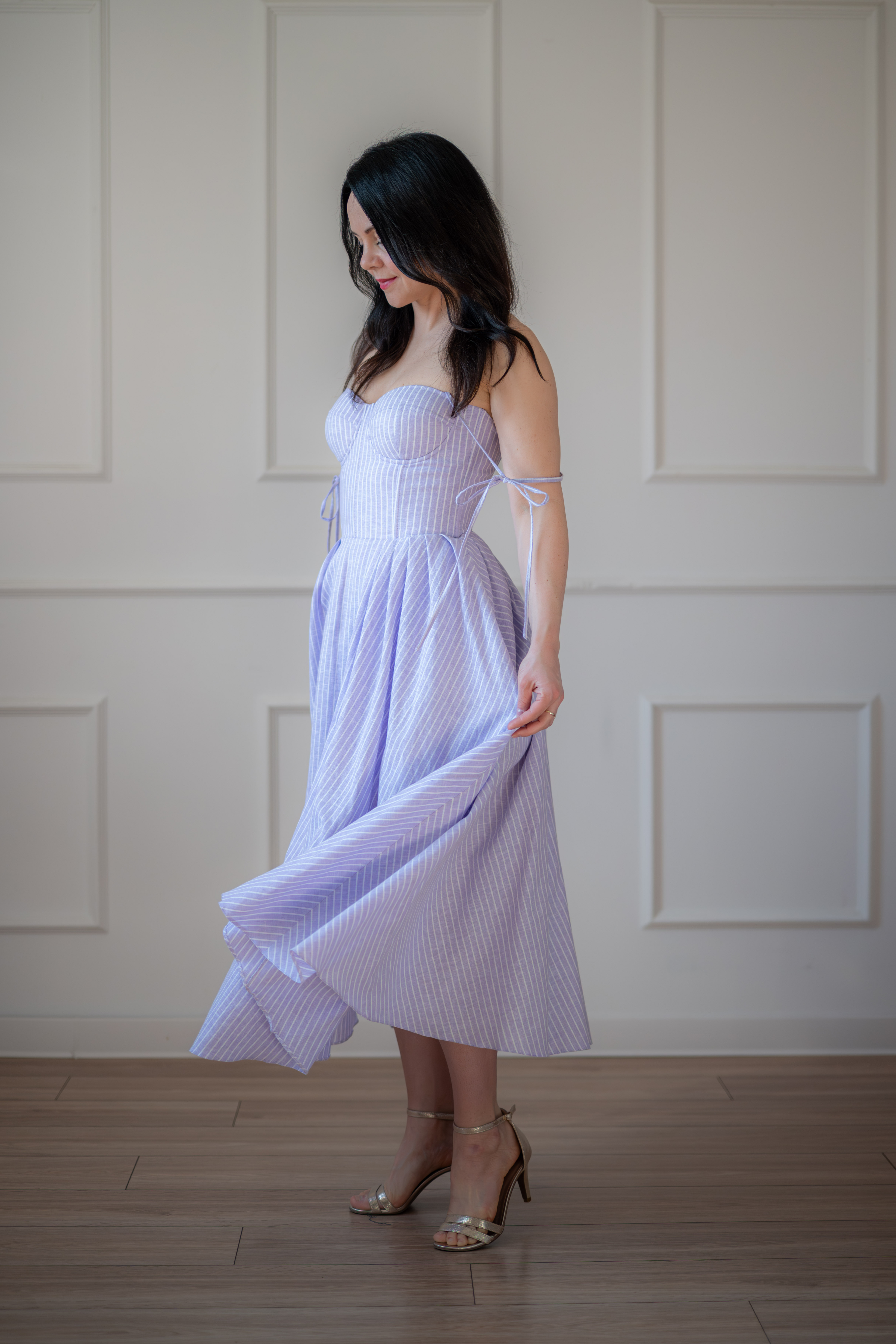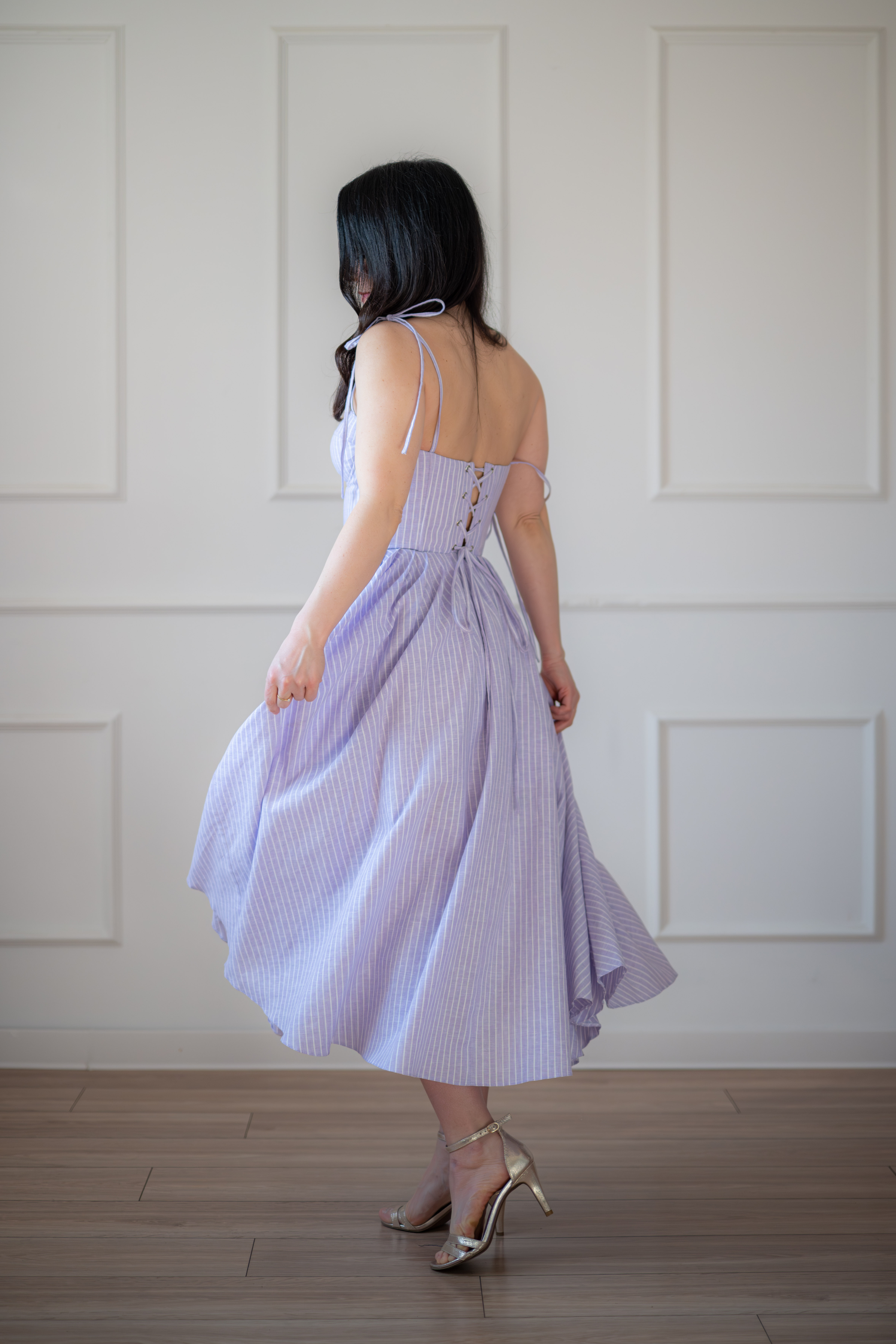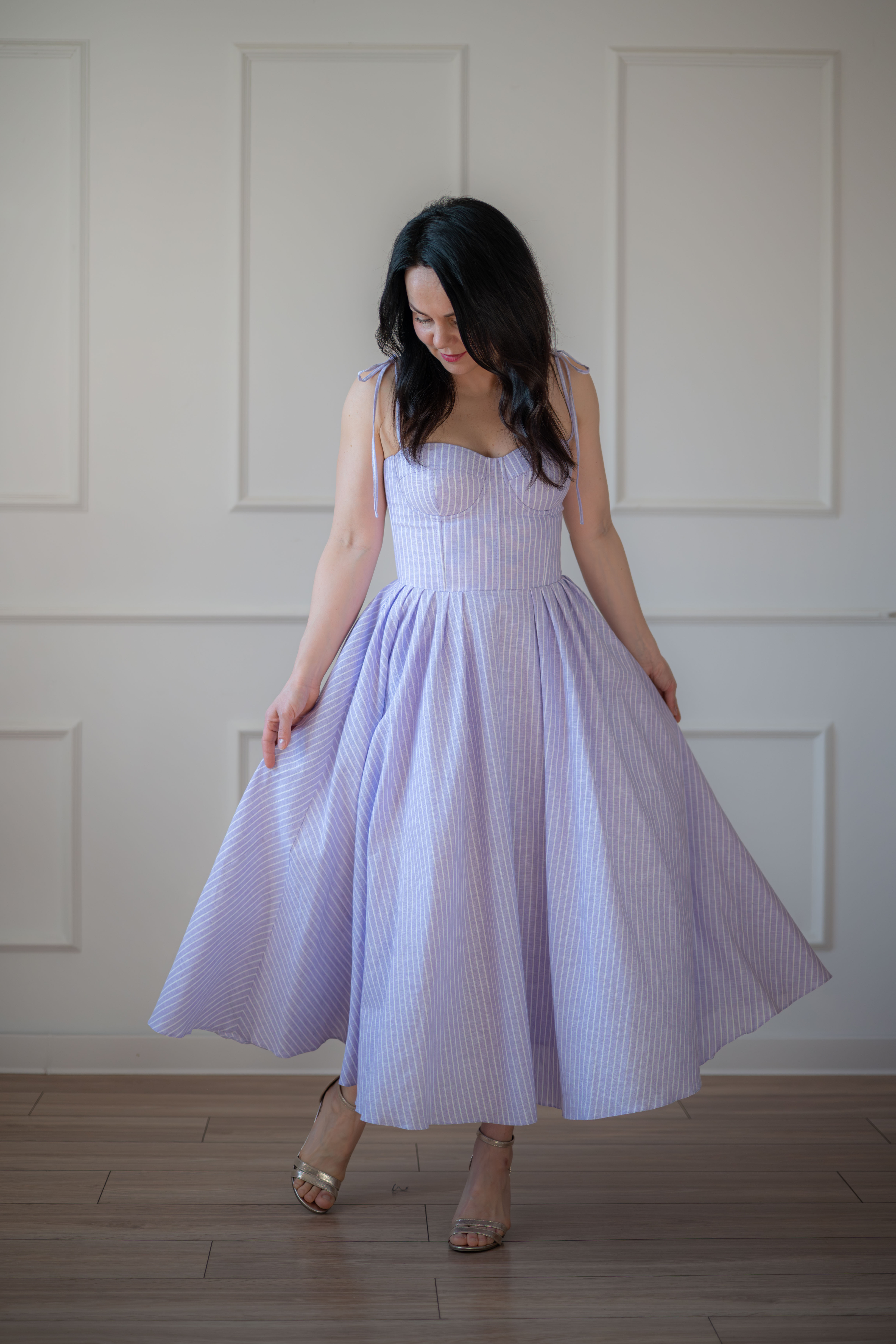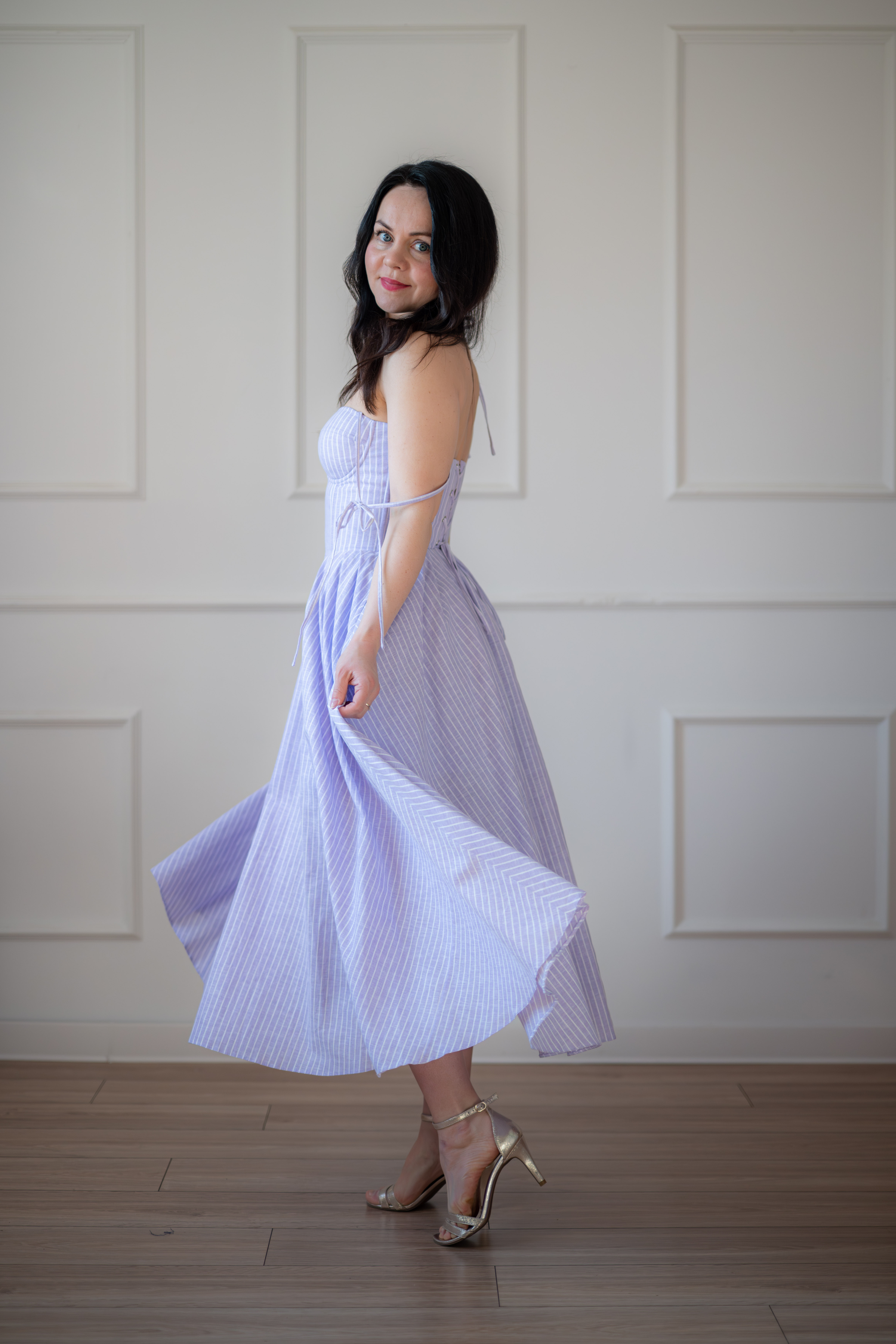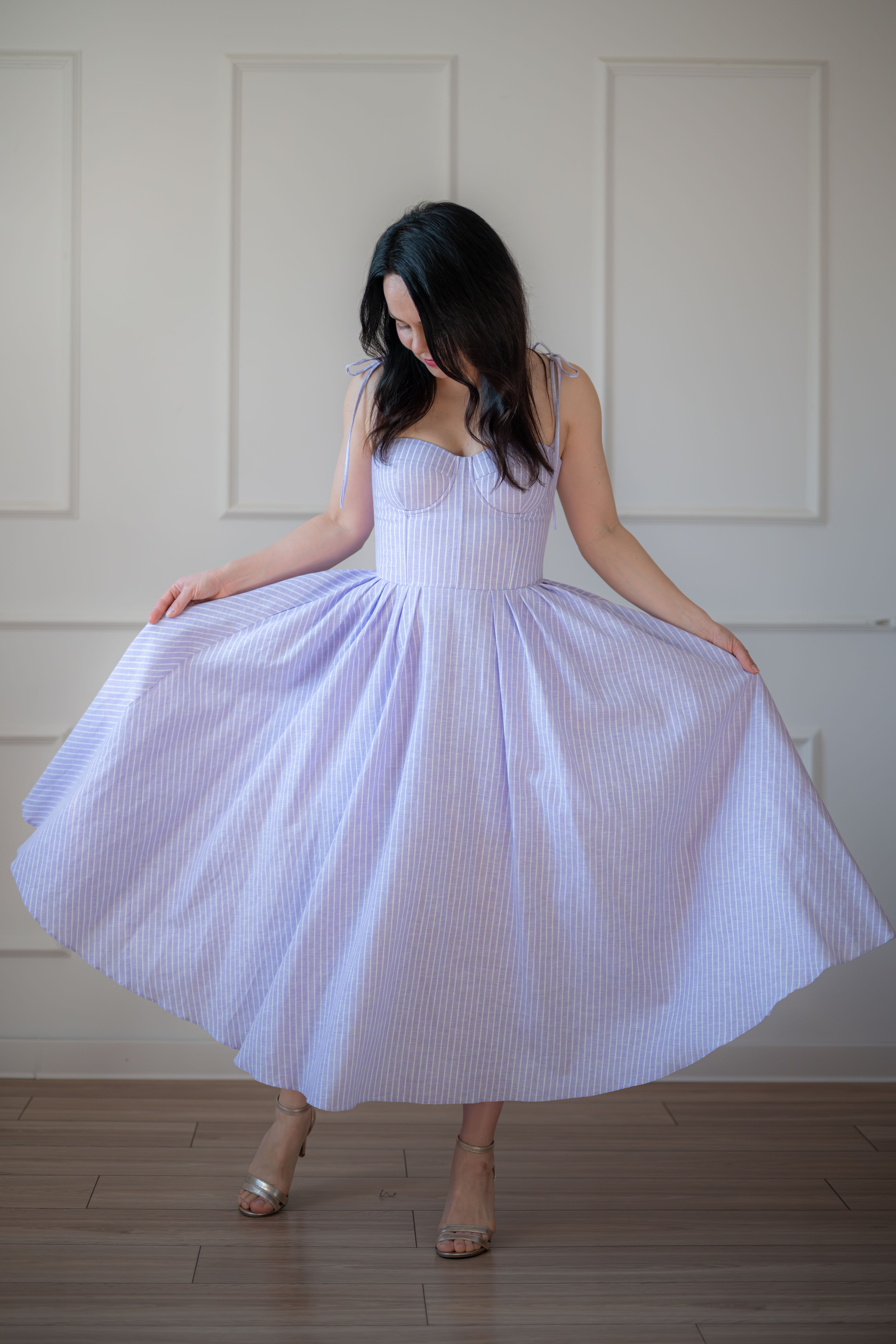 Sukienka gorsetowa z usztywnianymi miseczkami, dzięki którym nie ma potrzeby zakładania stanika. Góra została usztywniona fiszbinami, które pięknie modelują talię. Tył sukienki posiada wiązanie pozwalające na regulację oraz indywidualne dopasowanie, natomiast spódnica zapinana jest na zamek kryty. Sukienka Madlen posiada wiązane ramiączka oraz kieszenie w szwach bocznych. Dodatkowo w zestawie dołączona jest wkładka pod wiązanie z tyłu aby zamaskować plecy.