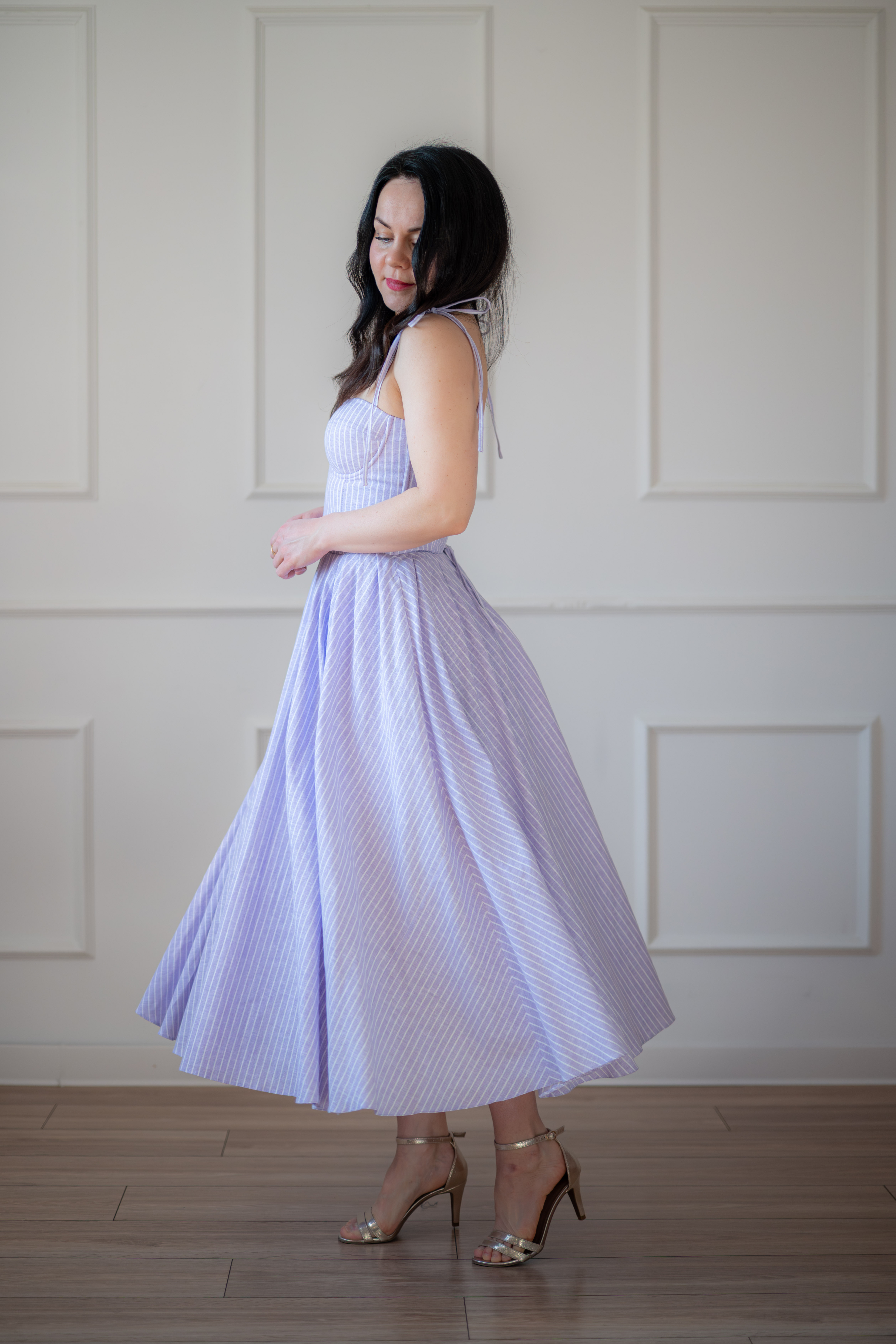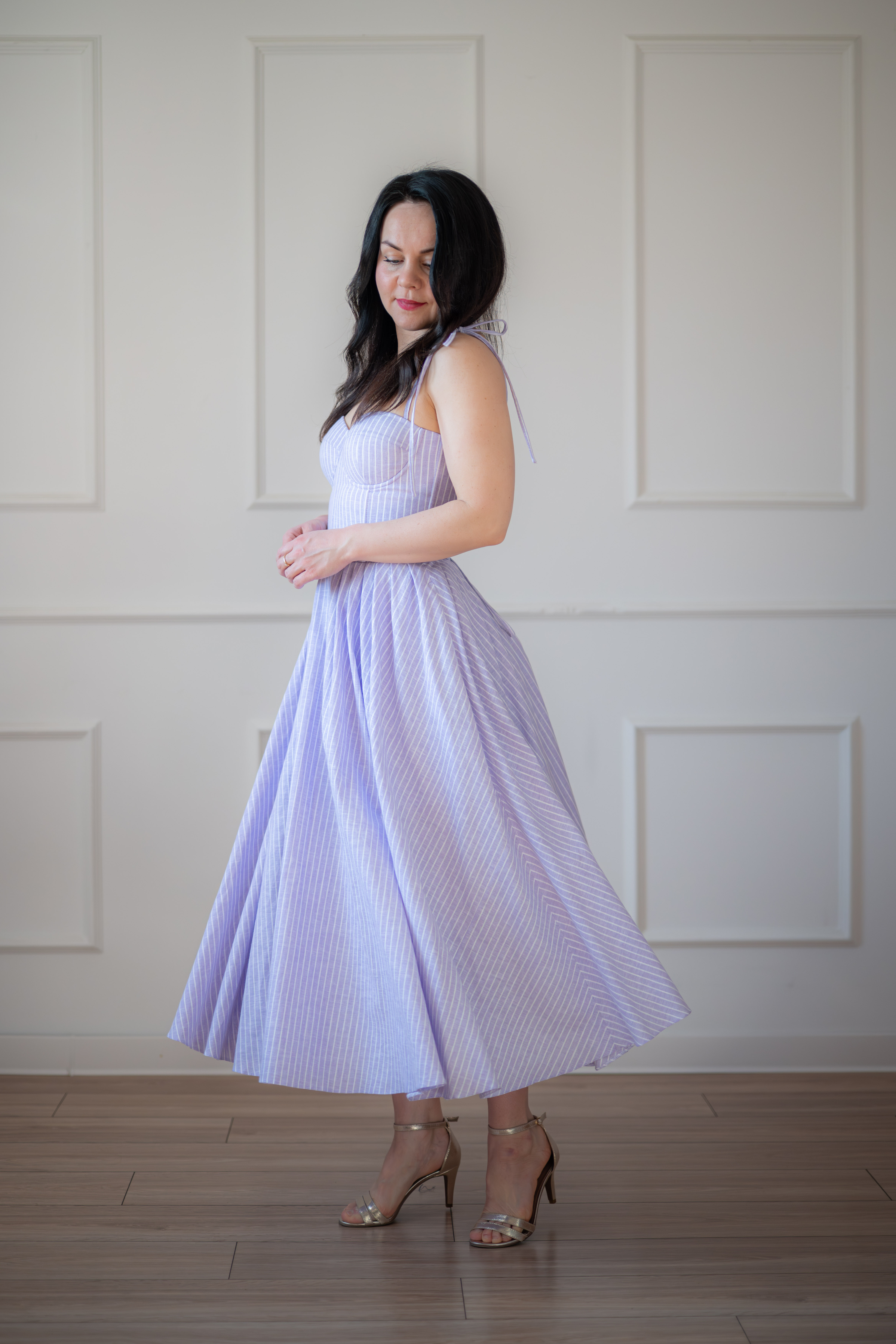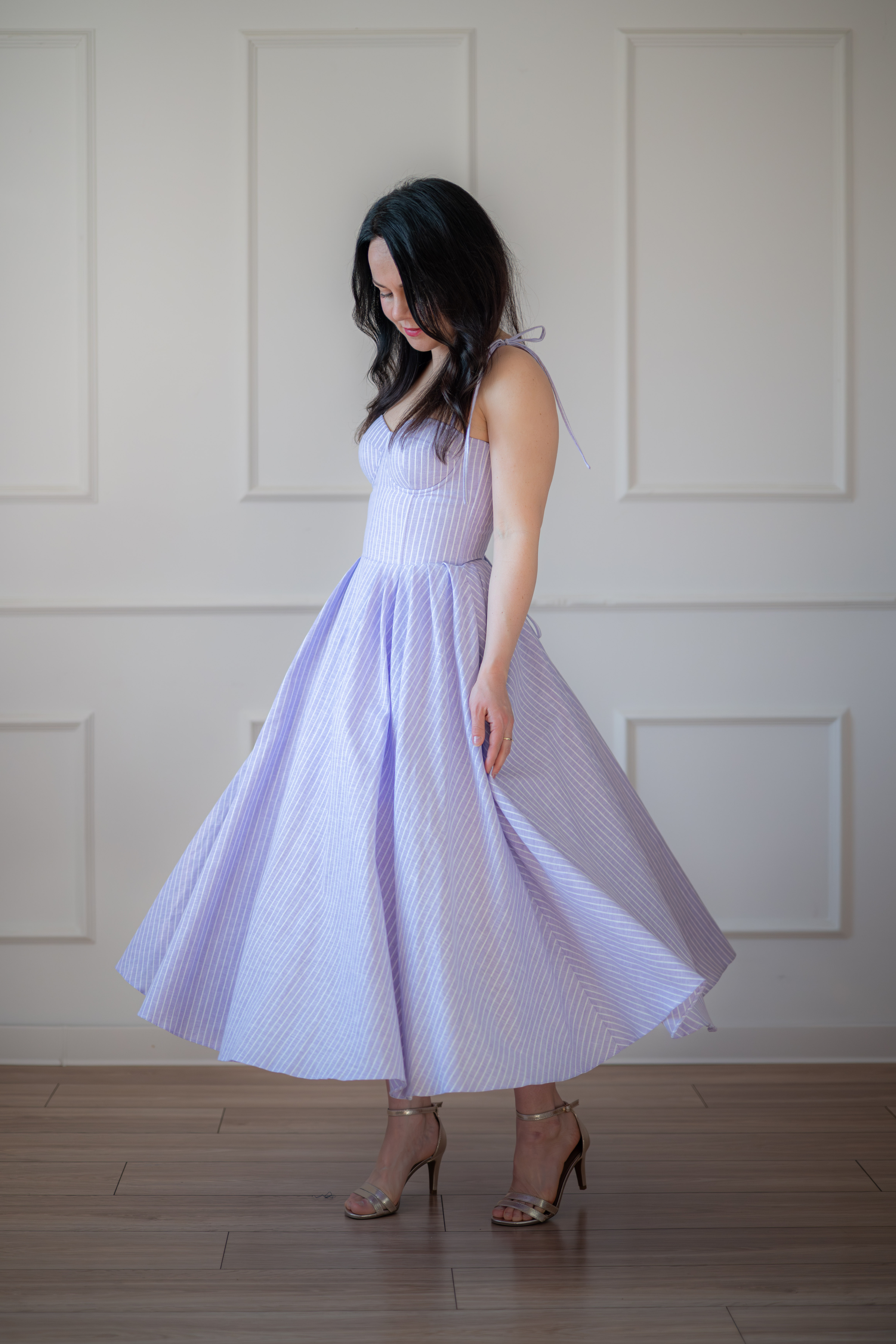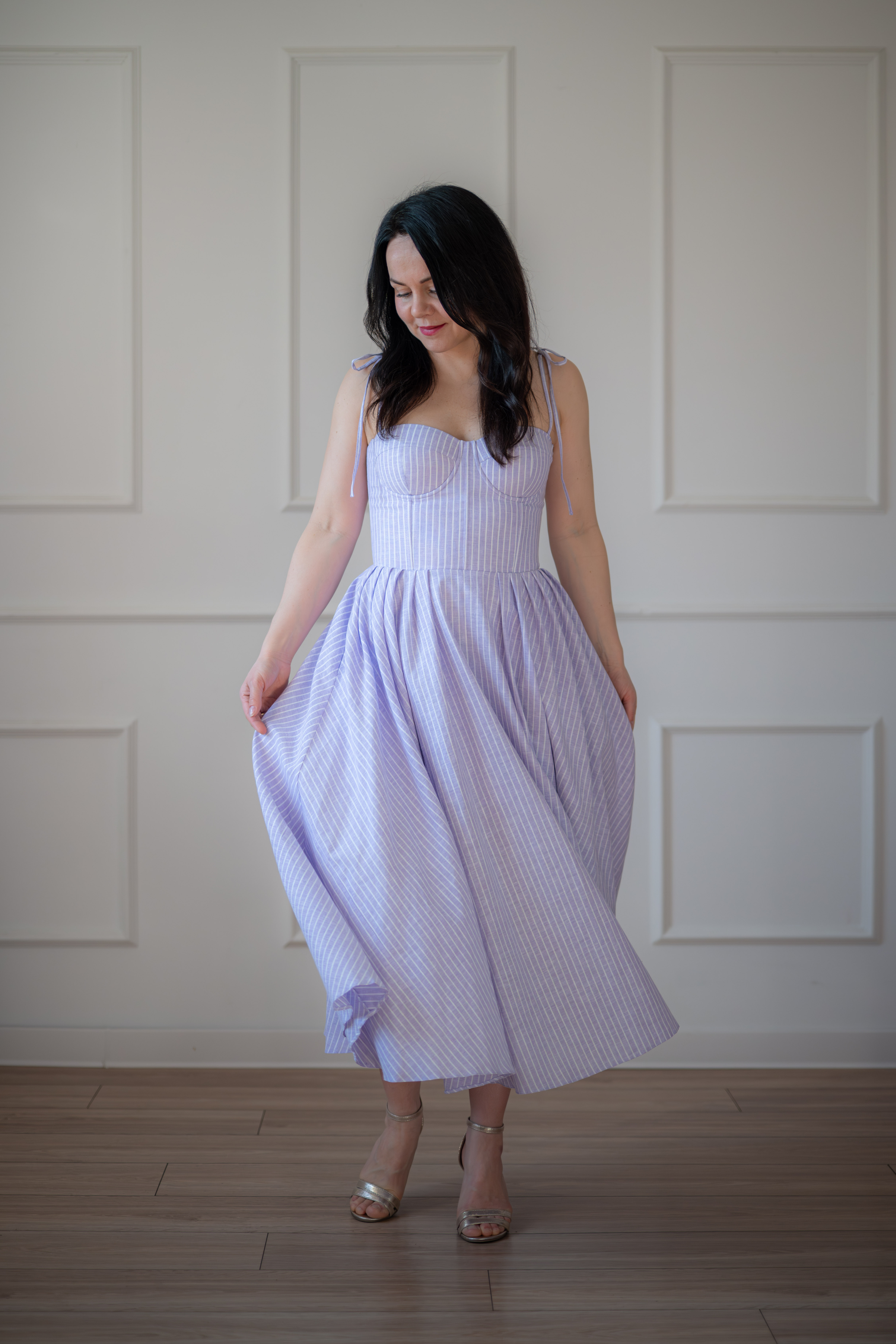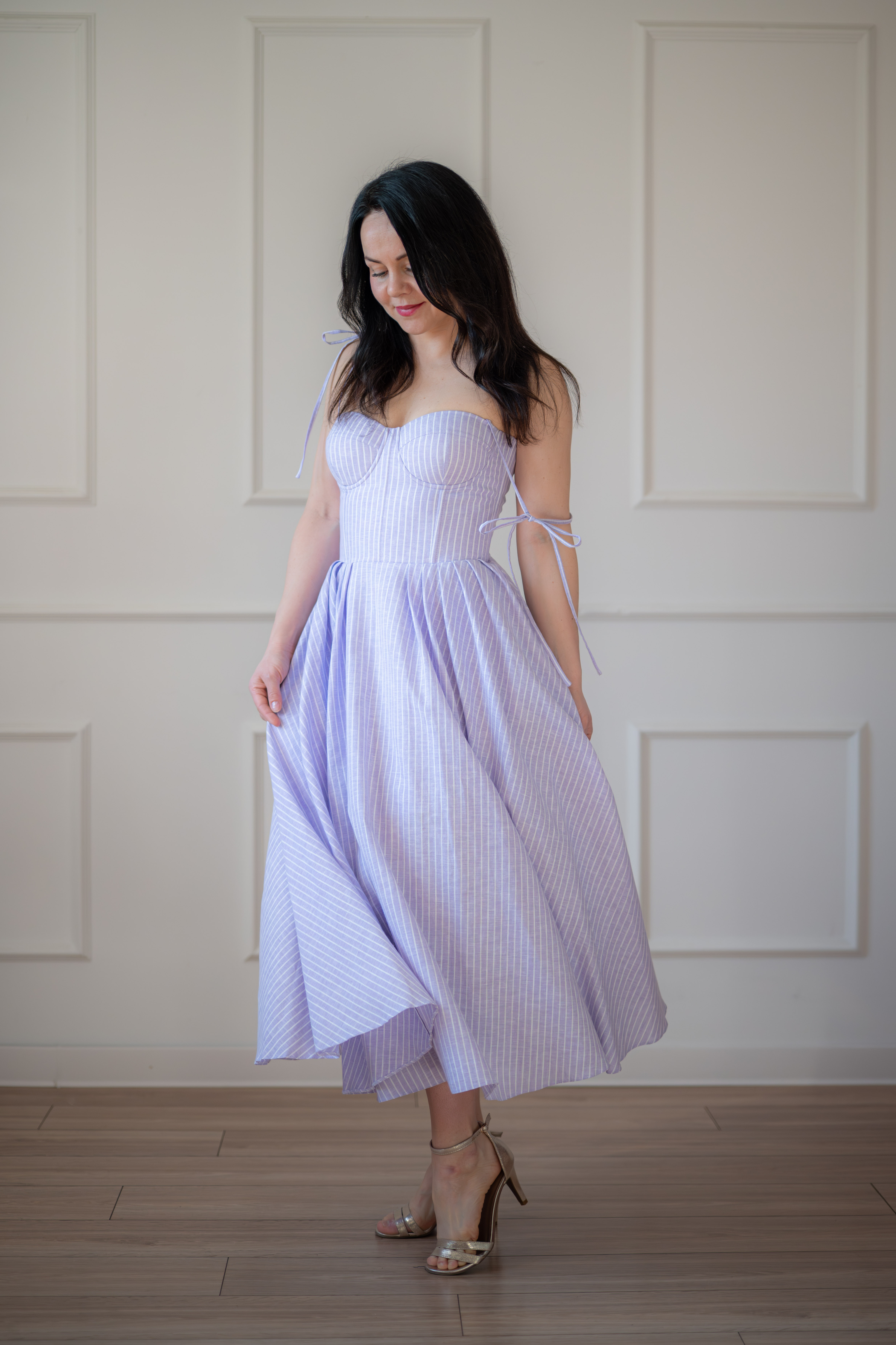 Sukienka gorsetowa z usztywnianymi miseczkami, dzięki którym nie ma potrzeby zakładania stanika. Góra została usztywniona fiszbinami, które pięknie modelują talię. Tył sukienki posiada wiązanie pozwalające na regulację oraz indywidualne dopasowanie, natomiast spódnica zapinana jest na zamek kryty. Sukienka Madlen posiada wiązane ramiączka oraz kieszenie w szwach bocznych. Dodatkowo w zestawie dołączona jest wkładka pod wiązanie z tyłu aby zamaskować plecy.