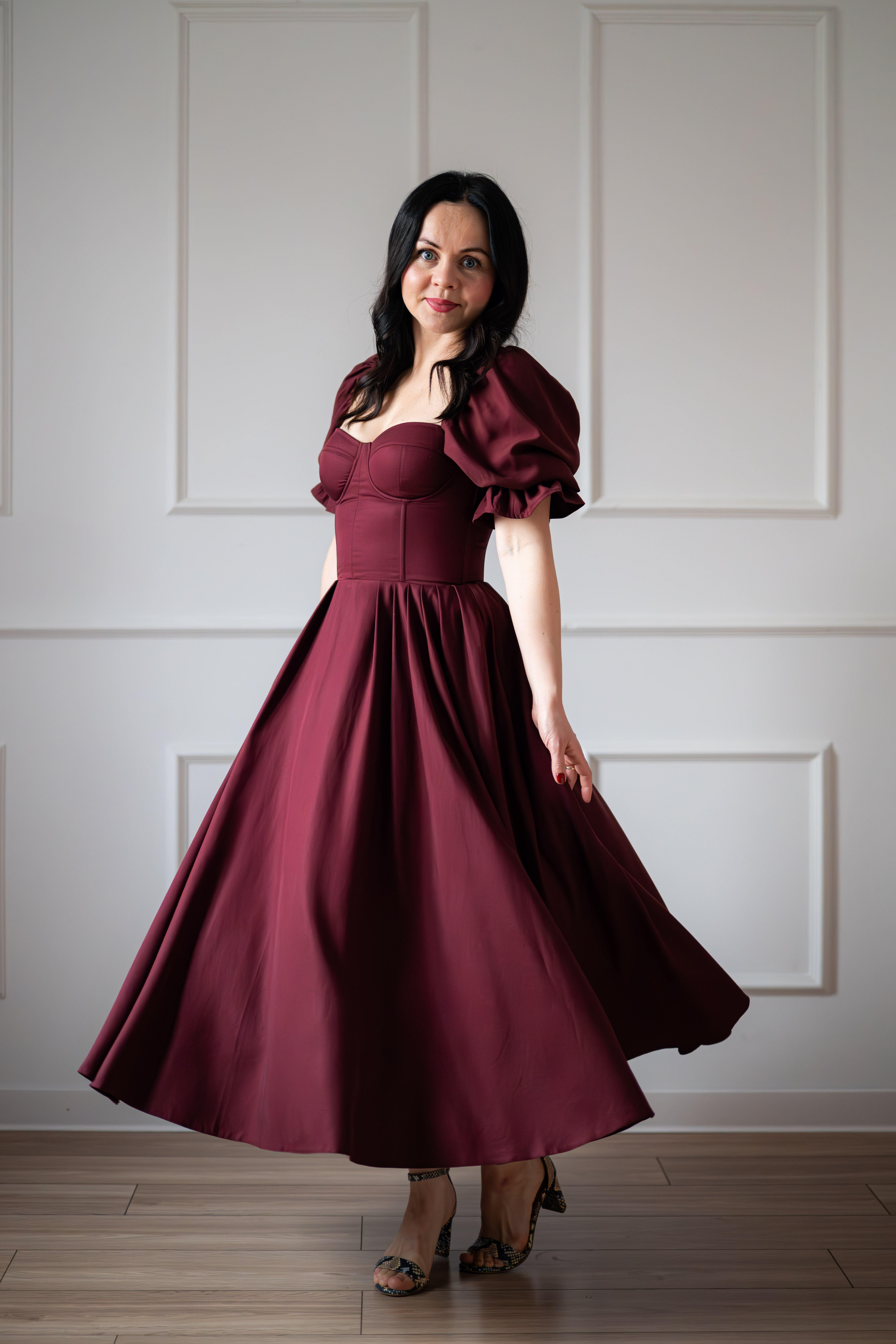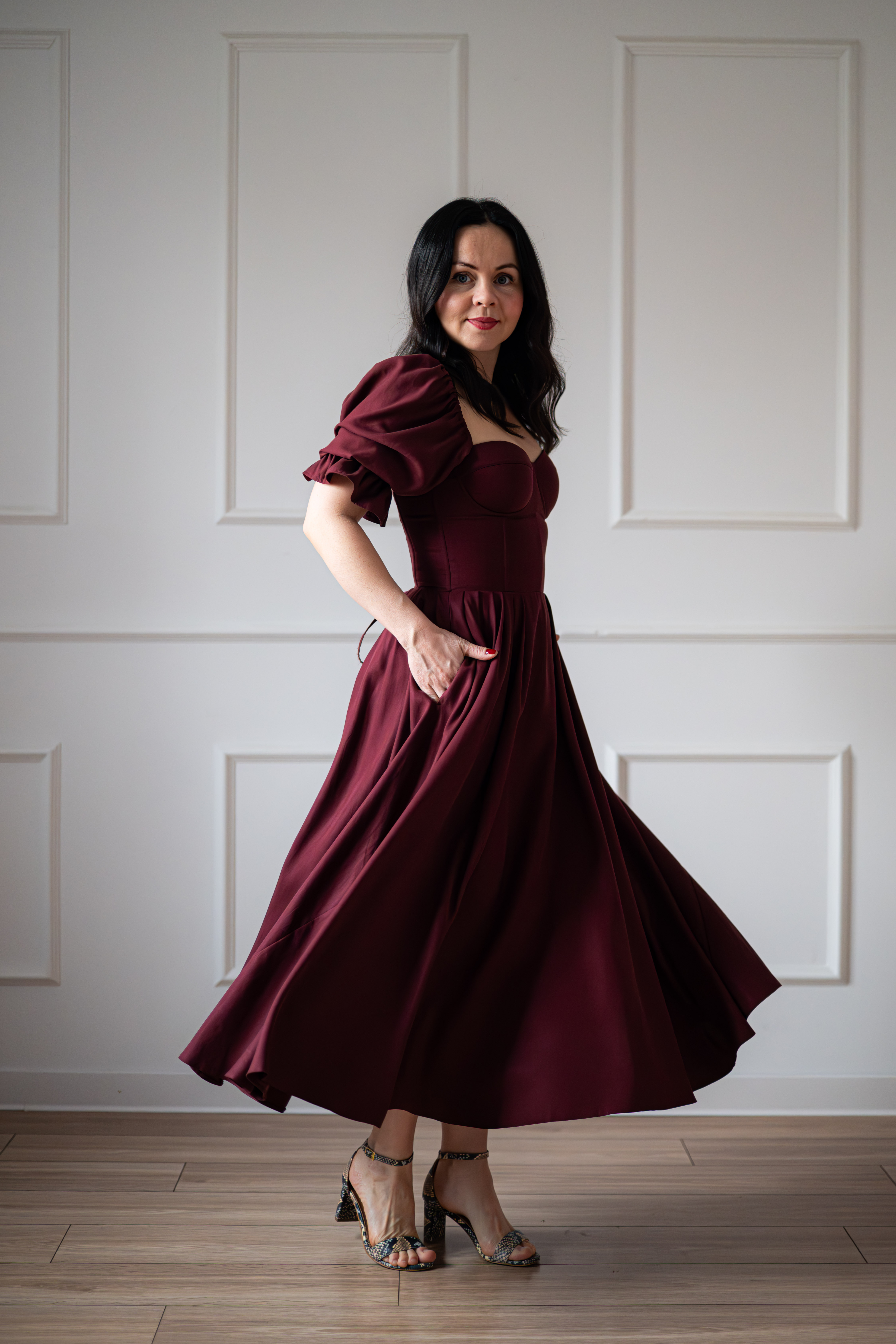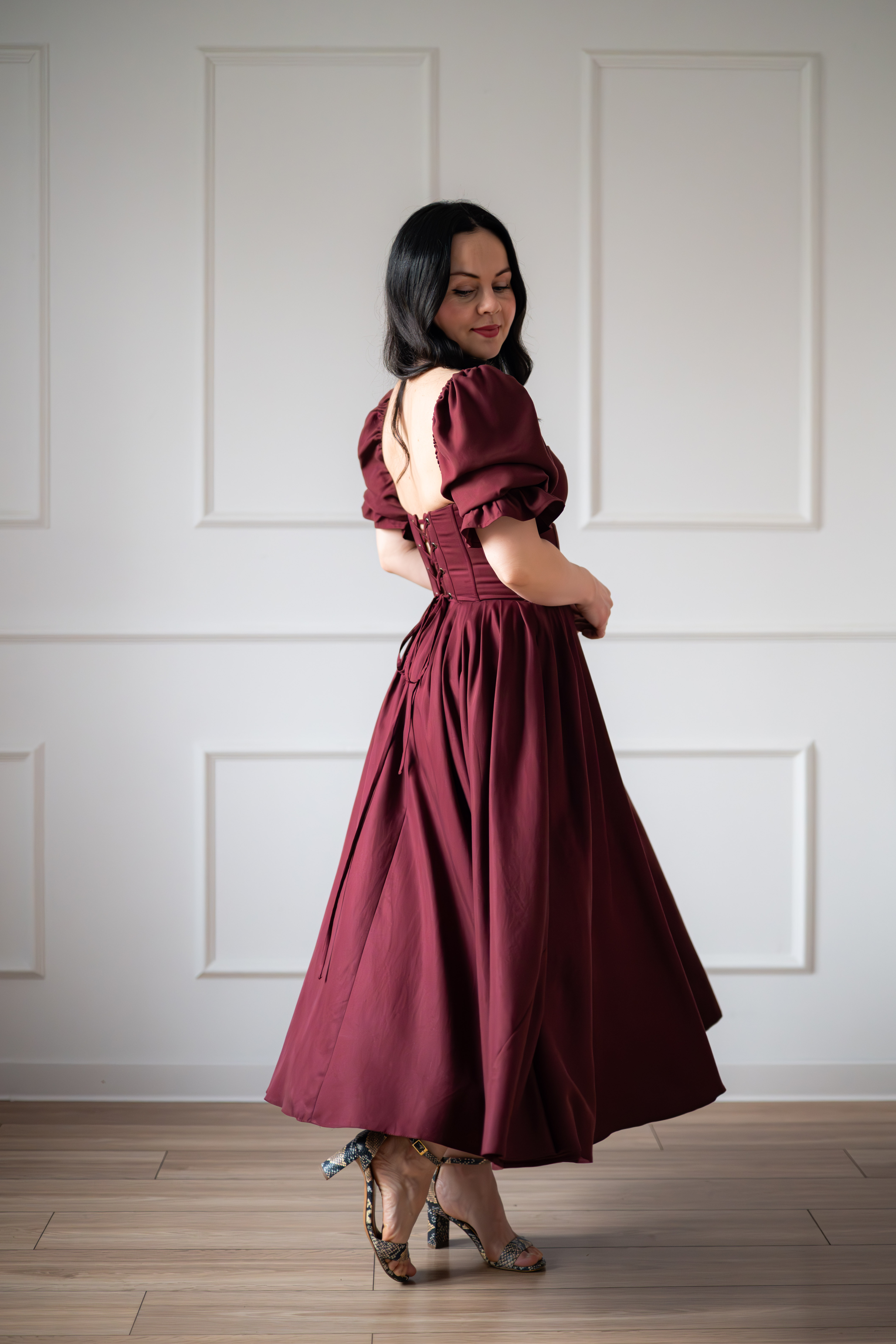 Sukienka gorsetowa z usztywnianymi miseczkami, dzięki którym nie ma potrzeby zakładania stanika. Góra została usztywniona fiszbinami, które pięknie modelują talię. Tył sukienki posiada wiązanie pozwalające na regulację oraz indywidualne dopasowanie, natomiast spódnica zapinana jest na zamek kryty. Sukienka Selena posiada rękawy wykończone u góry gumką dzięki, której nie spadają z ramion oraz kieszenie w szwach bocznych. Dodatkowo w zestawie dołączona jest wkładka pod wiązanie z tyłu aby zamaskować plecy.