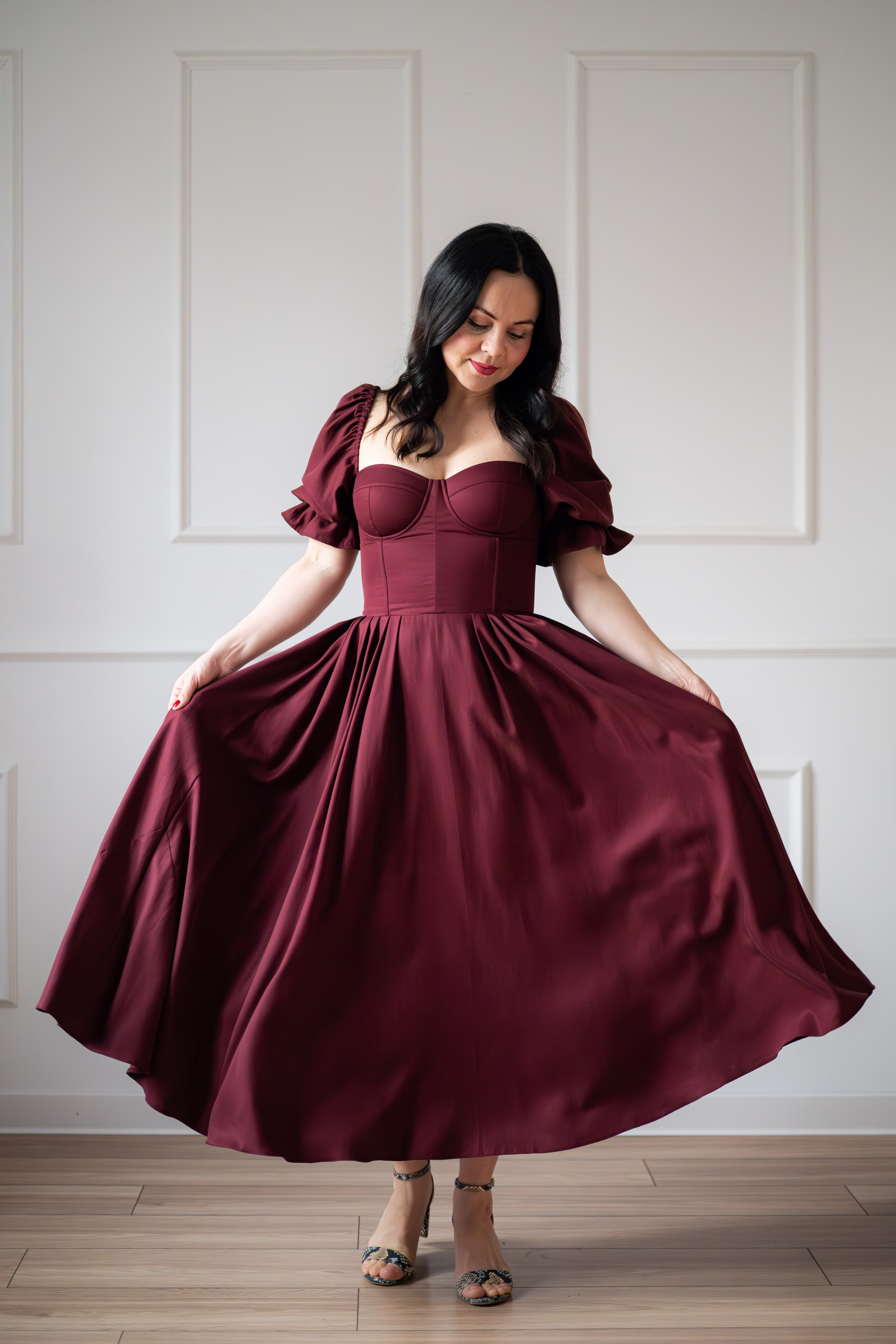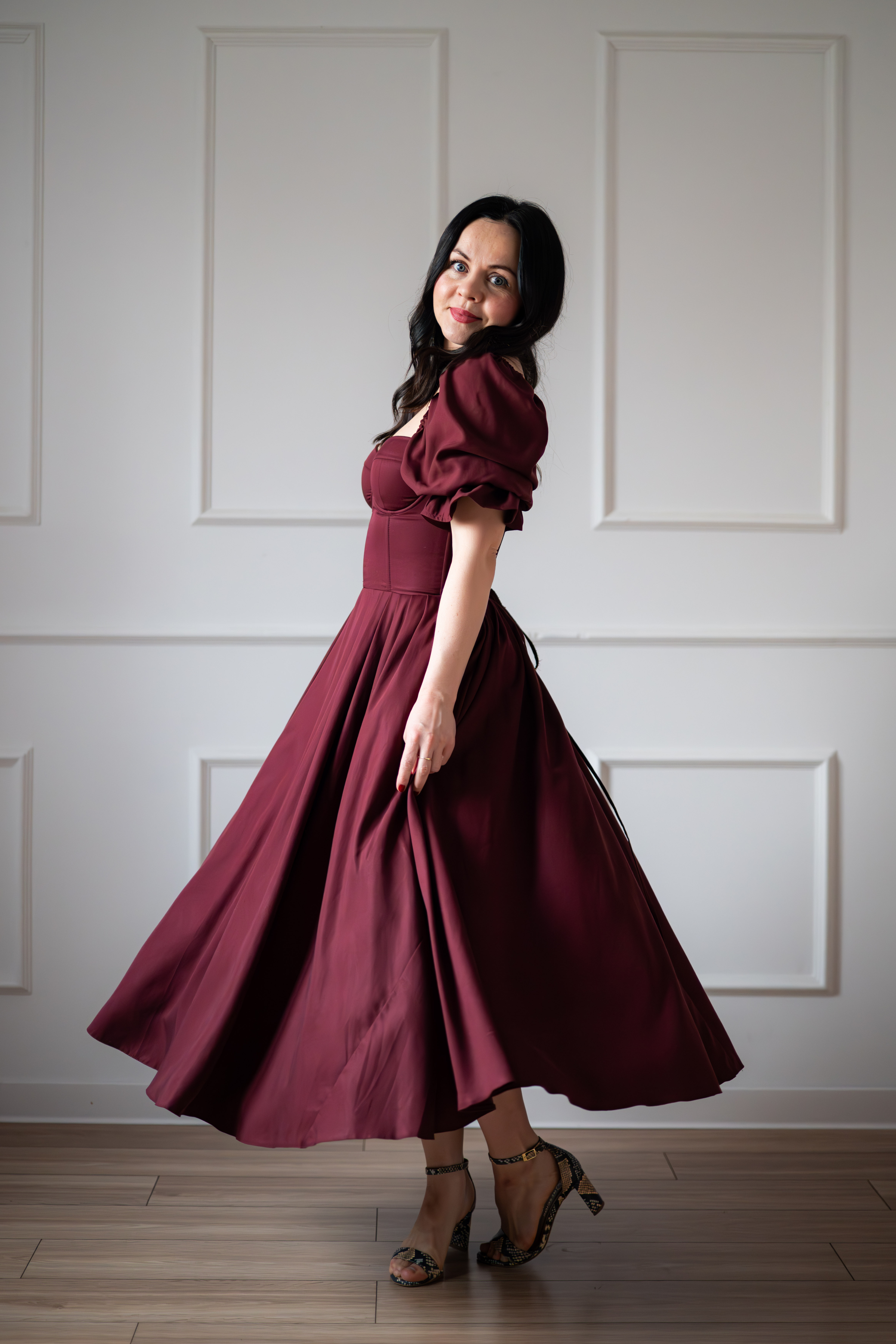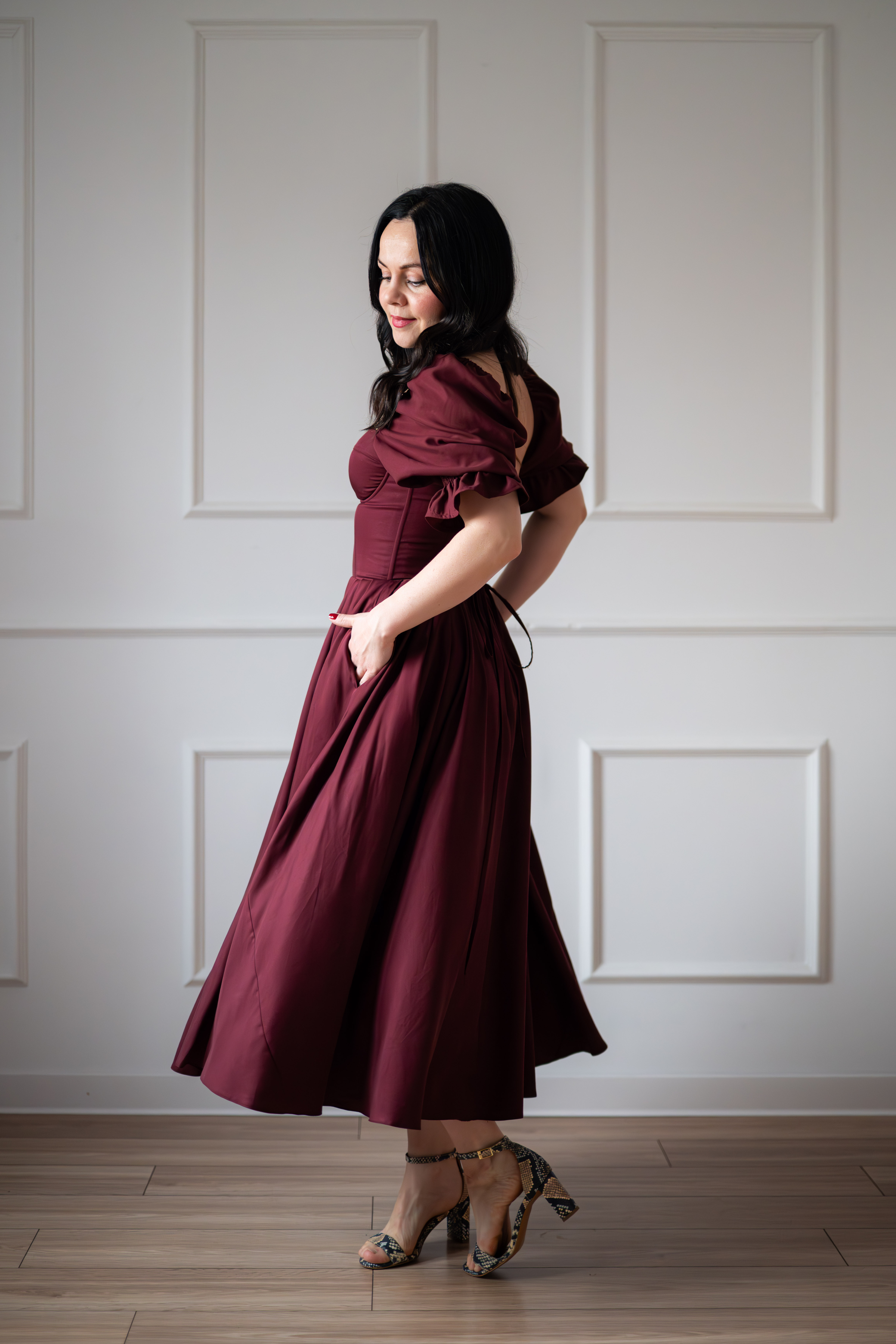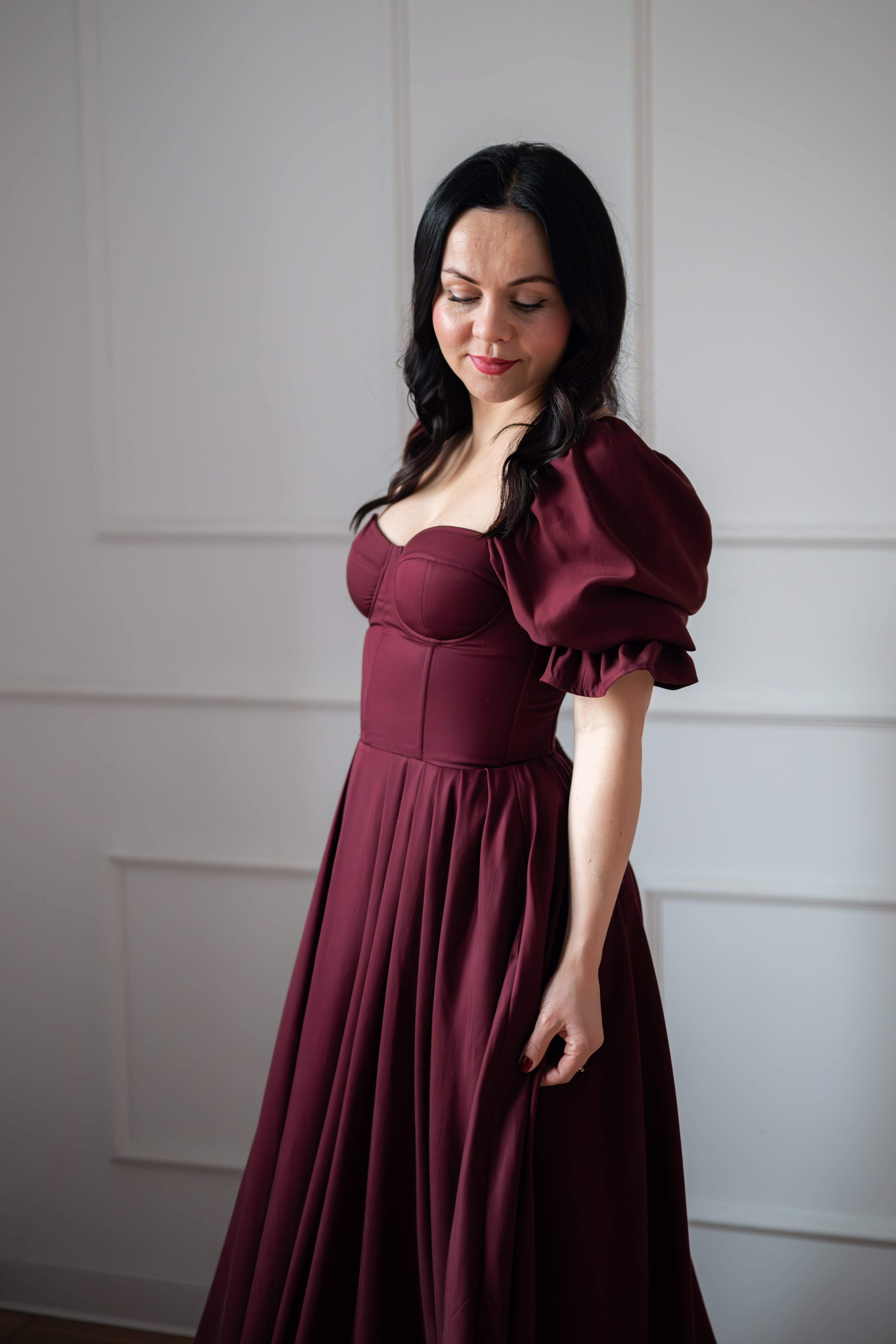 Sukienka gorsetowa z usztywnianymi miseczkami, dzięki którym nie ma potrzeby zakładania stanika. Góra została usztywniona fiszbinami, które pięknie modelują talię. Tył sukienki posiada wiązanie pozwalające na regulację oraz indywidualne dopasowanie, natomiast spódnica zapinana jest na zamek kryty. Sukienka Selena posiada rękawy wykończone u góry gumką dzięki, której nie spadają z ramion oraz kieszenie w szwach bocznych. Dodatkowo w zestawie dołączona jest wkładka pod wiązanie z tyłu aby zamaskować plecy.