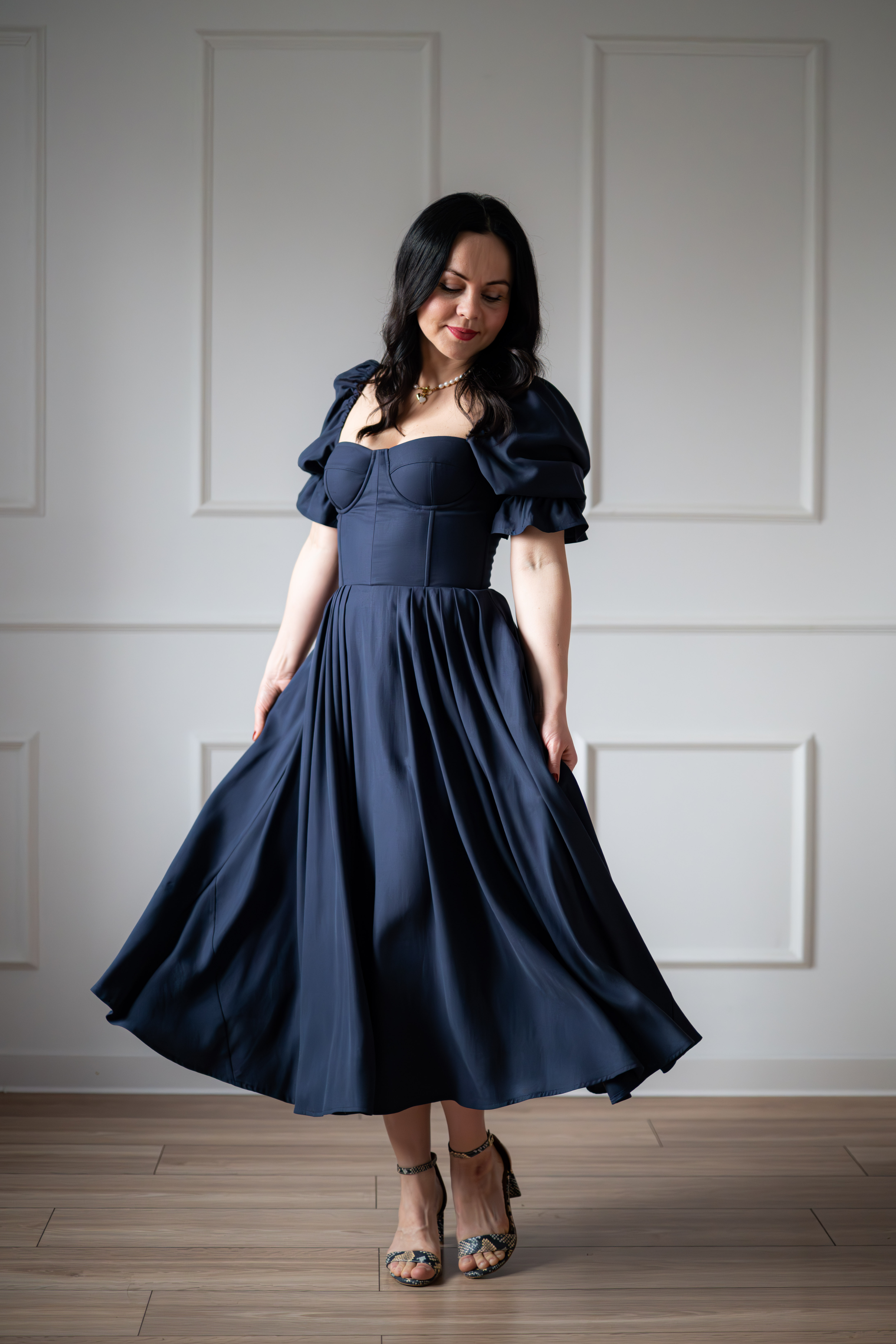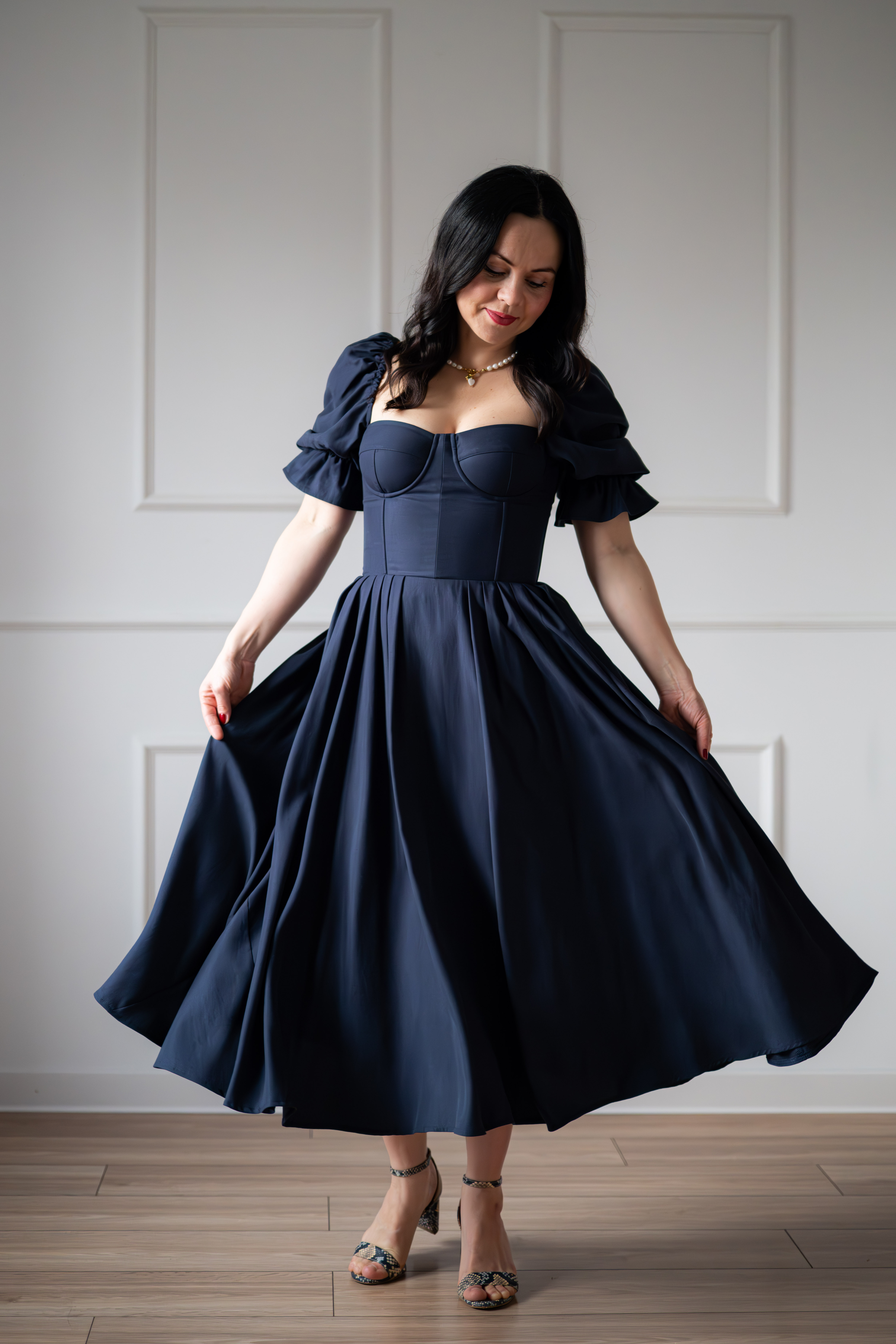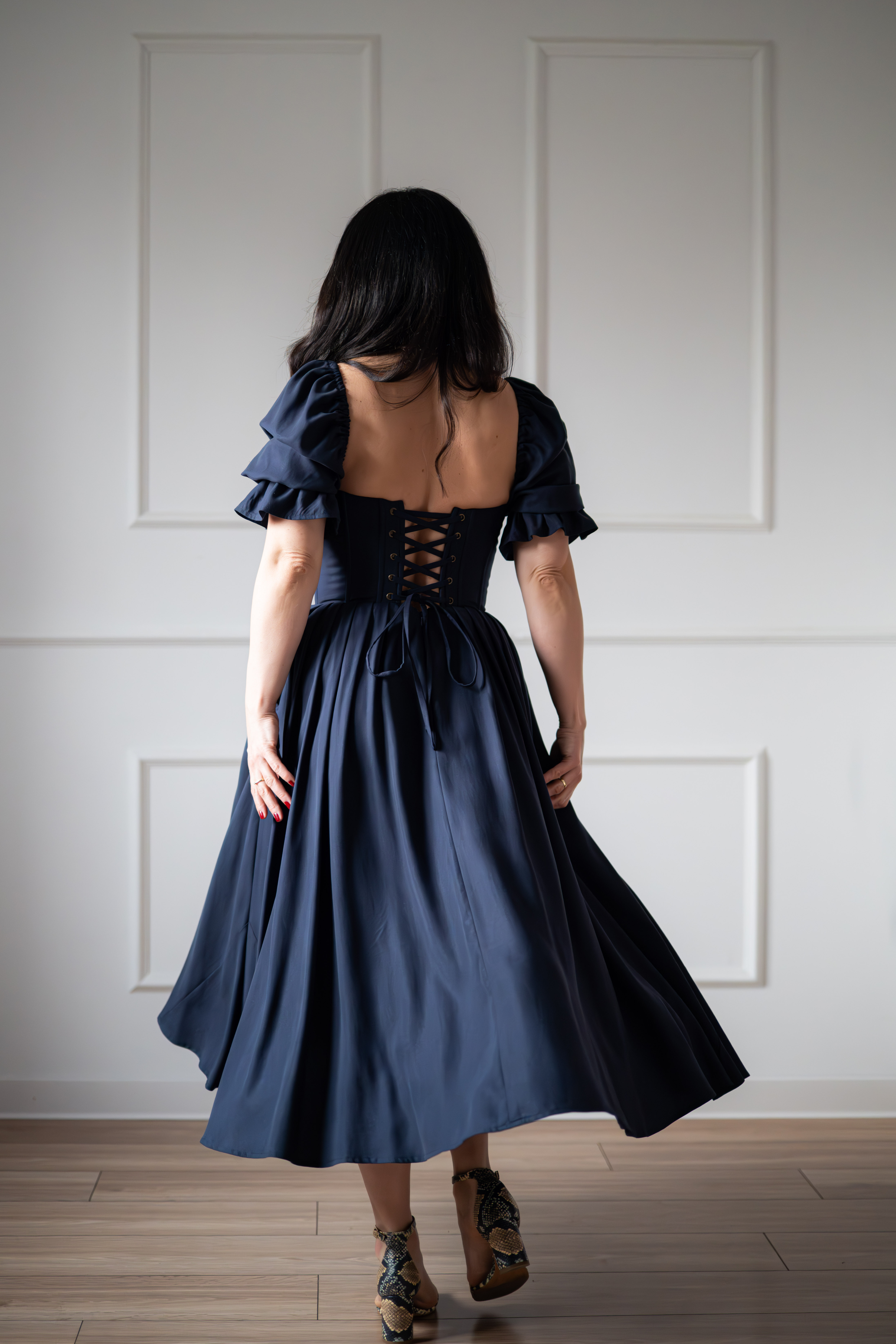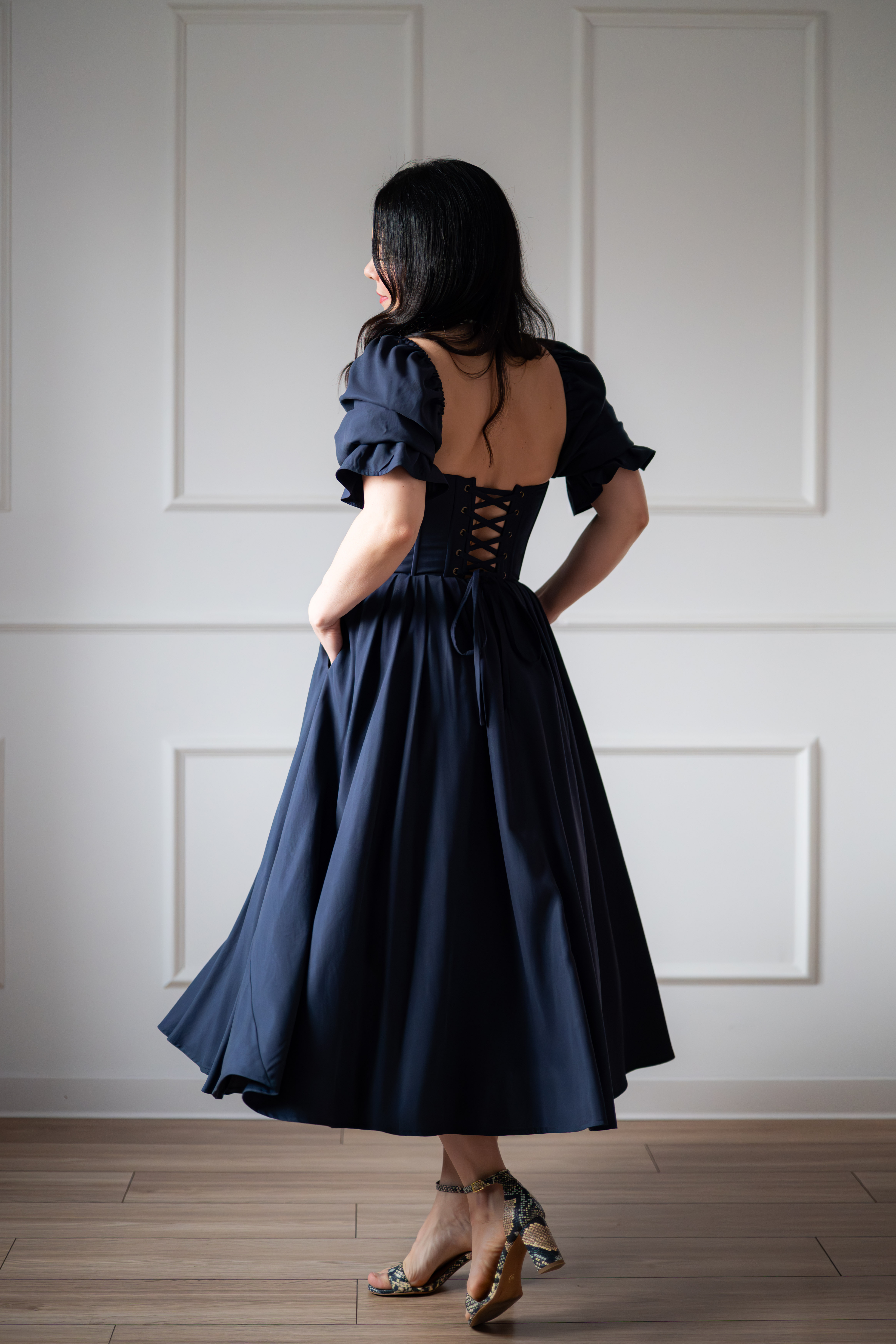 Sukienka gorsetowa z usztywnianymi miseczkami, dzięki którym nie ma potrzeby zakładania stanika. Góra została usztywniona fiszbinami, które pięknie modelują talię. Tył sukienki posiada wiązanie pozwalające na regulację oraz indywidualne dopasowanie, natomiast spódnica zapinana jest na zamek kryty. Sukienka Selena posiada rękawy wykończone u góry gumką dzięki, której nie spadają z ramion oraz kieszenie w szwach bocznych. Dodatkowo w zestawie dołączona jest wkładka pod wiązanie z tyłu aby zamaskować plecy.