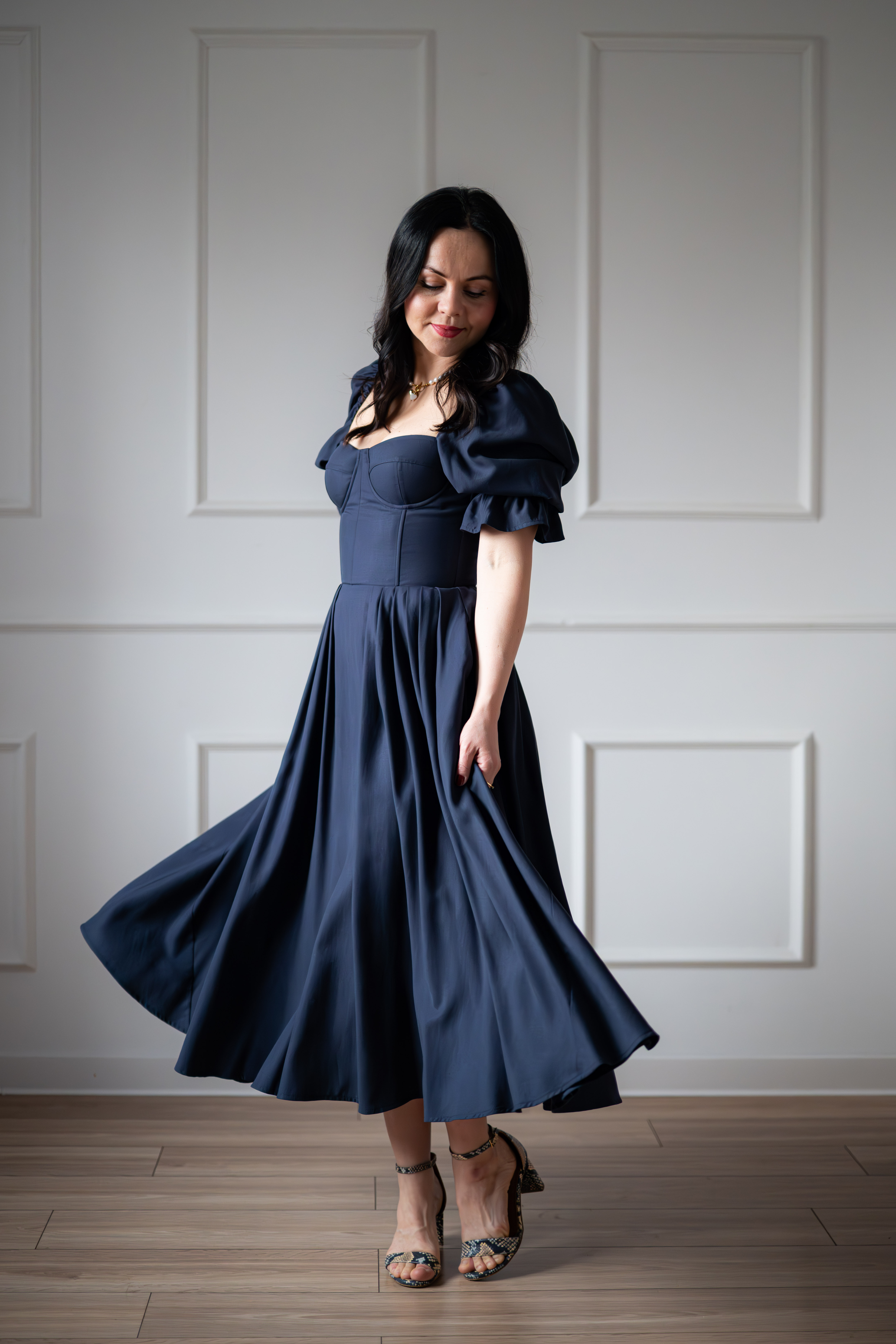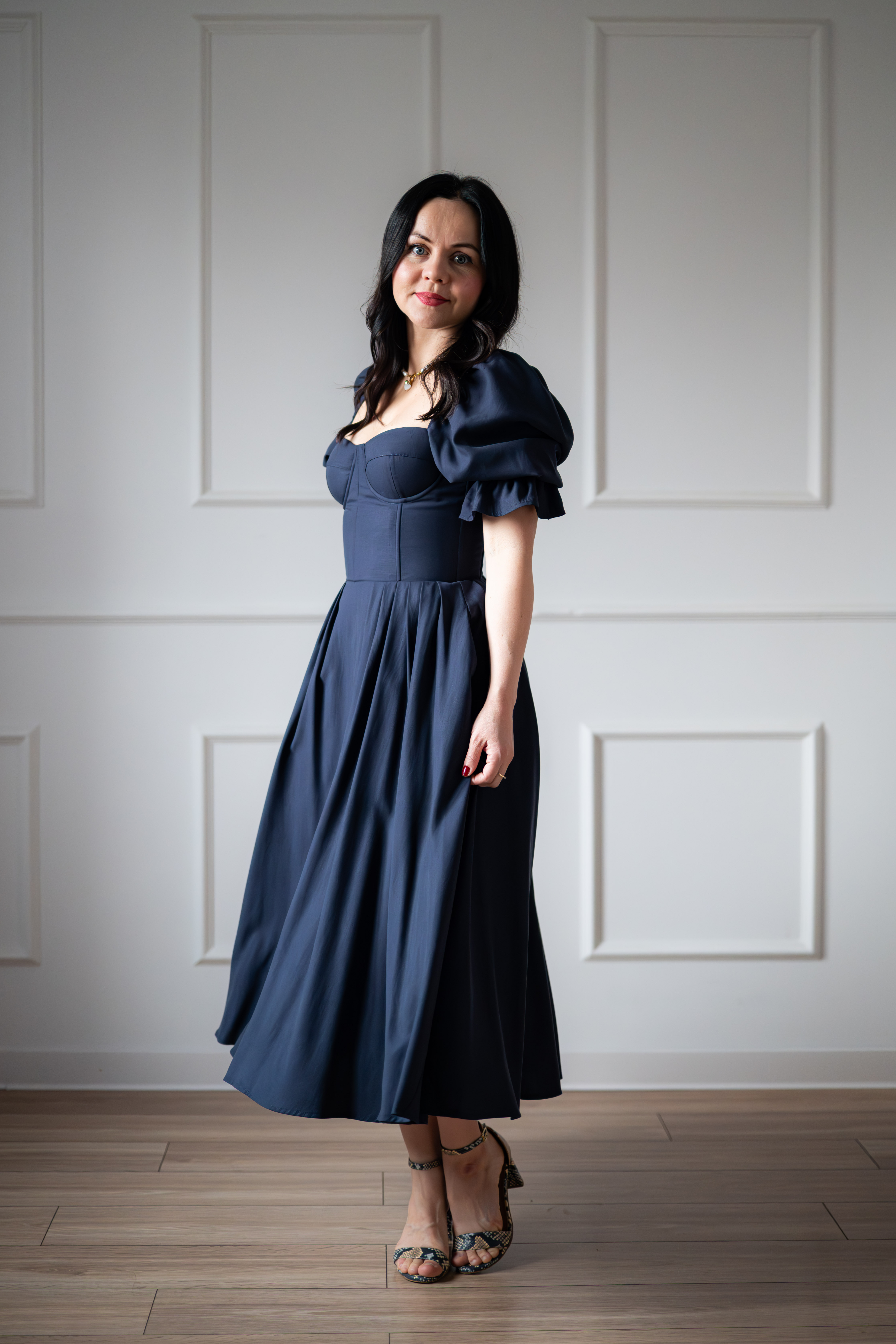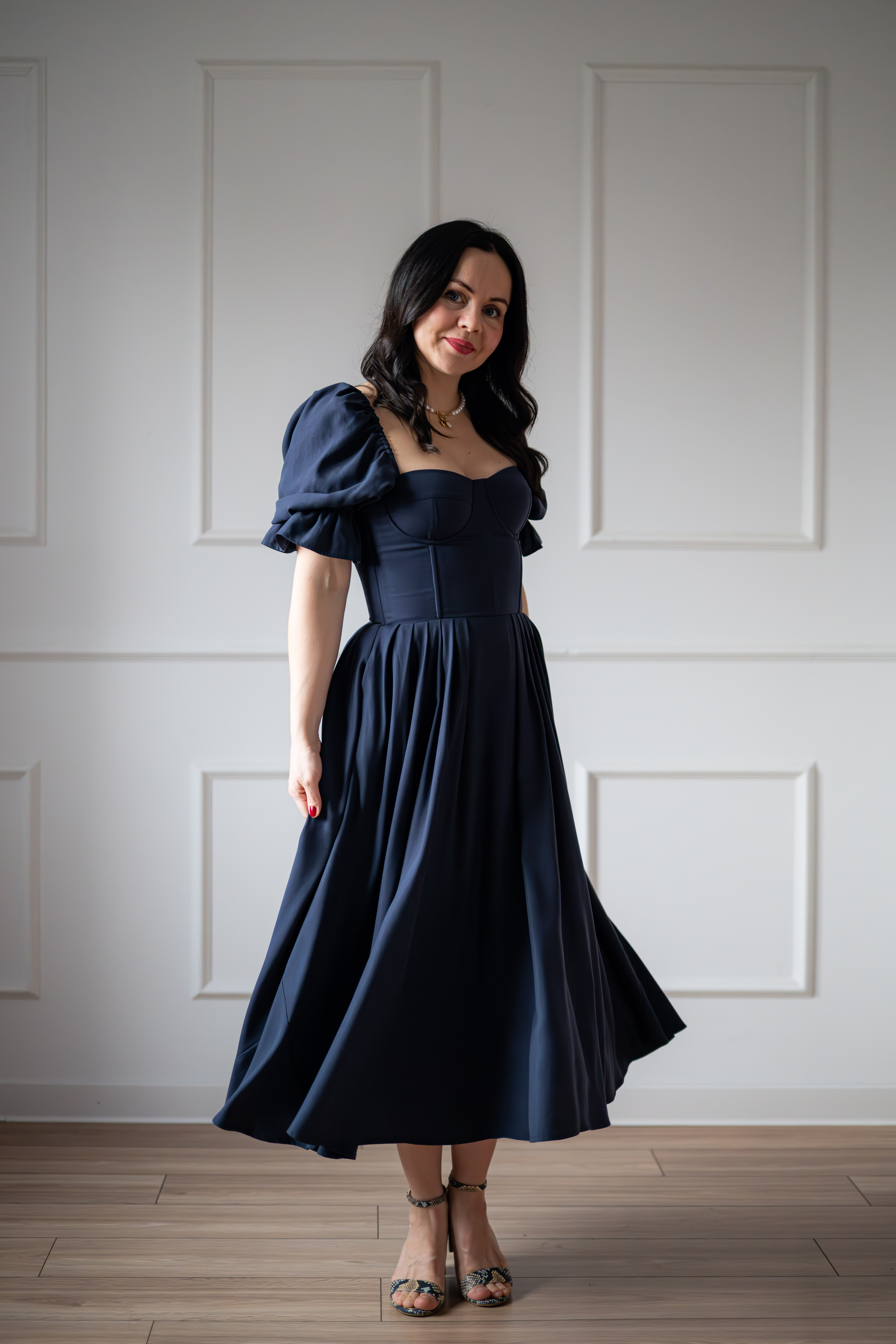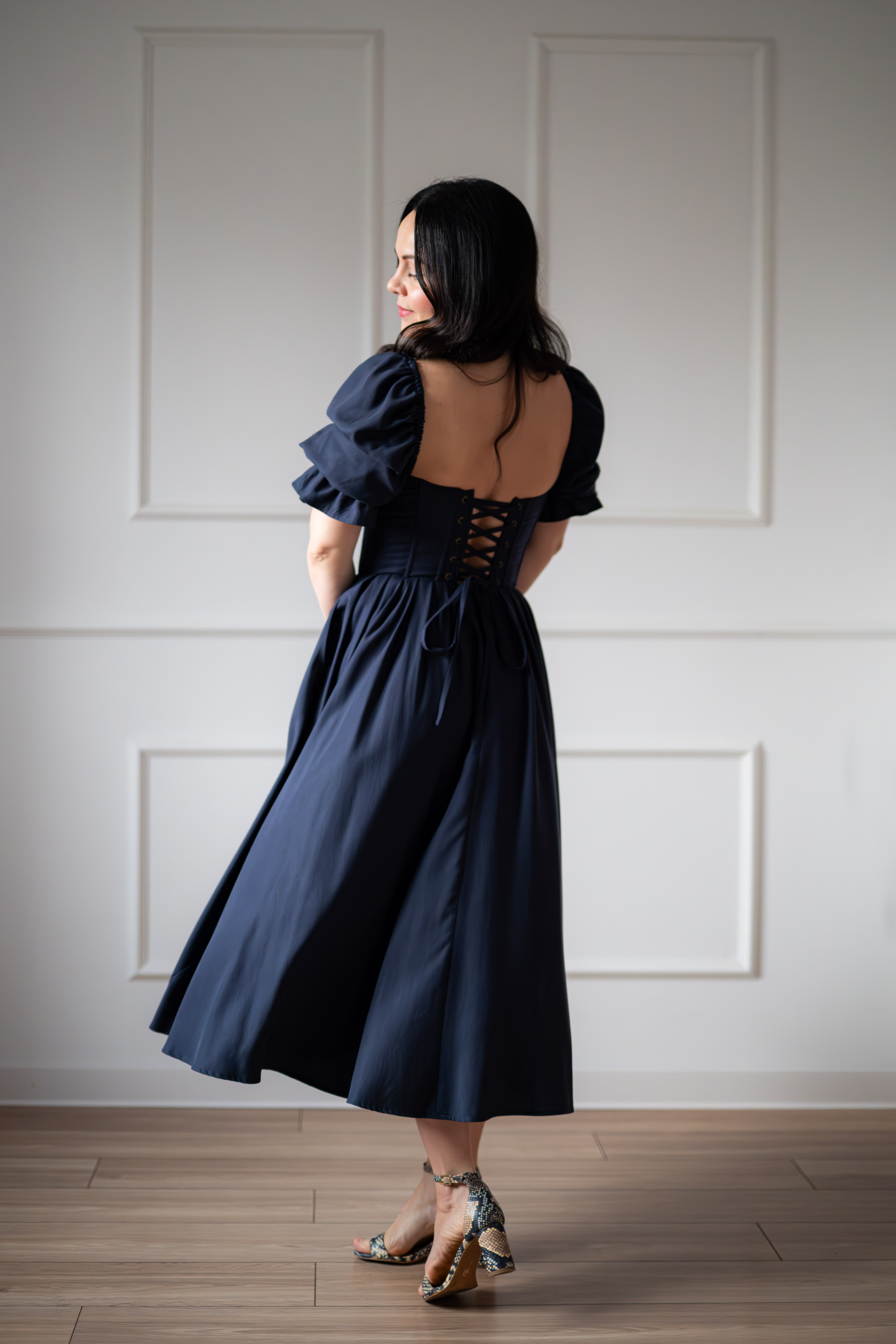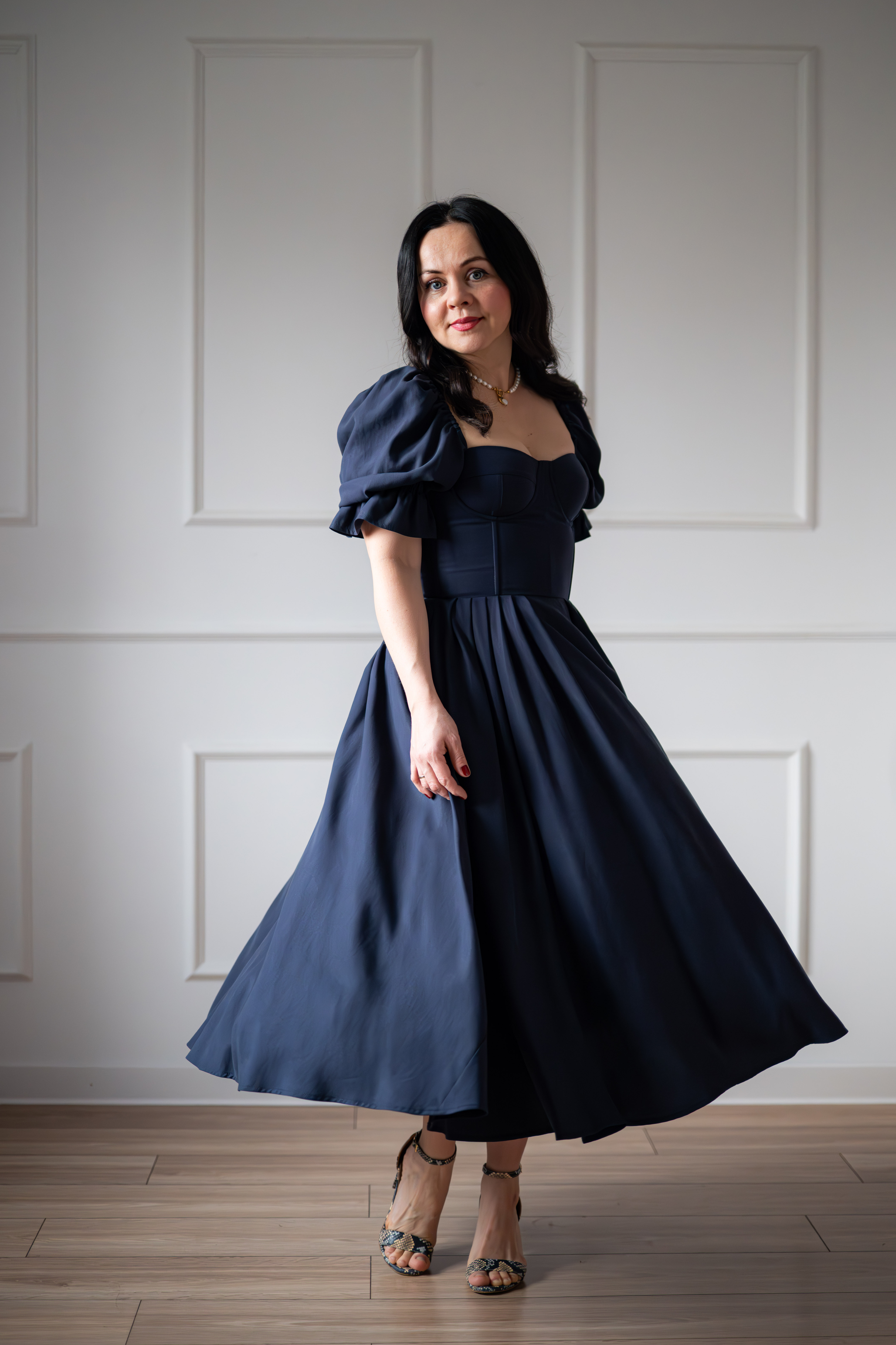 Sukienka gorsetowa z usztywnianymi miseczkami, dzięki którym nie ma potrzeby zakładania stanika. Góra została usztywniona fiszbinami, które pięknie modelują talię. Tył sukienki posiada wiązanie pozwalające na regulację oraz indywidualne dopasowanie, natomiast spódnica zapinana jest na zamek kryty. Sukienka Selena posiada rękawy wykończone u góry gumką dzięki, której nie spadają z ramion oraz kieszenie w szwach bocznych. Dodatkowo w zestawie dołączona jest wkładka pod wiązanie z tyłu aby zamaskować plecy.