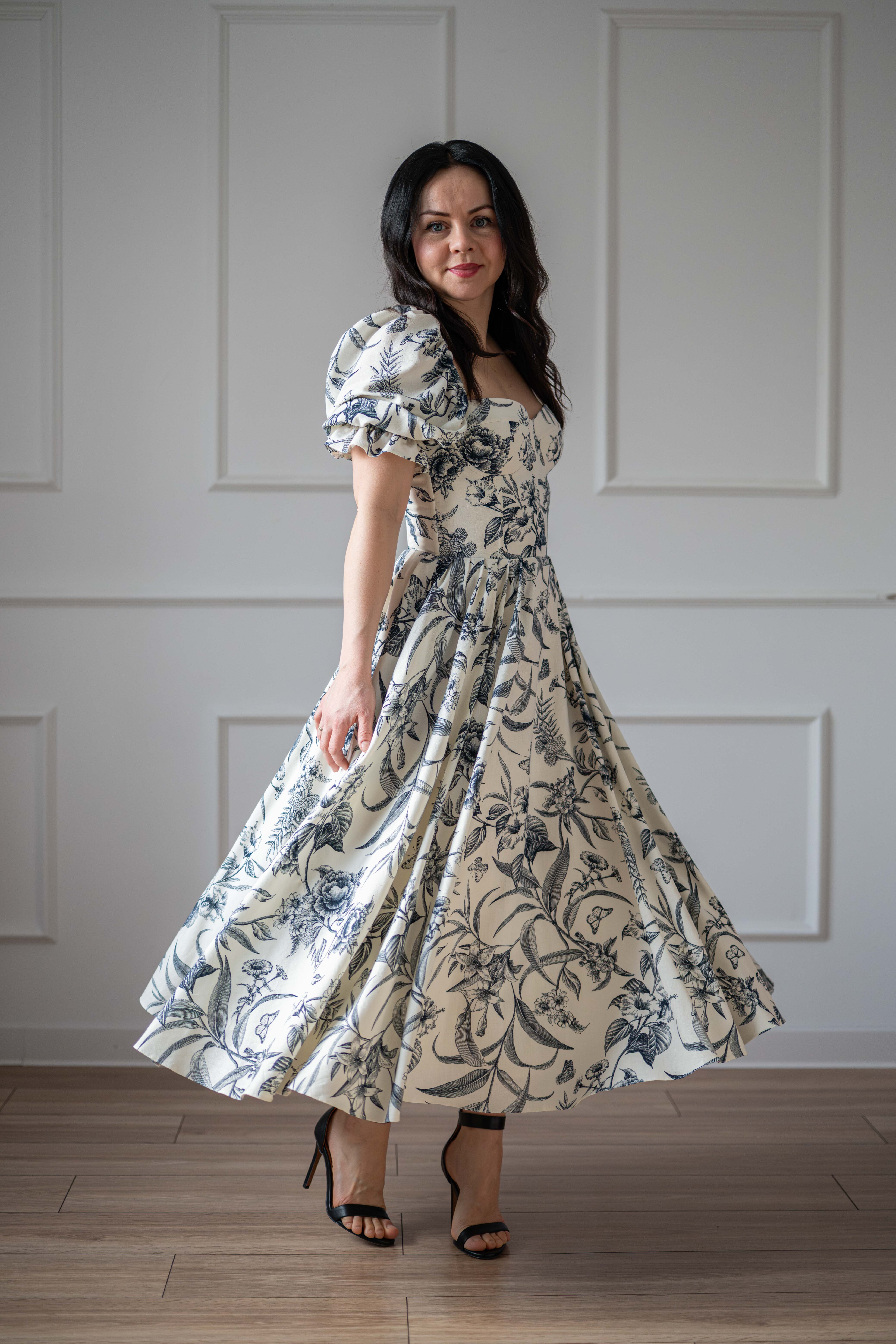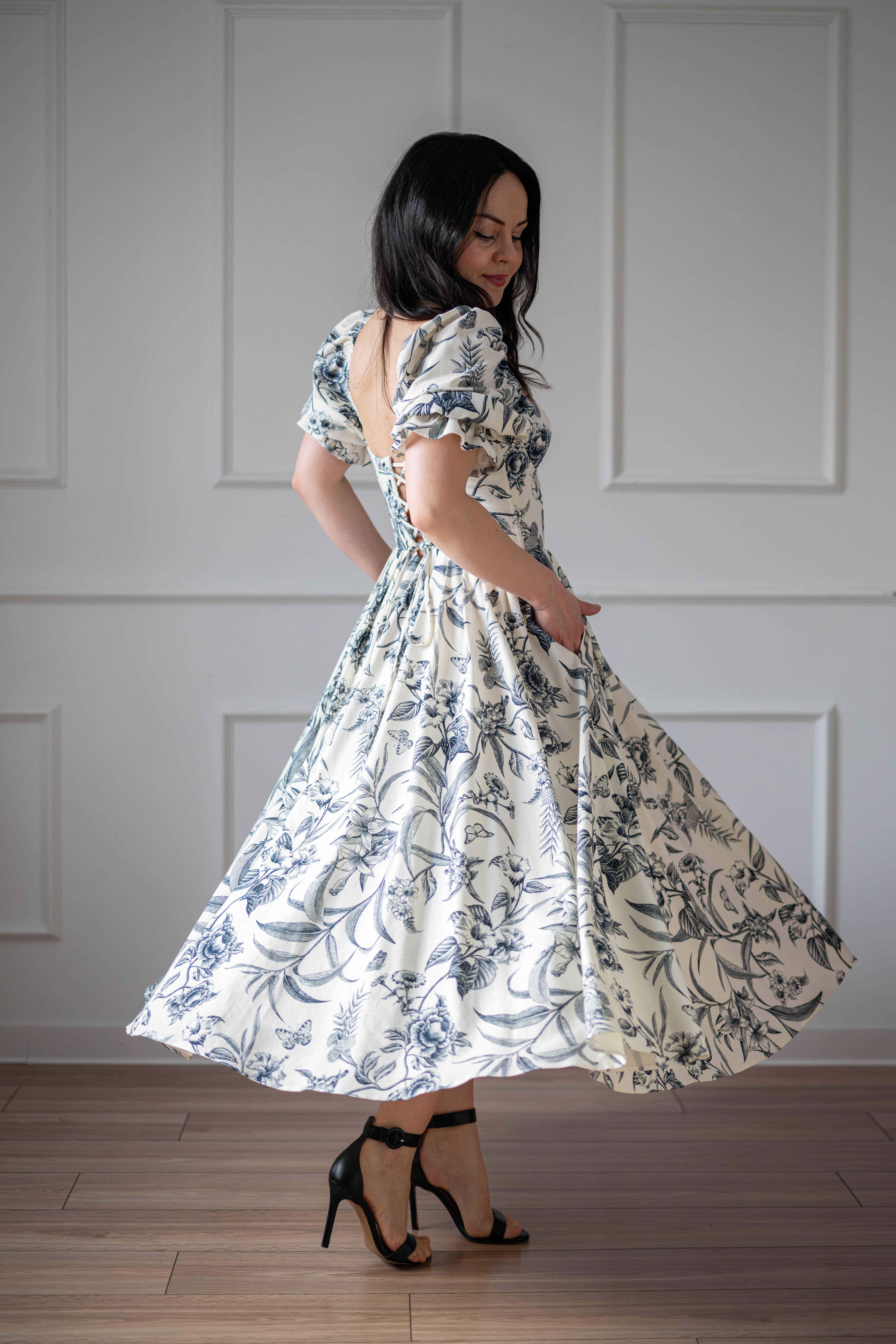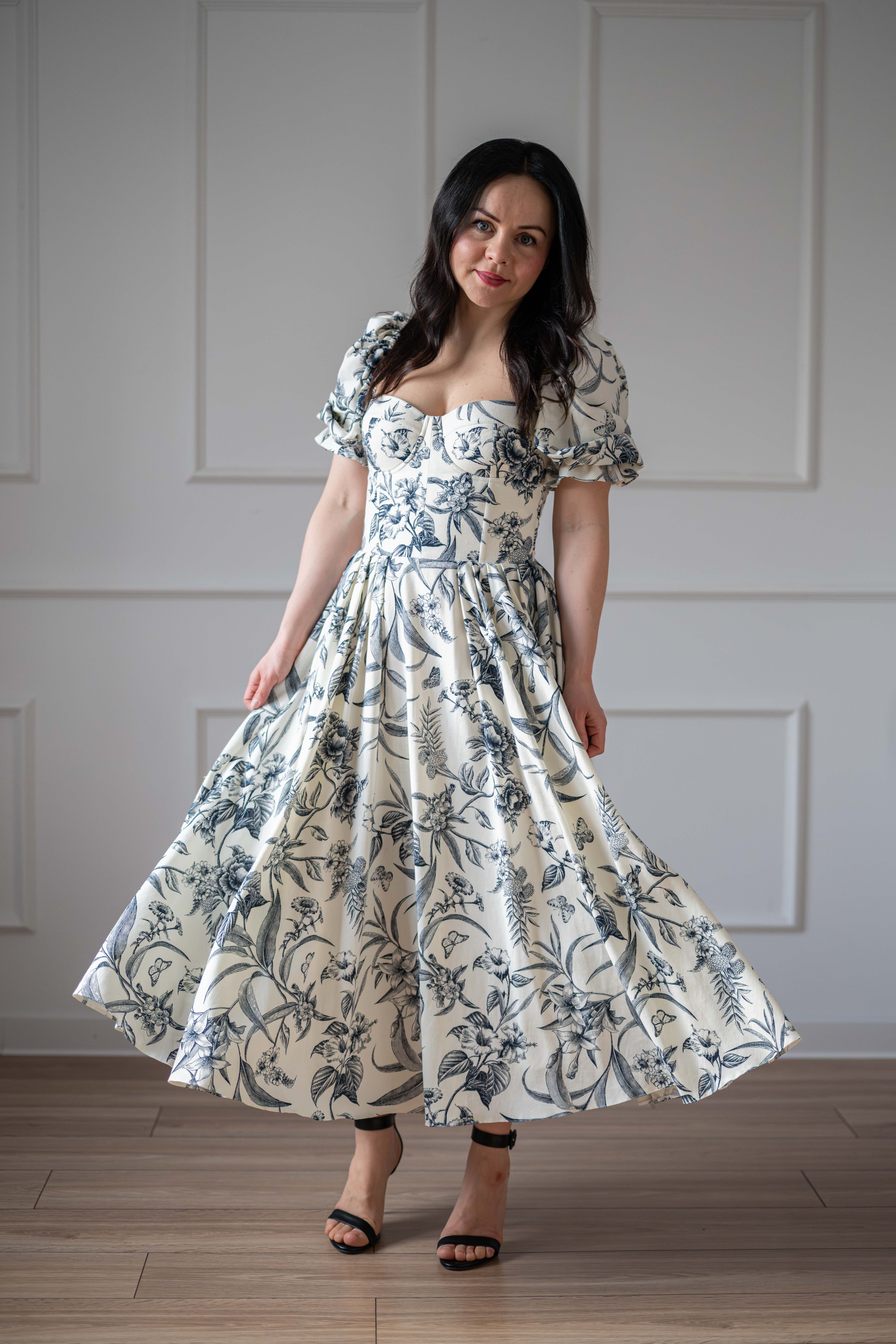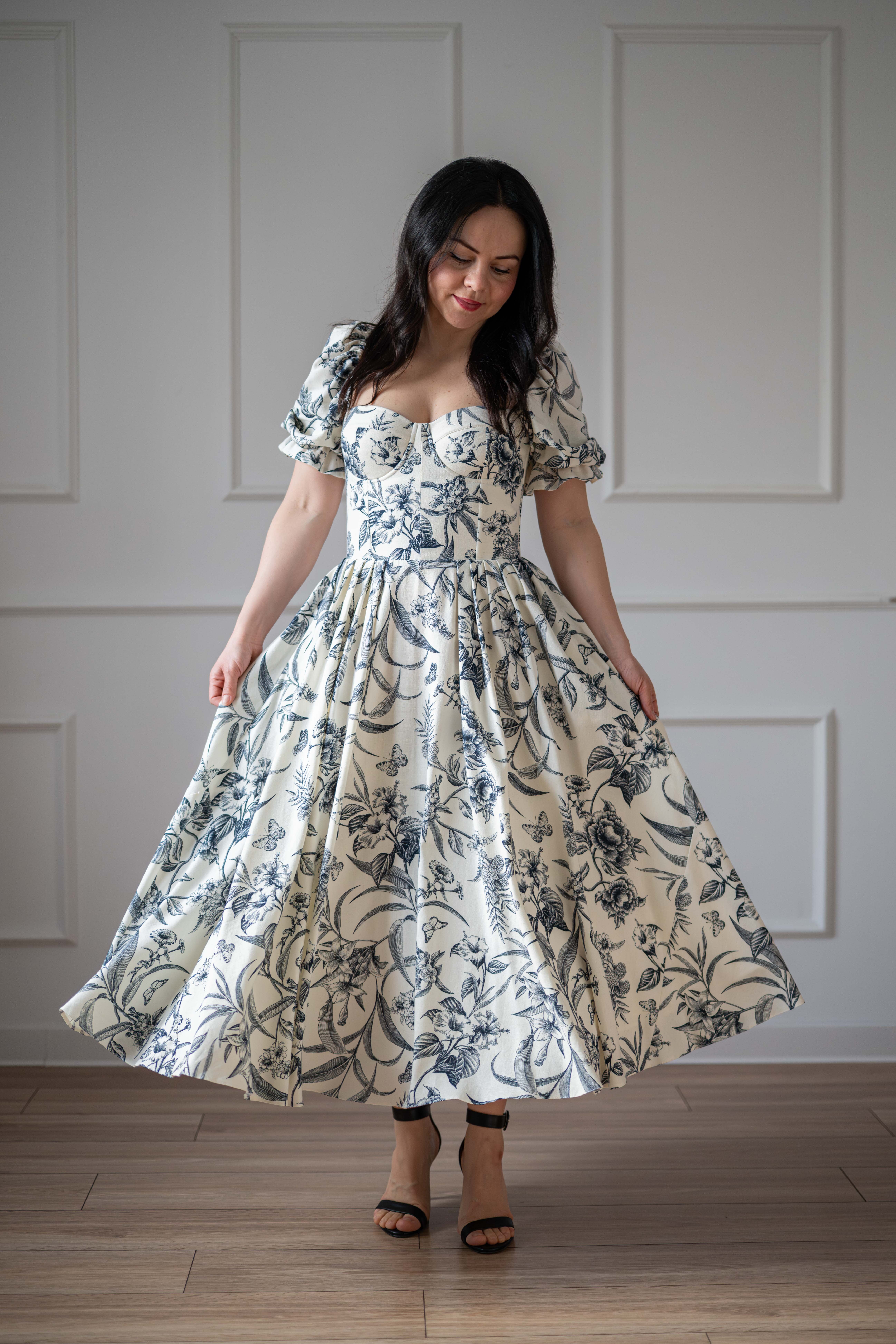 Sukienka gorsetowa z usztywnianymi miseczkami, dzięki którym nie ma potrzeby zakładania stanika. Góra została usztywniona fiszbinami, które pięknie modelują talię. Tył sukienki posiada wiązanie pozwalające na regulację oraz indywidualne dopasowanie, natomiast spódnica zapinana jest na zamek kryty. Sukienka Selena posiada rękawy wykończone u góry gumką dzięki, której nie spadają z ramion oraz kieszenie w szwach bocznych. Dodatkowo w zestawie dołączona jest wkładka pod wiązanie z tyłu aby zamaskować plecy.