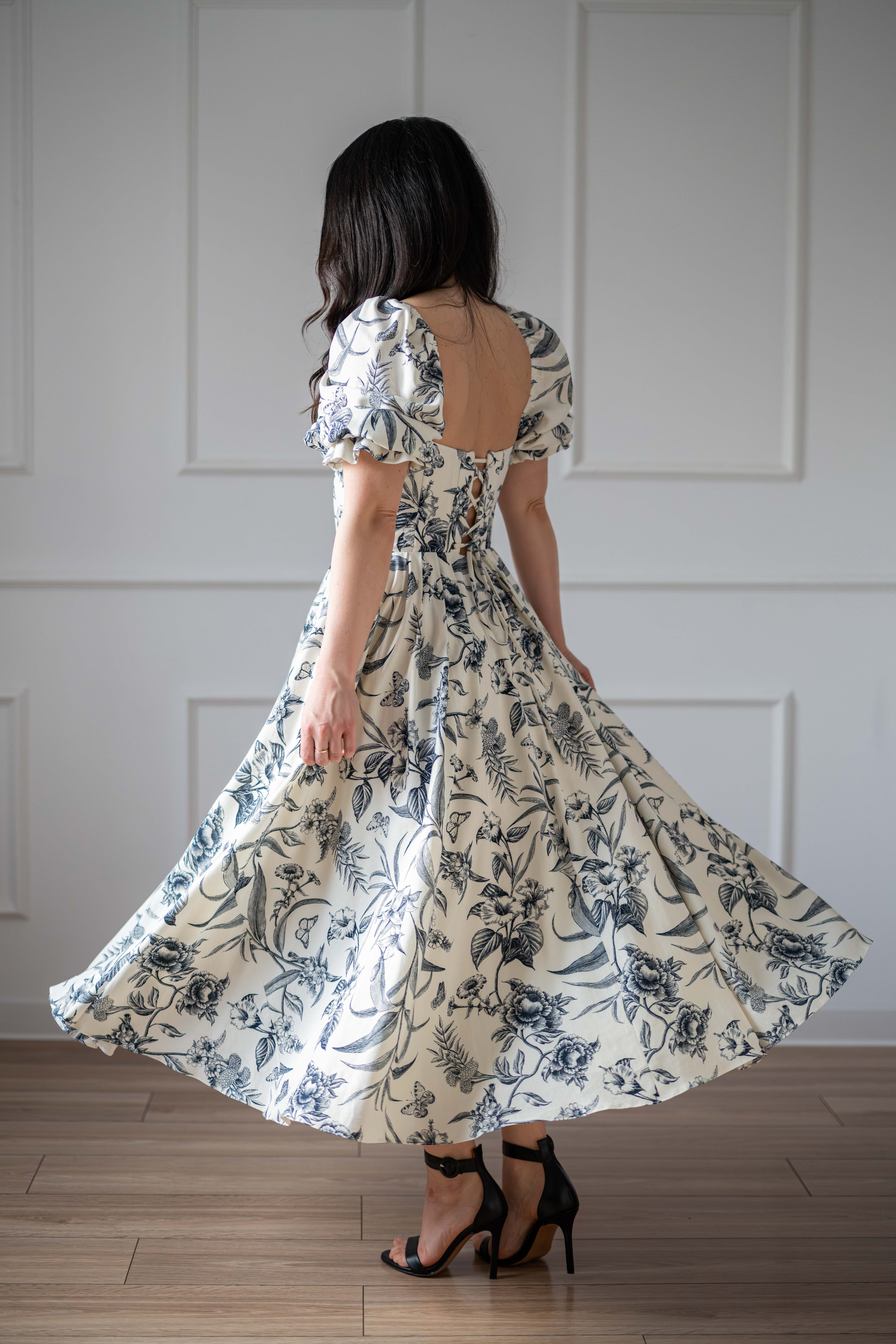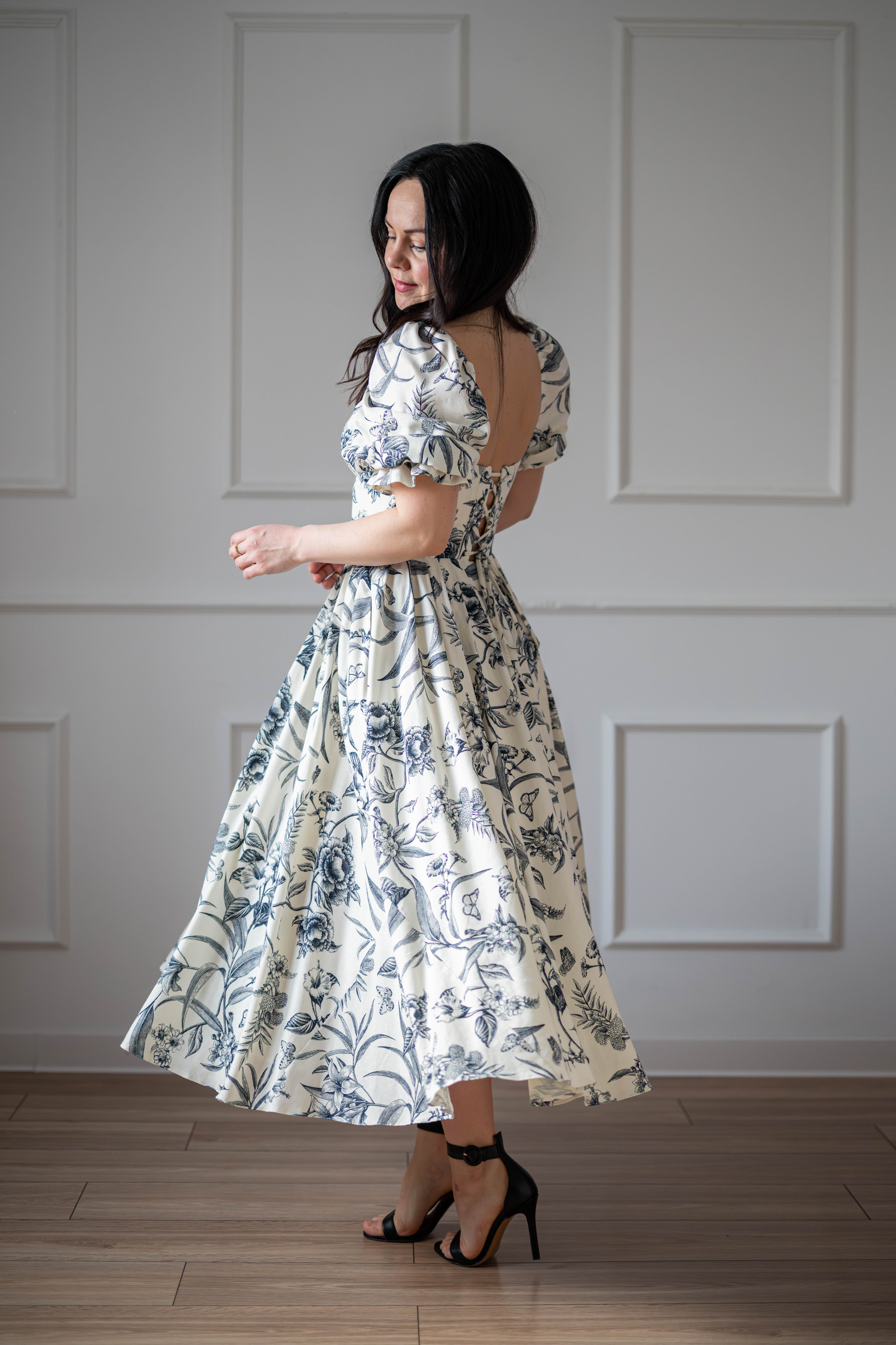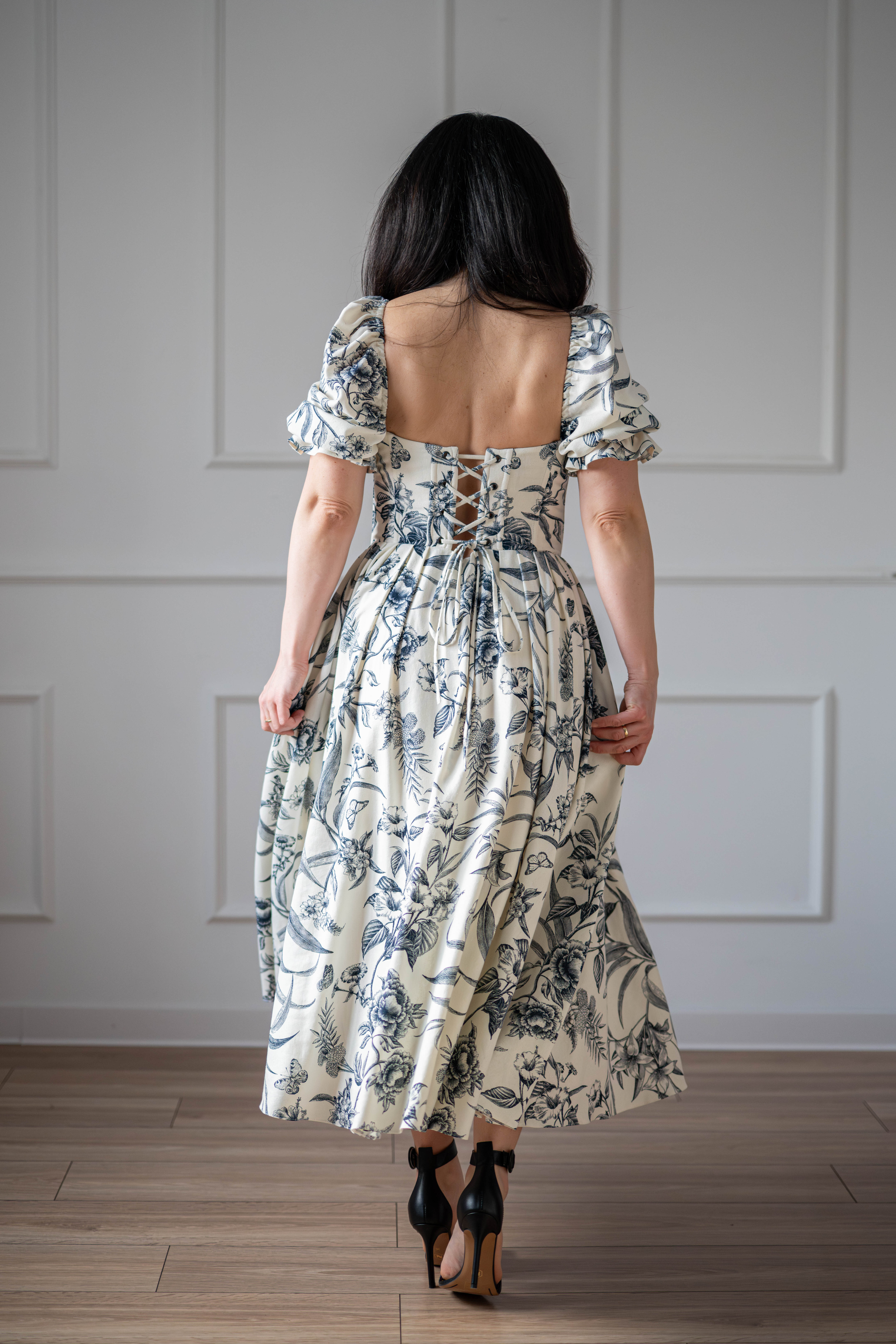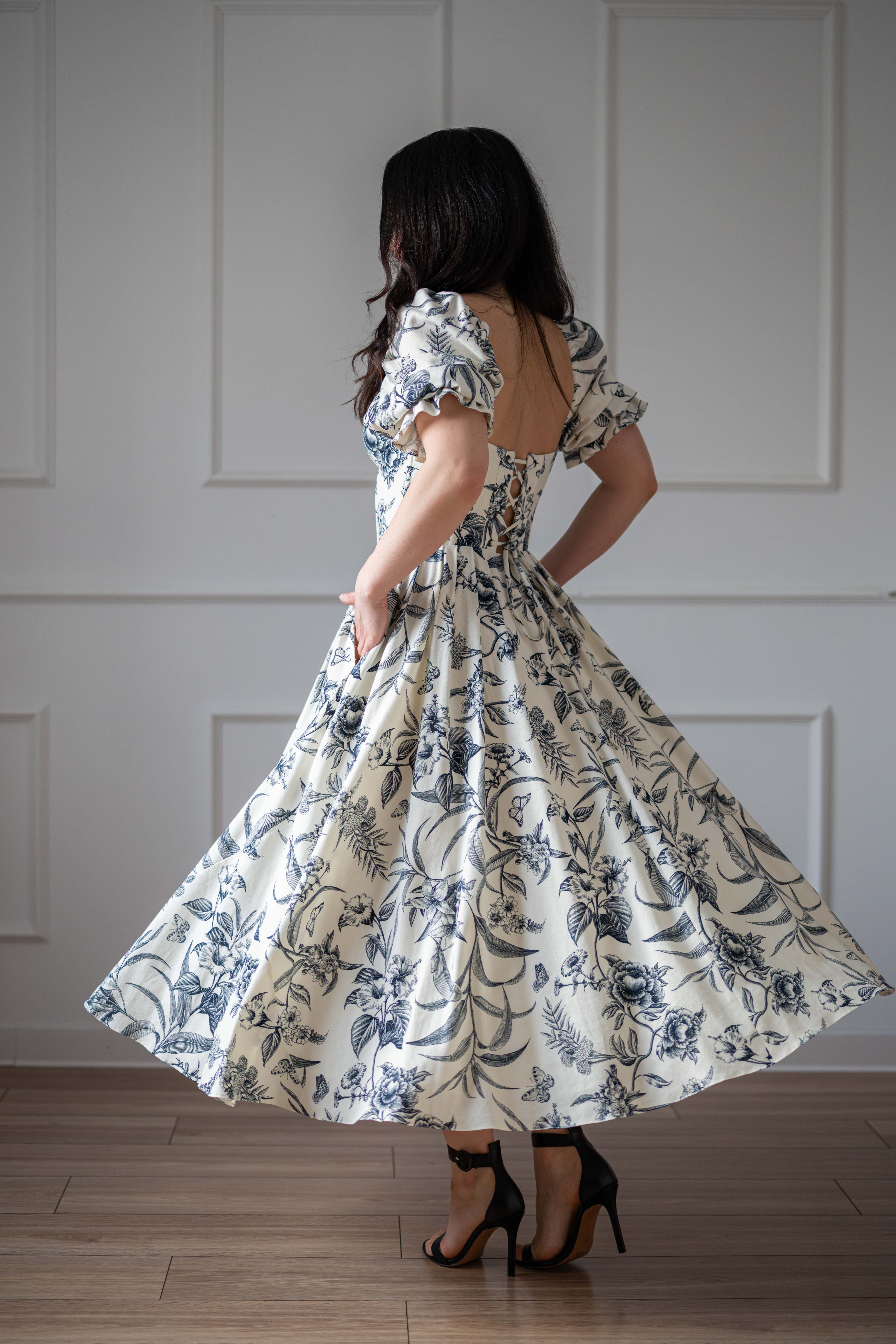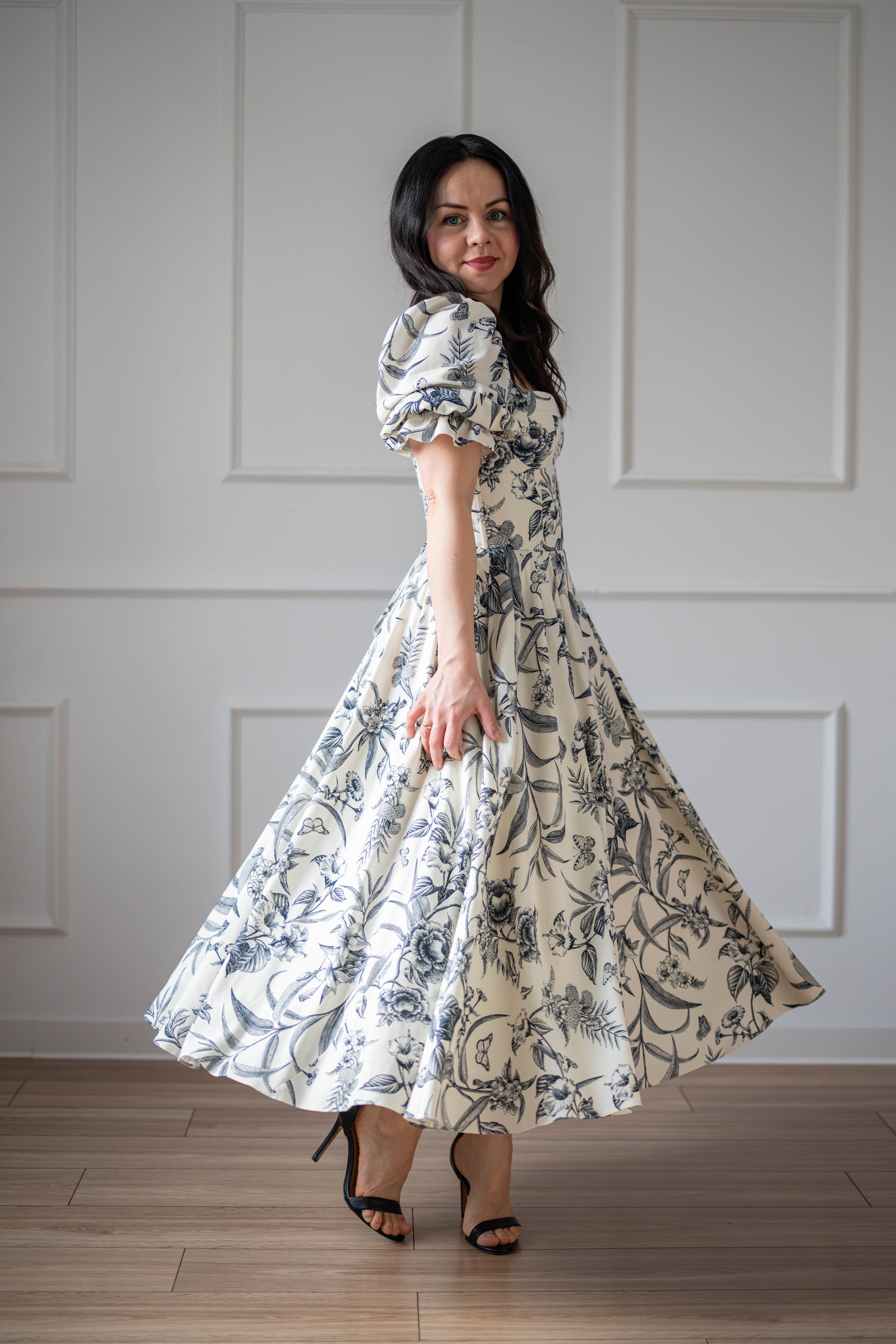 Sukienka gorsetowa z usztywnianymi miseczkami, dzięki którym nie ma potrzeby zakładania stanika. Góra została usztywniona fiszbinami, które pięknie modelują talię. Tył sukienki posiada wiązanie pozwalające na regulację oraz indywidualne dopasowanie, natomiast spódnica zapinana jest na zamek kryty. Sukienka Selena posiada rękawy wykończone u góry gumką dzięki, której nie spadają z ramion oraz kieszenie w szwach bocznych. Dodatkowo w zestawie dołączona jest wkładka pod wiązanie z tyłu aby zamaskować plecy.