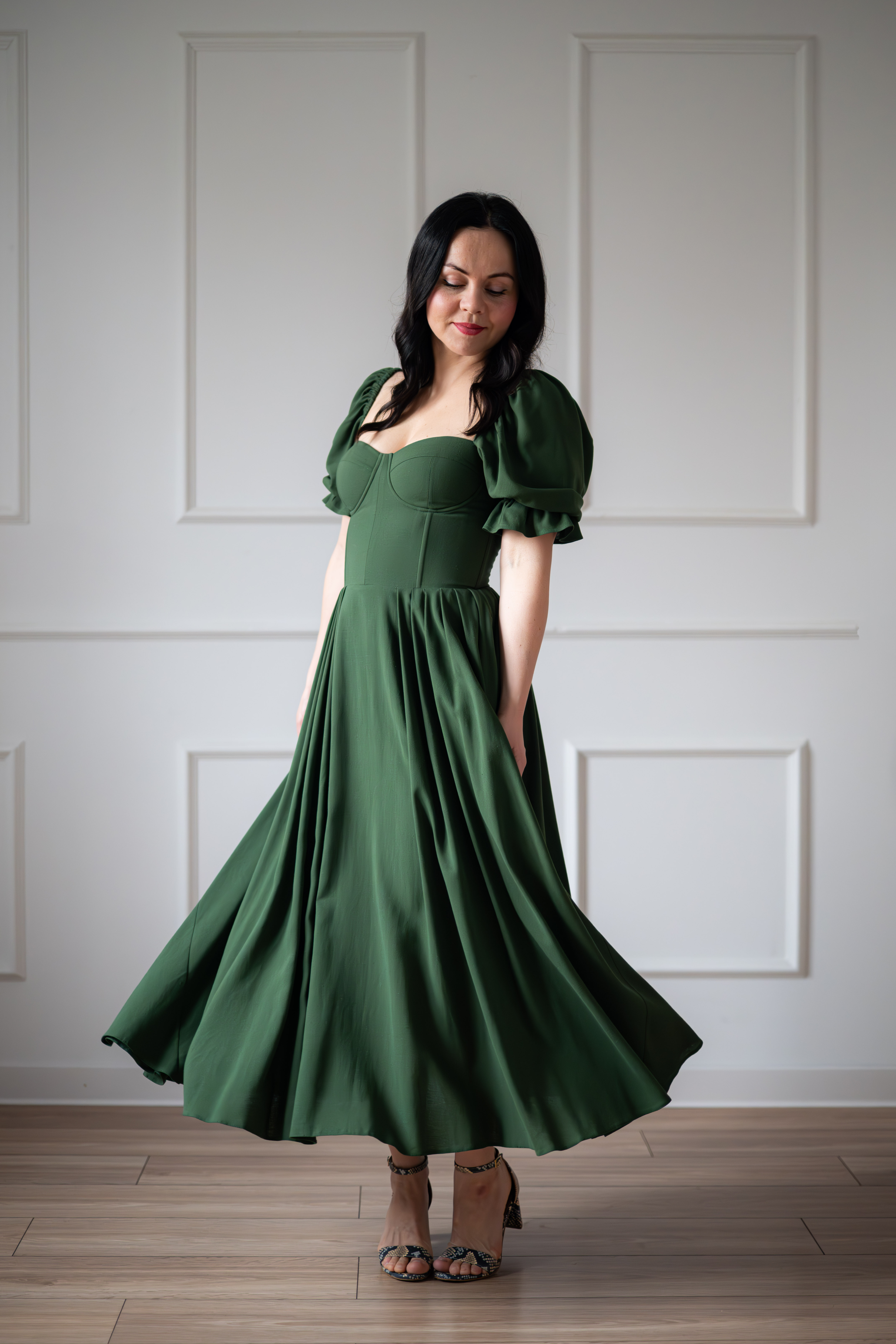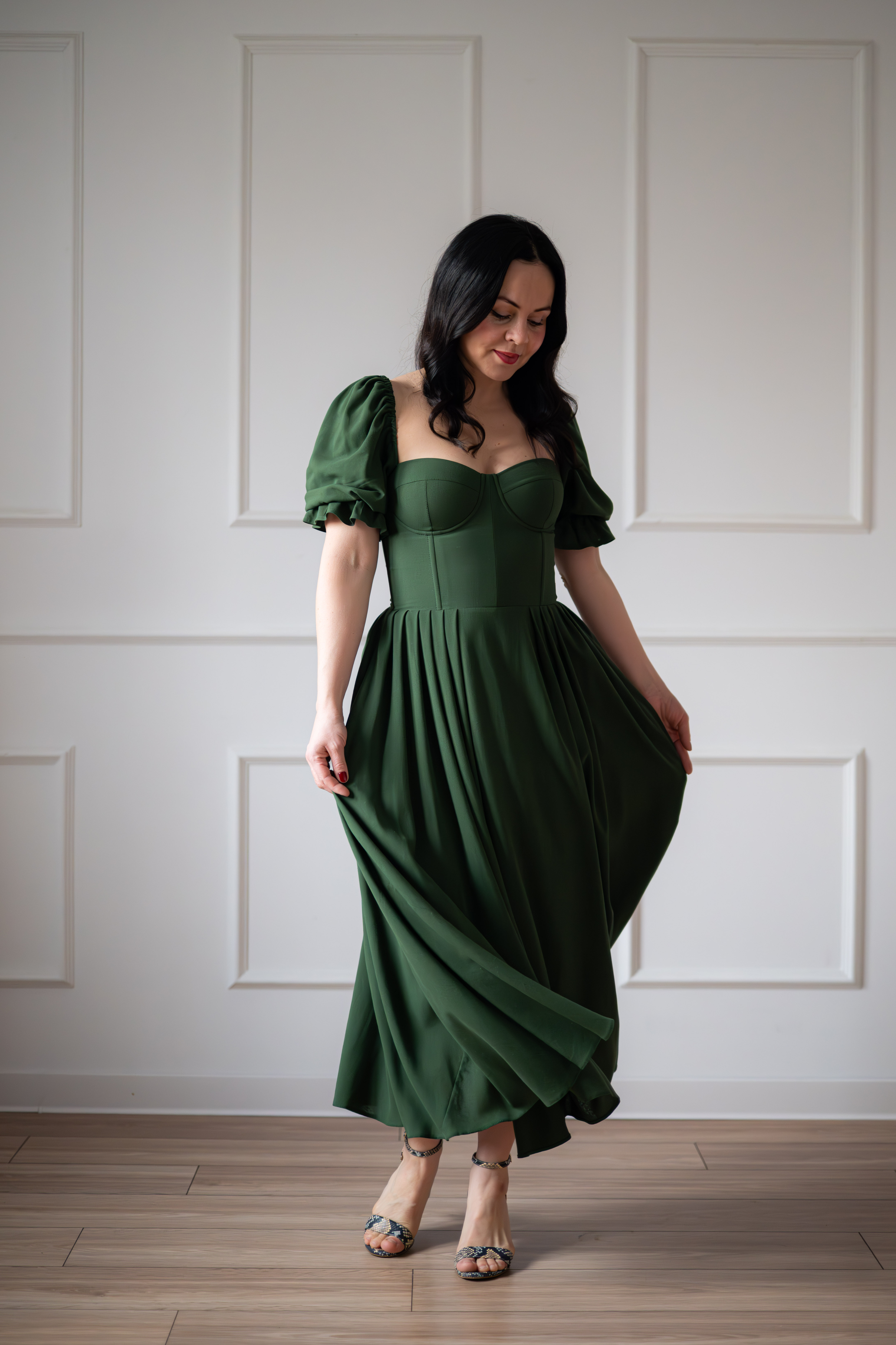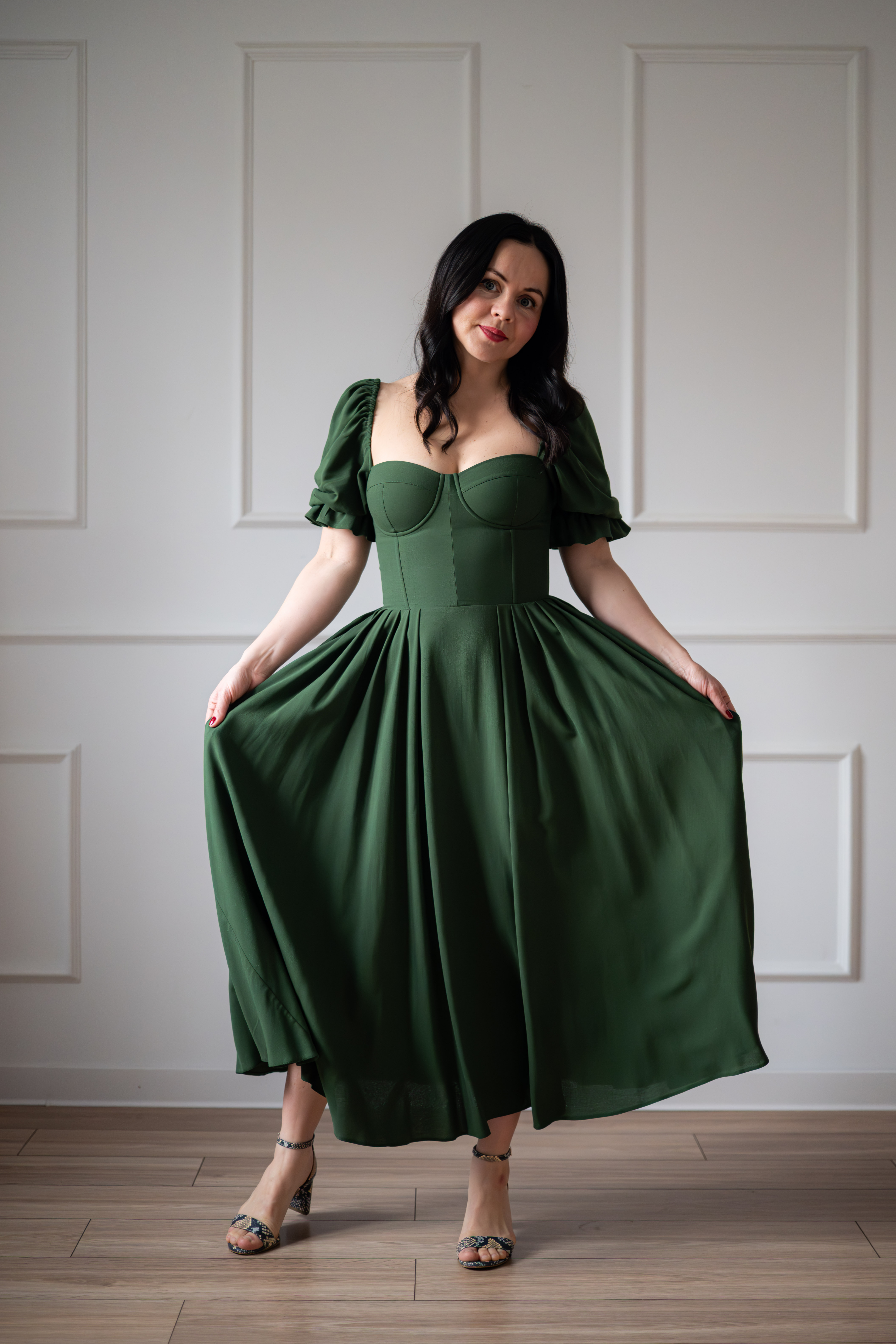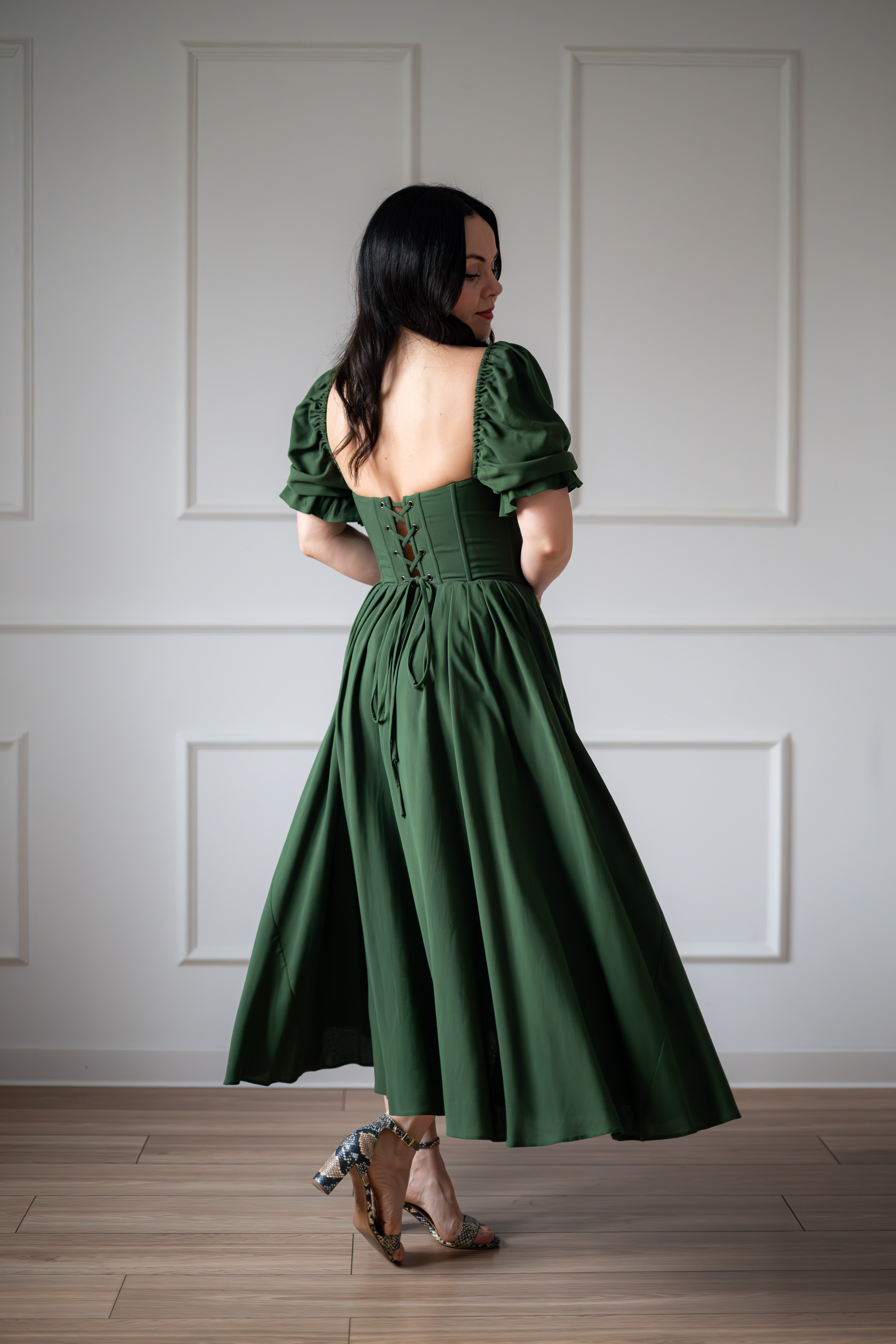 Sukienka gorsetowa z usztywnianymi miseczkami, dzięki którym nie ma potrzeby zakładania stanika. Góra została usztywniona fiszbinami, które pięknie modelują talię. Tył sukienki posiada wiązanie pozwalające na regulację oraz indywidualne dopasowanie, natomiast spódnica zapinana jest na zamek kryty. Sukienka Selena posiada rękawy wykończone u góry gumką dzięki, której nie spadają z ramion oraz kieszenie w szwach bocznych. Dodatkowo w zestawie dołączona jest wkładka pod wiązanie z tyłu aby zamaskować plecy.