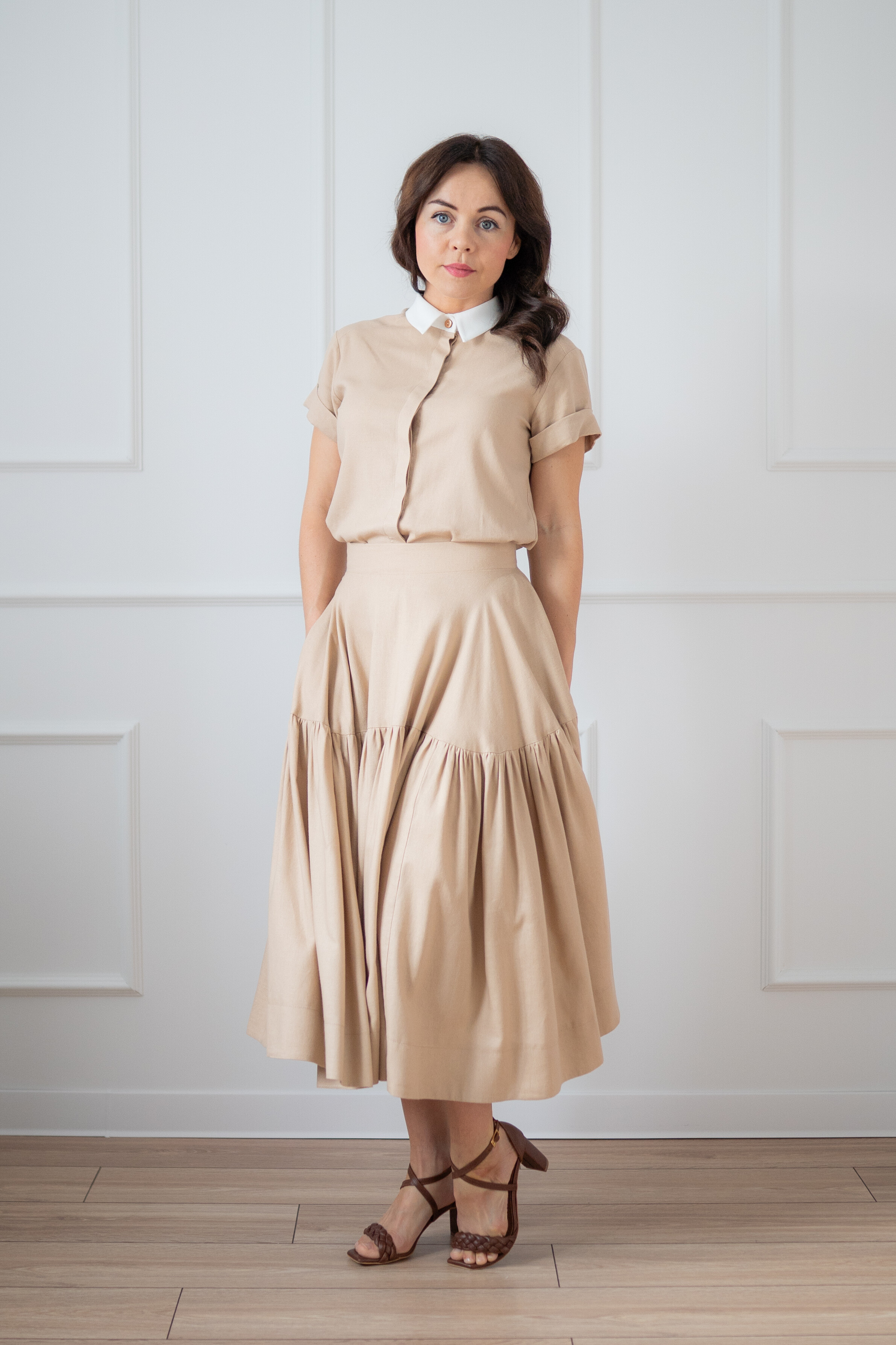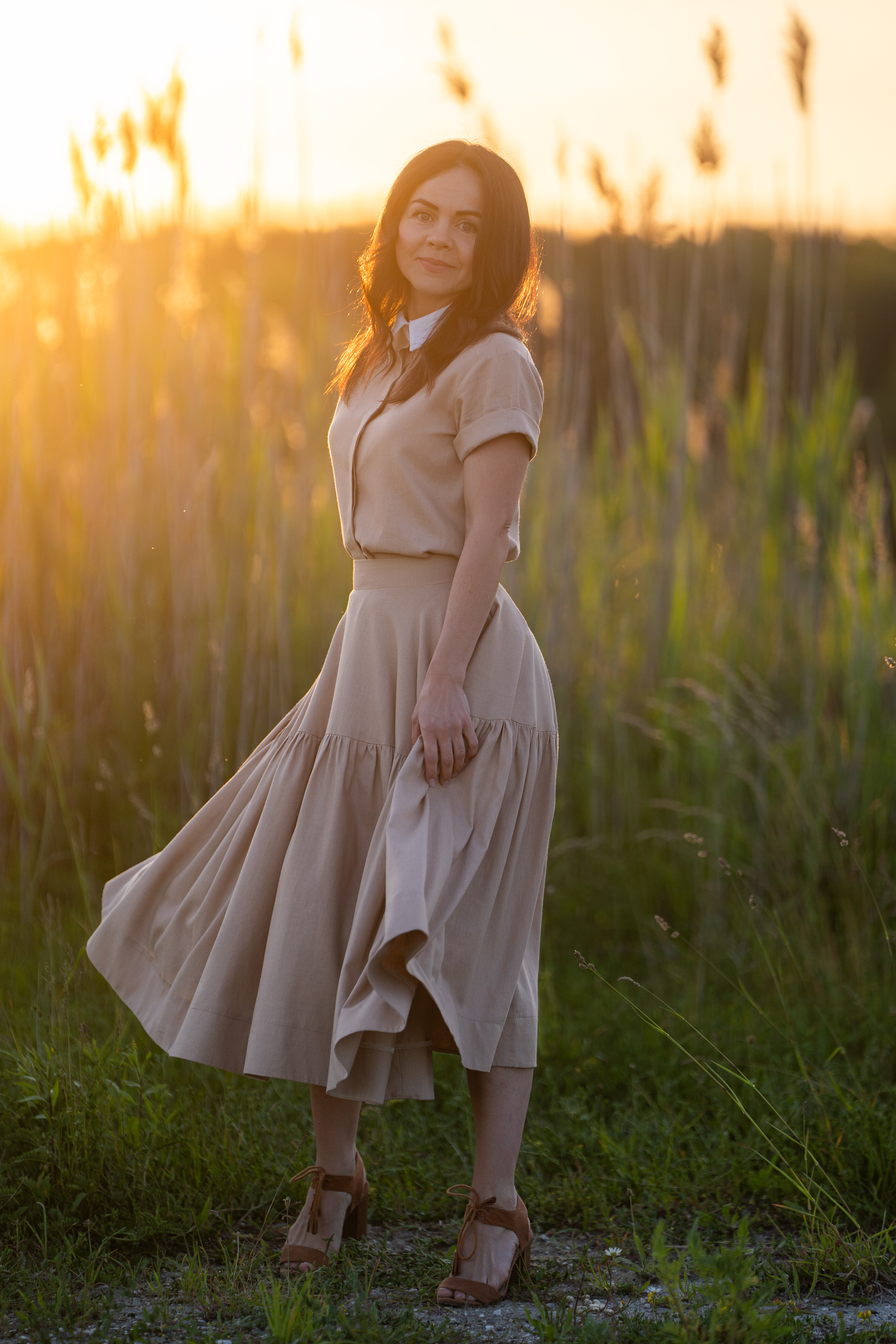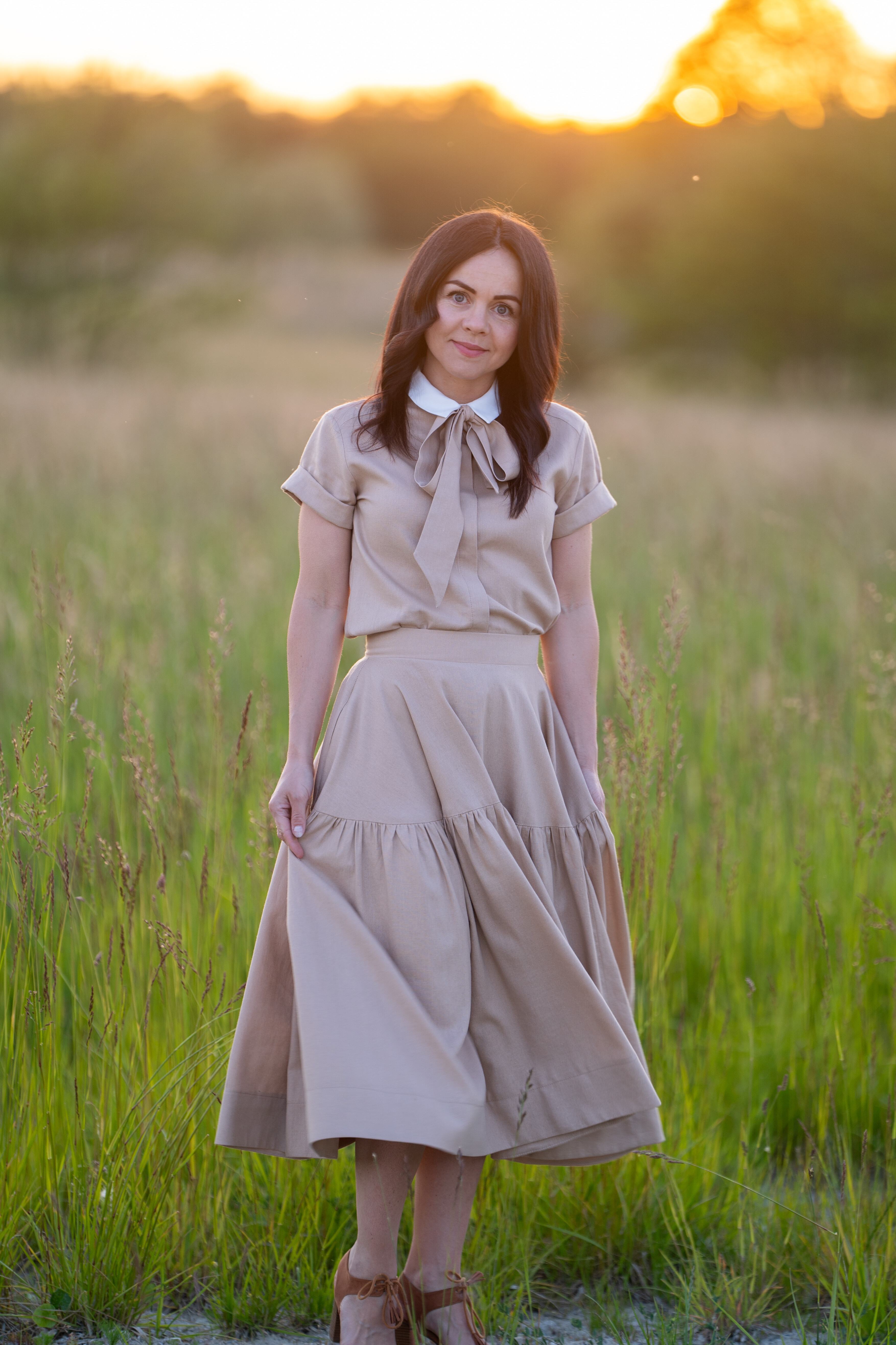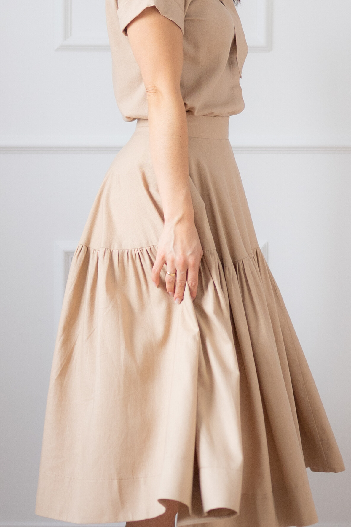 z połączenia lnu i wiskozy. Jest to niezwykle przyjemny i przewiewny materiał. Spódnica posiada kieszenie w szwach bocznych. Dziewczęcego uroku dodają jej marszczenia, a usztywniony pas pięknie podkreśla talię.