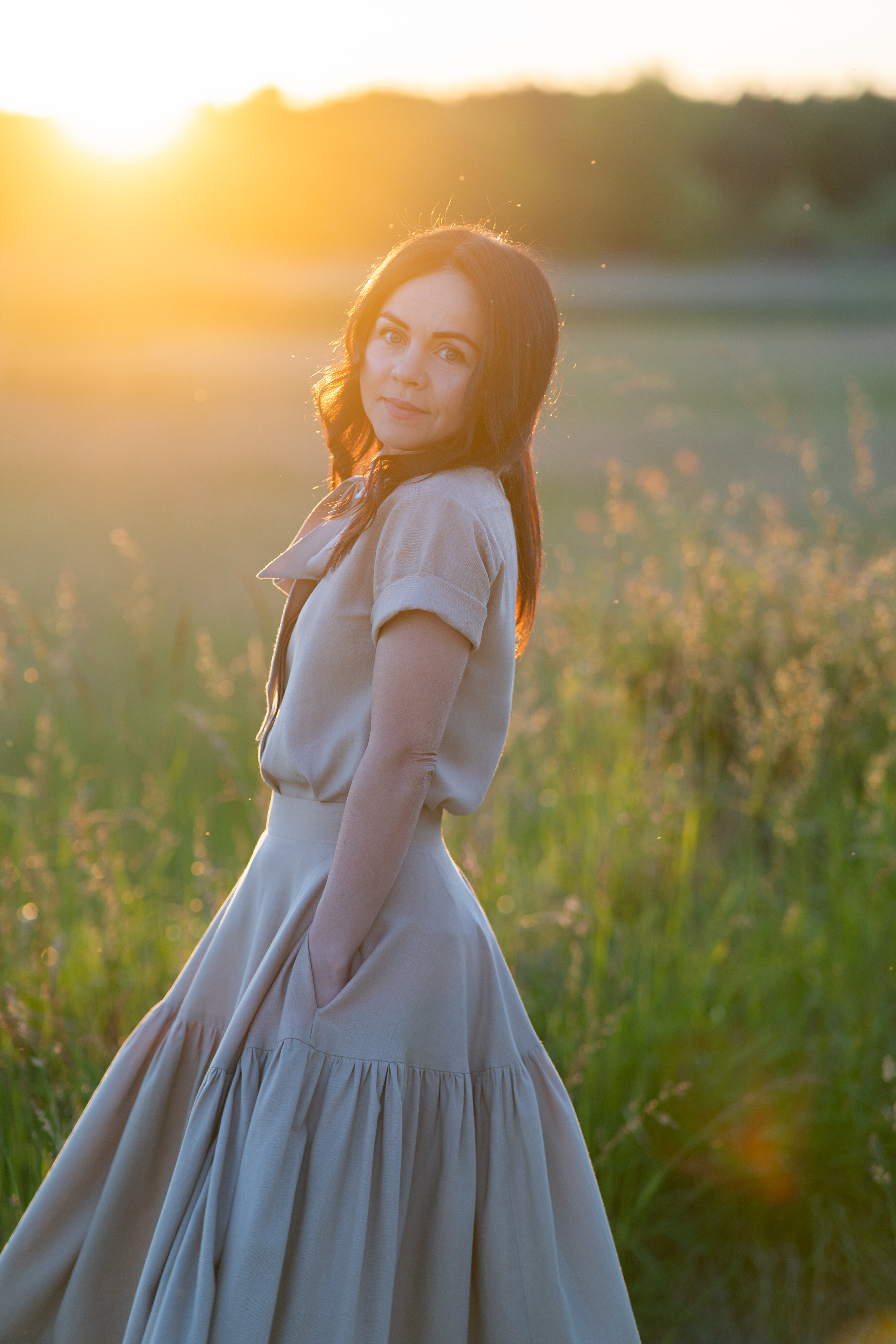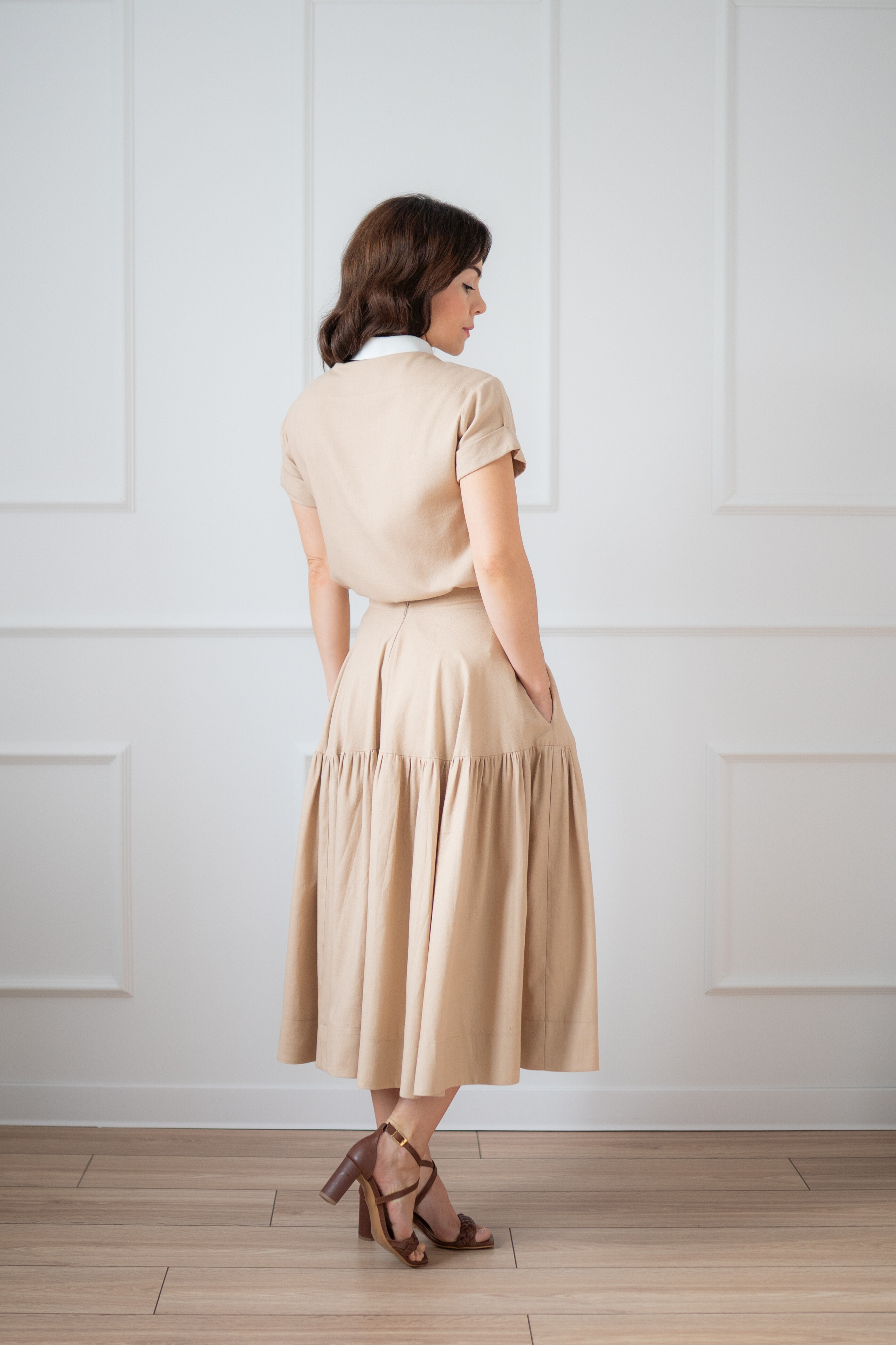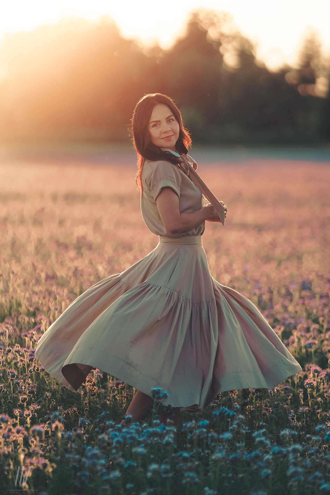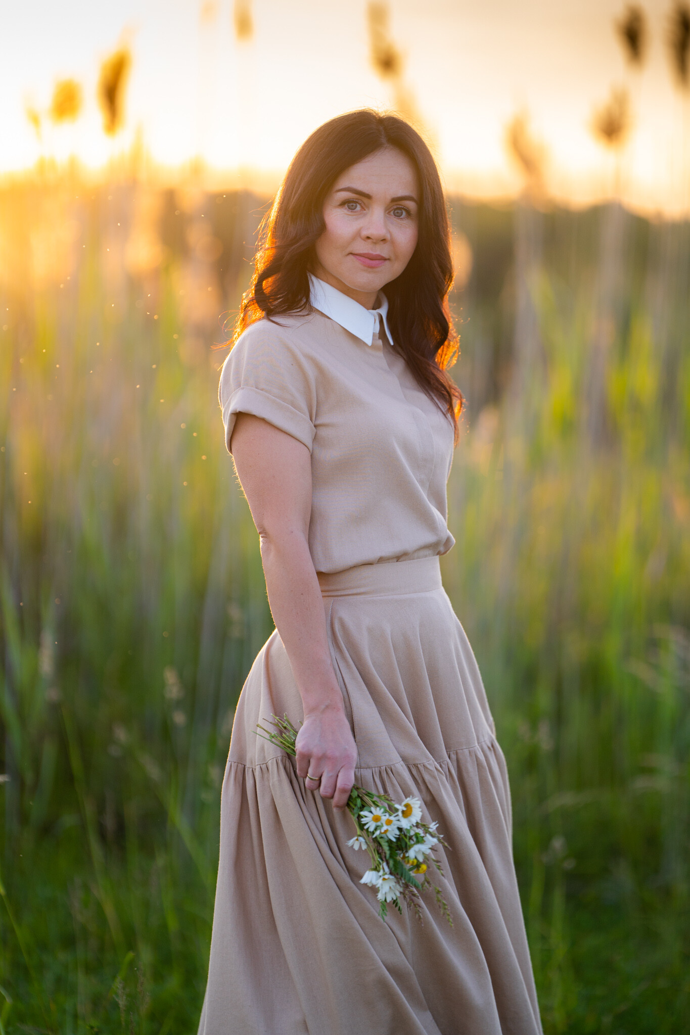 z połączenia lnu i wiskozy. Jest to niezwykle przyjemny i przewiewny materiał. Spódnica posiada kieszenie w szwach bocznych. Dziewczęcego uroku dodają jej marszczenia, a usztywniony pas pięknie podkreśla talię.