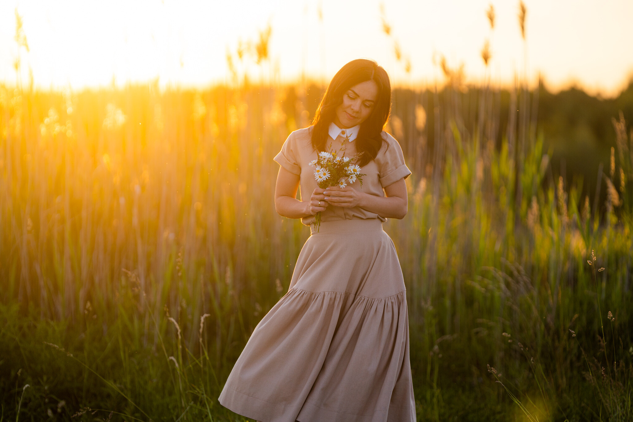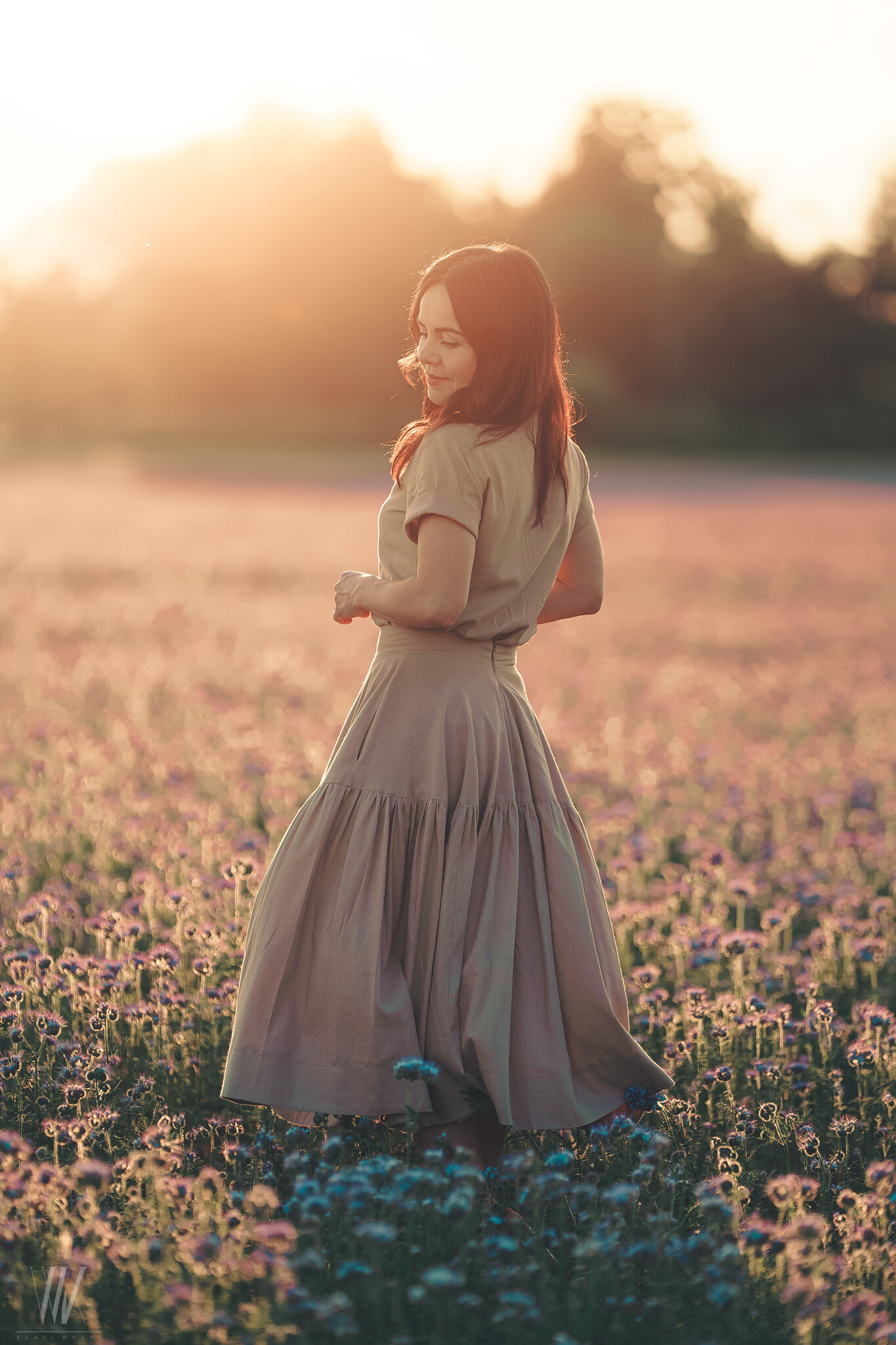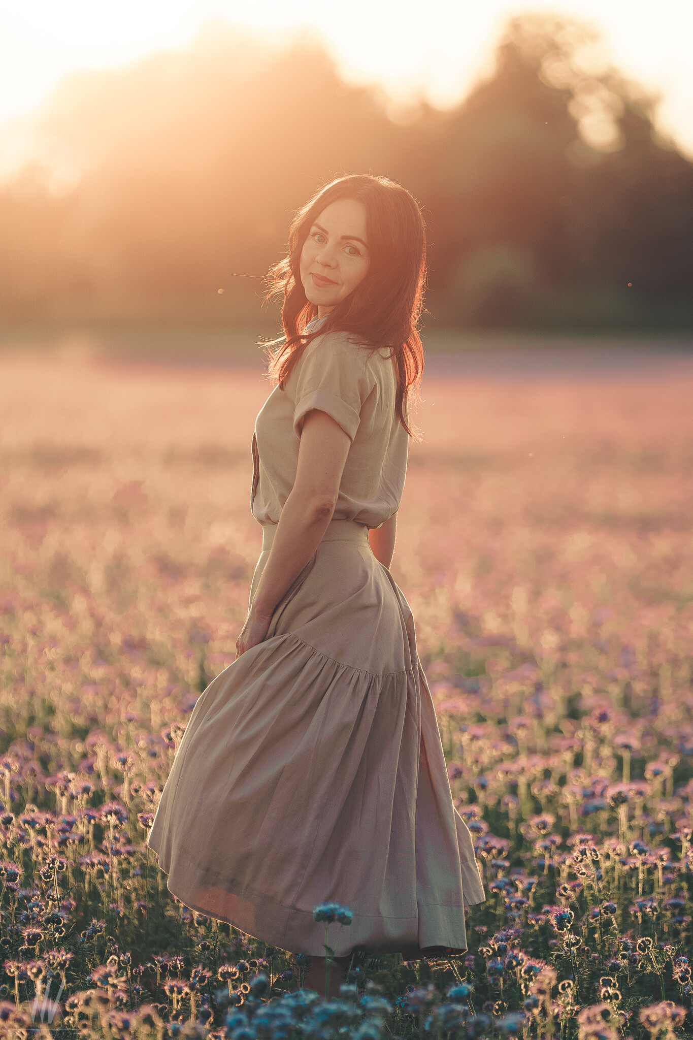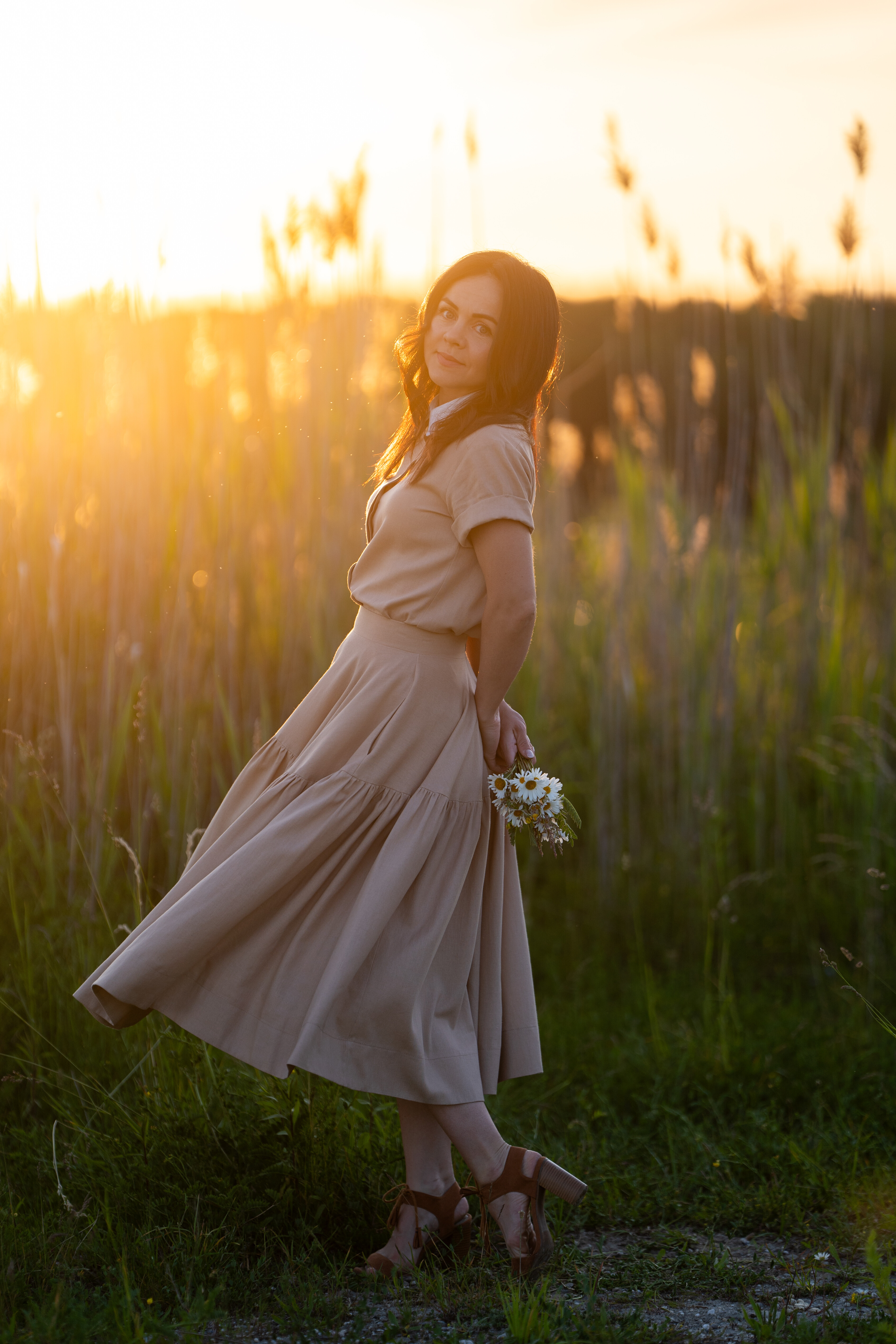 z połączenia lnu i wiskozy. Jest to niezwykle przyjemny i przewiewny materiał. Spódnica posiada kieszenie w szwach bocznych. Dziewczęcego uroku dodają jej marszczenia, a usztywniony pas pięknie podkreśla talię.