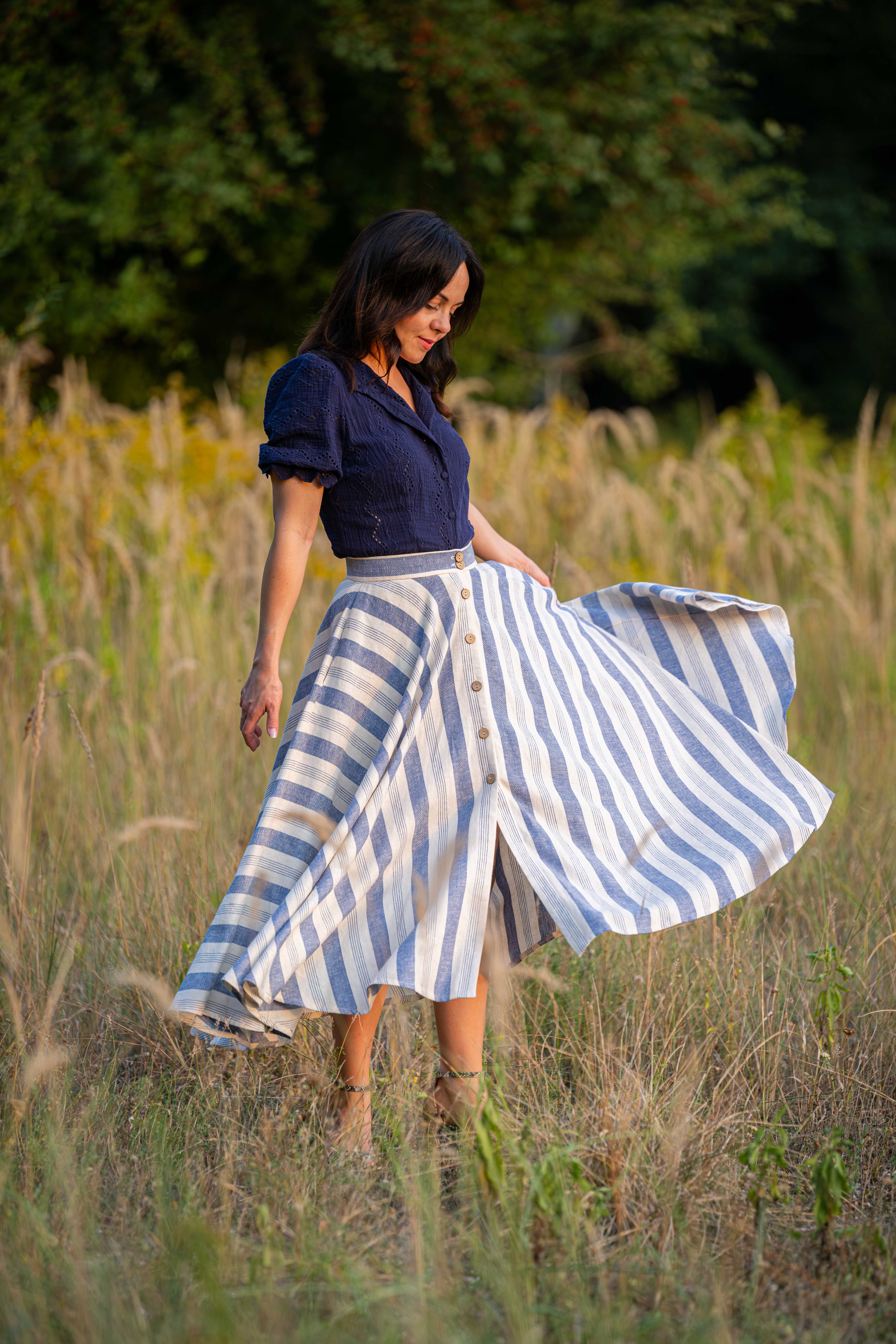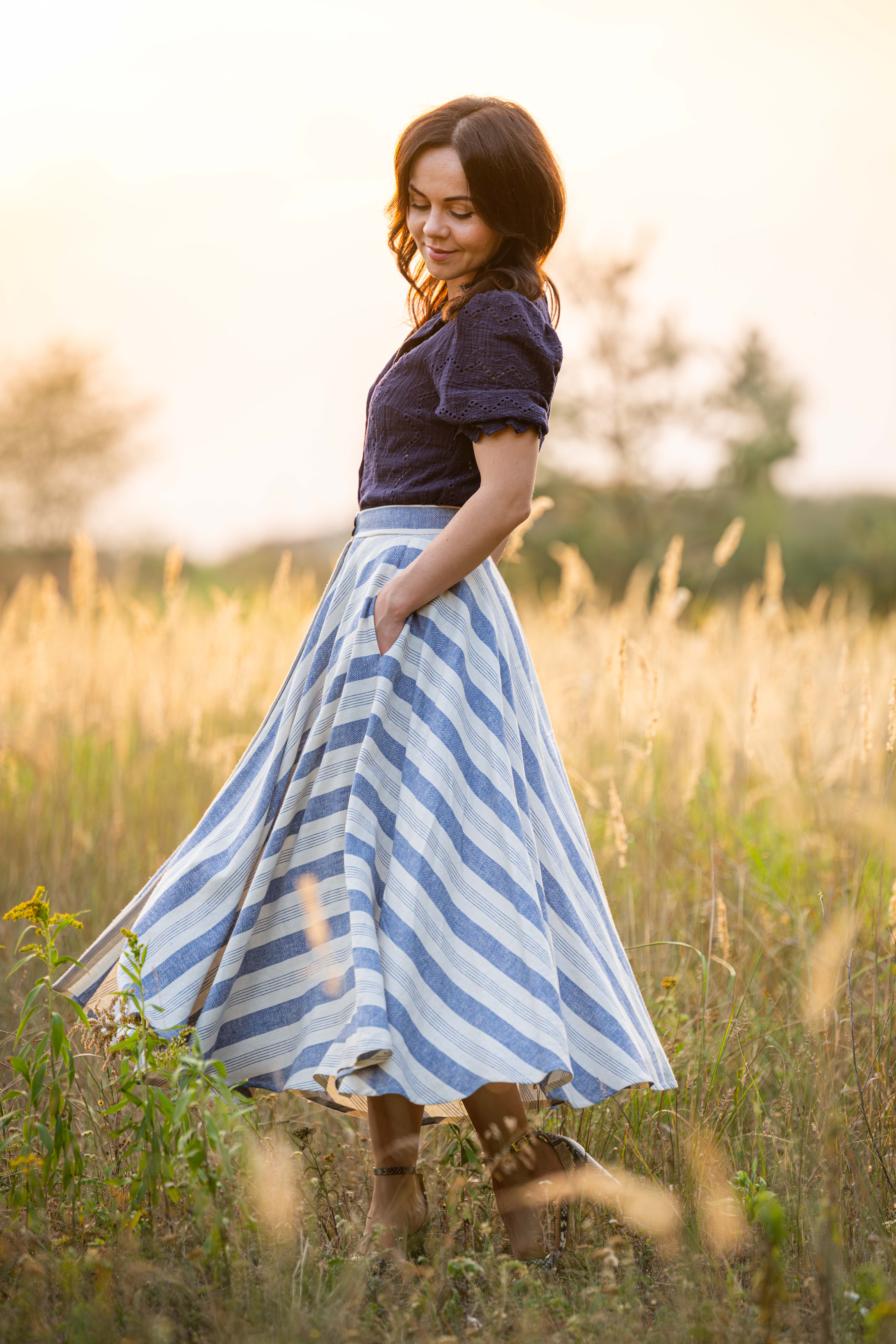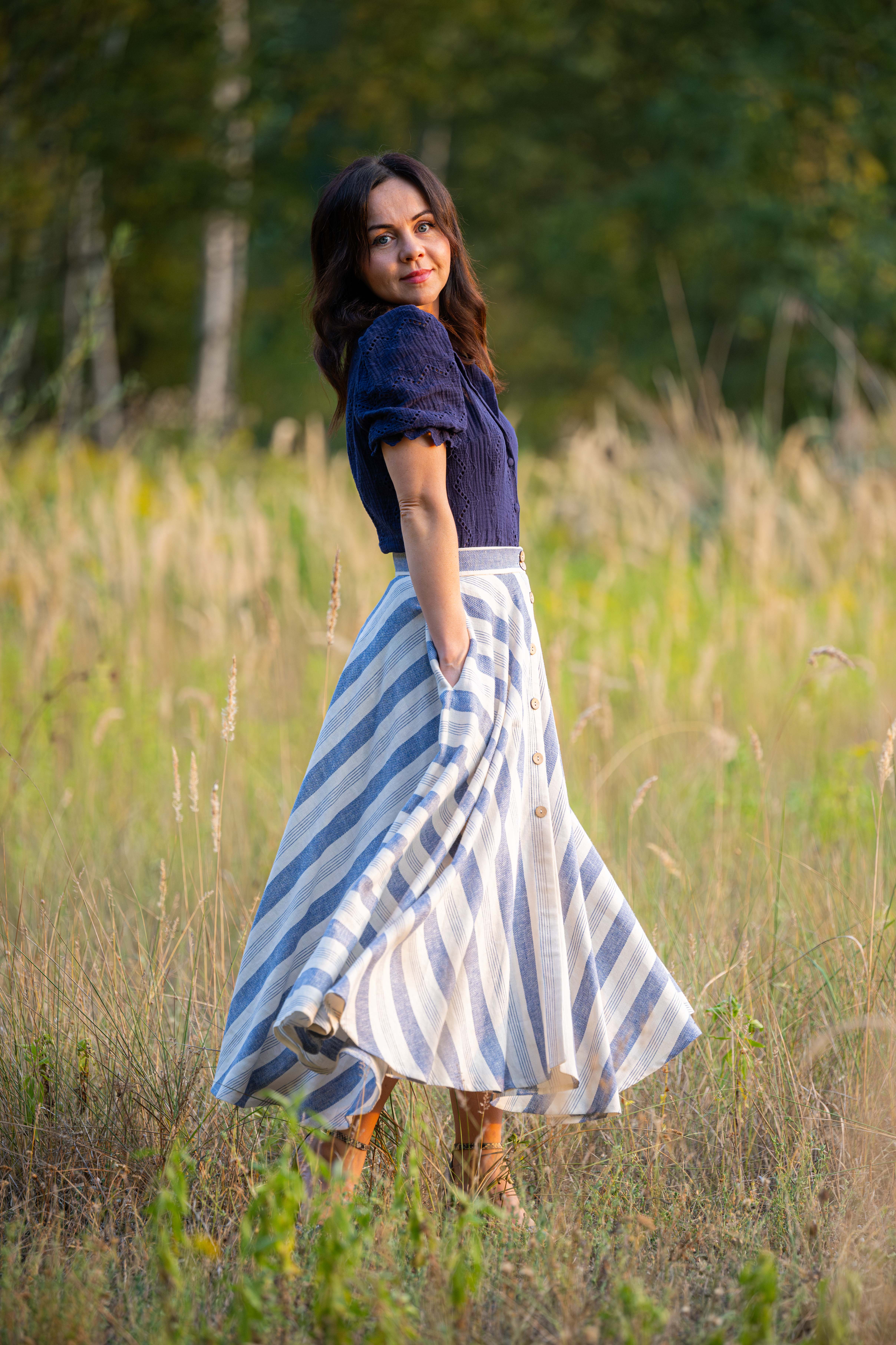 Spódnica łączy w sobie styl klasyczny oraz klimat retro, została wykonana z naturalnej tkaniny, która powstała z połączenia lnu i wiskozy. Do jej uszycia zużyto prawie 5 metrów tkaniny aby uzyskać efekt tak pięknie układających się pasów. dzięki temu iż jest skrojona z koła efektownie układa się w ruchu.