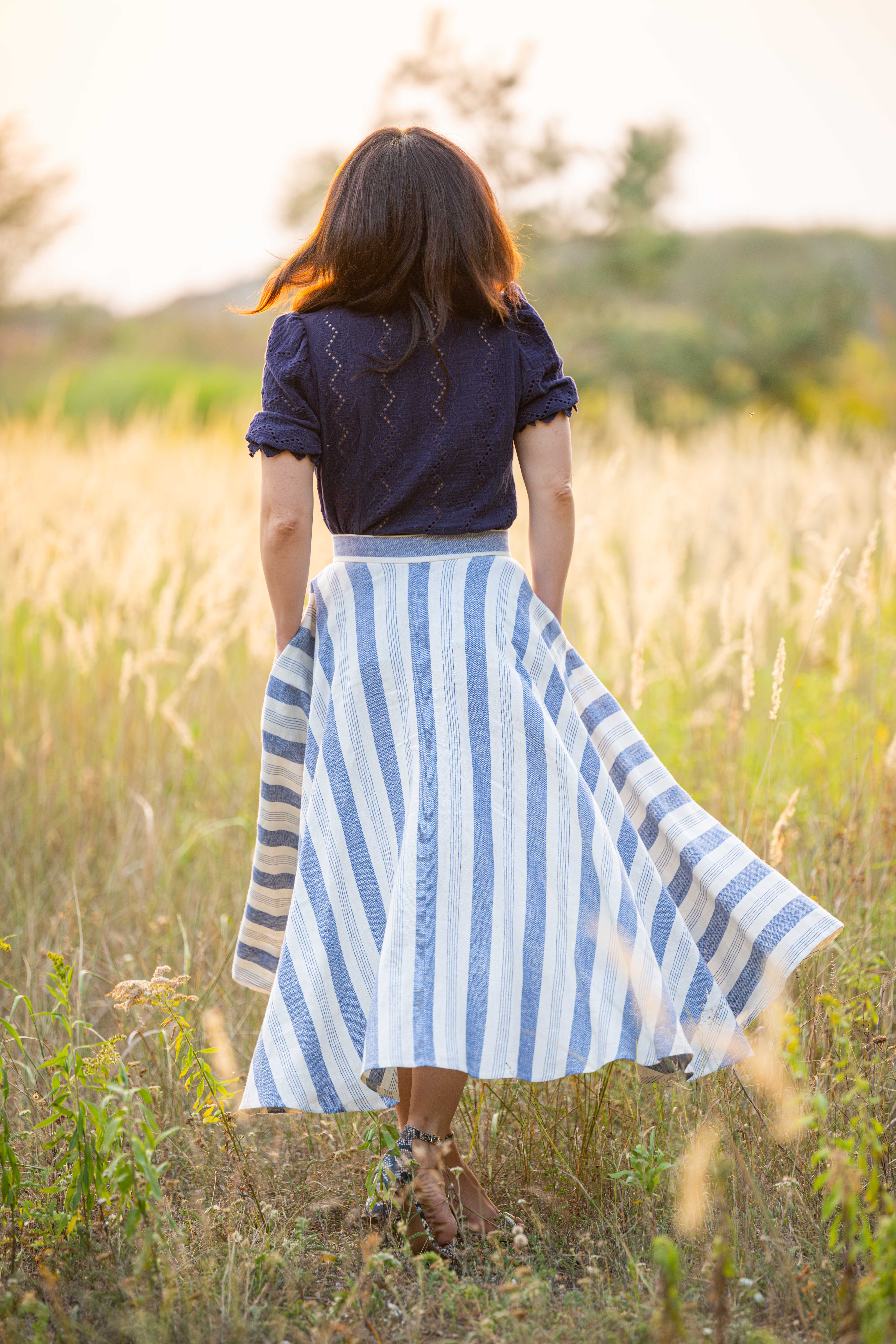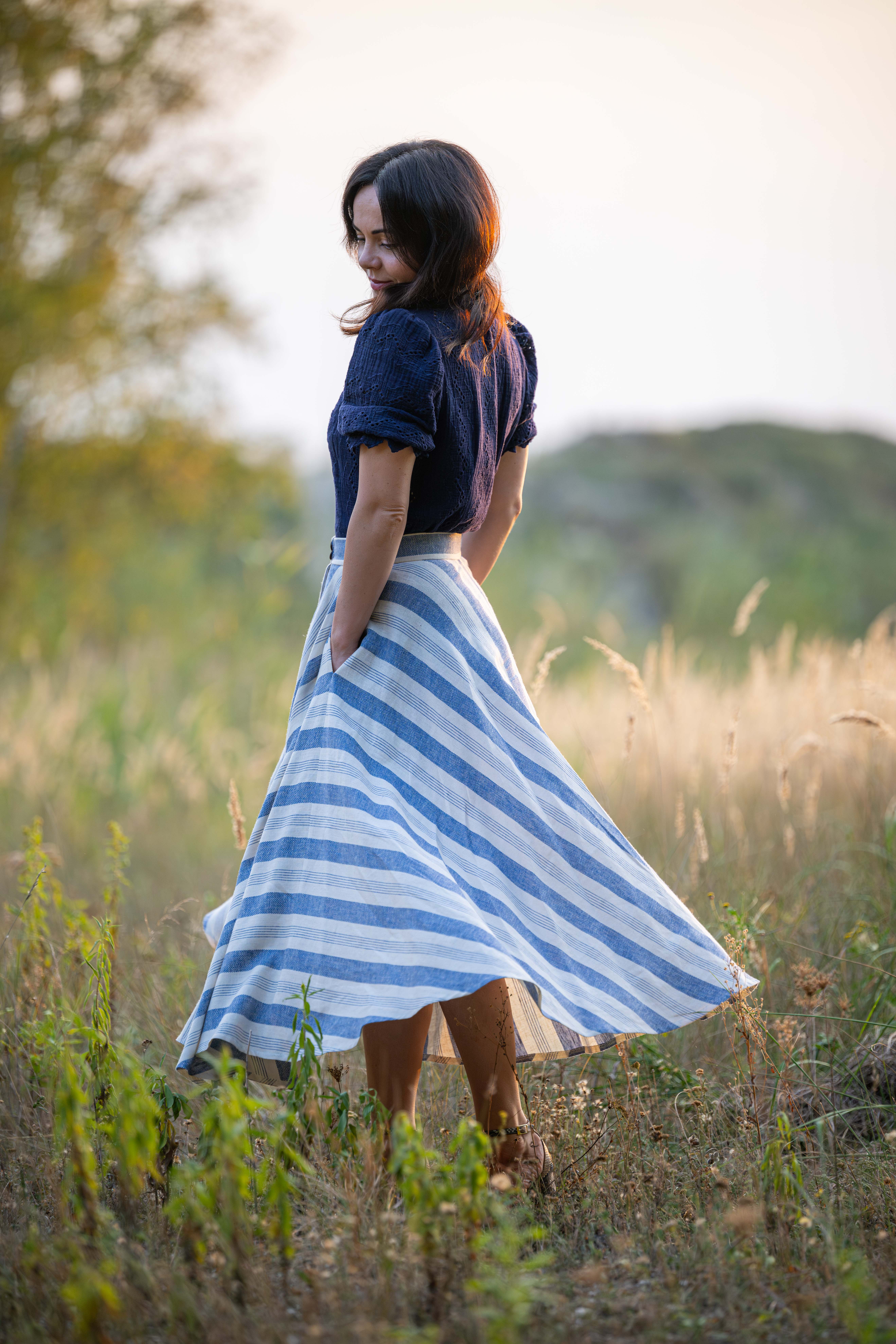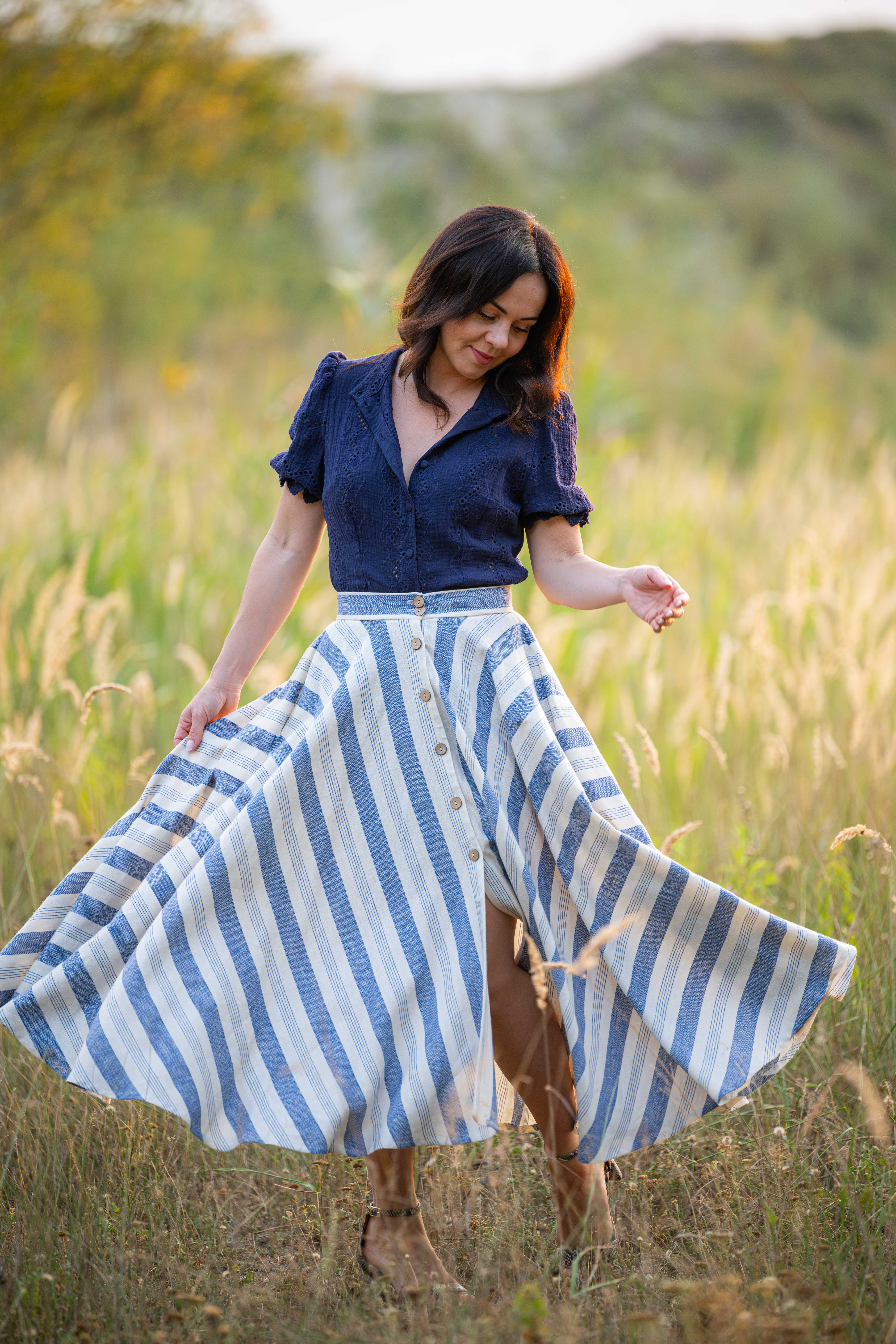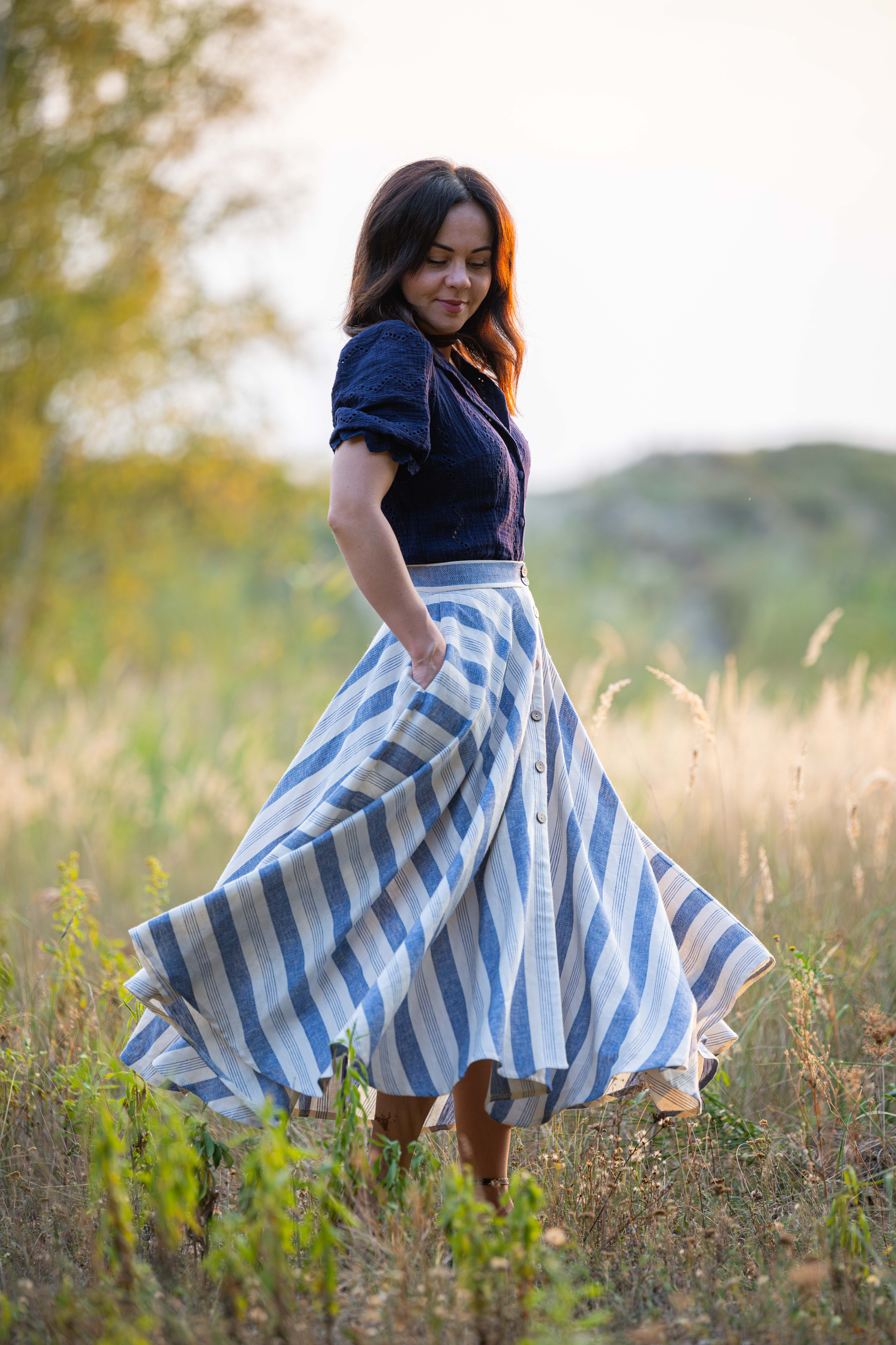 Spódnica łączy w sobie styl klasyczny oraz klimat retro, została wykonana z naturalnej tkaniny, która powstała z połączenia lnu i wiskozy. Do jej uszycia zużyto prawie 5 metrów tkaniny aby uzyskać efekt tak pięknie układających się pasów. dzięki temu iż jest skrojona z koła efektownie układa się w ruchu.