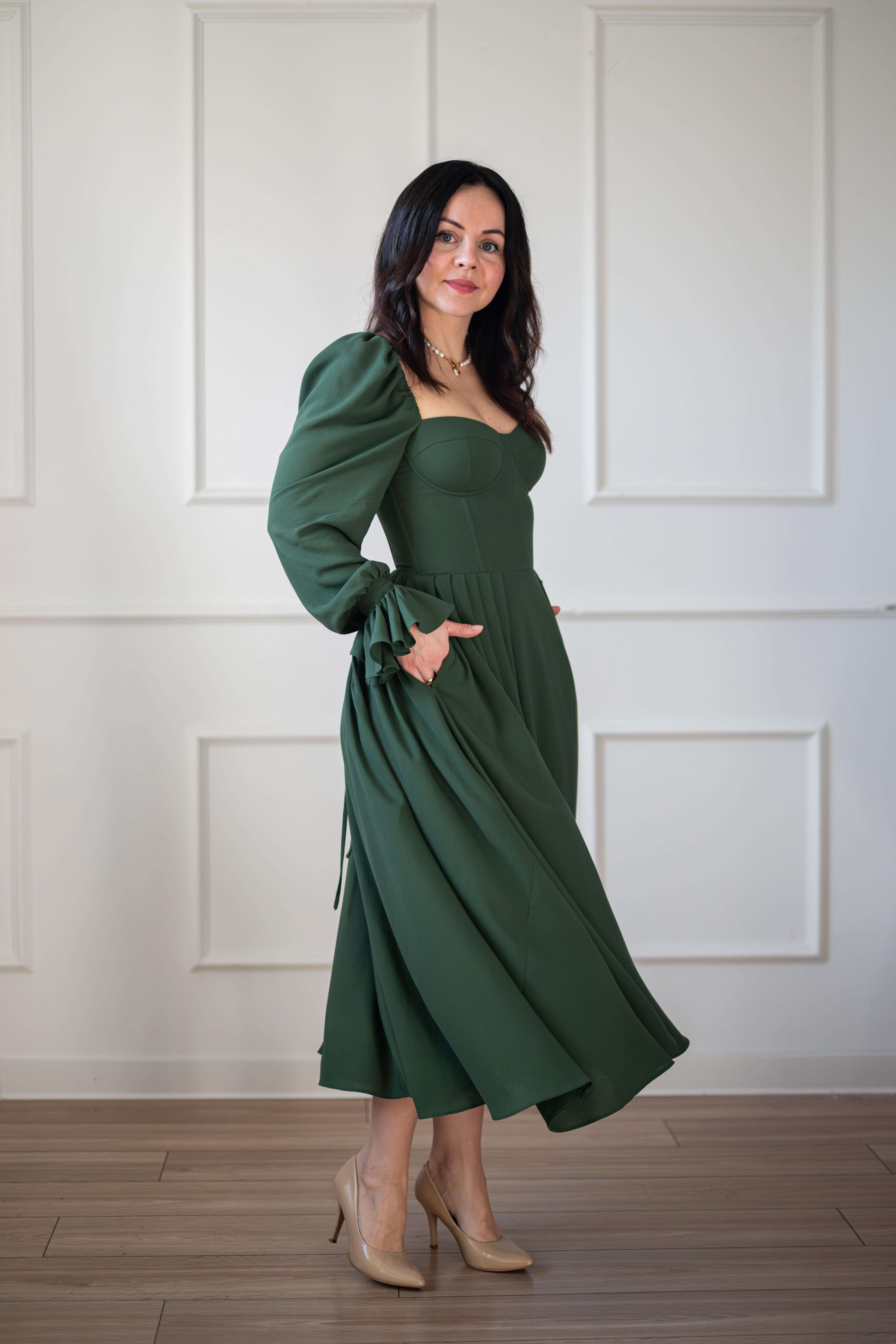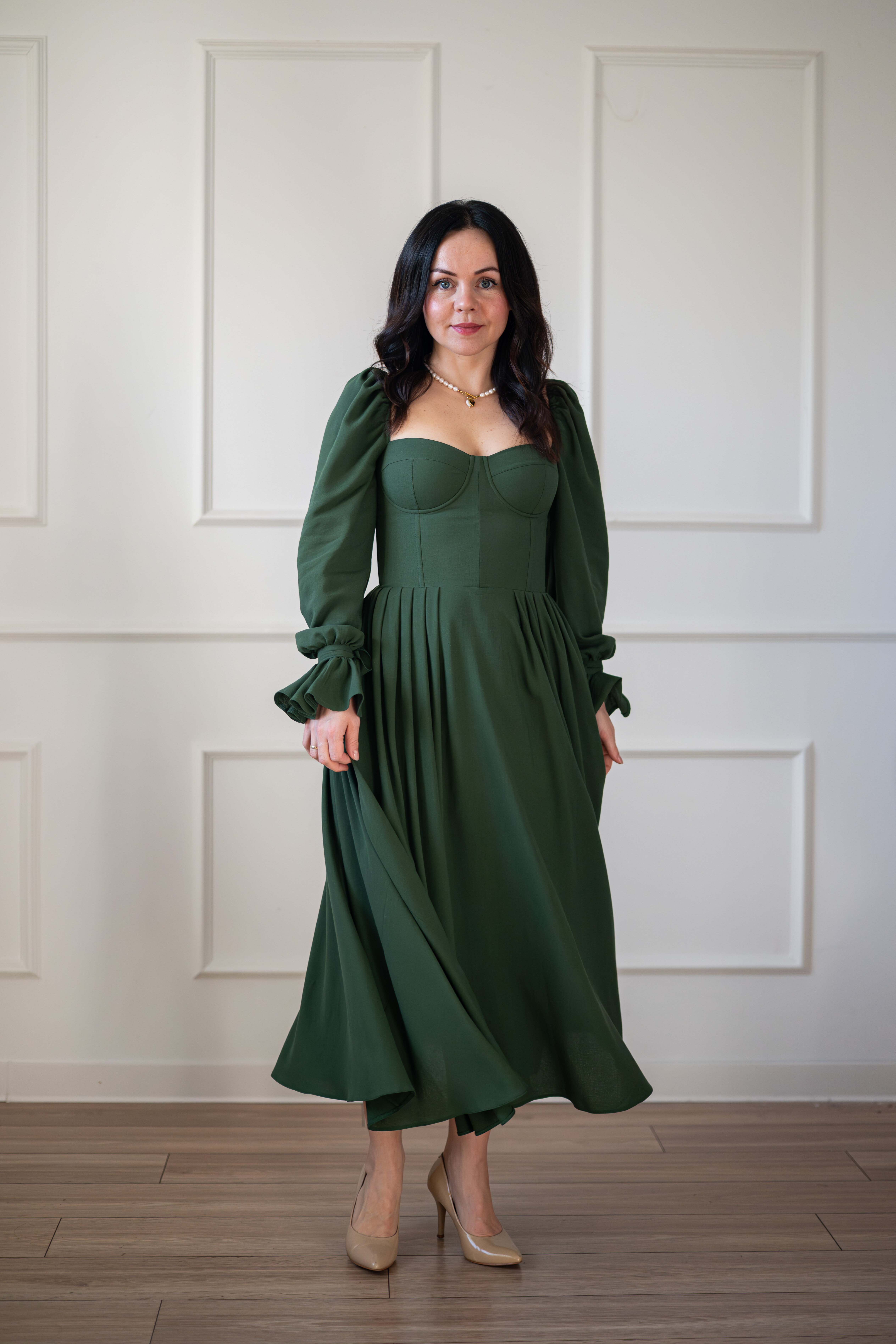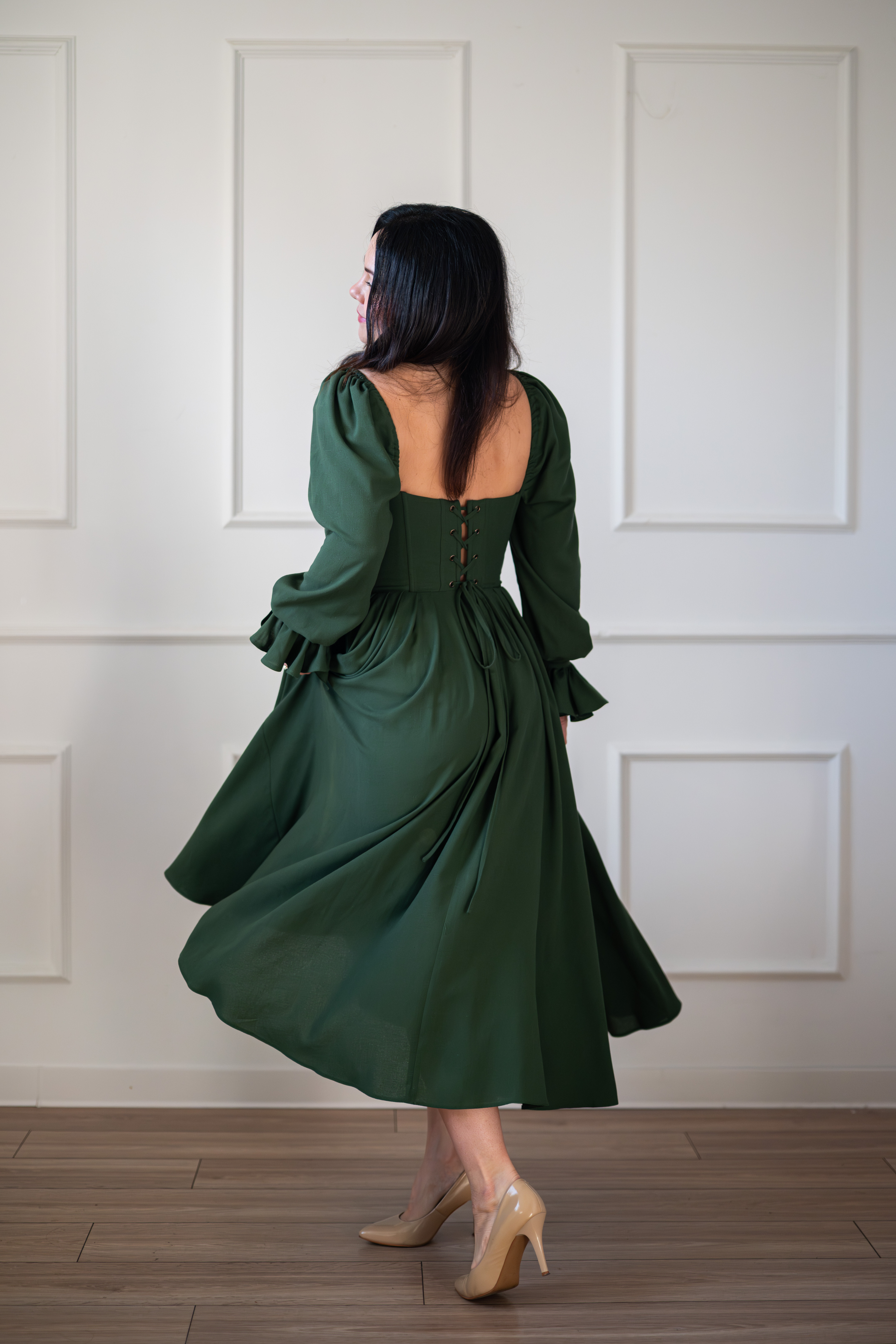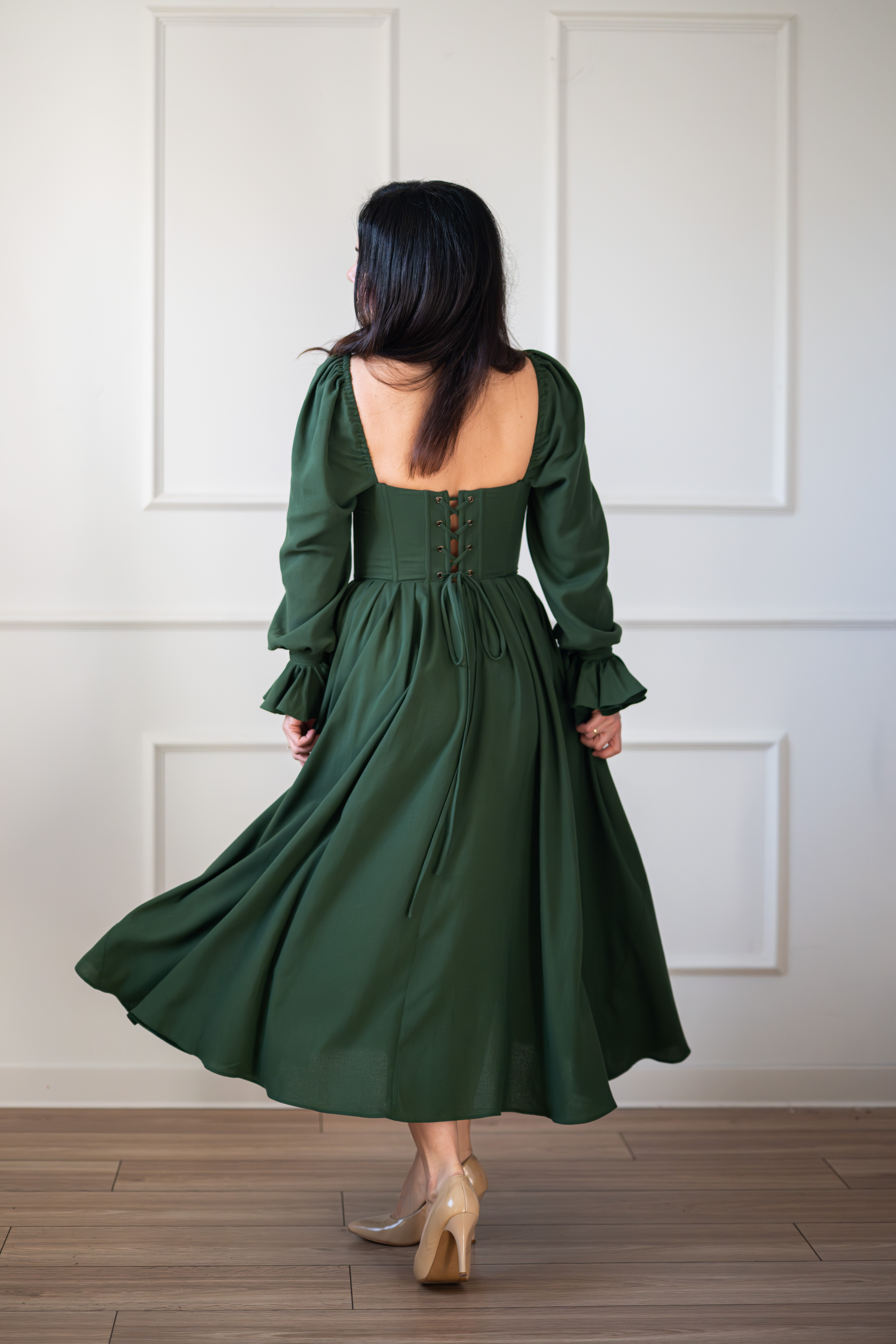 Sukienka gorsetowa z usztywnianymi miseczkami, dzięki którym nie ma potrzeby zakładania stanika. Góra została usztywniona fiszbinami, które pięknie modelują talię. Tył sukienki posiada wiązanie pozwalające na regulację oraz indywidualne dopasowanie, natomiast spódnica zapinana jest na zamek kryty. Sukienka Eliza posiada rękawy wykończone u góry gumką dzięki, której nie spadają z ramion oraz kieszenie w szwach bocznych. Dodatkowo w zestawie dołączona jest wkładka pod wiązanie z tyłu aby zamaskować plecy.