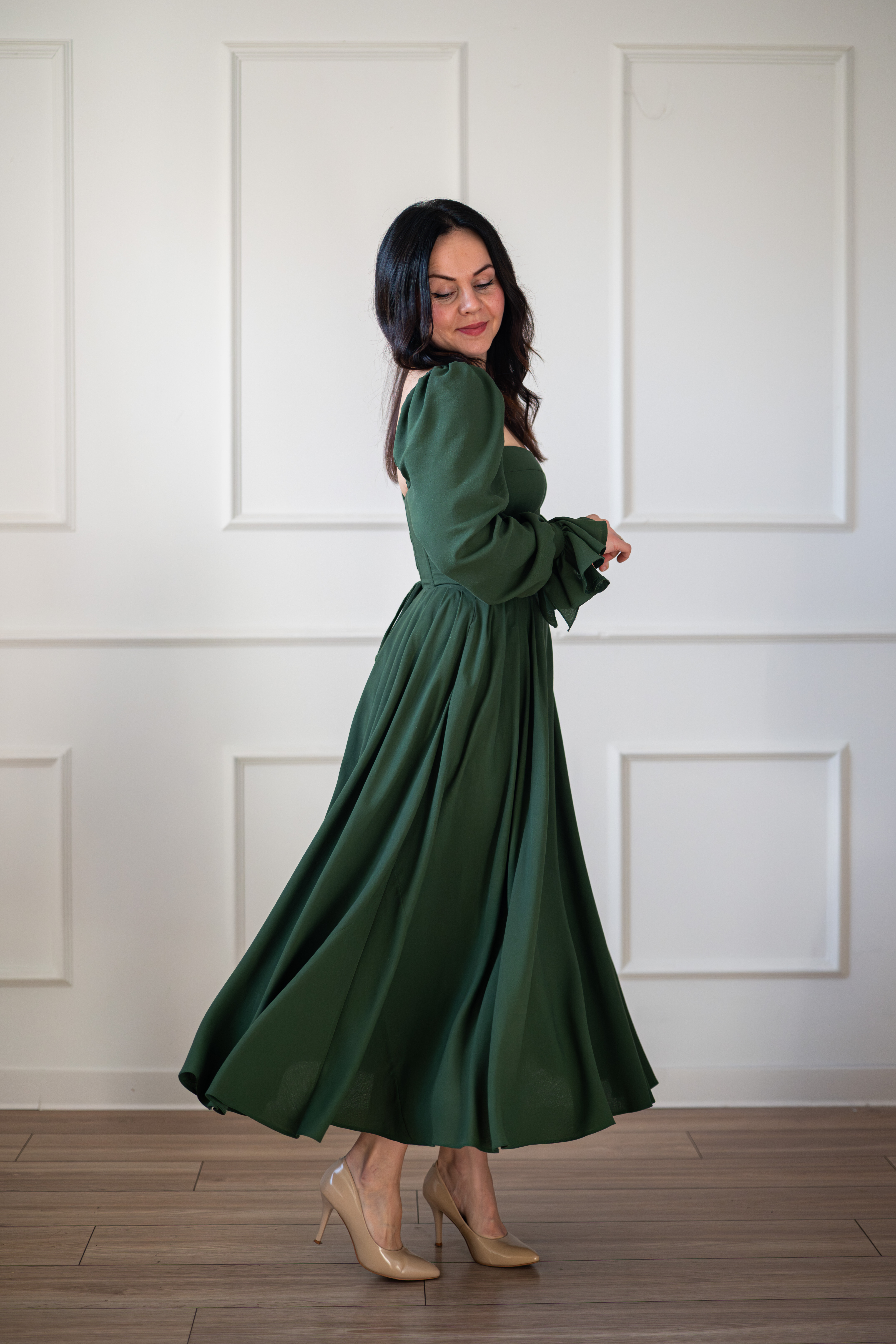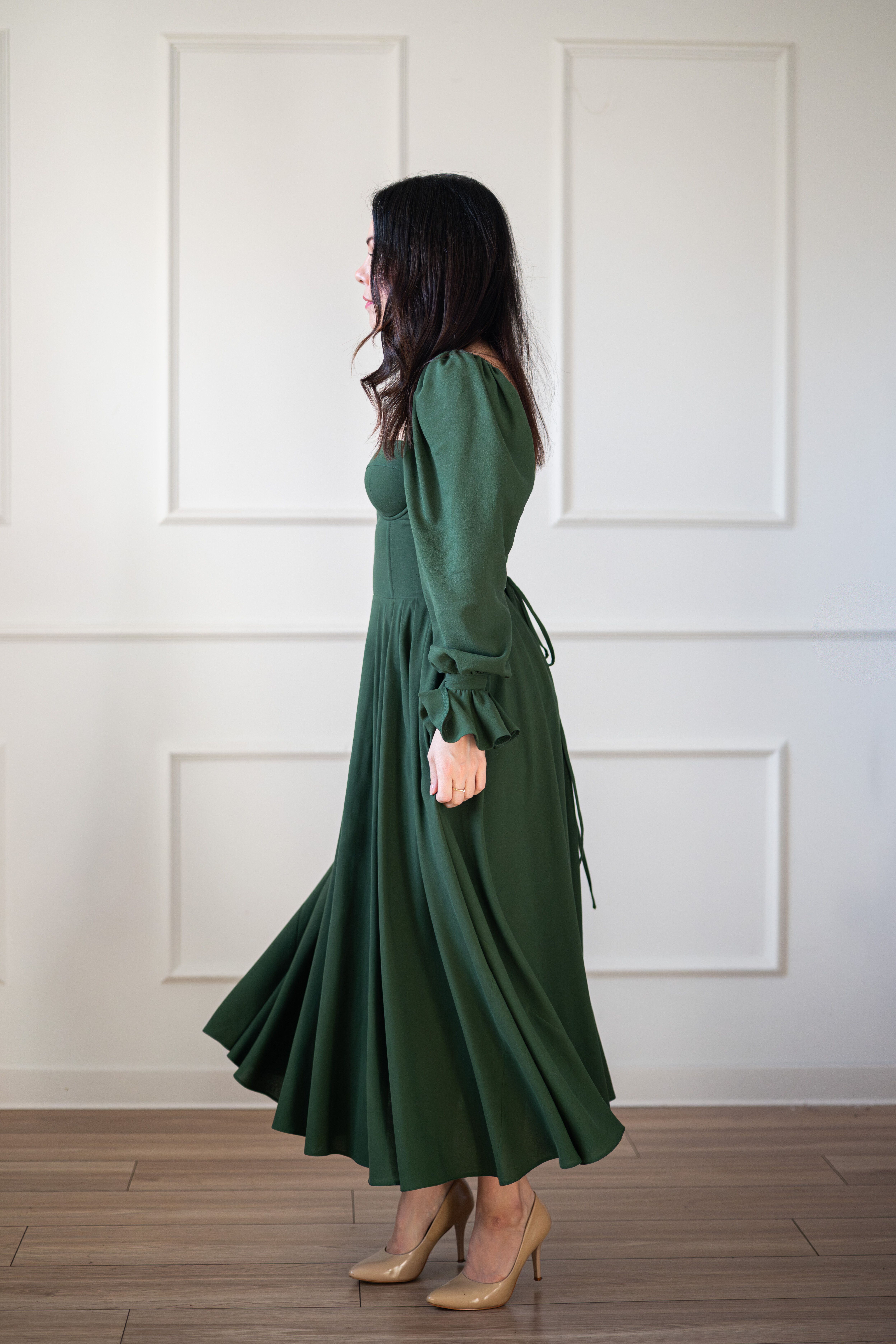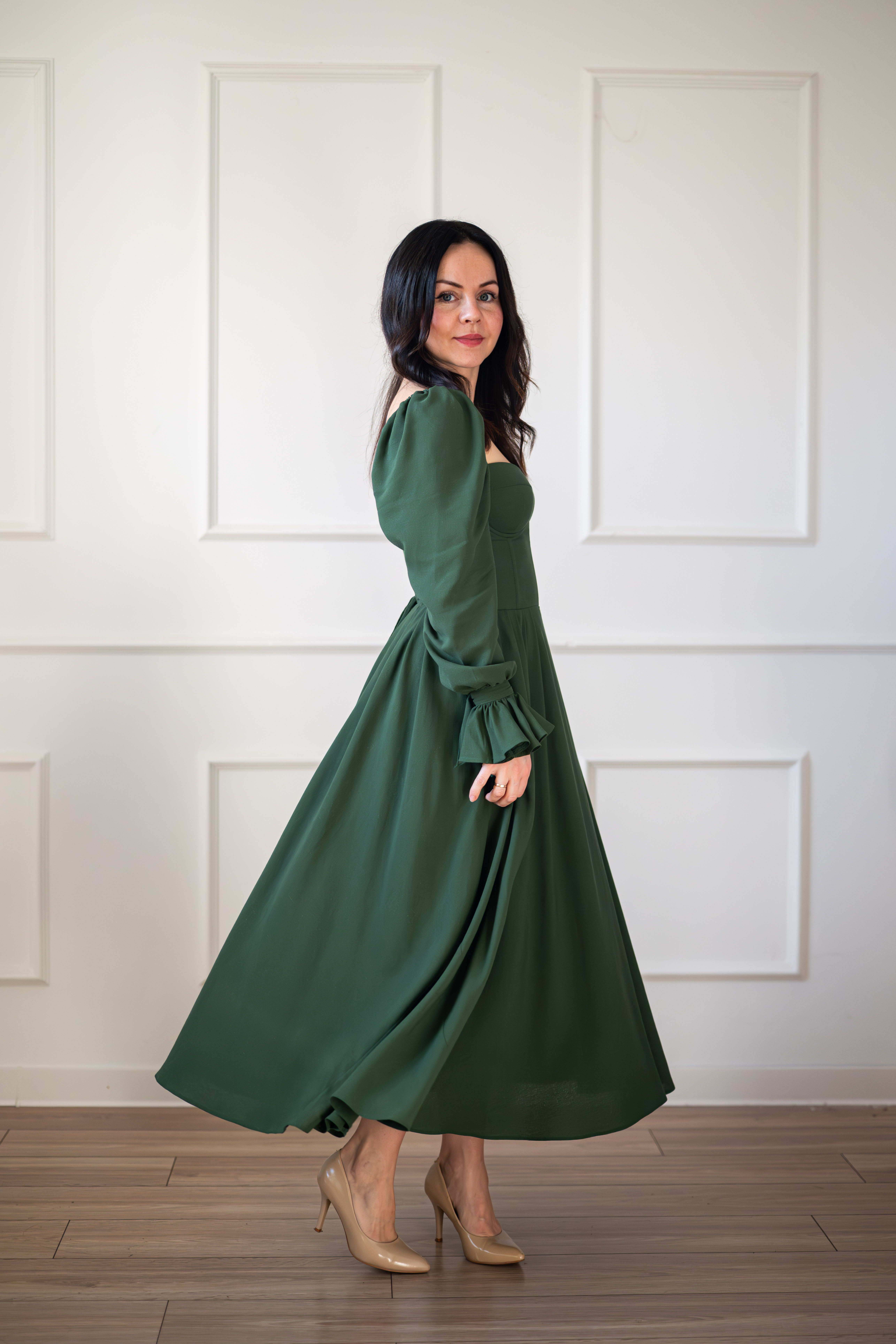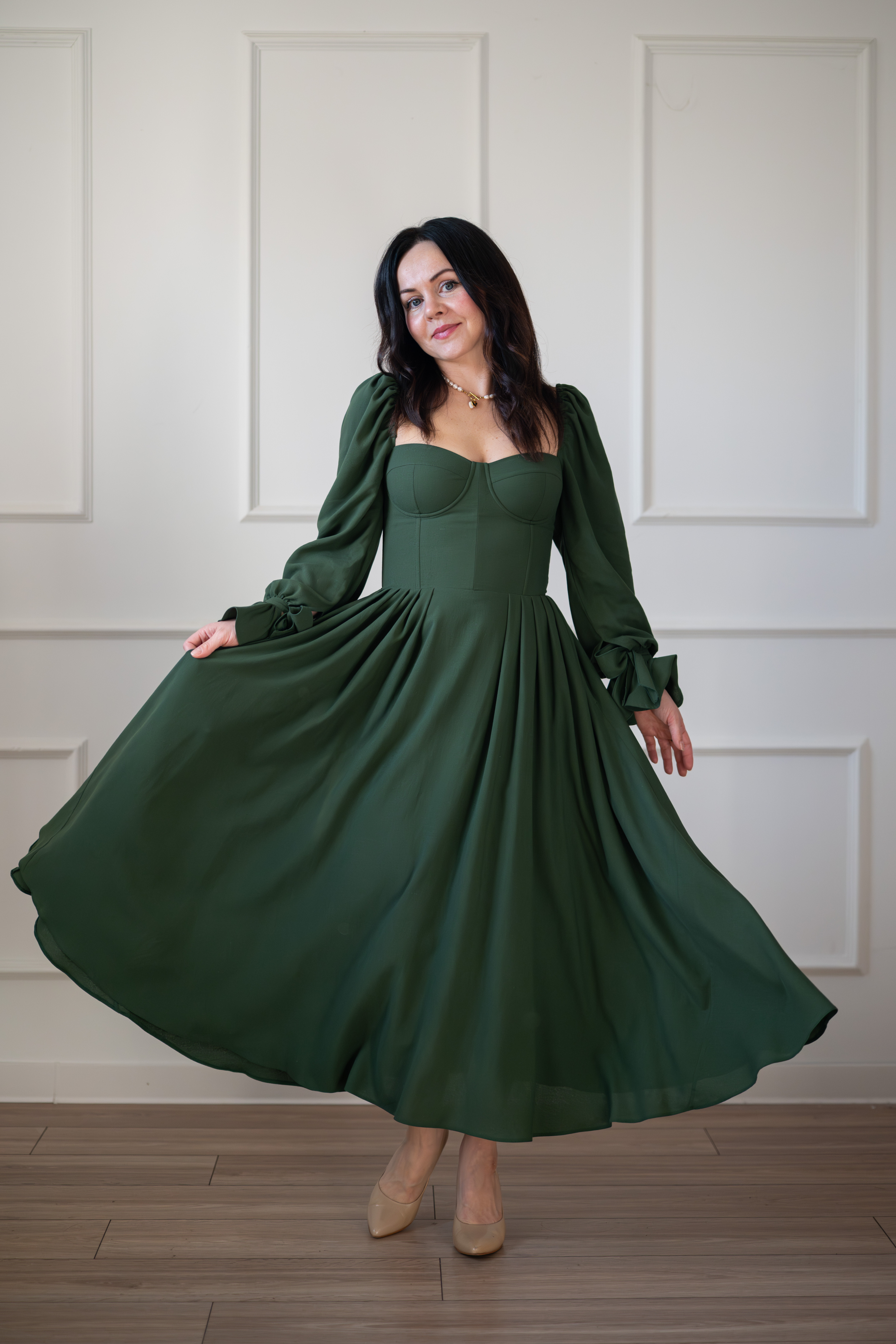 Sukienka gorsetowa z usztywnianymi miseczkami, dzięki którym nie ma potrzeby zakładania stanika. Góra została usztywniona fiszbinami, które pięknie modelują talię. Tył sukienki posiada wiązanie pozwalające na regulację oraz indywidualne dopasowanie, natomiast spódnica zapinana jest na zamek kryty. Sukienka Eliza posiada rękawy wykończone u góry gumką dzięki, której nie spadają z ramion oraz kieszenie w szwach bocznych. Dodatkowo w zestawie dołączona jest wkładka pod wiązanie z tyłu aby zamaskować plecy.