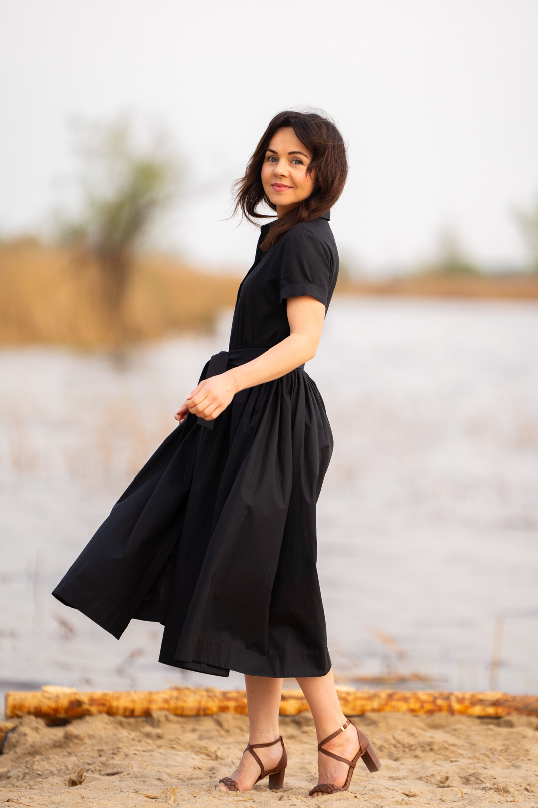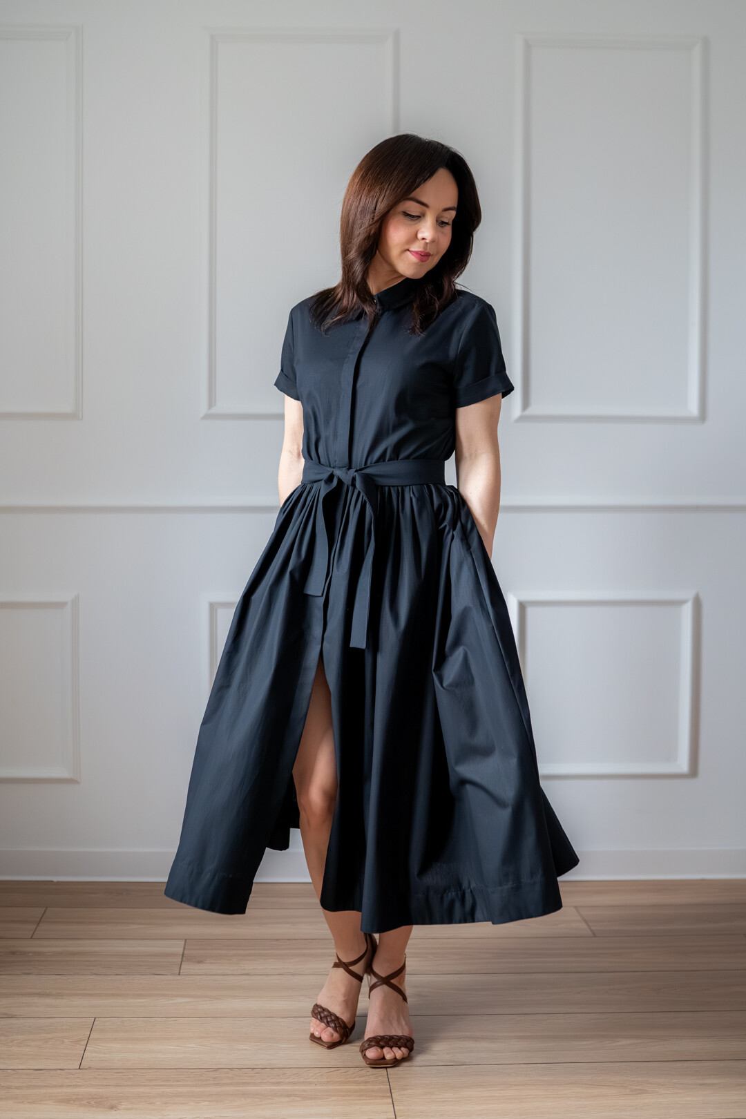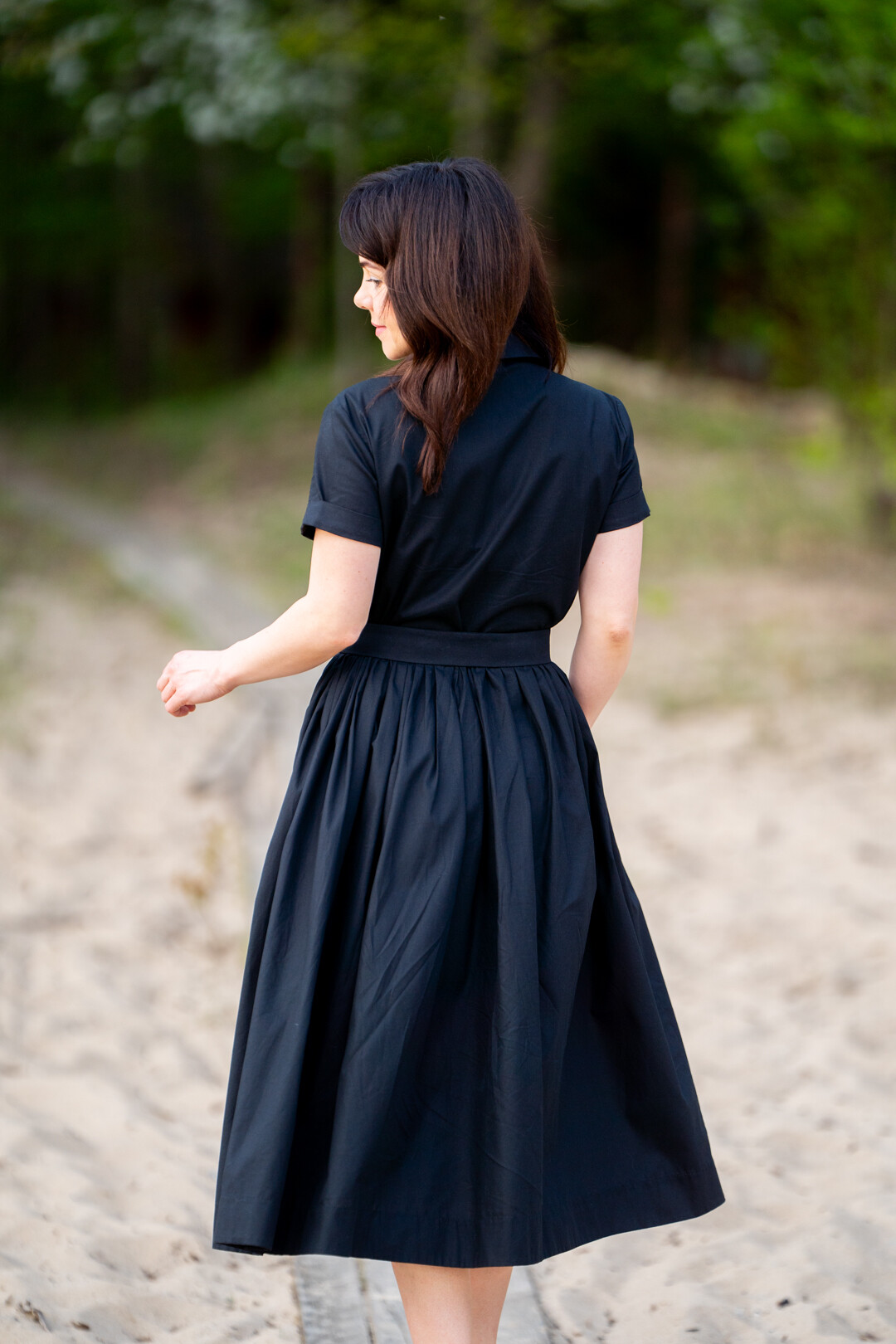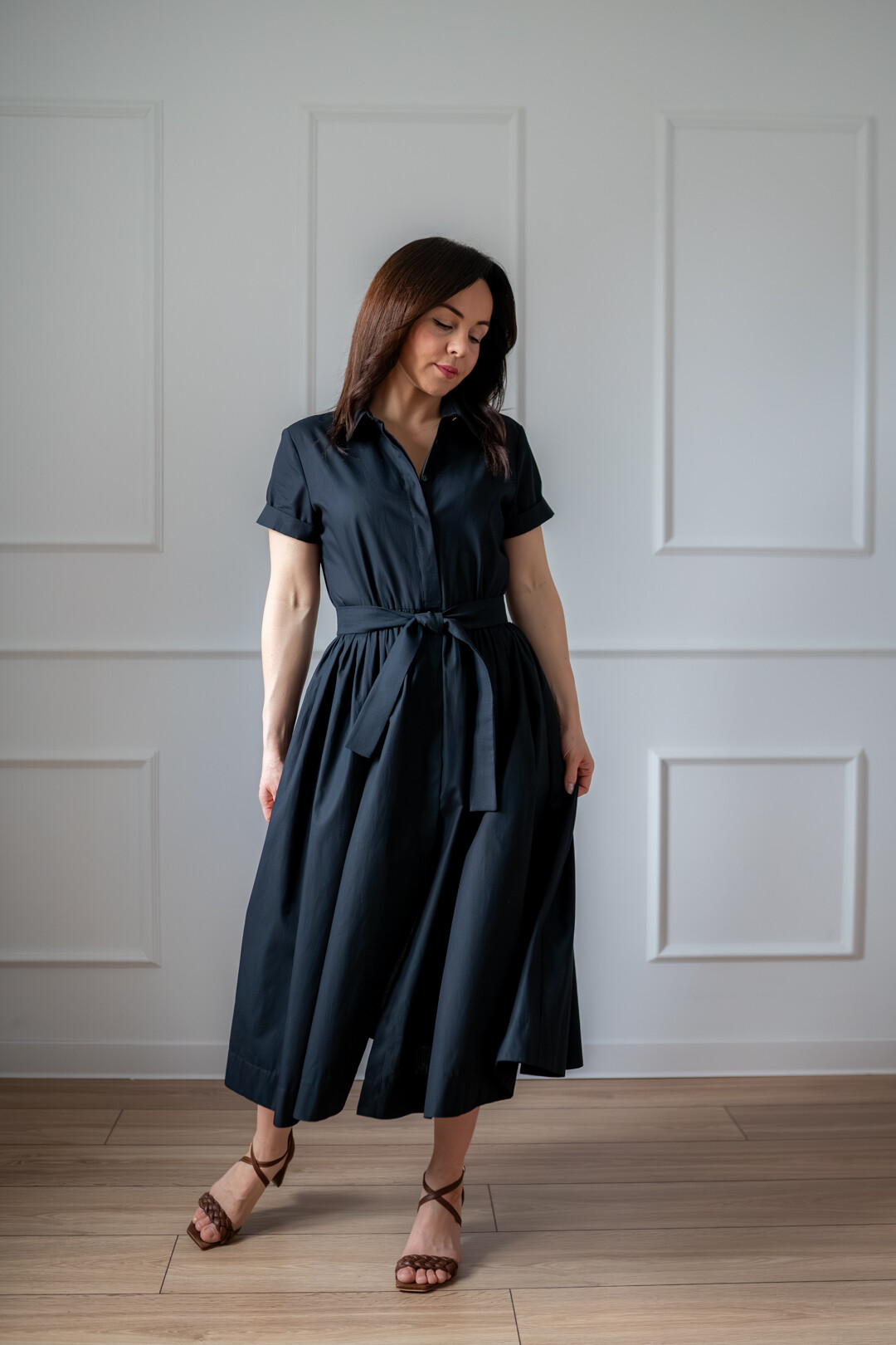 Klasyczna sukienka koszulowa pasująca praktycznie na każdą okazję. Można ją nosić na wiele sposobów, ponieważ świetnie prezentuje się zarówno ze szpilkami jak i z butami sportowymi. Jest odcięta w pasie i posiada obficie marszczony dół, który jest wykończony szerokim obłożeniem. Sukienka posiada kieszenie w szwach bocznych i jest zapinana z przodu na guziki, które zostały schowane pod listwą kryjącą.
