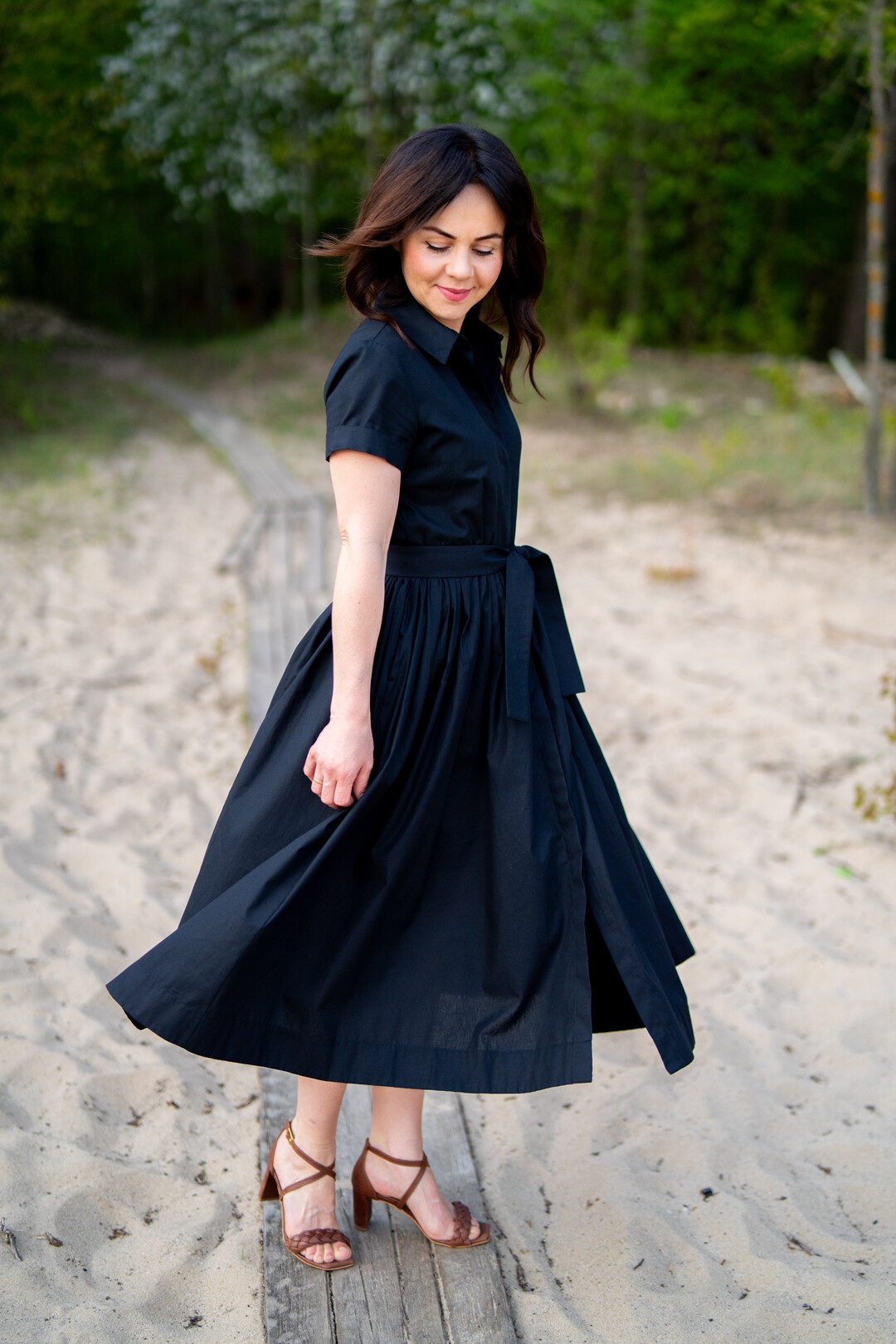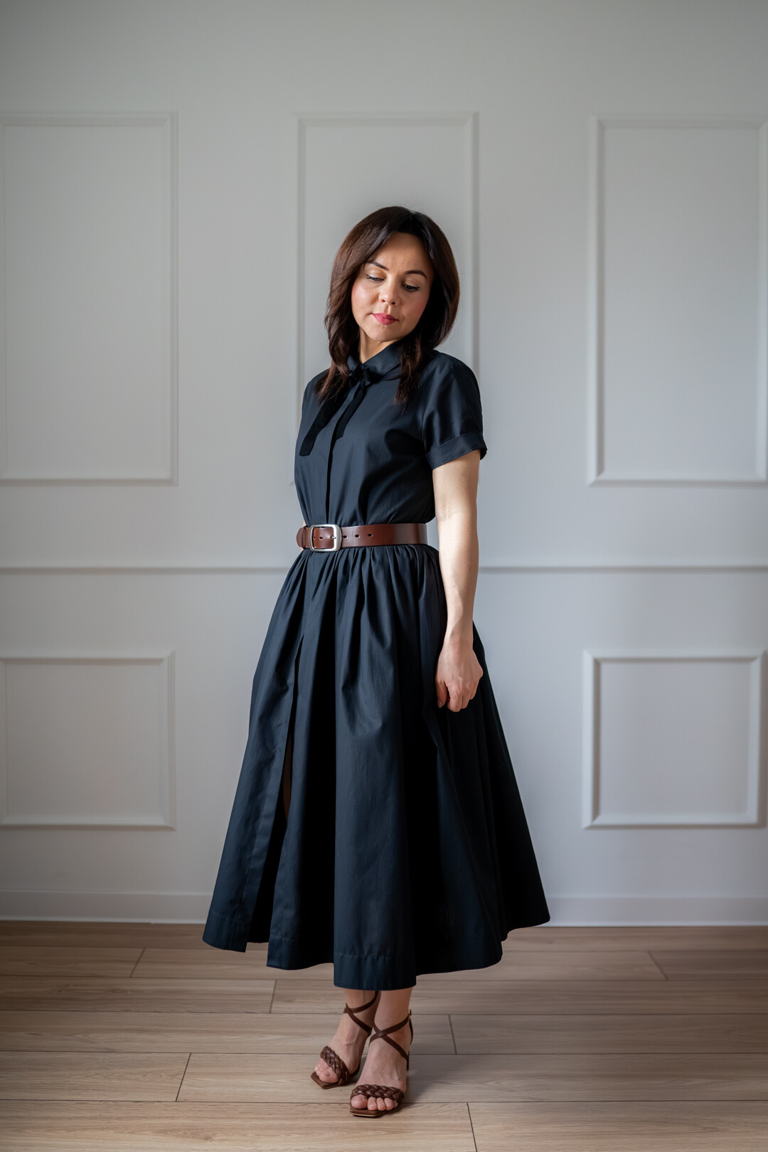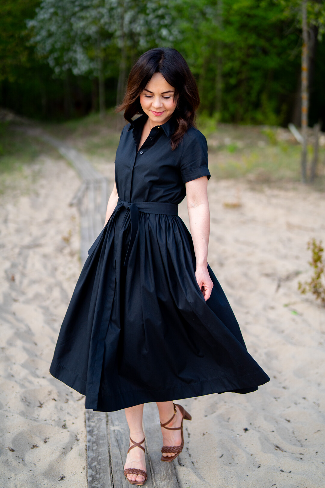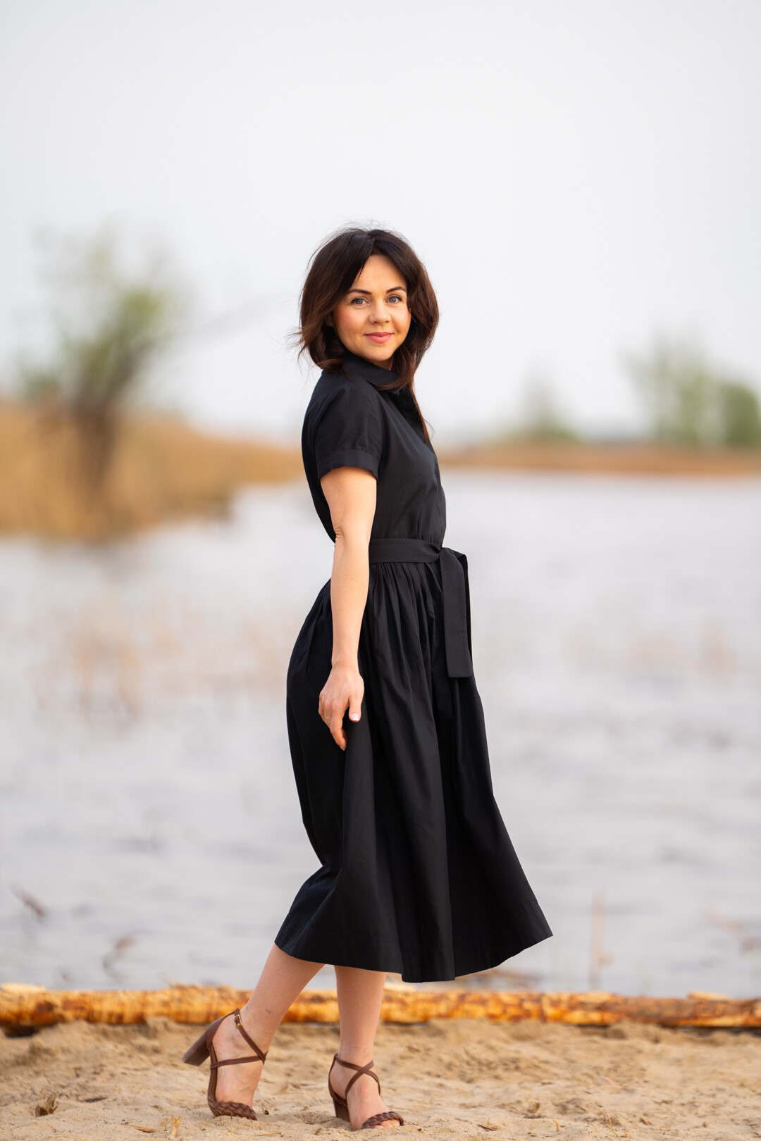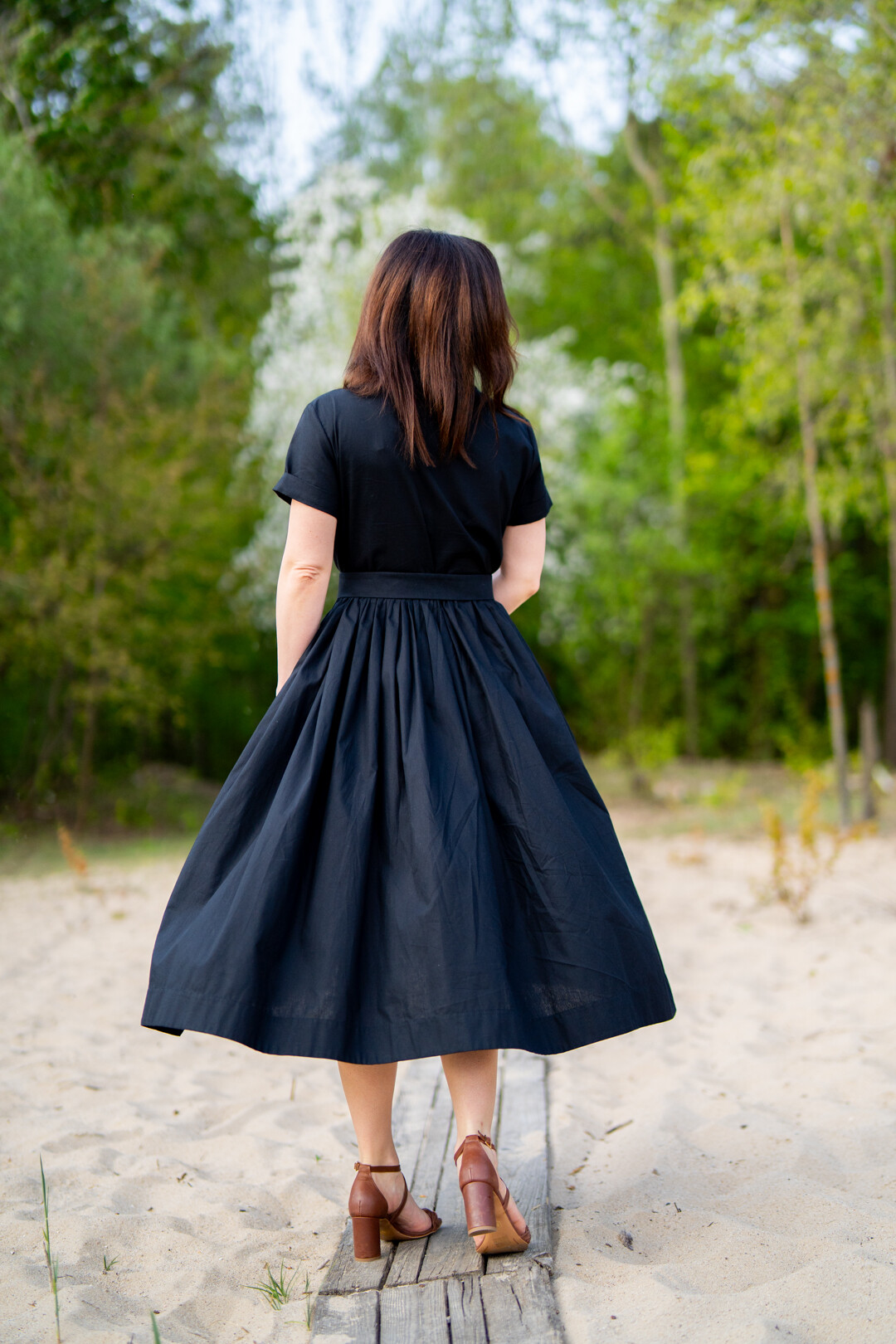 Klasyczna sukienka koszulowa pasująca praktycznie na każdą okazję. Można ją nosić na wiele sposobów, ponieważ świetnie prezentuje się zarówno ze szpilkami jak i z butami sportowymi. Jest odcięta w pasie i posiada obficie marszczony dół, który jest wykończony szerokim obłożeniem. Sukienka posiada kieszenie w szwach bocznych i jest zapinana z przodu na guziki, które zostały schowane pod listwą kryjącą.