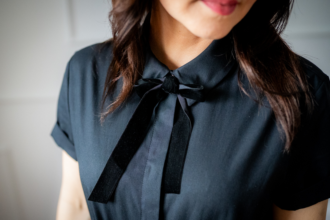 Do sukienki w zestawie jest dołączony pasek oraz welurowa wstążka do związana pod szyją.
