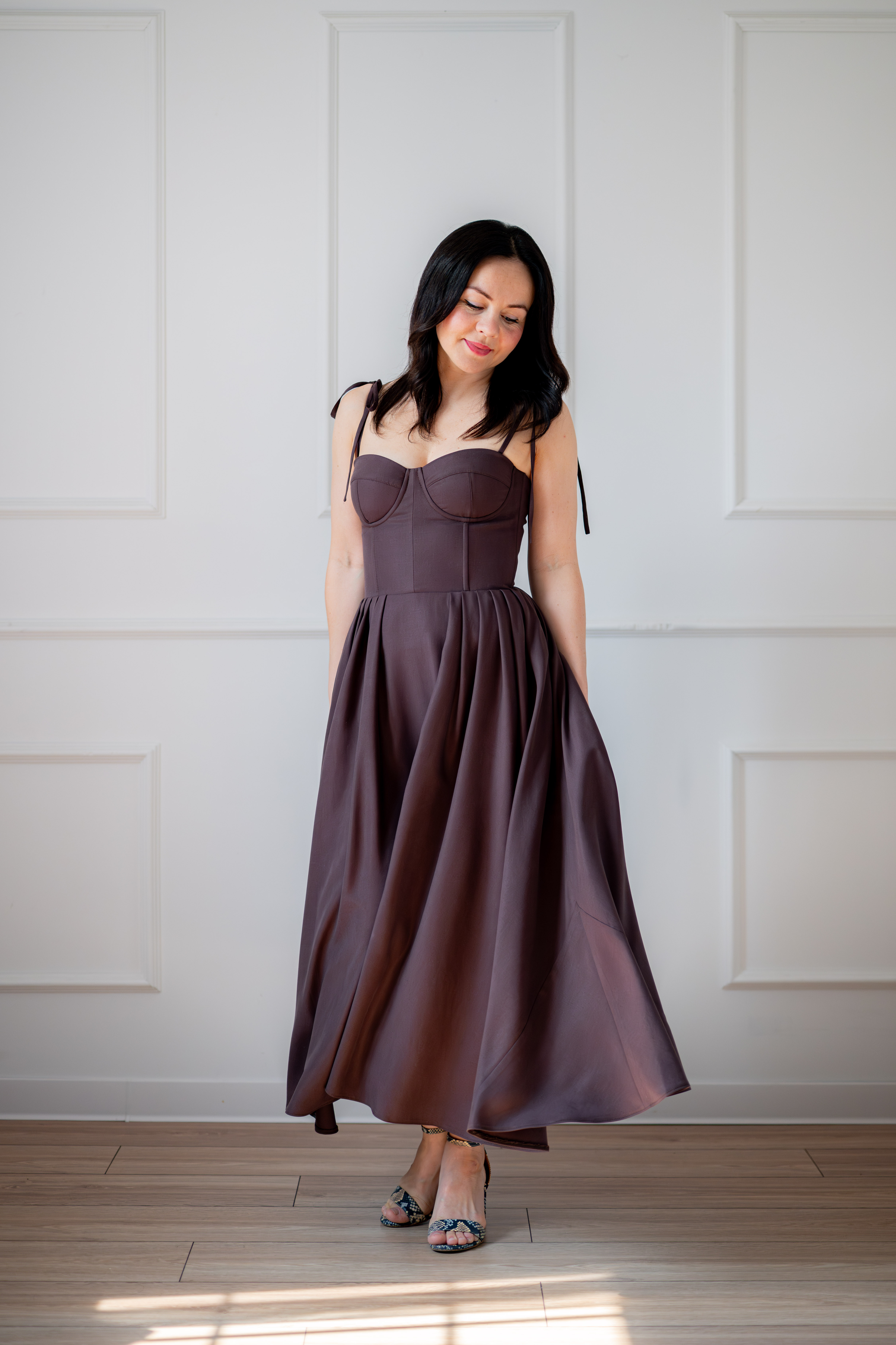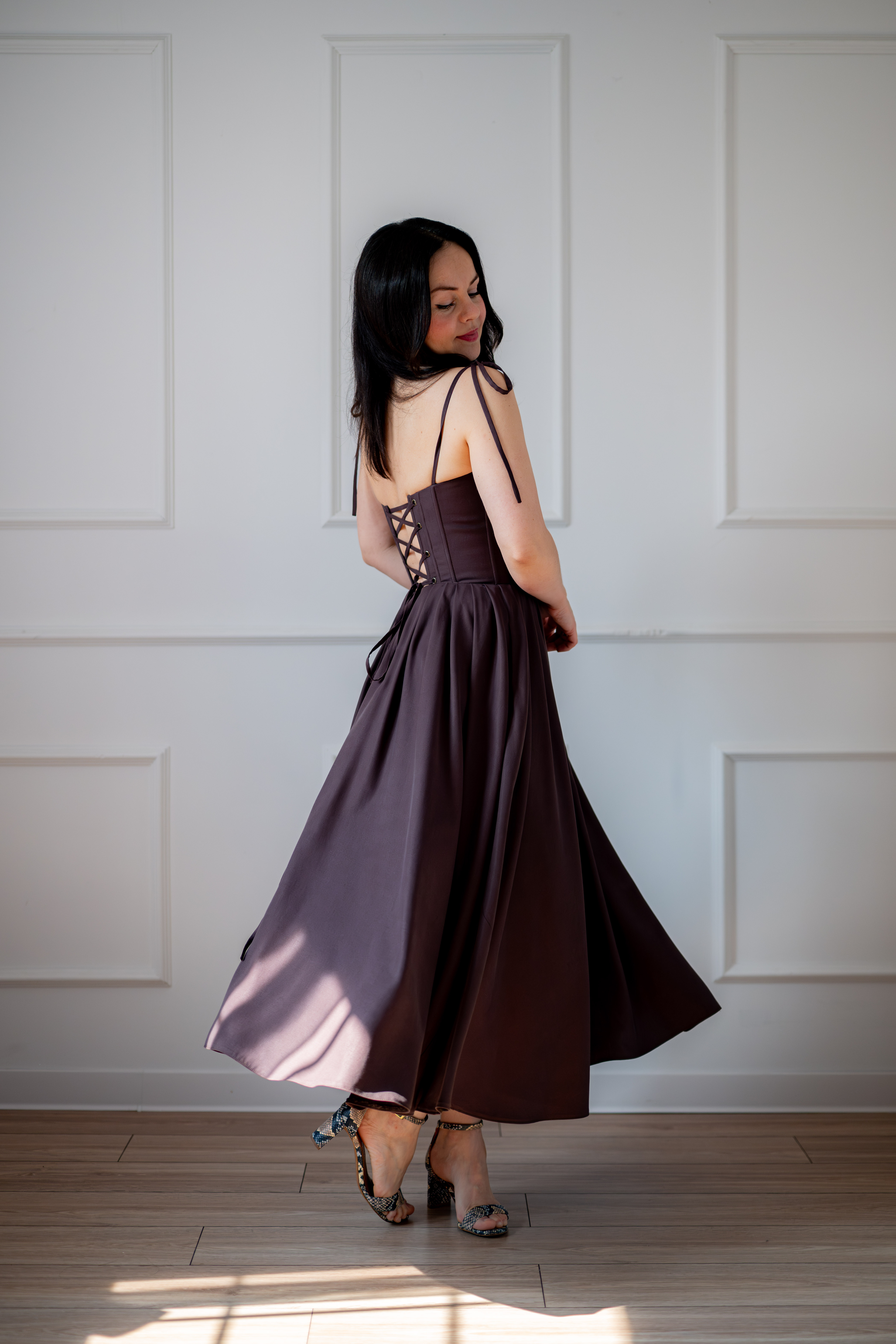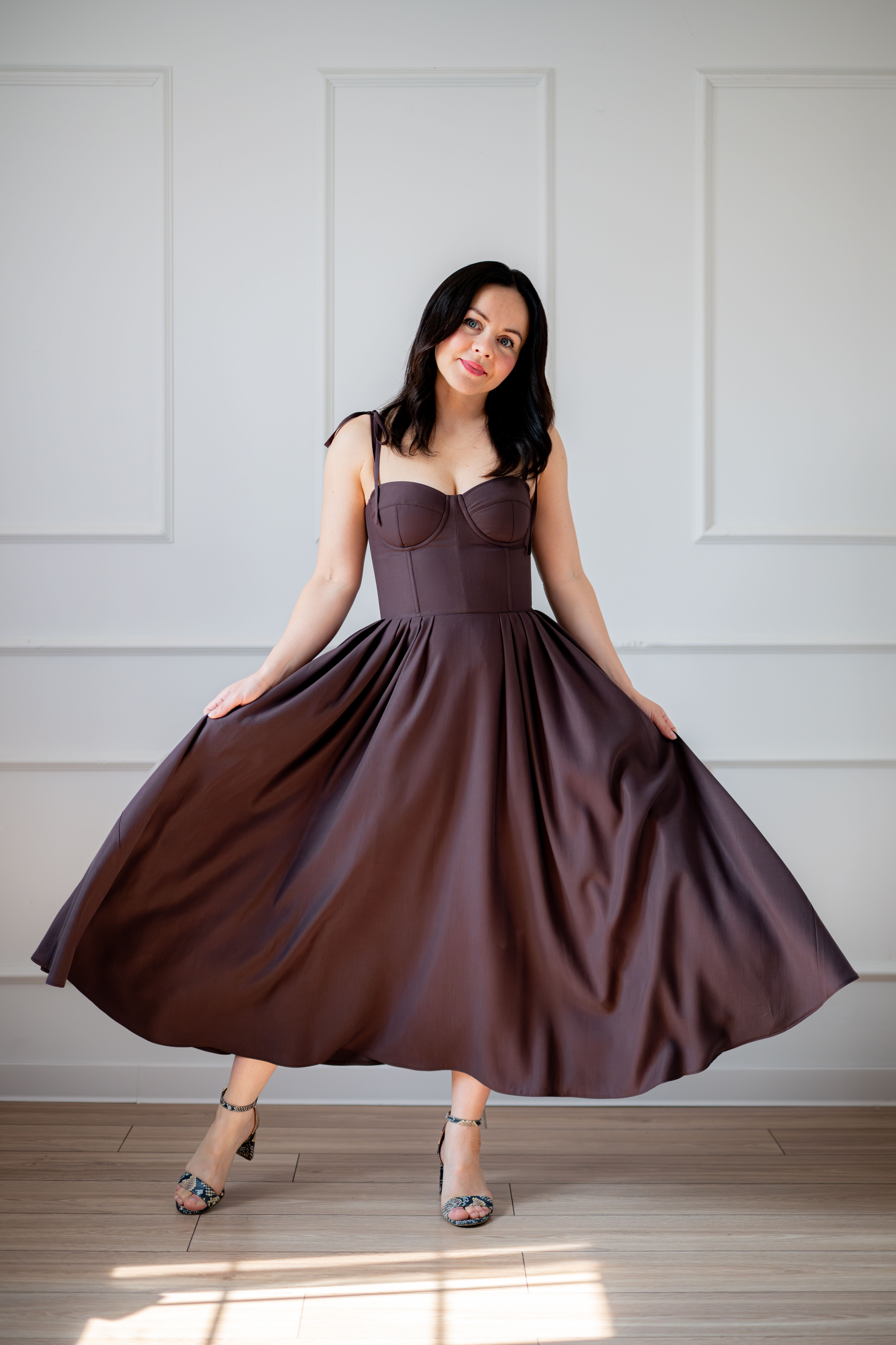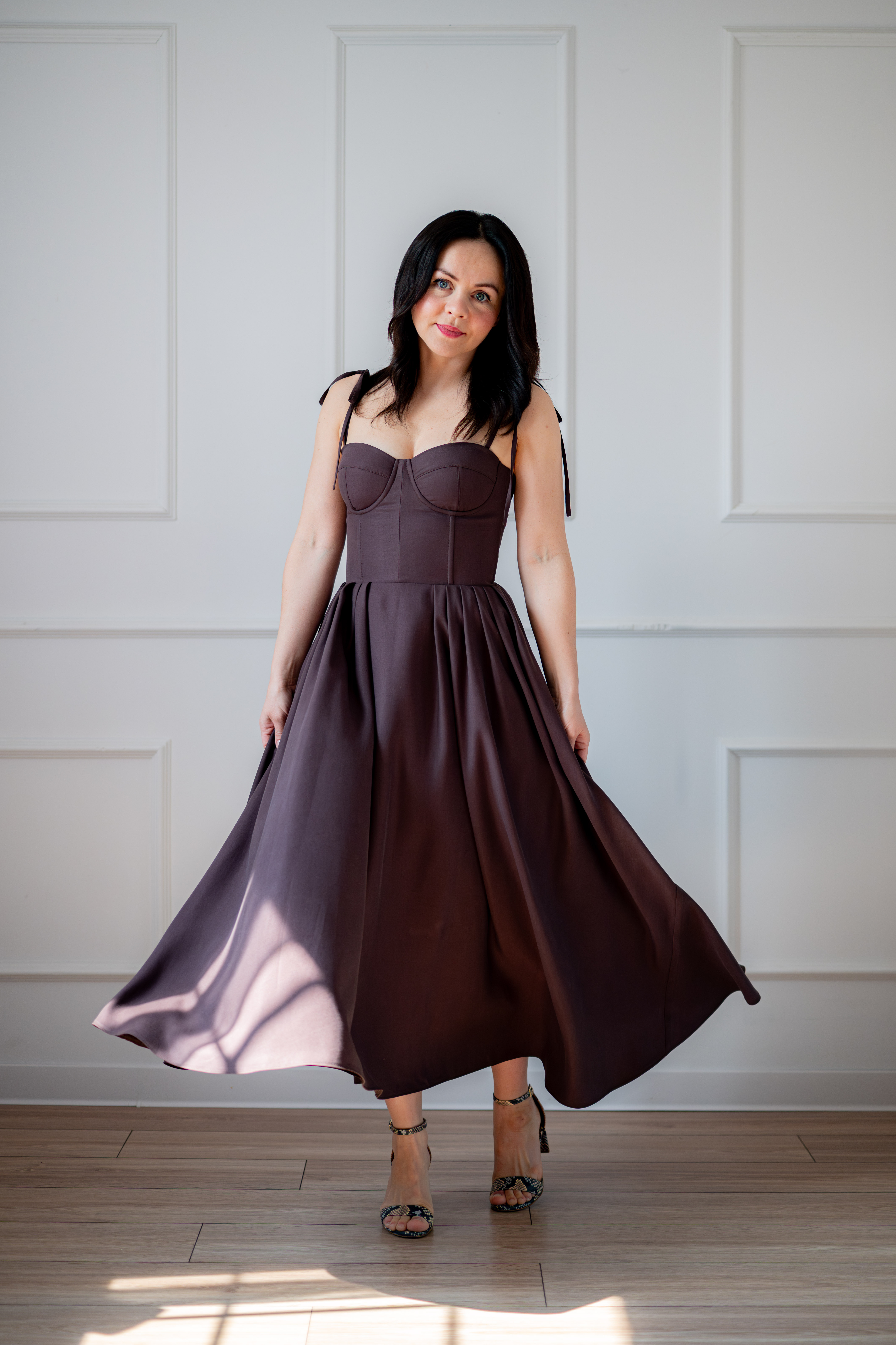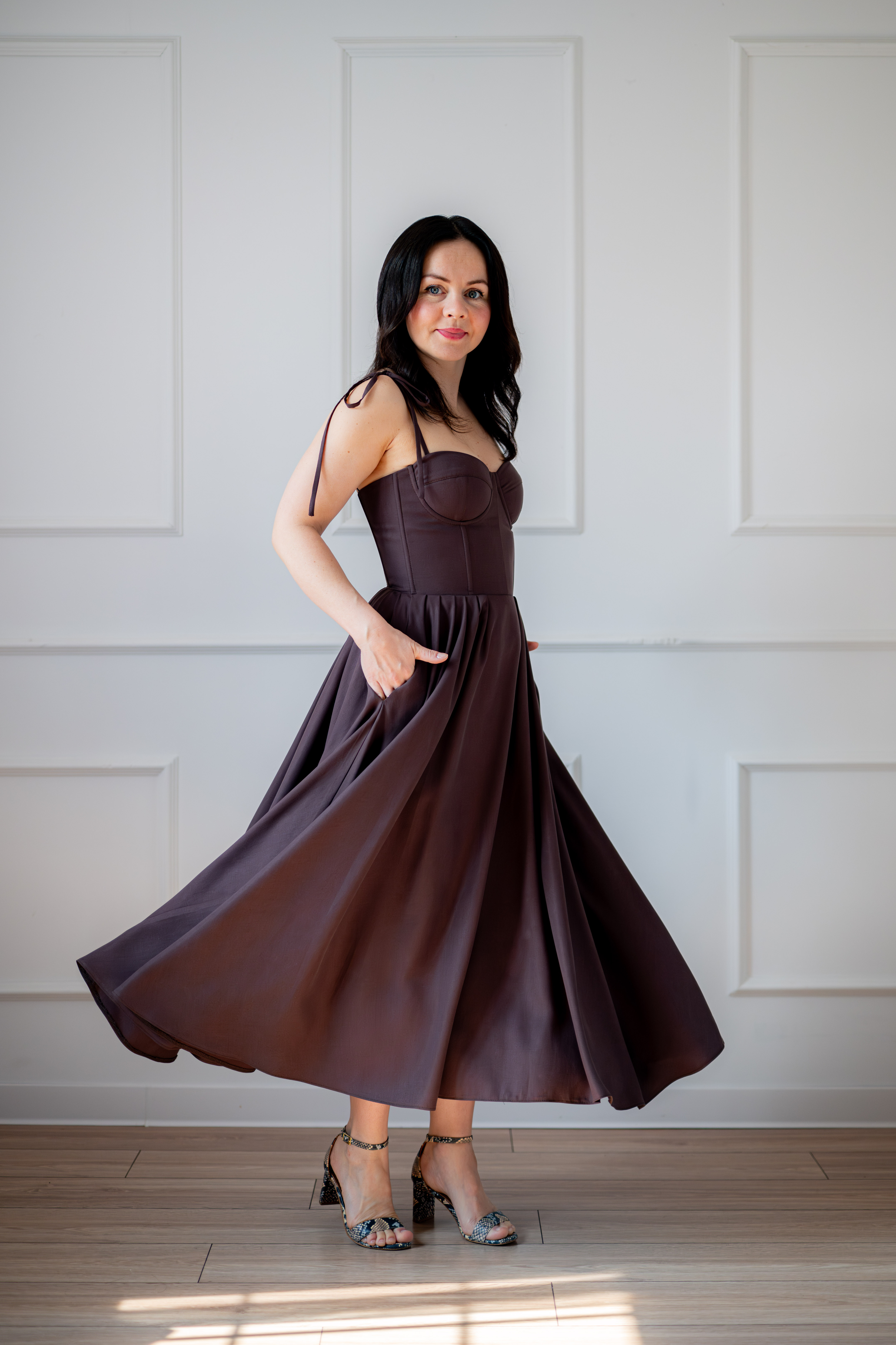 Sukienka gorsetowa z usztywnianymi miseczkami, dzięki którym nie ma potrzeby zakładania stanika. Góra została usztywniona fiszbinami, które pięknie modelują talię. Tył sukienki posiada wiązanie pozwalające na regulację oraz indywidualne dopasowanie, natomiast spódnica zapinana jest na zamek kryty. Sukienka Madlen posiada wiązane ramiączka oraz kieszenie w szwach bocznych. Dodatkowo w zestawie dołączona jest wkładka pod wiązanie z tyłu aby zamaskować plecy.