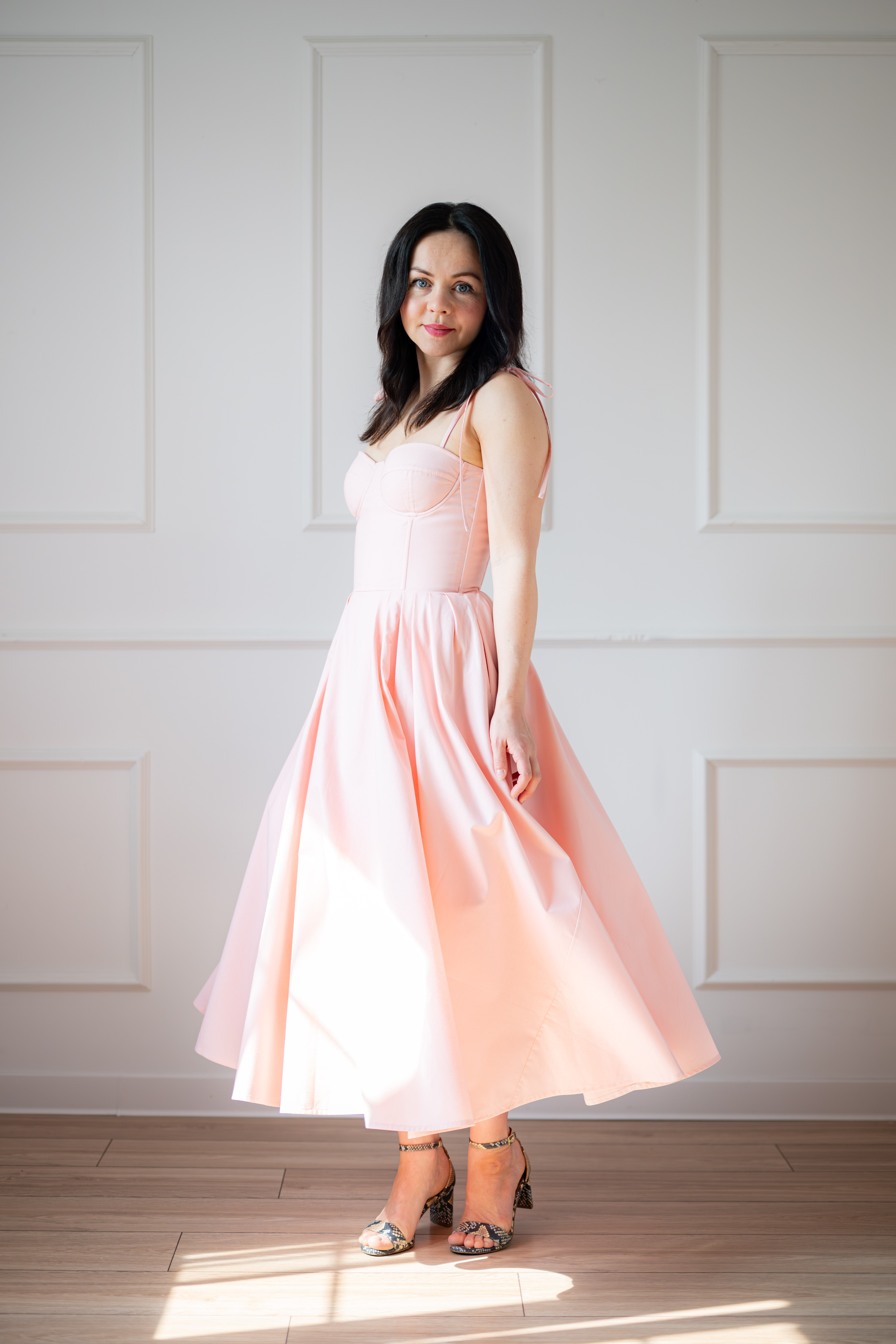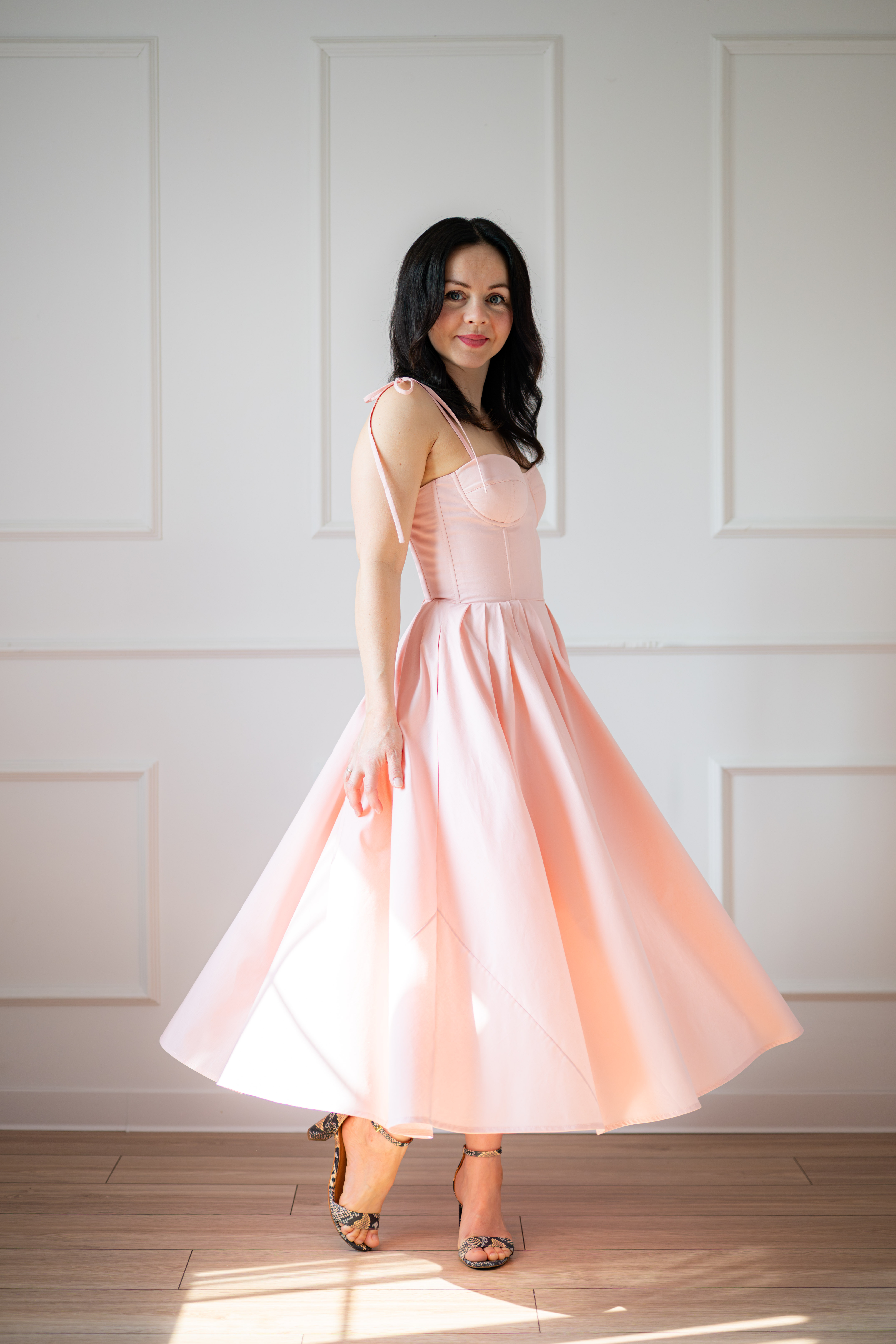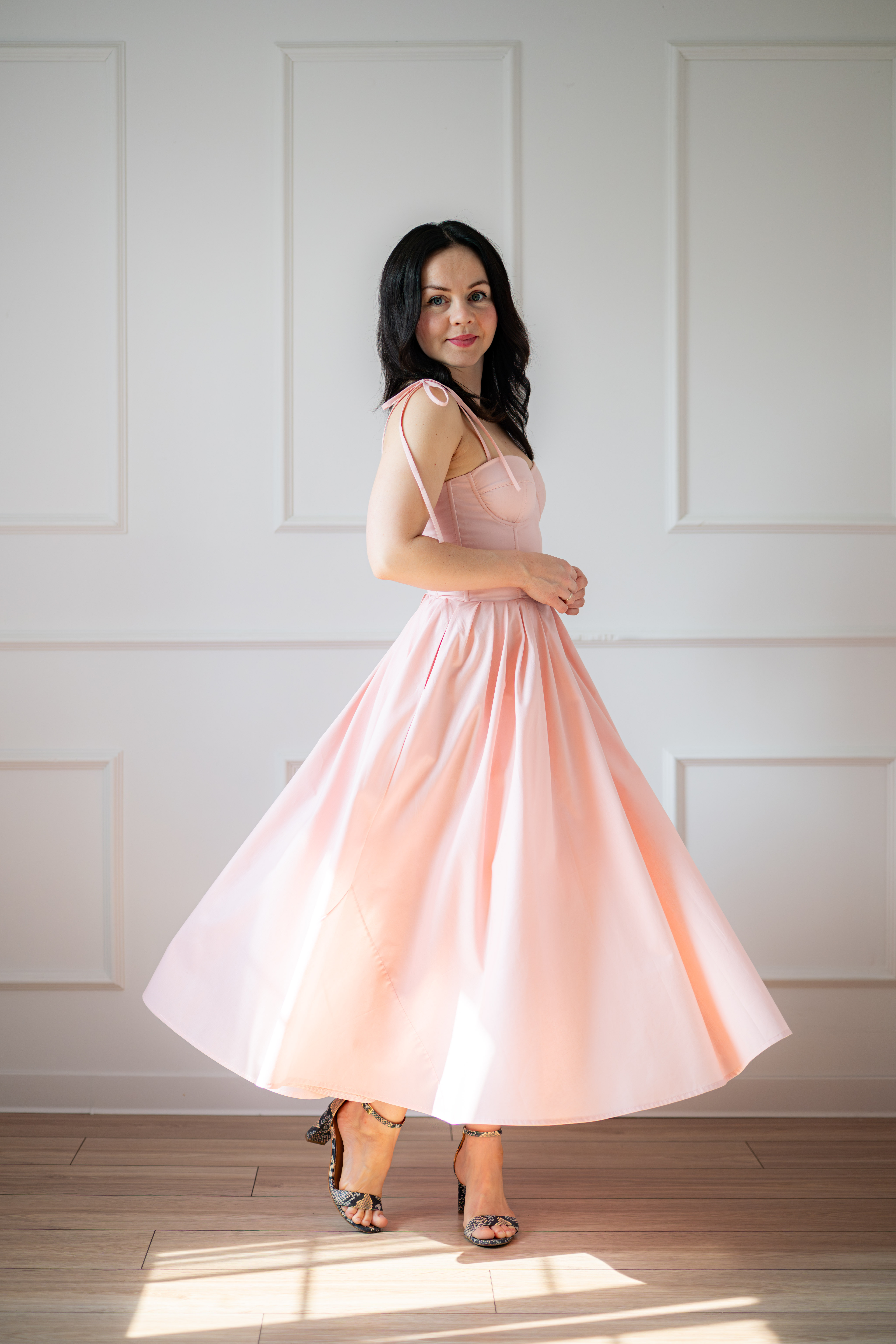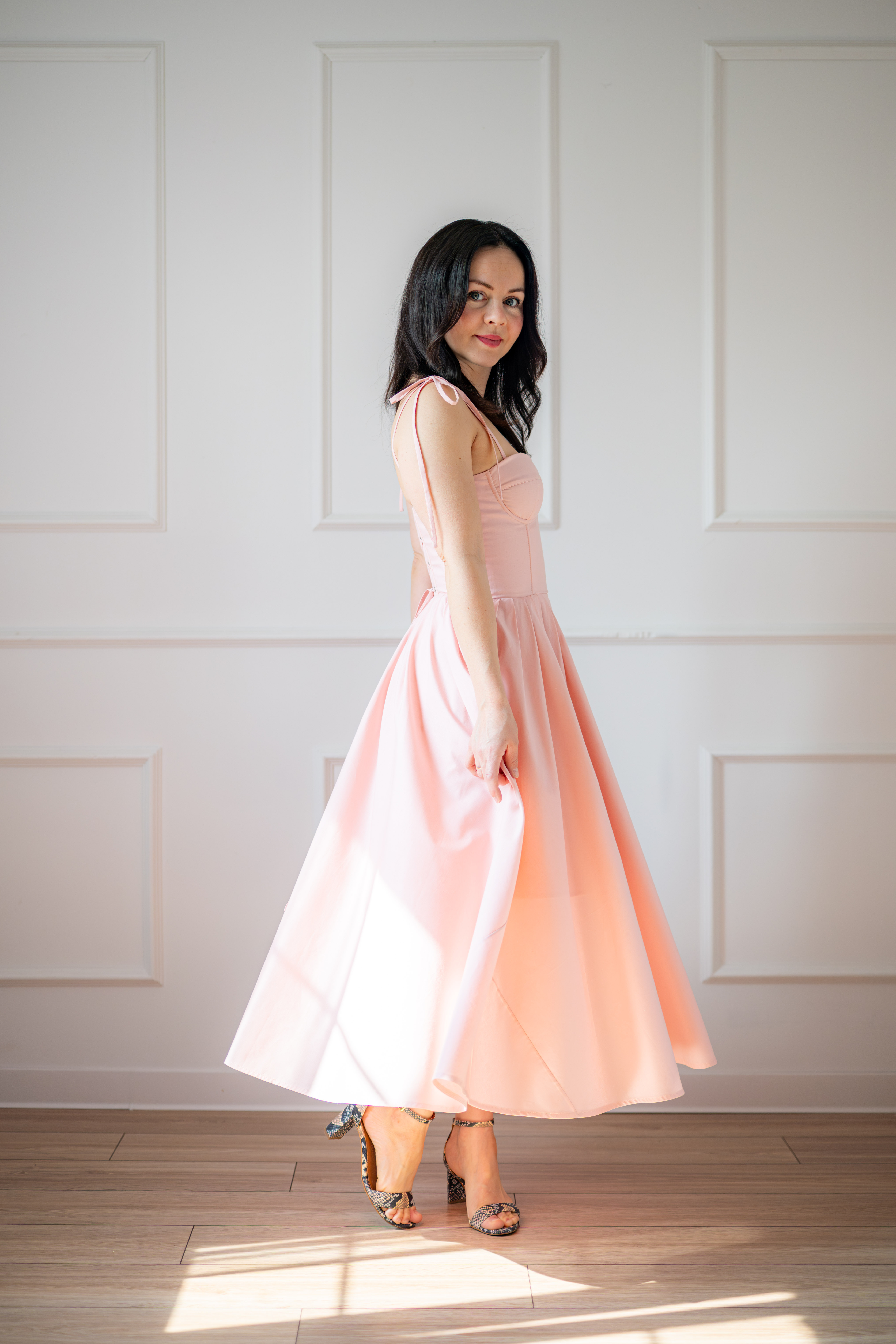 Sukienka gorsetowa z usztywnianymi miseczkami, dzięki którym nie ma potrzeby zakładania stanika. Góra została usztywniona fiszbinami, które pięknie modelują talię. Tył sukienki posiada wiązanie pozwalające na regulację oraz indywidualne dopasowanie, natomiast spódnica zapinana jest na zamek kryty. Sukienka Madlen posiada wiązane ramiączka oraz kieszenie w szwach bocznych. Dodatkowo w zestawie dołączona jest wkładka pod wiązanie z tyłu aby zamaskować plecy.
