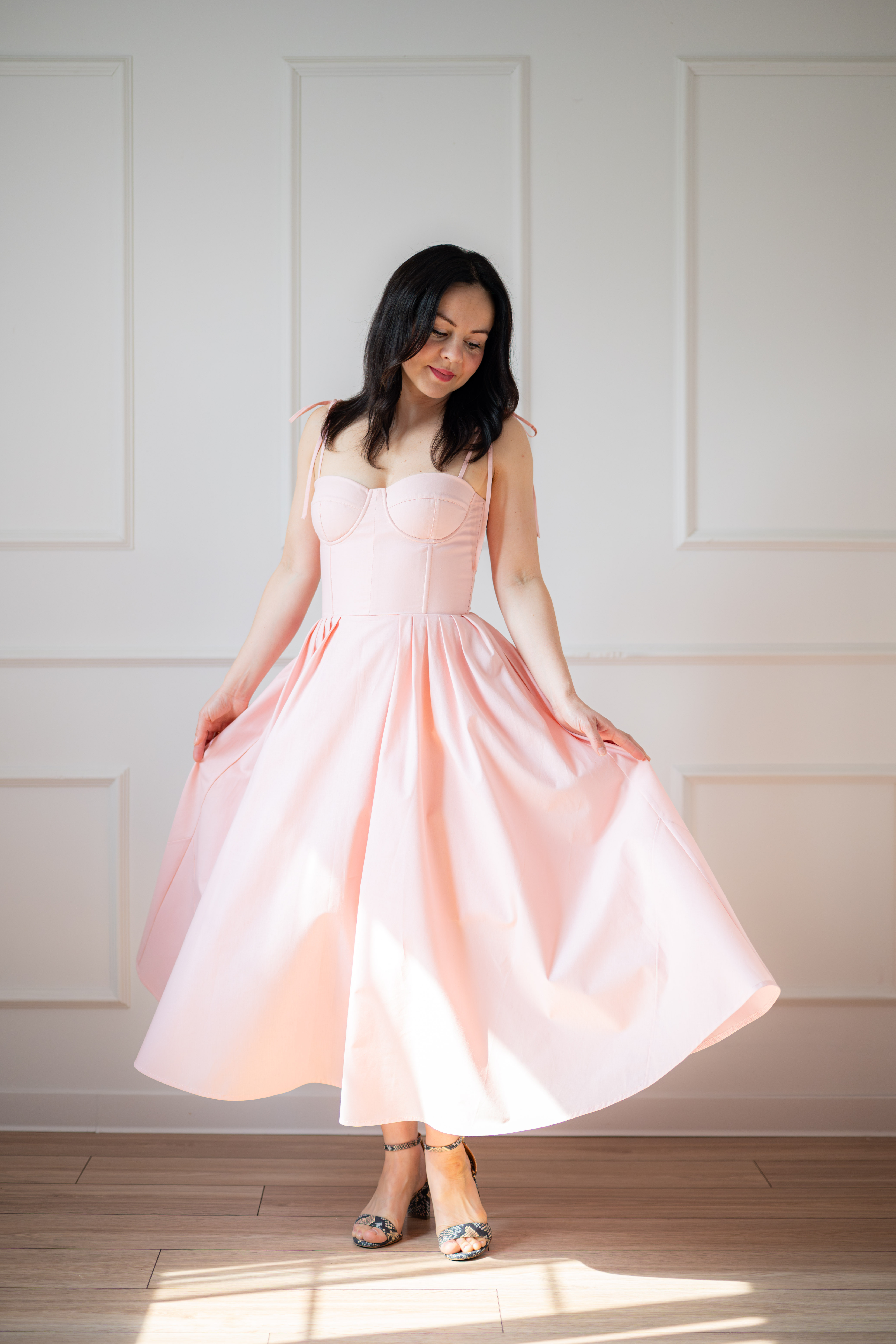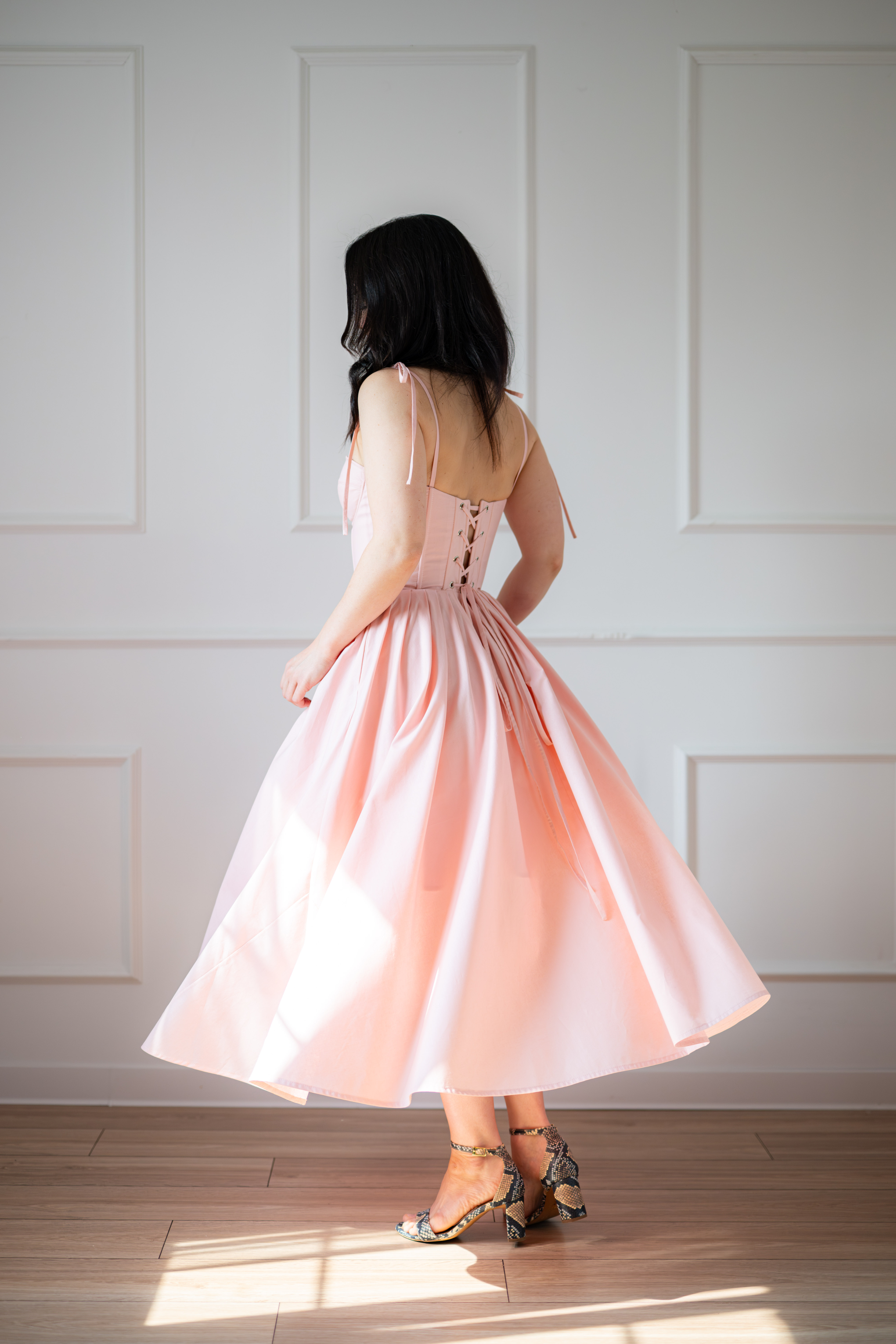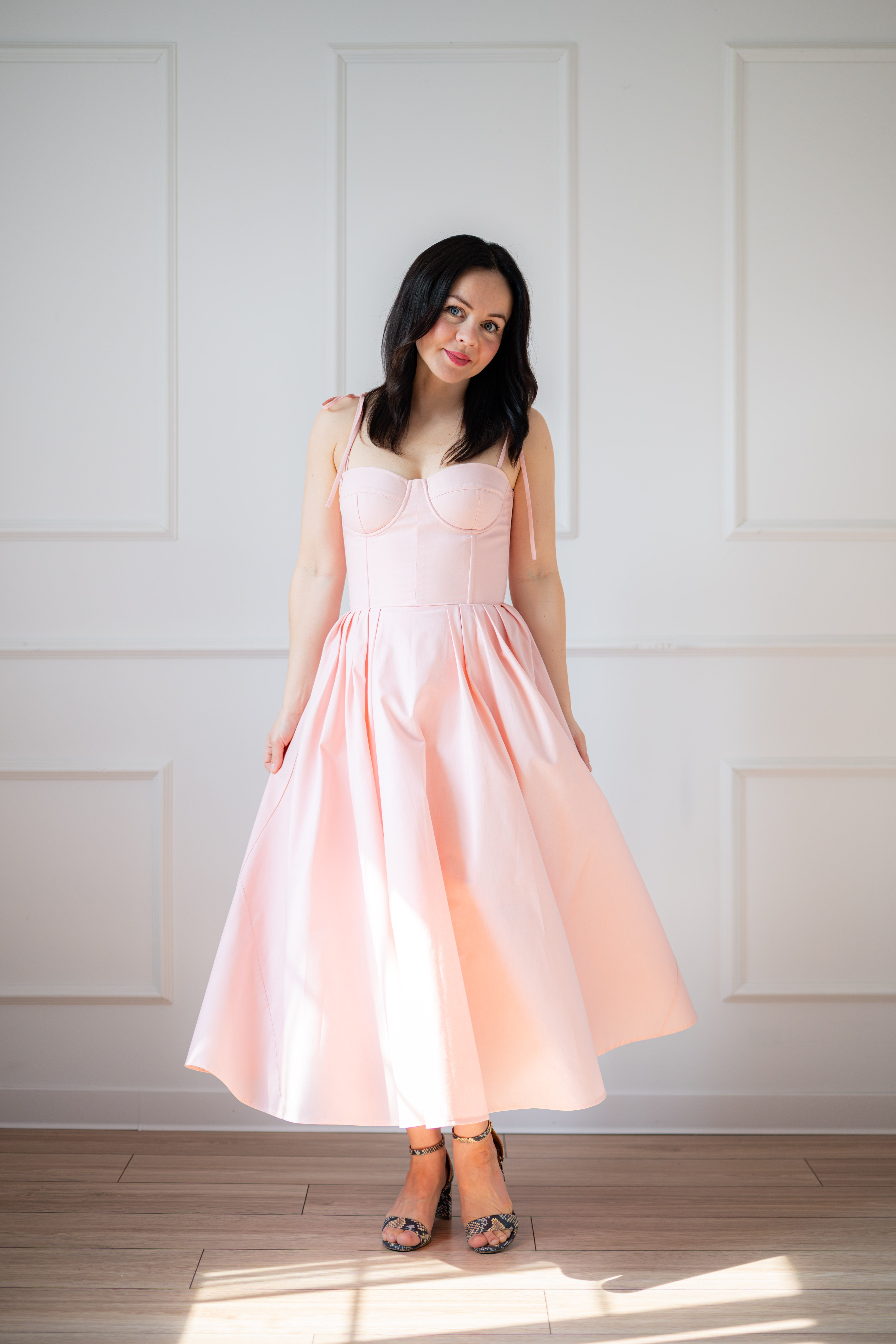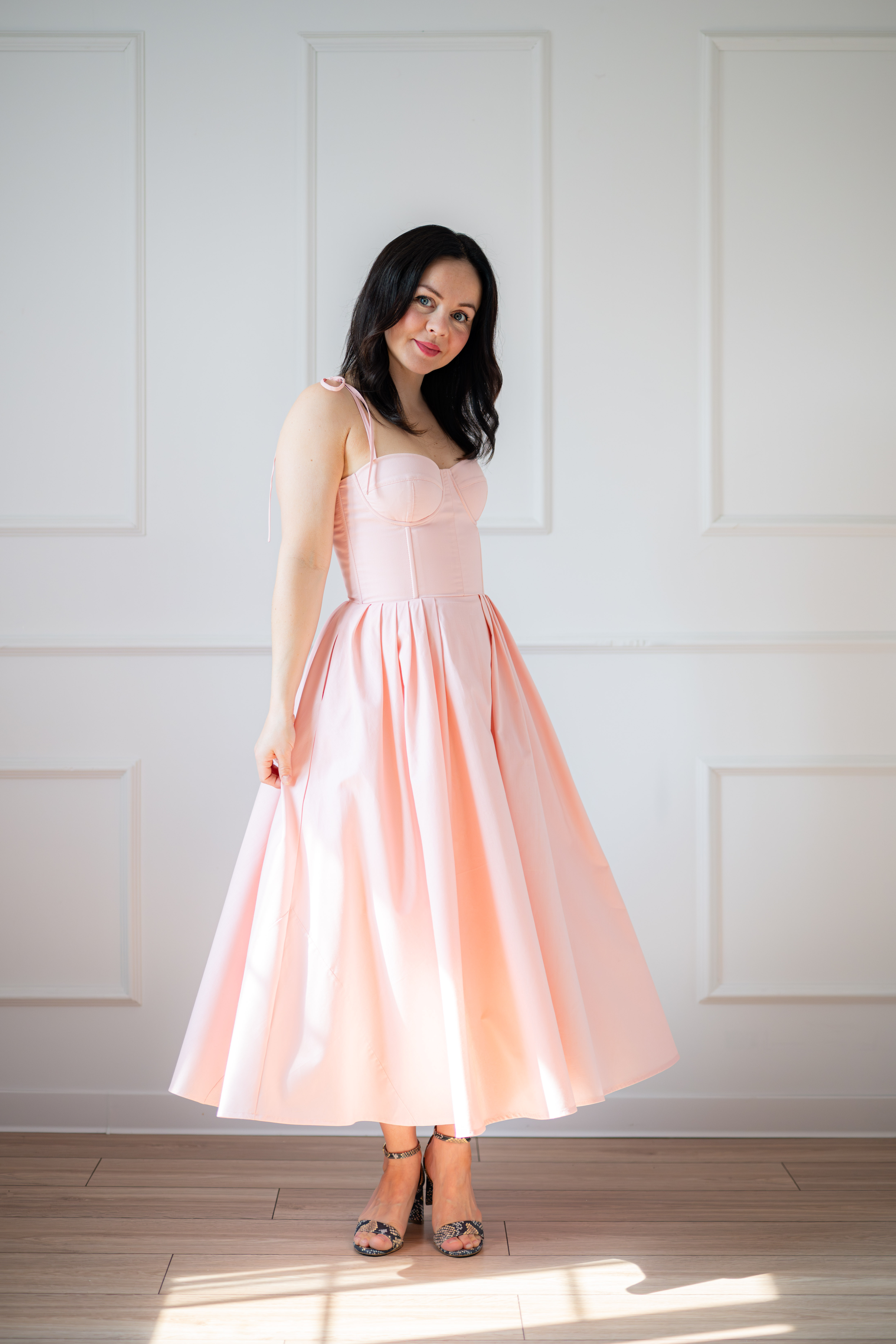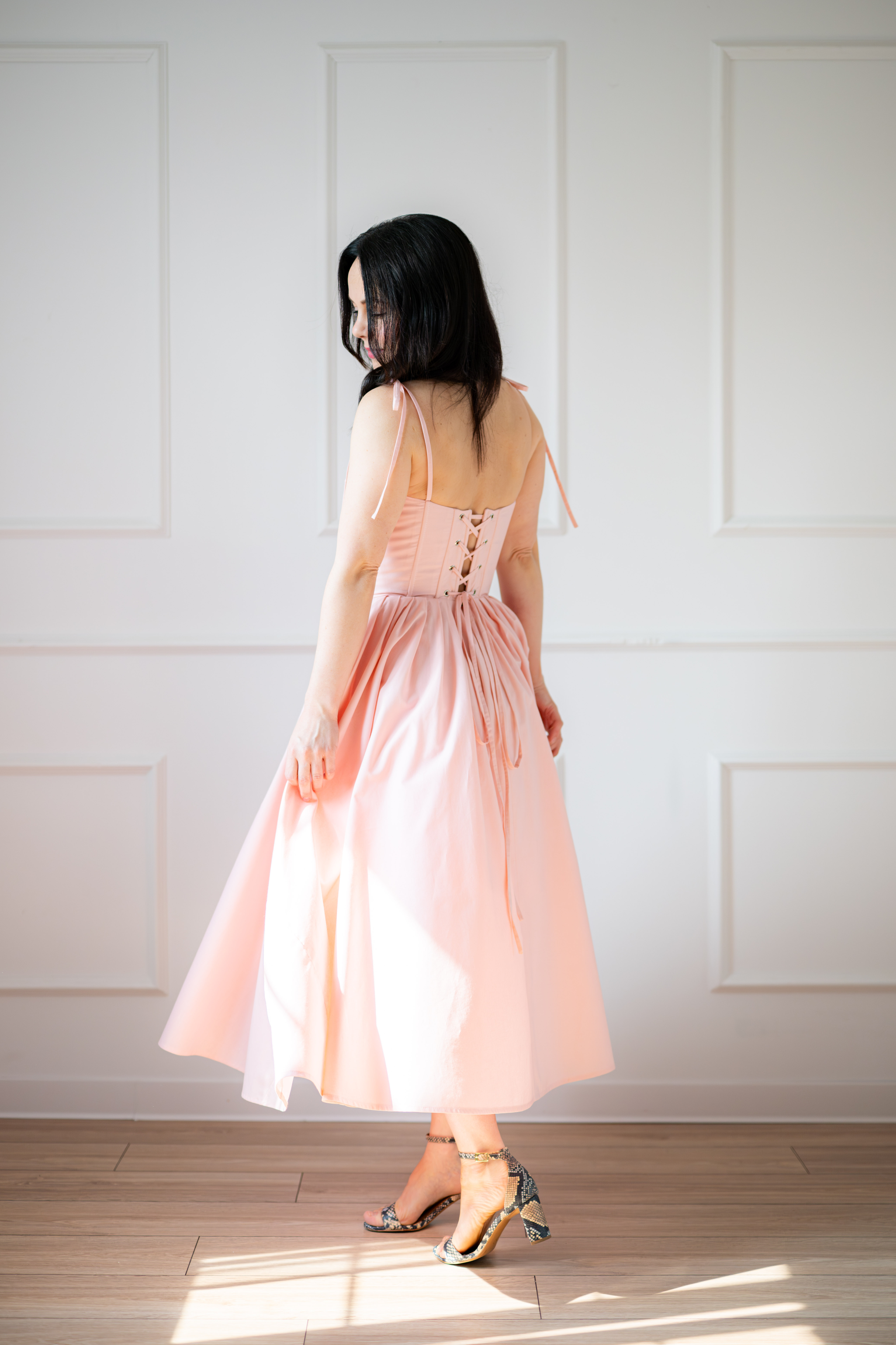 Sukienka gorsetowa z usztywnianymi miseczkami, dzięki którym nie ma potrzeby zakładania stanika. Góra została usztywniona fiszbinami, które pięknie modelują talię. Tył sukienki posiada wiązanie pozwalające na regulację oraz indywidualne dopasowanie, natomiast spódnica zapinana jest na zamek kryty. Sukienka Madlen posiada wiązane ramiączka oraz kieszenie w szwach bocznych. Dodatkowo w zestawie dołączona jest wkładka pod wiązanie z tyłu aby zamaskować plecy.