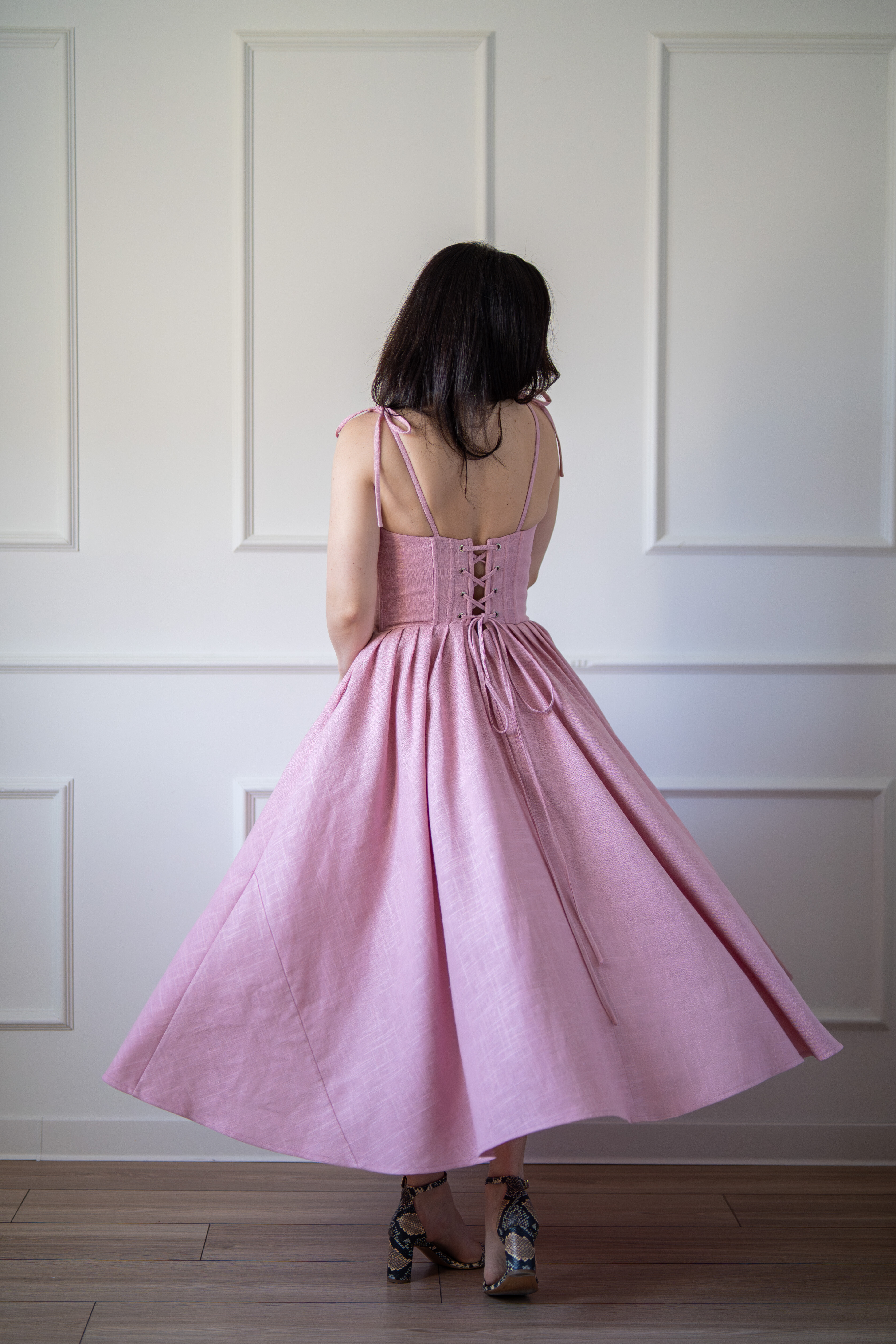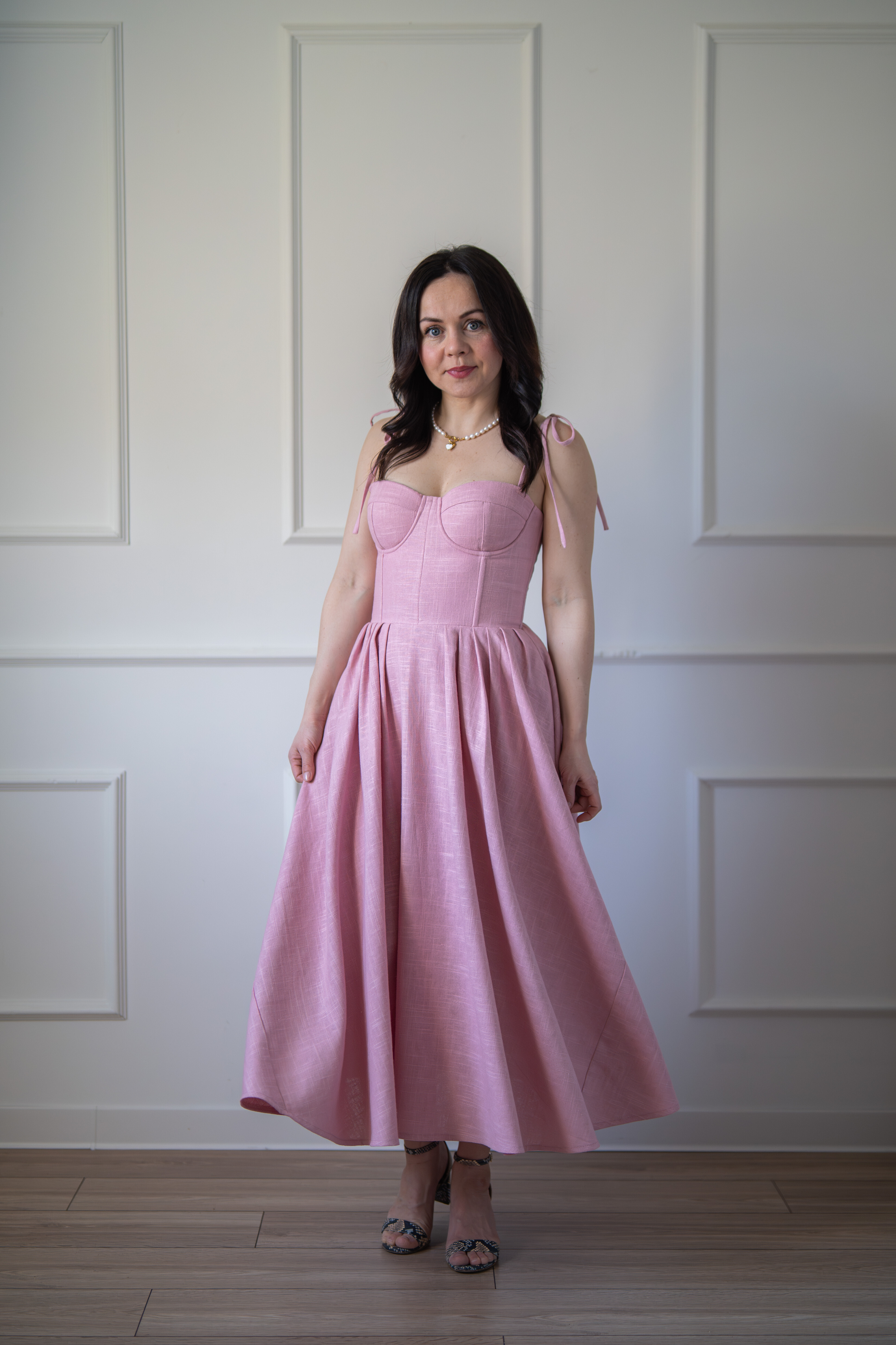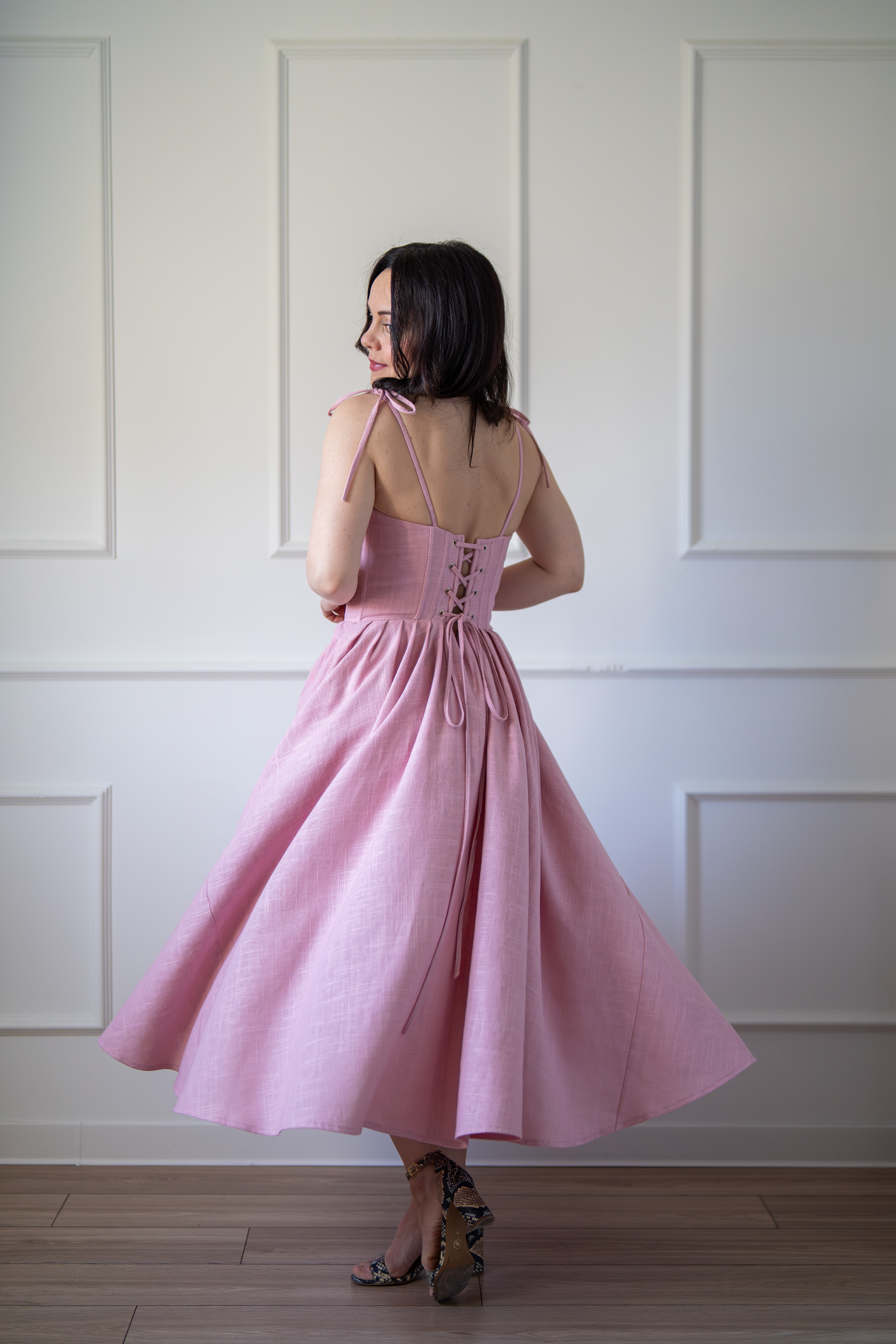 Sukienka gorsetowa z usztywnianymi miseczkami, dzięki którym nie ma potrzeby zakładania stanika. Góra została usztywniona fiszbinami, które pięknie modelują talię. Tył sukienki posiada wiązanie pozwalające na regulację oraz indywidualne dopasowanie, natomiast spódnica zapinana jest na zamek kryty. Sukienka Madlen posiada wiązane ramiączka oraz kieszenie w szwach bocznych. Dodatkowo w zestawie dołączona jest wkładka pod wiązanie z tyłu aby zamaskować plecy.