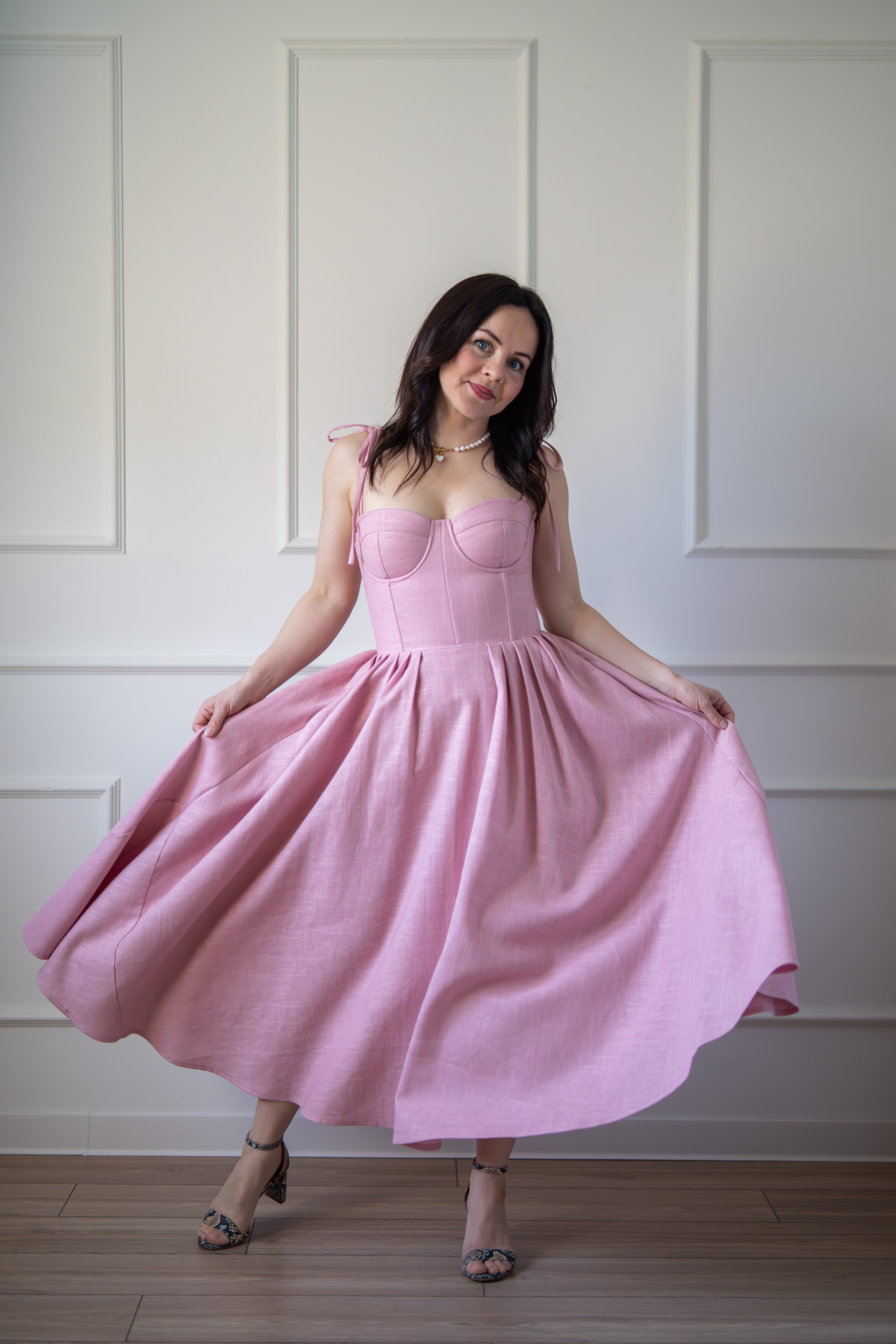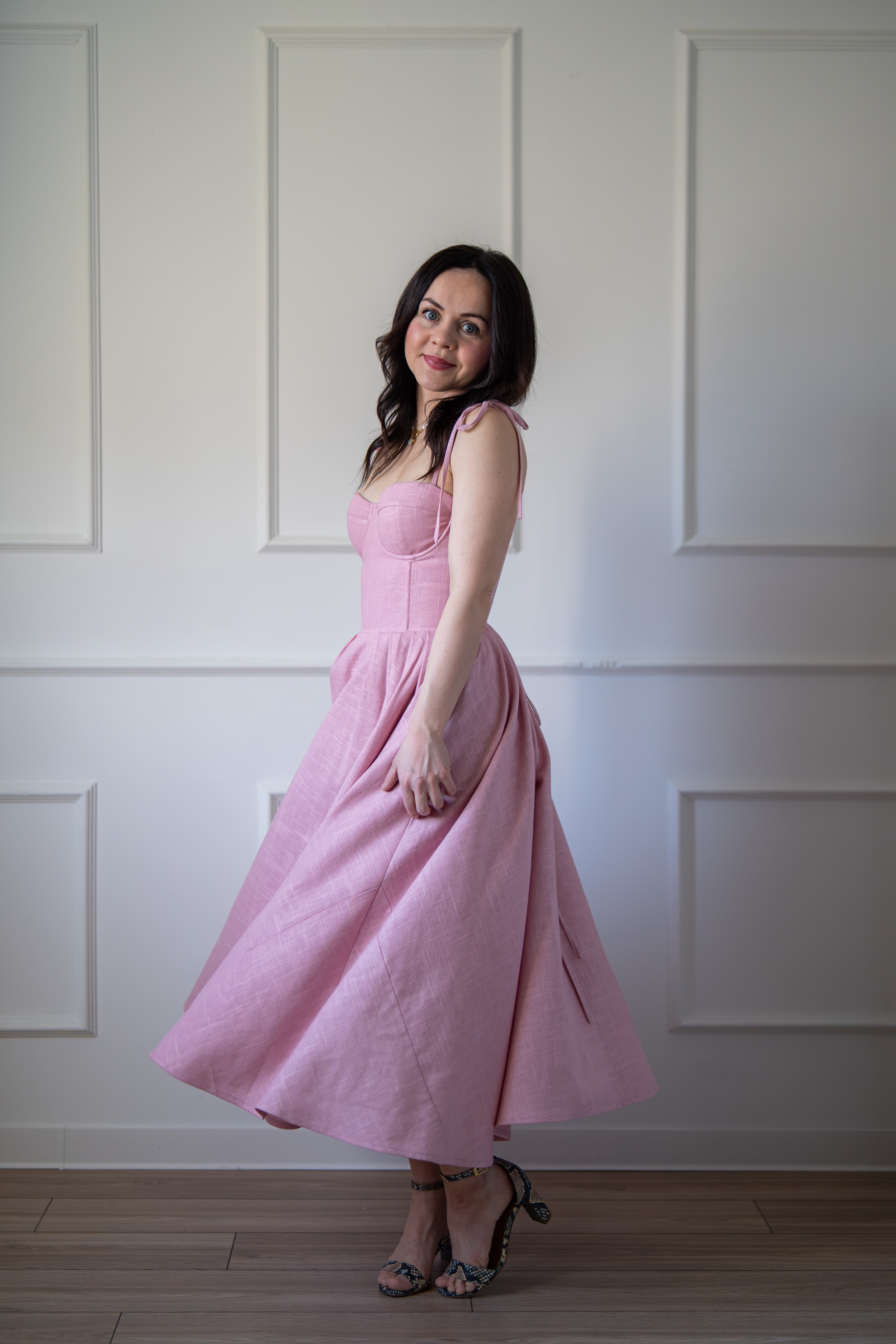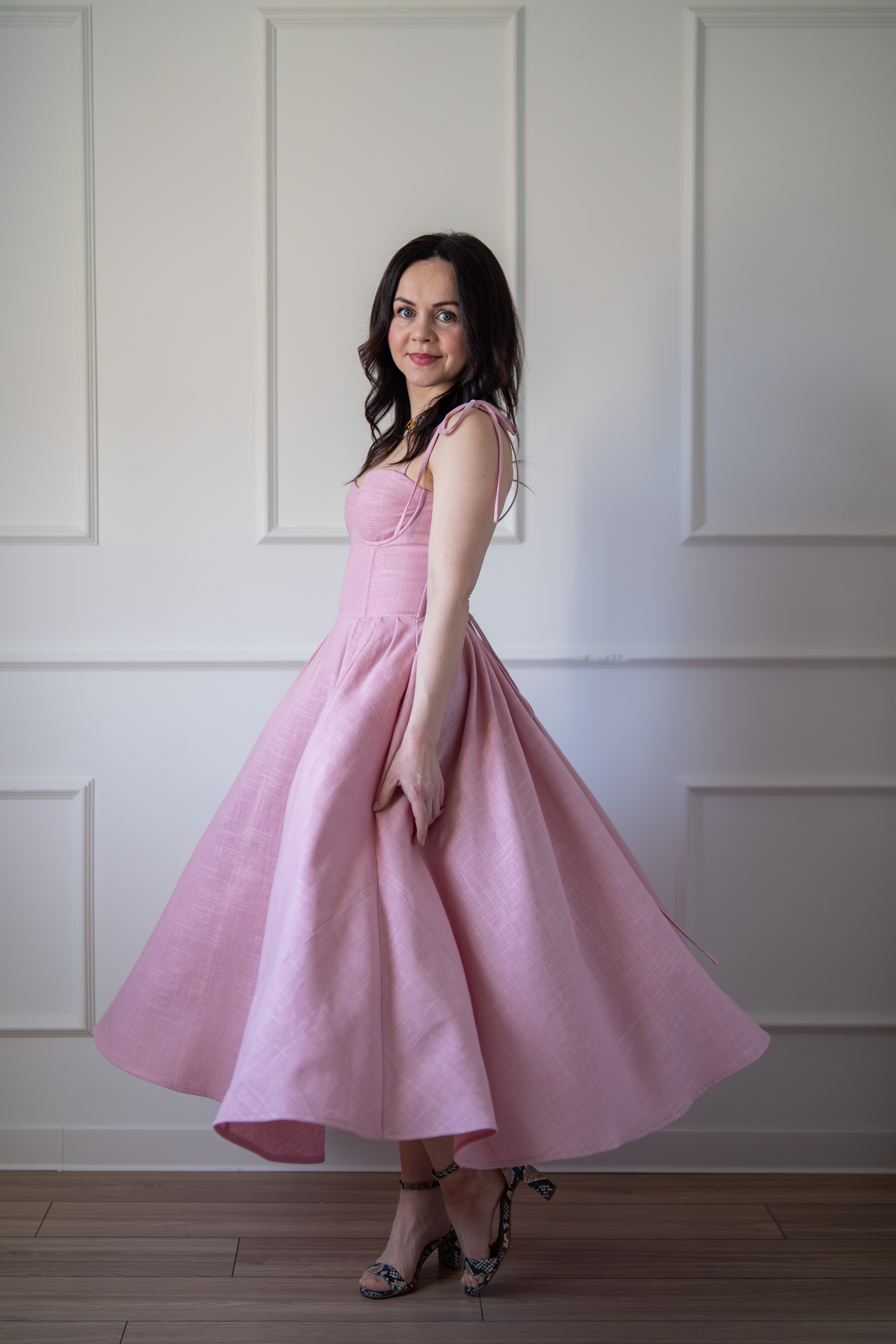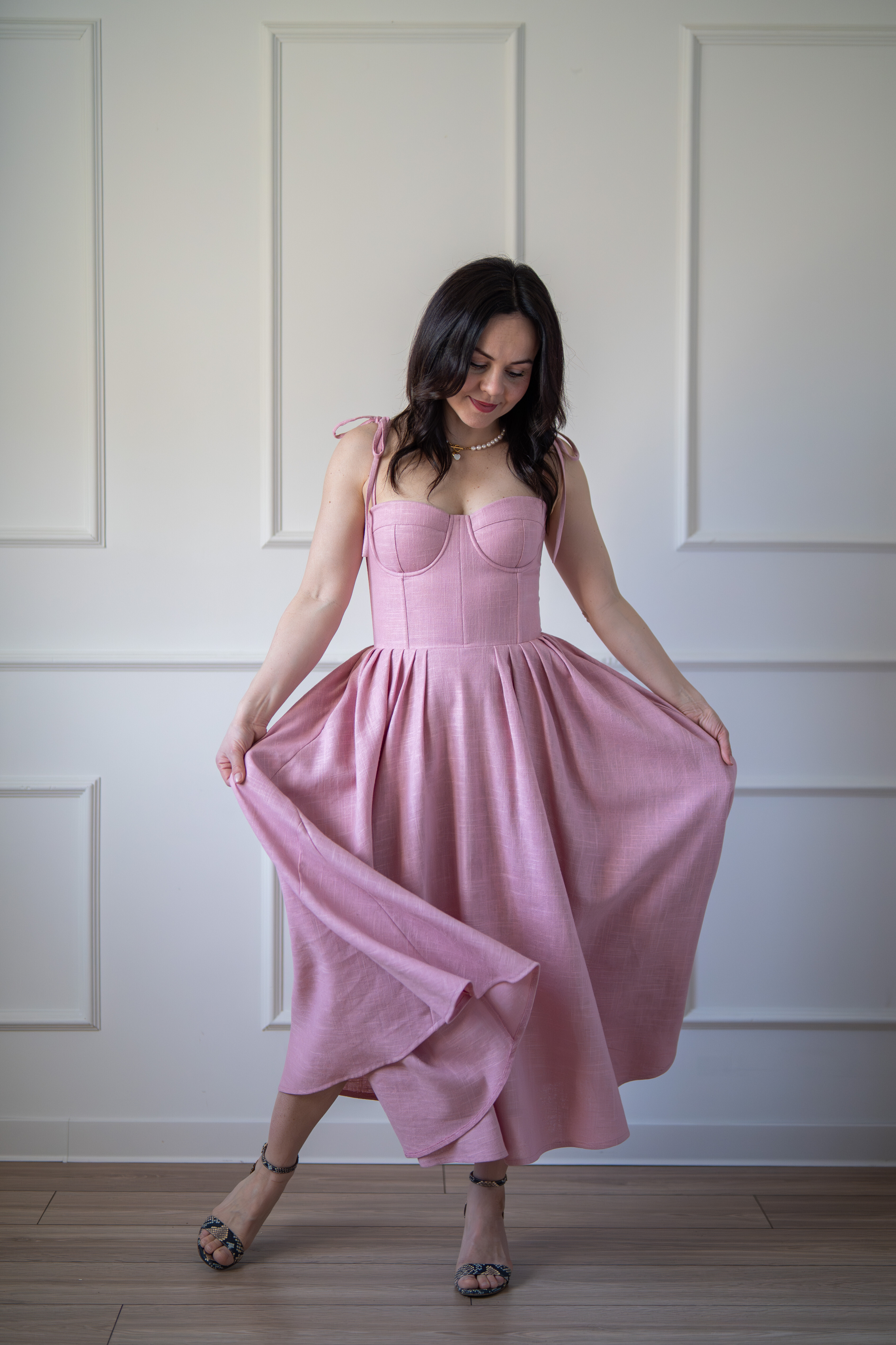 Sukienka gorsetowa z usztywnianymi miseczkami, dzięki którym nie ma potrzeby zakładania stanika. Góra została usztywniona fiszbinami, które pięknie modelują talię. Tył sukienki posiada wiązanie pozwalające na regulację oraz indywidualne dopasowanie, natomiast spódnica zapinana jest na zamek kryty. Sukienka Madlen posiada wiązane ramiączka oraz kieszenie w szwach bocznych. Dodatkowo w zestawie dołączona jest wkładka pod wiązanie z tyłu aby zamaskować plecy.
