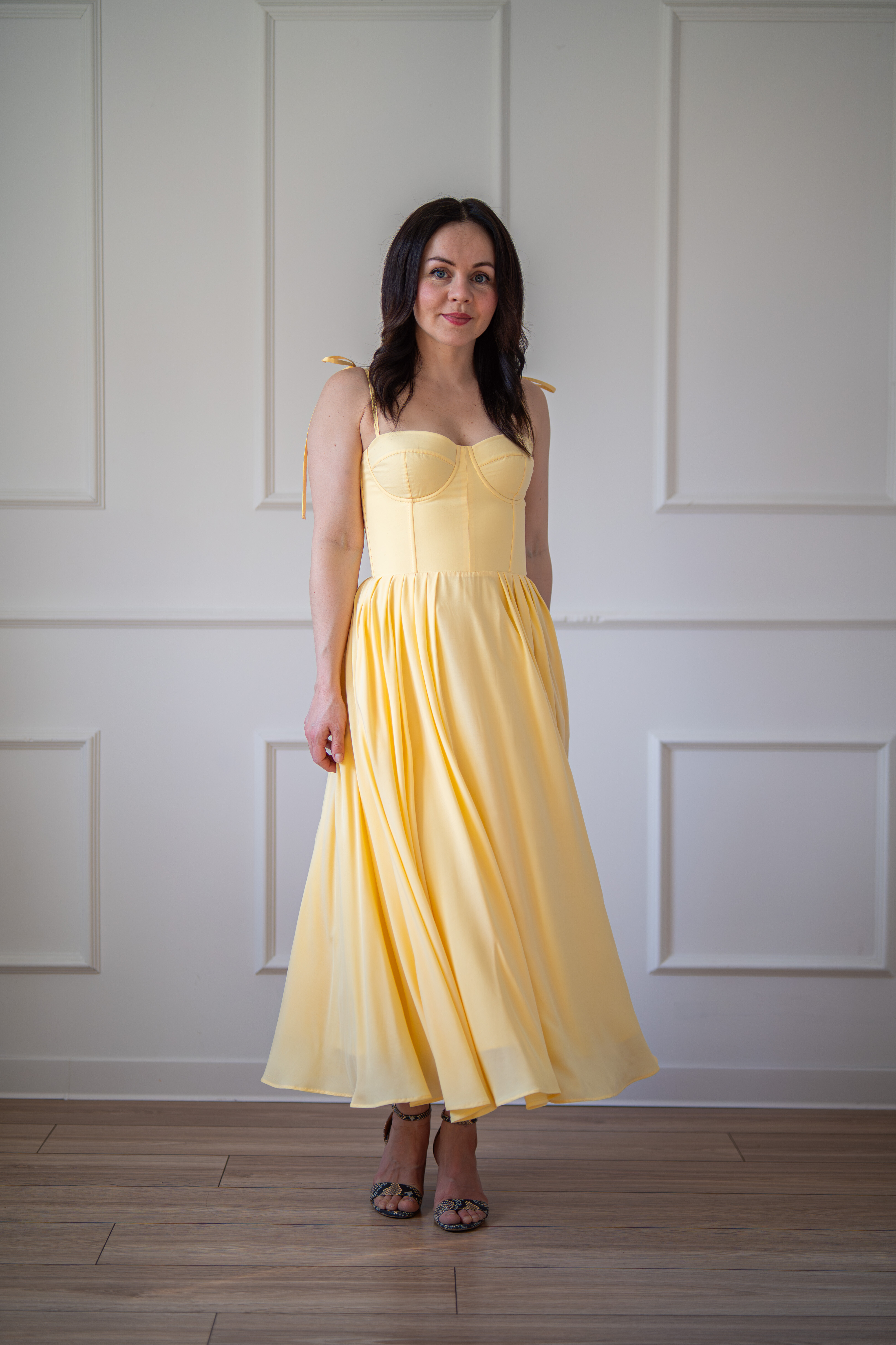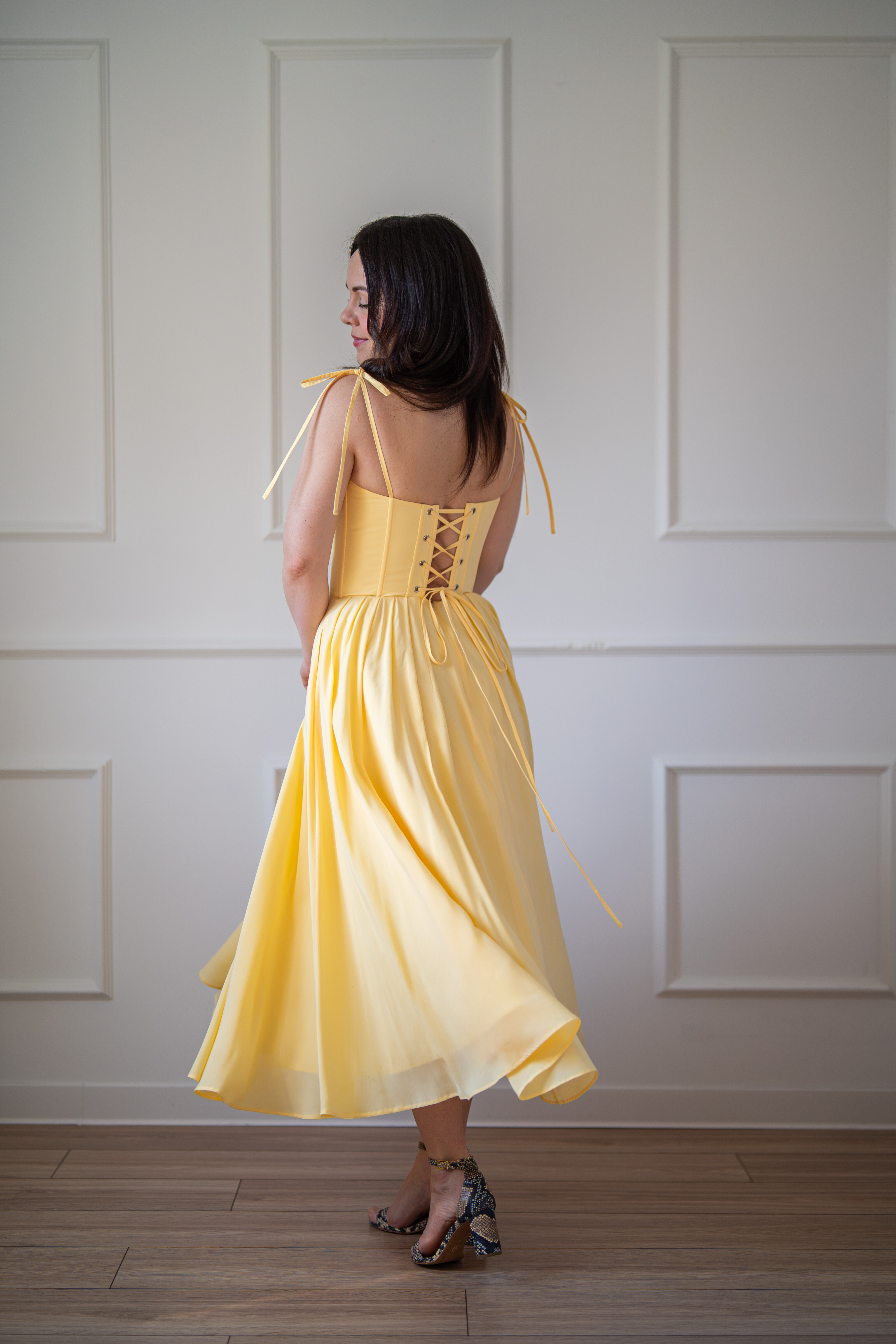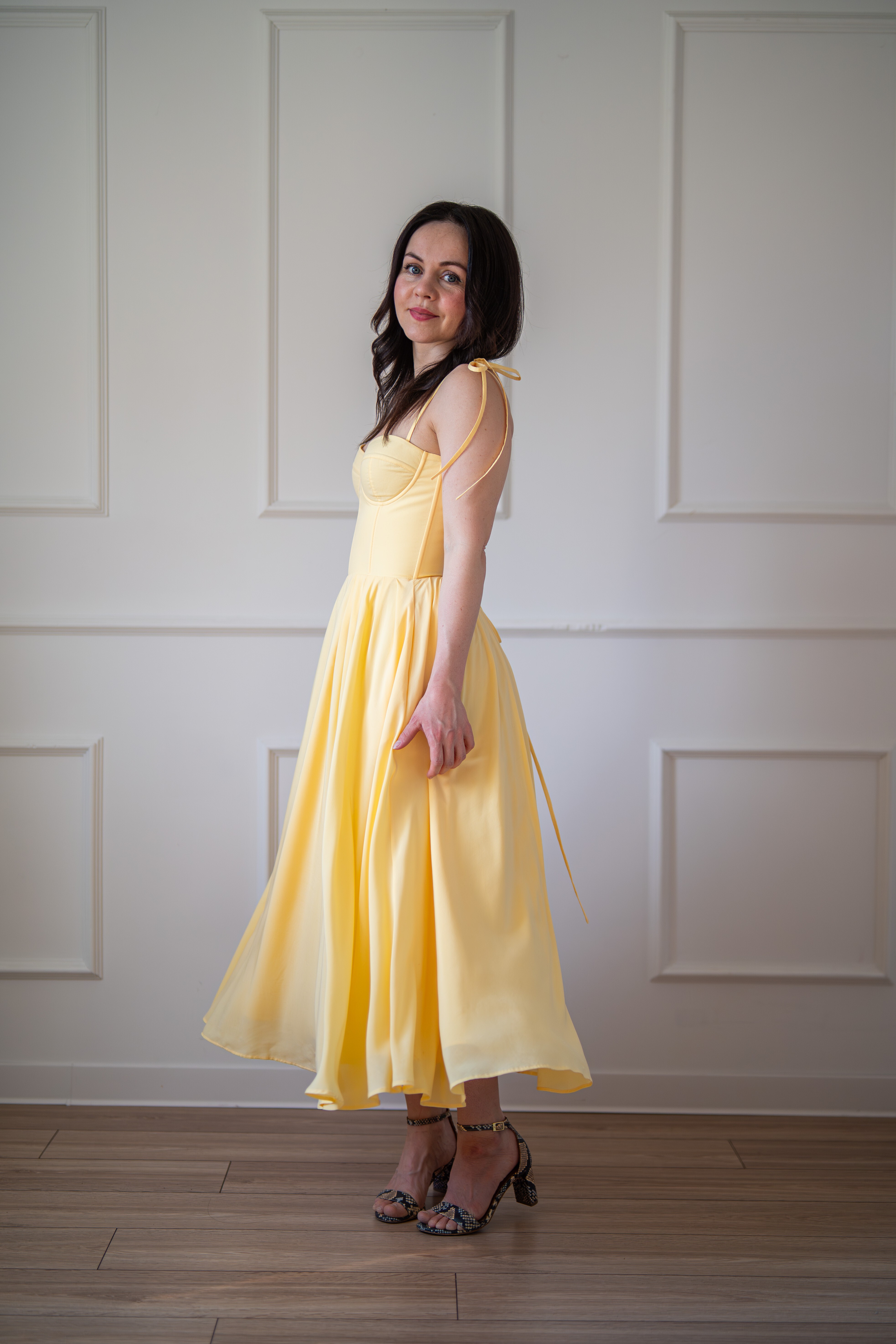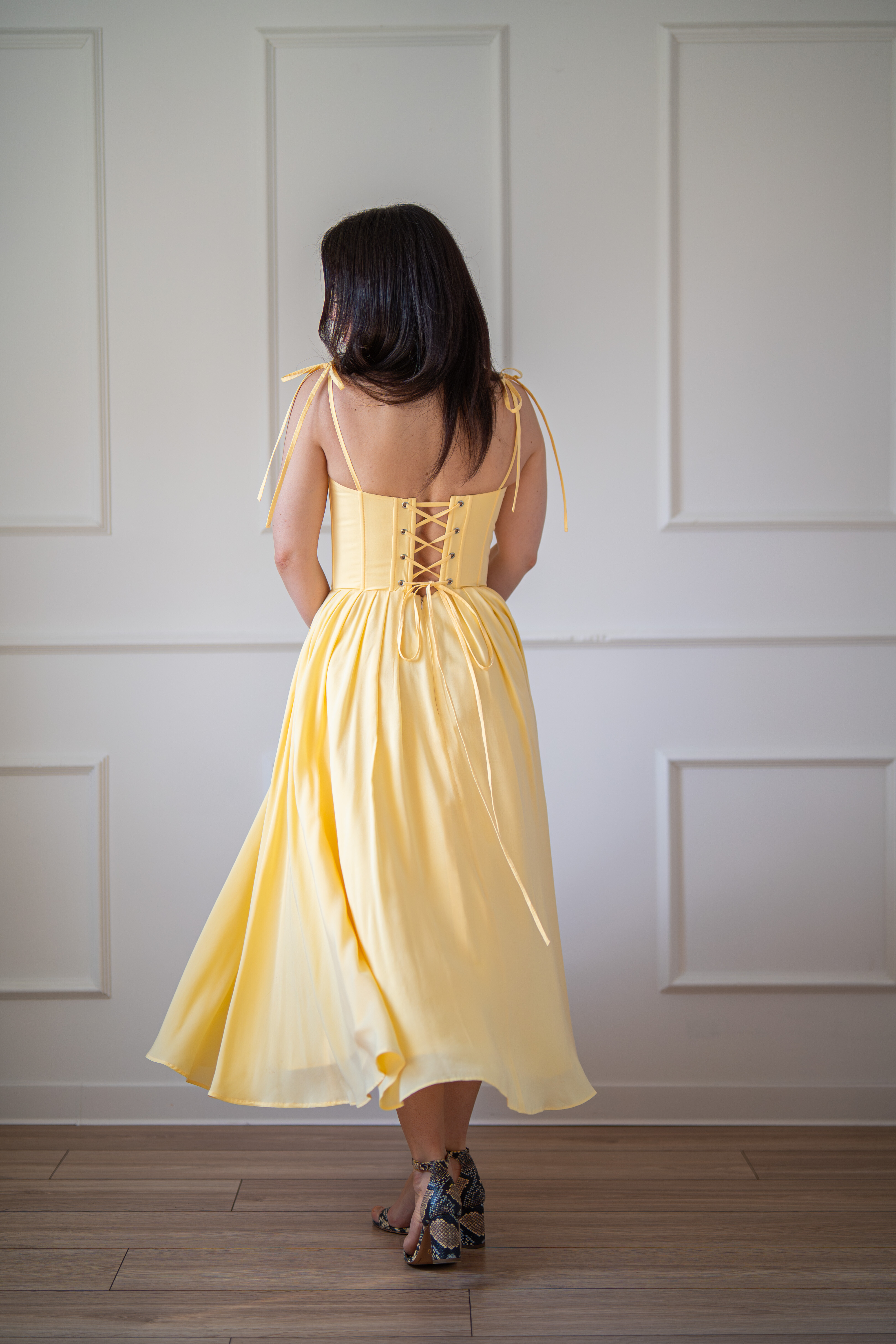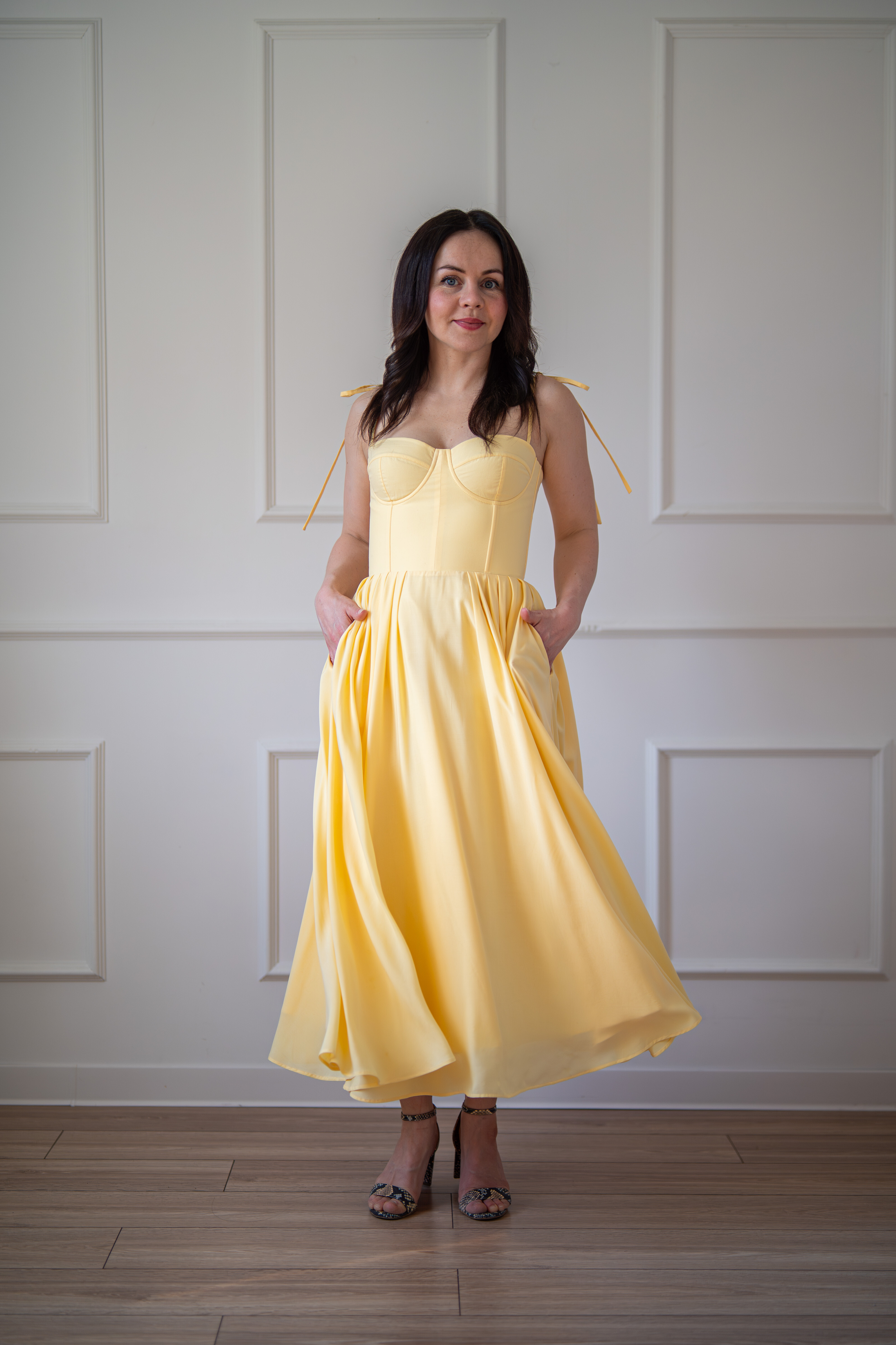 Sukienka gorsetowa z usztywnianymi miseczkami, dzięki którym nie ma potrzeby zakładania stanika. Góra została usztywniona fiszbinami, które pięknie modelują talię. Tył sukienki posiada wiązanie pozwalające na regulację oraz indywidualne dopasowanie, natomiast spódnica zapinana jest na zamek kryty. Sukienka Madlen posiada wiązane ramiączka oraz kieszenie w szwach bocznych. Dodatkowo w zestawie dołączona jest wkładka pod wiązanie z tyłu aby zamaskować plecy.