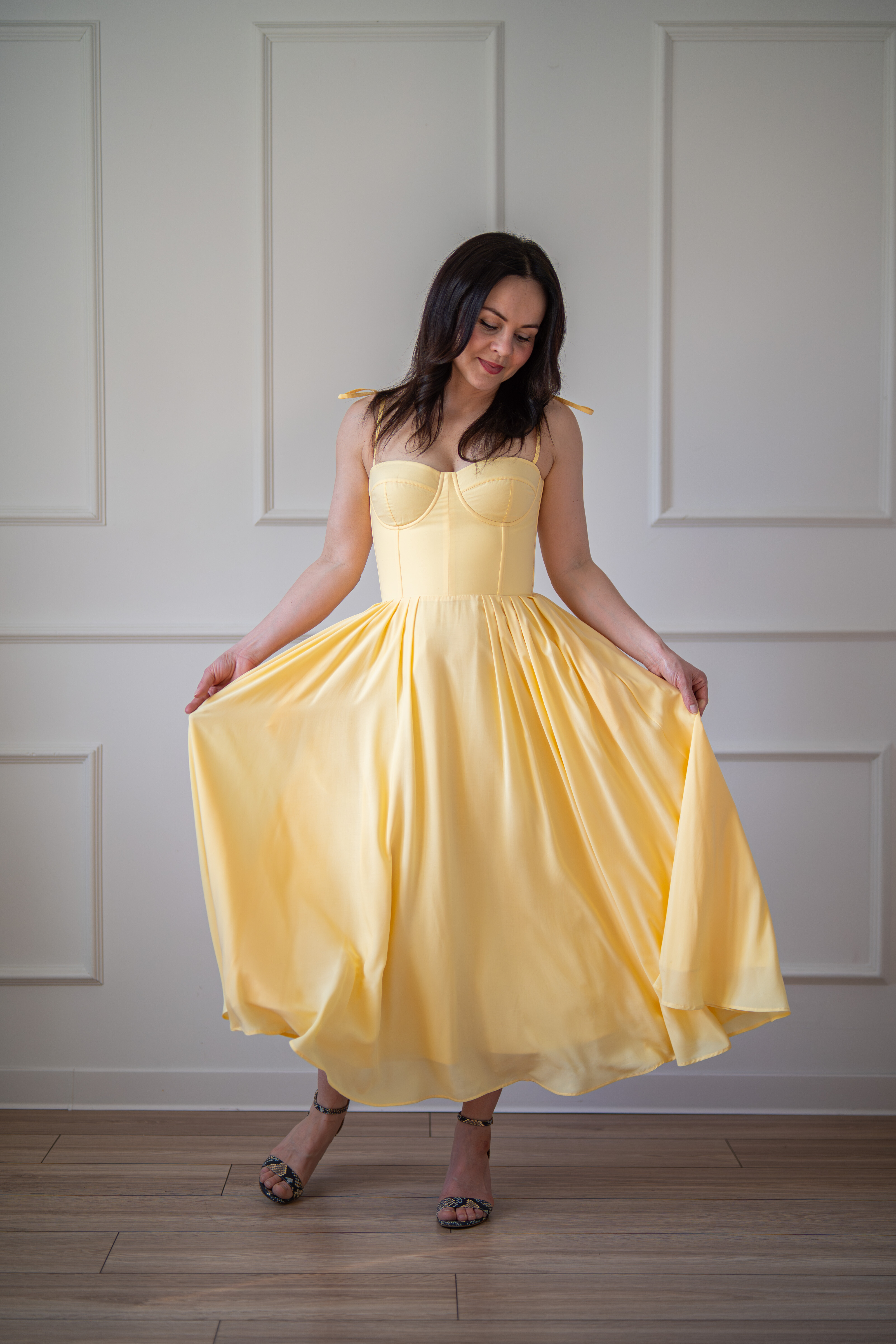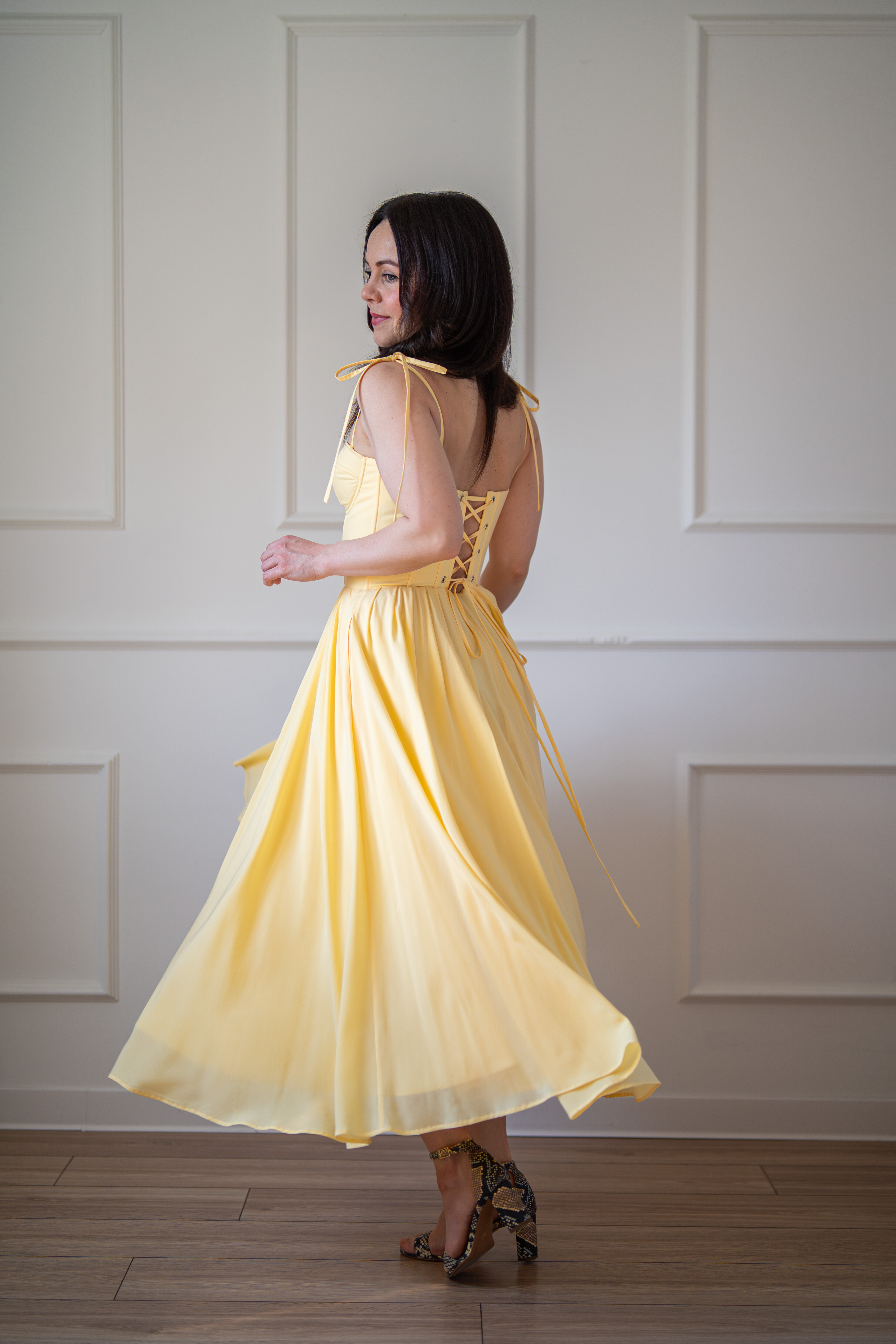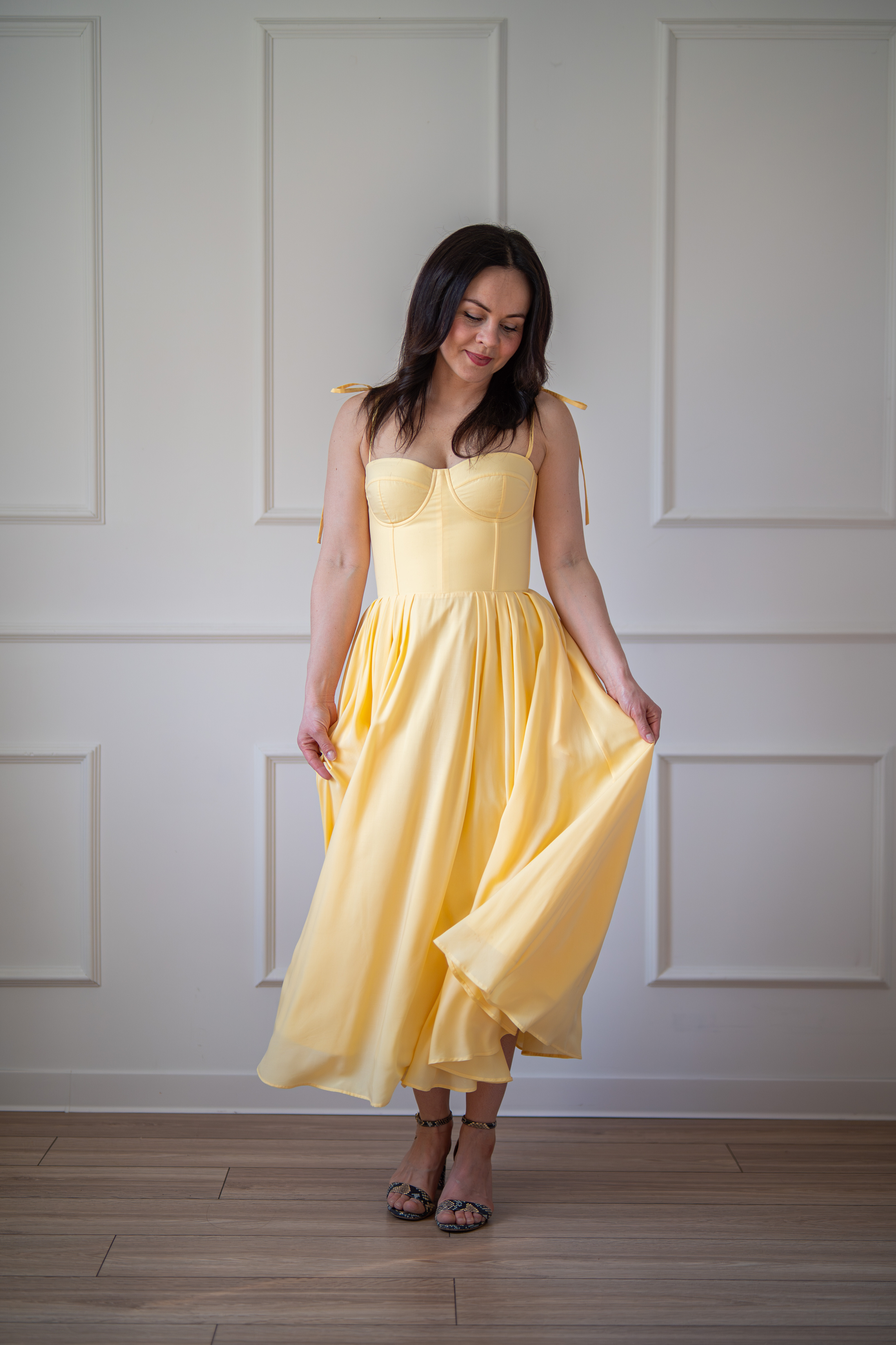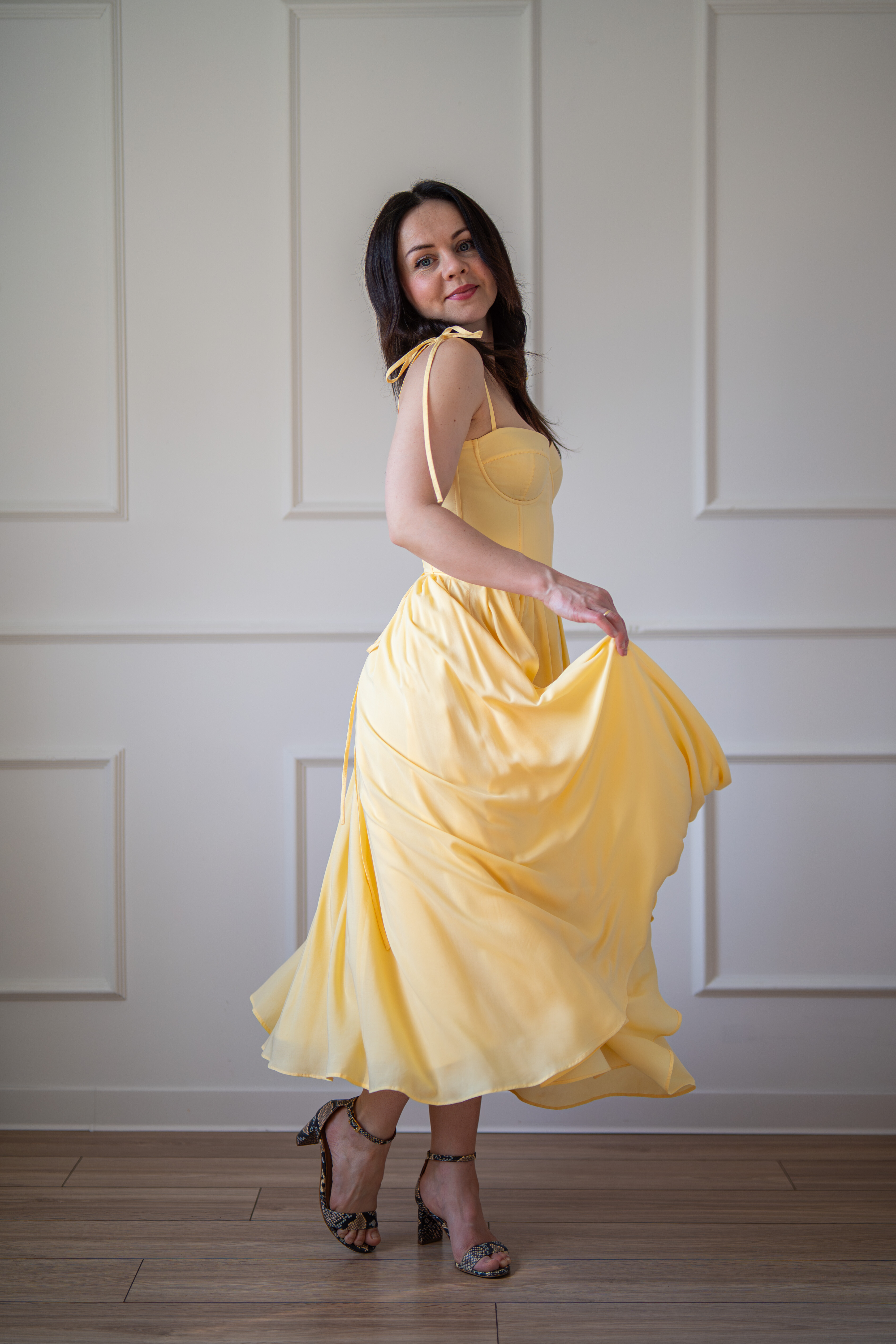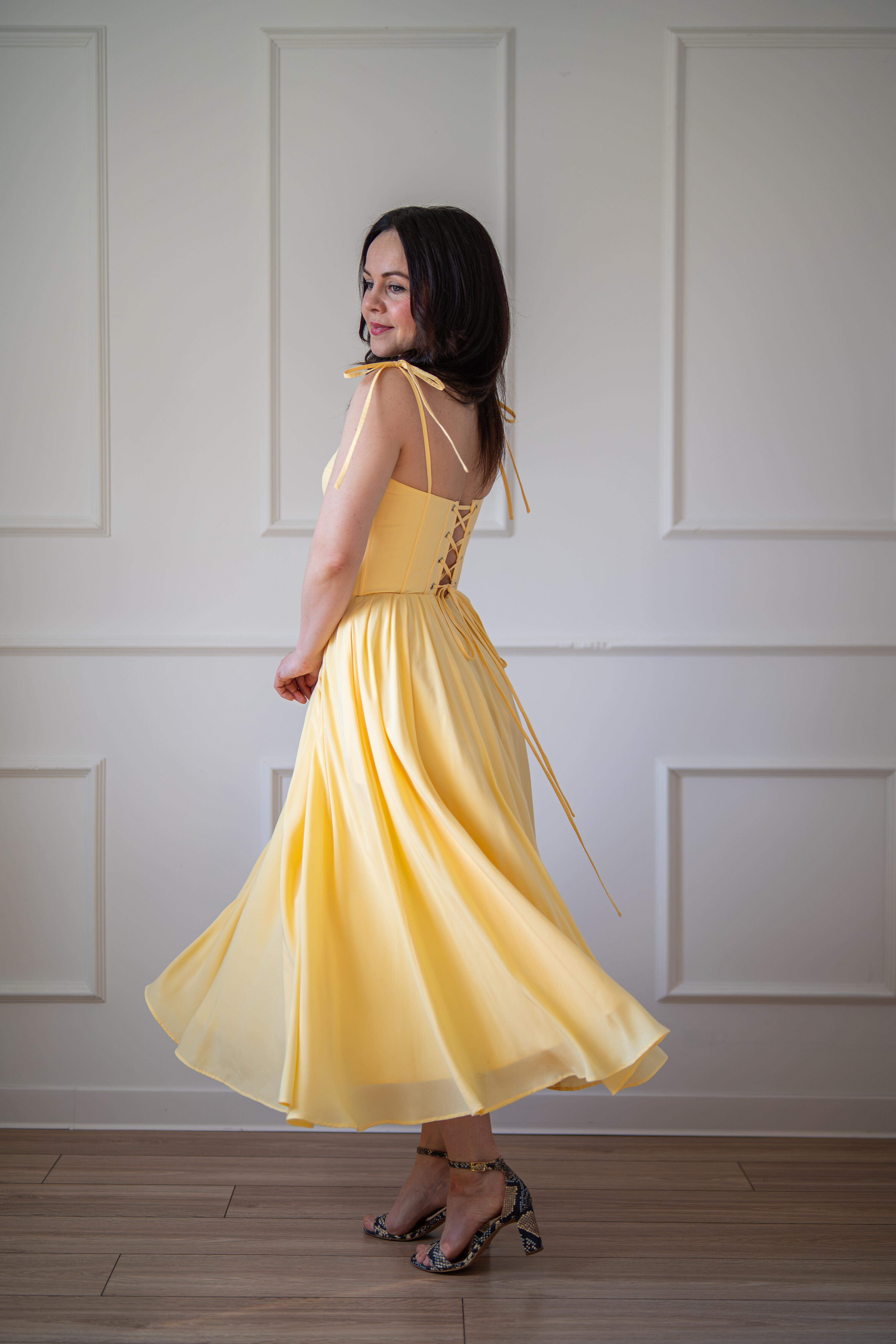 Sukienka gorsetowa z usztywnianymi miseczkami, dzięki którym nie ma potrzeby zakładania stanika. Góra została usztywniona fiszbinami, które pięknie modelują talię. Tył sukienki posiada wiązanie pozwalające na regulację oraz indywidualne dopasowanie, natomiast spódnica zapinana jest na zamek kryty. Sukienka Madlen posiada wiązane ramiączka oraz kieszenie w szwach bocznych. Dodatkowo w zestawie dołączona jest wkładka pod wiązanie z tyłu aby zamaskować plecy.