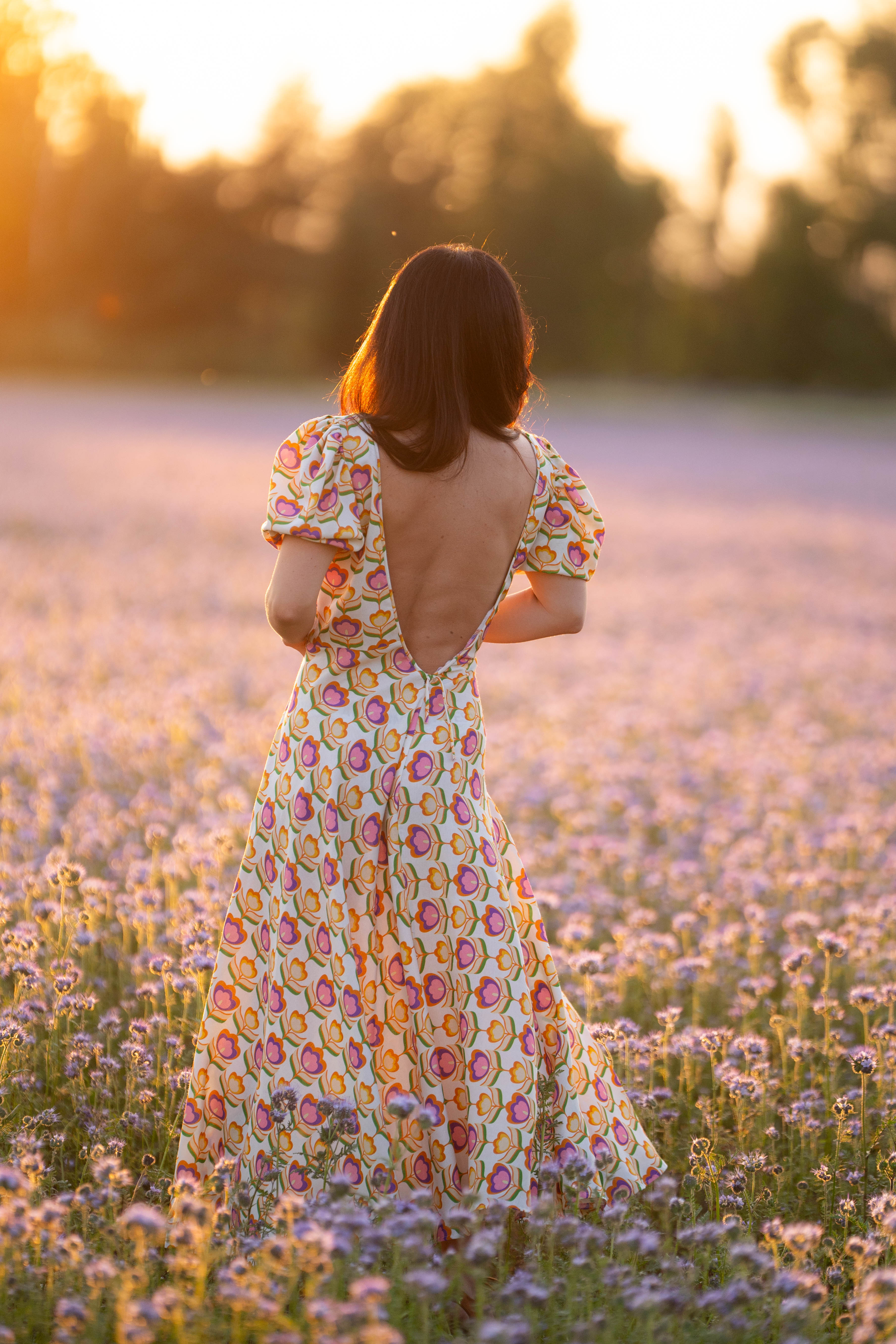 Długa sukienka z odkrytymi plecami została wykonana z hiszpańskiej tkaniny, która powstała z połączenia lnu i wiskozy.